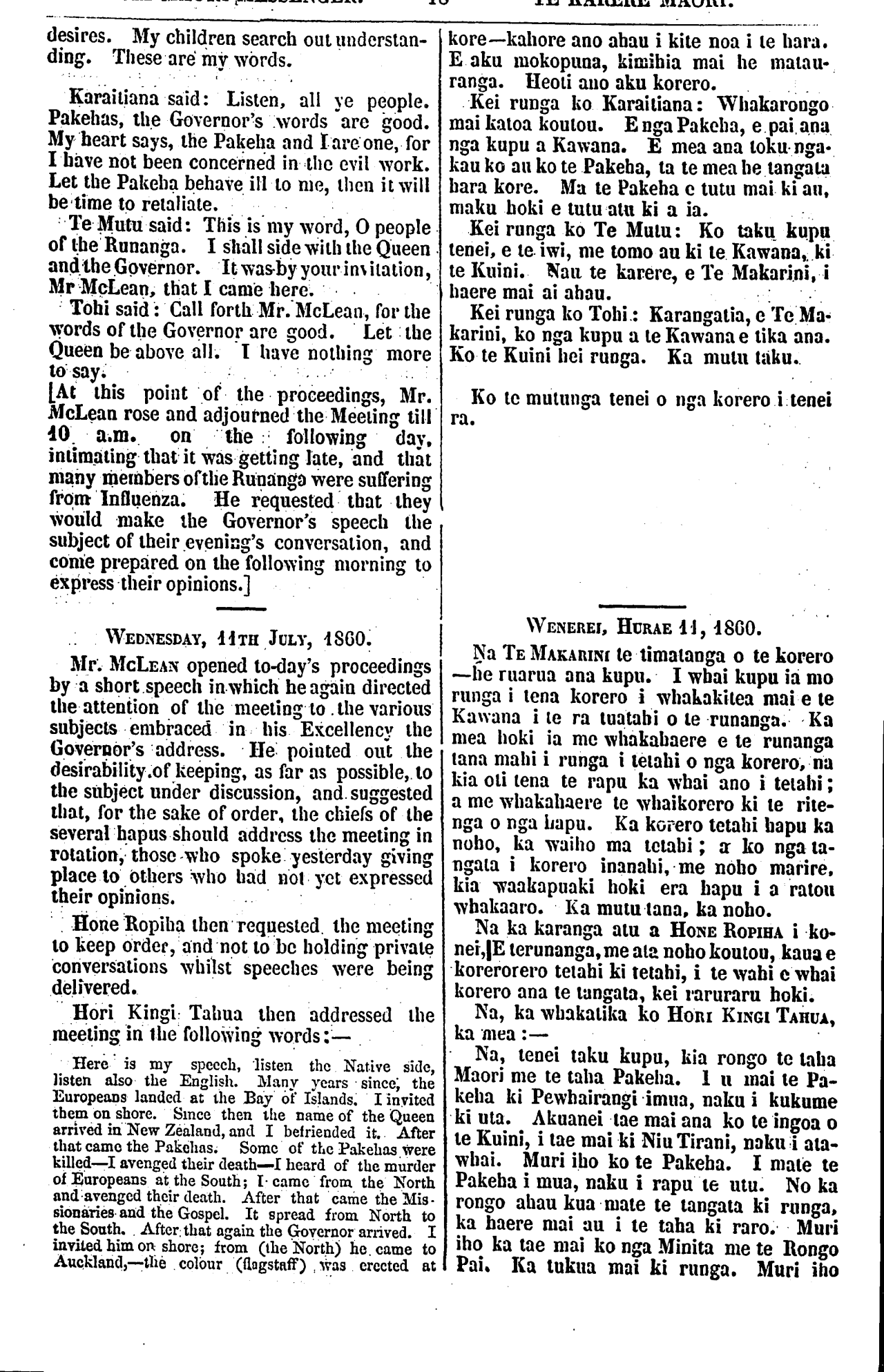 desires. My children search out understan- ding. These are my words. Karaitiana said: Listen, all ye people. Pakehas, the Governor's words are good. My heart says, the Pakeha and l are one, for I have not been concerned in the evil work. Let the Pakeha behave ill to me, then it will be time to retaliate. Te Mutu said: This is my word, 0 people of the Runanga. I shall side with the Queen and the Governor. It was by your invitation, Mr McLean, that I came here. Tohi said: Call forth Mr. McLean, for the words of the Governor are good. Let the Queen be above all. I have nothing more to say. [At this point of the proceedings, Mr. McLean rose and adjourned the Meeting till 40. a.m. on the following day, intimating that it was getting late, and that many members of the Runanga were suffering from Influenza. He requested that they would make the Governor's speech the subject of their evening's conversation, and come prepared on the following morning to express their opinions.] WEDNESDAY, 11 TH JULY, 1860. Mr. MCLEAN opened to-day's proceedings by a short speech in which he again directed the attention of the meeting to the various subjects embraced in his Excellency the Governor's address. He pointed out the desirability of keeping, as far as possible, to the subject under discussion, and suggested that, for that sake of order, the chiefs of the several hapus should address the meeting in rotation, those who spoke yesterday giving place to others who bad not yet expressed their opinions. Hone Ropiha then requested the meeting to keep order, and not to be holding private conversations whilst speehes were being delivered. Hori Kingi Talma then addressed the meeting in the following words:— Here is my speech, listen the Native side, listen also the English. Many years since, the Europeans landed at the Bay of Islands. I invited them on shore. Since then the name of the Queen arrived in New Zealand, and I befriended it. After that came the Pakehas. Some of the Pakehas were killed—I avenged their death—1 heard of the murder of Europeans at the South; I came from the North and avenged their death. After that came the Mis- sionaries and the Gospel. It spread. from. North to the South. After that again the Governor arrived. I invited, him on shore; from (the North) he came to Auckland,—the colour (flagstaff), was erected. at kore—kahore ano ahau i kite noa i te hara. E aku mokopuna, kimihia mai he matau- ranga. Heoti ano aku korero. Kei runga ko Karaitiana: Whakarongo mai katoa koutou. E nga Pakeha, e pai ana nga kupu a Kawana. E mea ana toku nga- kau ko au ko te Pakeha, ta te mea he tangata hara kore. Ma te Pakeha e tutu mai ki au, maku hoki e tutu atu ki a ia. Kei runga ko Te Mutu: Ko taku kupu tenei, e te iwi, me tomo au ki te Kawana, ki te Kuini. Nau te karere, e Te Makarini, i haere mai ai ahau. Kei runga ko Tohi: Karangatia, e Te Ma- karini, ko nga kupu a te Kawana e tika ana. Ko te Kuini hei runga. Ka mutu taku. Ko te mutunga tenei o nga korero i tenei ra. WENEREI, HURAE 11, 1860. Na TE MAKARINI te timatanga o te korero he ruarua ana kupu. I whai kupu ia mo runga i tena korero i whakakitea mai e te Kawana i te ra tuatahi o te runanga. Ka mea hoki ia me whakahaere e te runanga tana mahi i runga i tetahi o nga korero, na kia oti tena te rapu ka whai ano i tetahi; a me whakahaere te whaikorero ki te rite- nga o nga hapu. Ka korero tetahi hapu ka noho, ka waiho ma tetahi; a ko nga ta- ngata i korero inanahi, me noho marire, kia whakapuaki hoki era hapu i a ratou whakaaro. Ka mutu tana, ka noho. Na ka karanga atu a HONE ROPIHA i ko- nei, E te runanga, me ata noho koutou, kaua e korerorero tetahi ki tetahi, i te wahi e whai korero ana te tangata, kei raruraru hoki. Na, ka whakatika ko HORI KINGI TAHUA, ka mea:— Na, tenei taku kupu, kia rongo te taha Maori me te taha Pakeha. I u mai te Pa- keha ki Pewhairangi imua, naku i kukume ki uta. Akuanei tae mai ana ko te ingoa o te Kuini, i tae mai ki Niu Tirani, naku i ata- whai. Muri iho ko te Pakeha. I mate te Pakeha i mua, naku i rapu te utu. No ka rongo ahau kua mate te tangata ki runga, ka haere mai au i te taha ki raro. Muri iho ka tae mai ko nga Minita me te Rongo Pai* Ka tukua mai ki runga. Muri iho