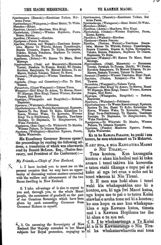 THE MAORI MESSENGER. TE KARERE MAORI. Ngatitematera (Hauraki)—Karaitiana Tuikau, Hai- mona Purau. Ngatimahanga (Waingaroa.)—Hemi Matini, Te Waka. Manukau,—Rihari. Ngatihine, (Aotea)—Manihera, Hira Kingi. Ngatiwhatua, (Orakei)-Wiremu Hopihona, Paora, Keene, Kawau. Ngatihine, (Waikato)—Horohau. Ngatipaoa—Patara Pouroto. Ngatitoa, (Porirua and Wainui)—Tamihana Raupa- raha, Matene Te Whiwhi, Hohepa Tamaihengia, Ropata Urumutu, Nopera Te Ngiha, Horopapera, Pukeko, Hohaia Pokaitara, Rapihana Te Otaota, Hapimana, Te Hope. Ngatitama, (Nelson)—Wi Katene Te Manu, Hemi Matenga. Ngatiraukawa, (Otaki and Manawatu)—Horomona Toremi, Parakaia Te Pouepa, Hukiki, Wi Paiaka, Kuruhou Rangimaru, Te Moroati Kiharoa, Te Ao Marere, Ihakara Tokonui, Takerei Te Nawe. Taranaki, (Wellington)—Wiremu Tamihana, Hemi Parai. Ngaitahu, (Otago and Canterbury)—Pita Te Hori, Taiaroa. Patutokoko, (Upper Wanganui)—Tahana Turoa. Wanganui—Hori Kingi Te Anaua, Te Mawae, Hoani Wi Hipango, Mete Kingi, Tamati Wiremu, Kawana Paepae, Hori Kerei. Ngatiapa, (Whangaehu and Rangitikei)— Ihakara, Hapurona. Ngarauru, (Waitotara)—Pehimana. Ngatikahungunu—Te Wereta Kawekairangi, Ngatuere, Raniera Te Iho, Hoani Te Kaho, Karaitiana Te Korou, Wiremu Waka, Te Koroneho, Wiremu Kingi Tu-te Pakihirangi, Te Hapuku, Tamihana Ruatapu, Te Hapimana, Te Rangituawaru, Te Waka Perohuka. Ngatiporou, (East Cape) Te Whikiriwhi Te Matehe, Wiremu Pahuru, Te Irimana Ngamare. Ngatiama, (Wellington)—Manihera Ngatoro, Porutu, Epiha Wairaweke. His Excellency Governor Browne opened the proceedings by reading the following ad- dress, a translation of which was afterwards read by Donald McLean, Esq., (Native Sec- retary, and President of the Conference): My Friends,—Chiefs of New Zealand, 1. I have invited you to meet me on the present occasion that we may have an oppor- tunity of discussing various matters connected with the welfare and advancement of the two Races dwelling in New Zealand. 2. I take advantage of it also to repeat to you and, through you, to the whole Maori people, the assurances of goodwill on the part of our Gracious Sovereign which have been given by each succeeding Governor from Governor Hobson to myself. 3. On assuming the Sovereignty of New Zealand Her Majesty extended to her Maori subjects her Royal protection, engaging to Ngatitematera, (Hauraki)—Karaitiana Tuikau, Hai mona Purau. Ngatimahanga, (Waingaroa)—Hemi Matini, Te Waka. Manukau,—Rihari. Ngatihine, (Aotea)—Manihera, Hira Kingi. Ngatiwhatua, (Orakei)—Wiremu Hopihona, Paora, Keene, Kawau. Ngatihine, (Waikato)—Horohau. Ngatipaoa—Patara Pouroto. Ngatitoa, (Porirua, Wainui)—Tamihana Raupa- raha, Matene Te Whiwhi, Hohepa Tamaihengia, Kopata Urumutu, Nopera te Ngiha, Horopapera, Pukeko, Hohaia Pokaitara, Rapihana Te Otaota, Hapimana, Te Hope. Ngatitama (Wakatu)-Wi Katene To Manu, Hemi Matenga. Ngatiraukawa, (Otaki, Manawatu) — Horomona Toremi, Parakaia Te Pouepa, Hukiki, Wi Paiaka, Kuruhou Rangimaru. Te Moroati Kiharoa, Te Ao Marere, Ihakara Tokonui, Takerei Te Nawe. Taranaki (Poneke)—Wiremu Tamihana, Hemi Parai. Ngatiahu, (Otakou, Katapere)—Pita Te Hori Tararoa. Patutokoko, (Wanganui)—Tahana Turoa. Wanganui—Hori Kingi Te Anaua, Te Mawae, Hoani Wi Hipango, Mete Kingi, Tamati Wiremu, Kawana Paepae, Hori Kerei. Ngatiapa, (Whangaehu, Rangitikei) Ihakara, Hapurona. Ngarauru, (Waitotara)—Pehimana. Ngatikahungunu —Te Wereta Kawekairangi, Ngatuere, Raniera Te Iho, Hoani Te Kaho, Karaitiana Te Korou, Wiremu Waka, Te Koroneho, Wiremu Kingi Tu-te-Pakihirangi, Te Hapuku, Tamihana Ruatapu, Te Hapimana, Te Rangituawaru, Te Waka Perohuka. Ngatiporou, —Te Wikiriwhi Te Matehe, Wiremu Pahuru, Te Irimana Ngamare. Ngatiawa, (Poneke) Manihera Ngatoro, Porutu, Epiha Wairaweke. Ka tu ko KAWANA PARAONE, ka puaki i ana korero, he mea whakamaori na Te Makarini. E AKU HOA, E NGA RANGATIRA MAORI O NIU TIRANI,— Tena koutou. Kua karangatia koutou, e ahau kia huihui mai ki toku aroaro i tenei takiwa kia korerotia e tatou etahi tikanga e tupu pai ai e kake ai nga iwi erua e noho nei ki tenei whenua ki Niu Tirani. 2. E mea ana hoki ahau i tenei wahi kia whakapuakina ano ki a koutou, ara, ki nga Iwi Maori katoa, nga kupu mo te pai o to tatou Kuini atawhai e aroha tonu nei ki a koutou; ko aua kupu ra ano kua whakapua- kina e nga Kawana katoa, timata mai i a Kawana Hopihana tae iho ki ahau e tu atu nei. 3. I te whakaaetanga a Te Kuini ki a ia te Kawanatanga o Niu Tira- ni ka whakatauwharetia mai tona