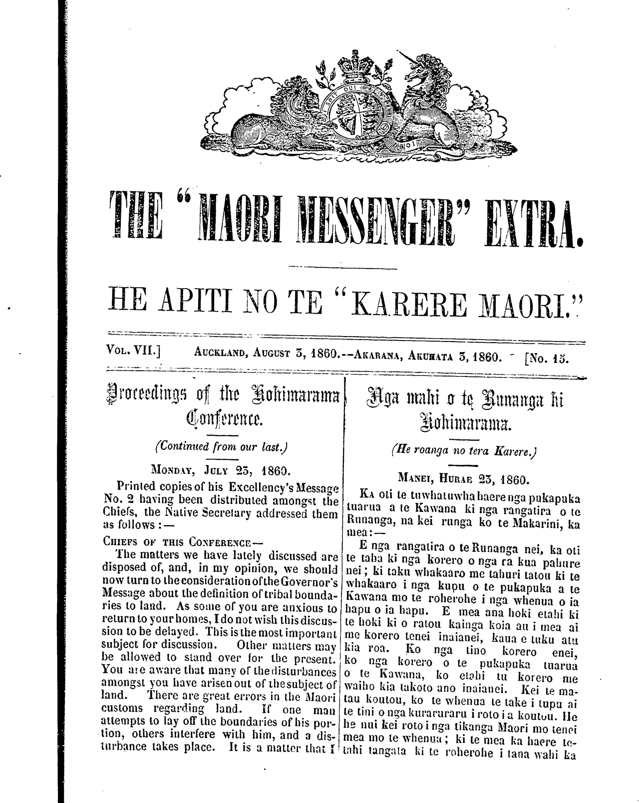 The Maori Messenger - Ko te Karere Maori 1855-1860: Volume 7, Number 15. 03 August 1860 |