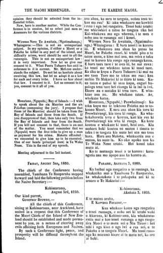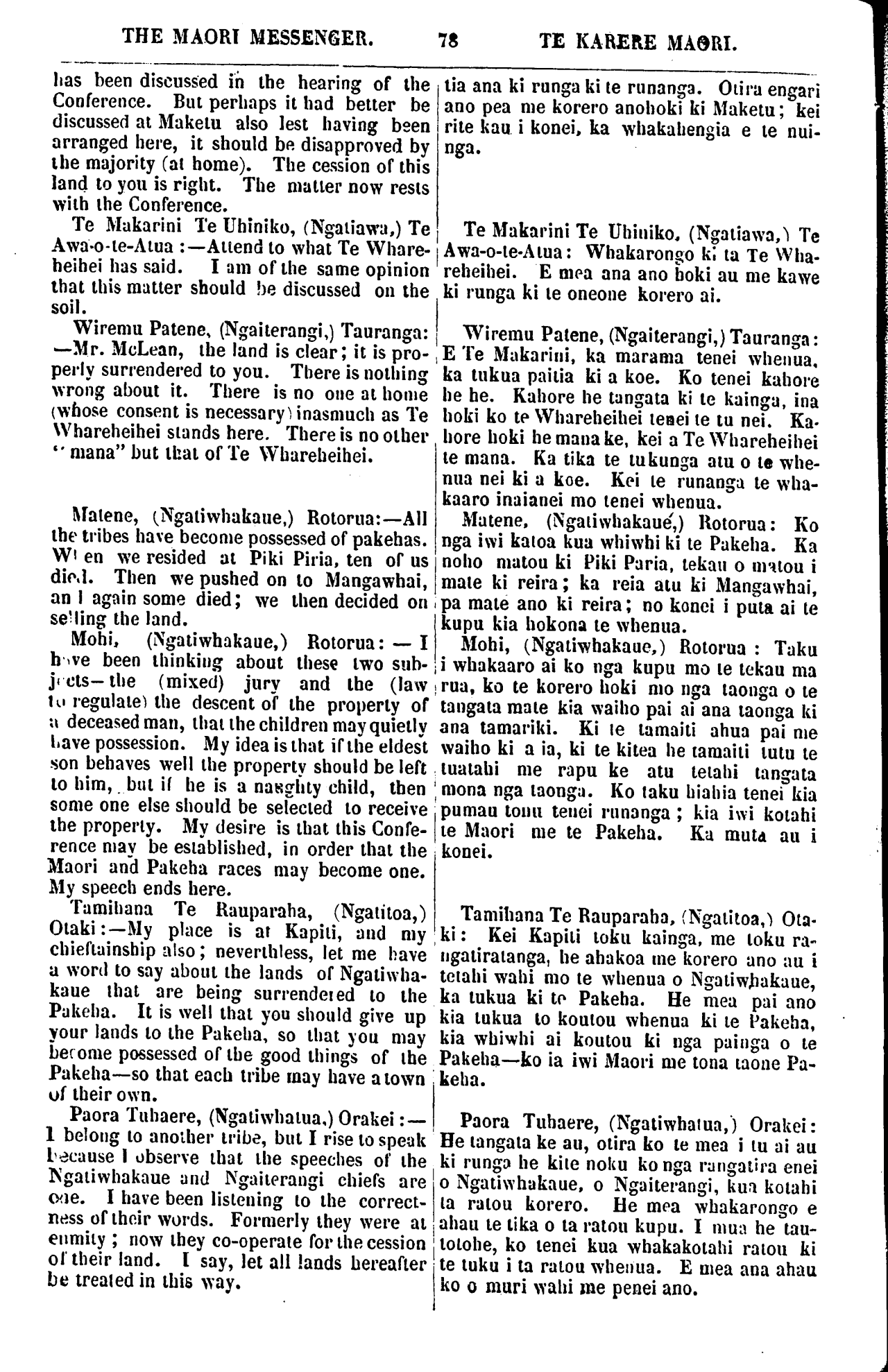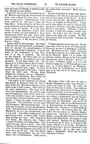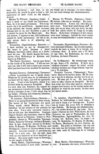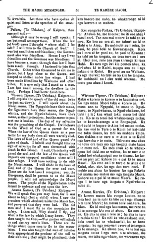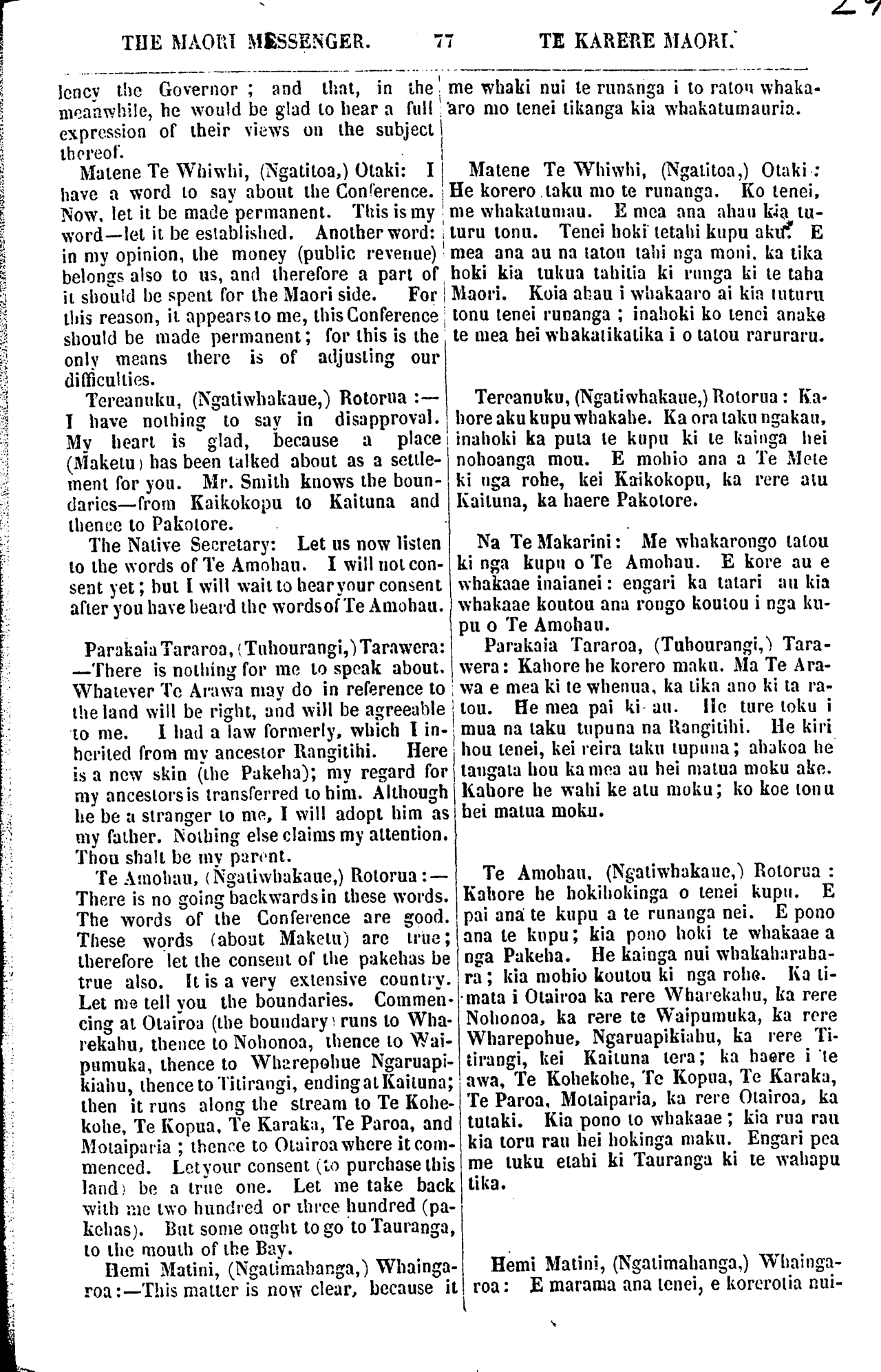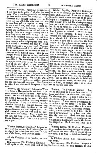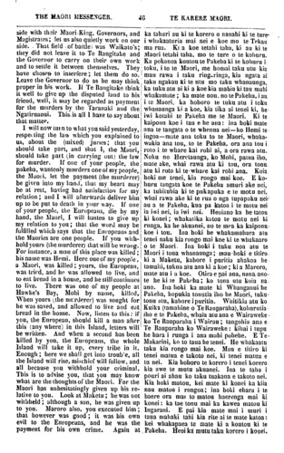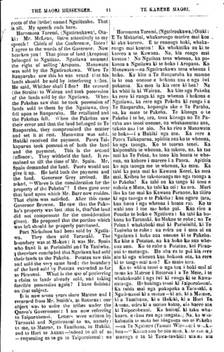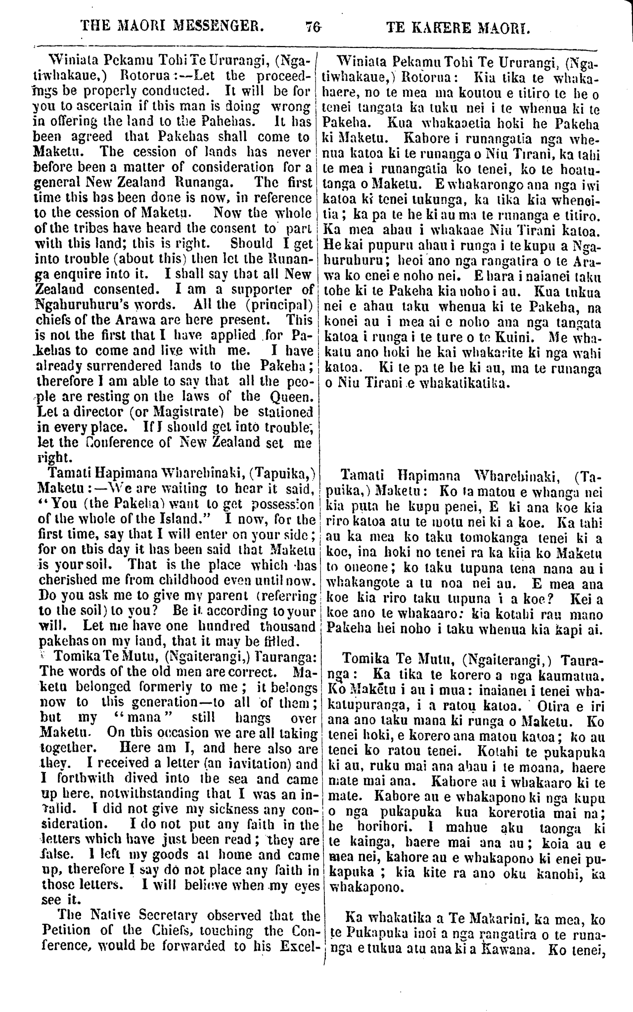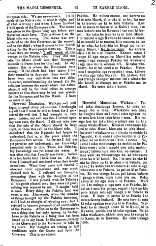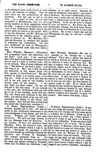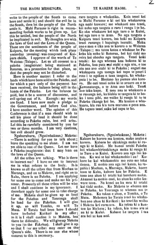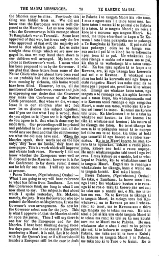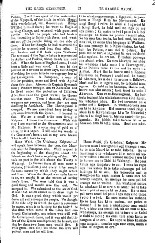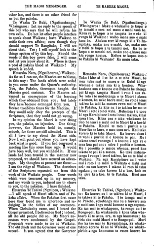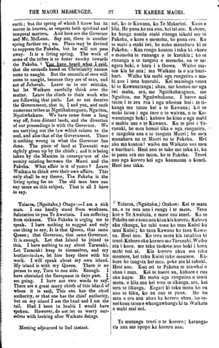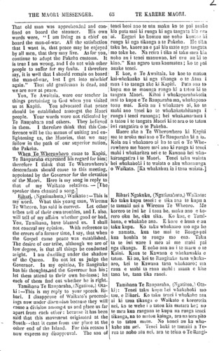 THE MAORI MESSENGER. TE KARERE MAORI. Matene Te Whiwhi, (Ngatitoa,) Otaki: We have nothing to say, nor anything different to bring forward. Although the men are dead who agreed to the treaty of Waitangi, the words of the Maori are kept. Only now, after the expiration of twenty years, has the question of union been mooted, and we are offered all the advantages thereof. Now, for the first time, the question has been opened. This pleases me. I am glad because of this Conference. Let our work be carried on every year, Let the Governor, on each succeeding year, invite us to a Conference. Do not let us look at the faults of the Governor. All I desire is that (the races) be cemented. There has been a free expression of opinion. I will not say that I will decide the question (of an annual Conference); rather let each chief give utterance to his thoughts. Winiata Pekamu Tohi Te Ururangi, (Nga- tiwhakaue.) Maketu: Chiefs of this Con- ference, what Mr. McLean has said is cor- rect, namely, that each chief should return to his home, and there consider the subdi- vision of the land. There is only one other subject now for us to speak on. and that is the union (of races). As to the land, say nothing more on that subject. The land is the source of all the troubles of this Island. When we return to our homes let each man define (the boundaries of) his land, and we shall thus avoid difficulties (death). I will define my own land. Let us have one Lord. and then our opinions will agree. Let us have but one Queen, and one Governor. You have said, Return to your homes and consider this matter (the subdivision of land); that is correct. The Governor. and the Governor alone shall be my head (or chief). Let me (the Maori) enter the Pakeha Council, that my word may be right, because the opinions of the Pakeha Council are conflicting. Secure an entrance for me that we may all consult together. Tukihaumene, (Ngatiwhakaue,) Rotorua: I shall not be desultory. (I have only one subject.) Only the Queen—only the Go- vernor. I have uttered my words, and they have been suppressed. What have we to do with the troubles about land? Let these matters be carefully considered, lest other words be introduced. Paora Tuhaere, (Ngatiwhatua, Orakei): This is my speech to you—a word respecting the Treaty of Waitangi, the covenant now spoken of. The union of the two races com- menced with it. By it the sovereignty of these Islands was ceded to the Queen. The regu- lations respecting the sale of land com- Matene Te Whiwhi, (Ngatitoa,) Otaki: Kahore he kupu ma matou kahore he rere- nga ketanga; ahakoa kua male ki te po nga tangata i whakaaetia ai te Tiriti o Waitangi e tiakina ana nga kupu o te Maori. Ka rua tekau tau ka tahi ka tuwhera te kupu kia kotahi tatou ka meinga ko nga mea katoa kia riro mai ki a tatou. Heoi ano ko te tuwheratanga tuatahi tenei; ko taku tenei e pai ai. E hari ana ahau mo tenei mea mo te runanga. Ko la tatou mahi me mahi to- nu i roto i nga tau. I ia tau ka karanga te Kawana ki a tatou kia haere mai ki te runa- nga. Kaua tatou e titiro ki nga he o te Ka- wana; heoi ano ki au ko te whakau anake. Kua puaki nui nga kupu; ekore au e mea maku e whakaoti; waiho ma ia rangatira ma ia rangatira tona whakaaro e whakapuaki. Winiata Pekamu Tohi Te Ururangi, (Nga- tiwhakaue,) Maketu: E nga rangatira o tenei runanga, e tika ana te kupu a te Maka- rini, me hoki ia tangata ia tangata ki tona kainga ki te mahi i tona pihi ano. Ko tahi tonu te kupu mo tatou inaianei ko te wha- kakotahi anake. Ko te whenua, kati te ku- pu ki te whenua, ko te mate nui tena o tenei motu; kia tae ki te kainga ma ia tangata ma ia tangata ano e hanga tona whenua, penei ekore e pa te mate. Maku ano e hunga to- ku whenua. Kia kotahi te Ariki, kia kotahi ai whakaaro; kotahi te Kuini, kotahi te Ka- wana. Ka ki mai na koe me hoki ki te kai- nga mahi ai, e tika ana. Engari ko te tu- muaki moku ko te Kawana, ko te Kawana anake. Kia tapoto ahau ki roto ki te runa- nga Pakeha kia tika taku mahi; ko te wha- kaaro o te runanga Pakeha e rere ke ana. Kia whakapumautia e koe taku tapokoranga kia kotahi ano korerotanga. Tukihaumene, (Ngatiwhakaue,) Maketu: E kore au e tipokapoka; ko te Kuini anake, ko te Kawana anake. Kua puta taku kupu, pehia ana taku kupu. Hei aha ma tatou te kino o te whenua? Kia pai te whakaaro kei rere mai te kupu ke. Paora Tuhaere, (Ngatiwhatua,) Orakei: Tenei taku ki a koutou, he kupu mo te Tiriti ki Waitangi, mo te kawenata e korerotia nei. I timataia te whakakotahitanga ki tena, me te rironga ano hoki o te mana o tenei motu ki raro ki te maru o te Kuini, me nga tikanga ano hoki mo te whenua i timata mai