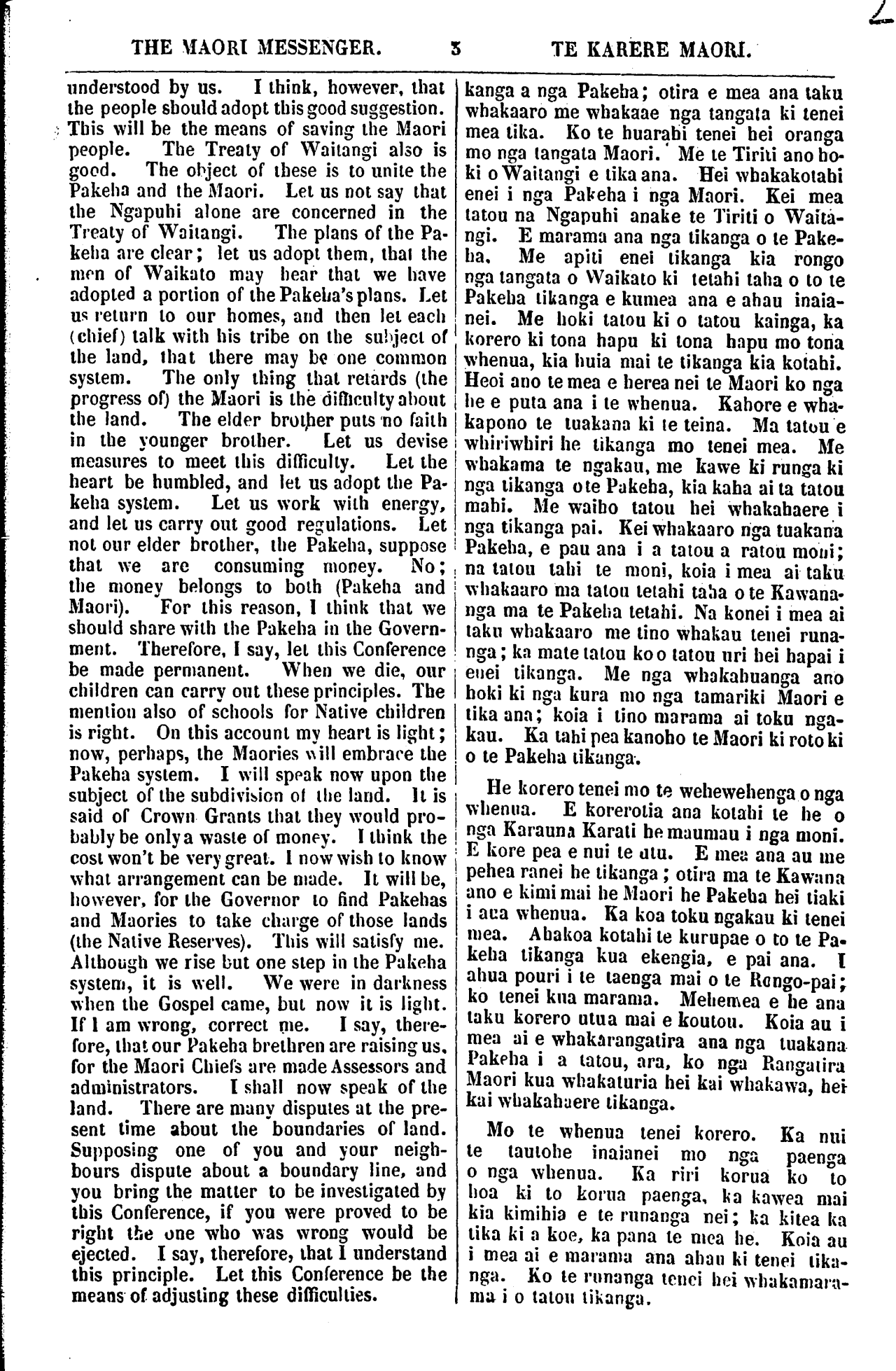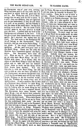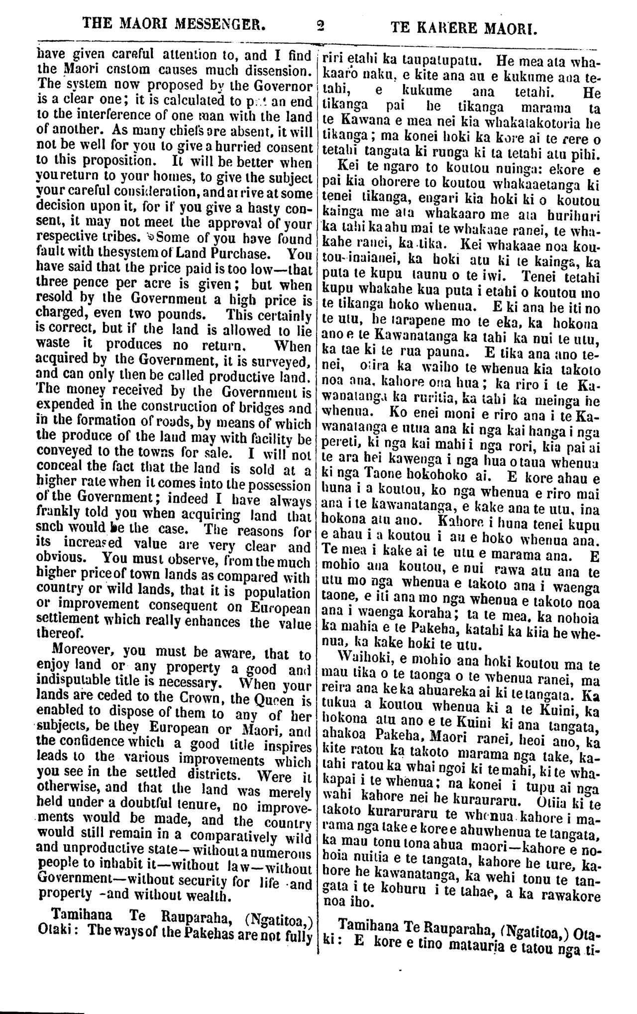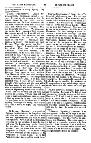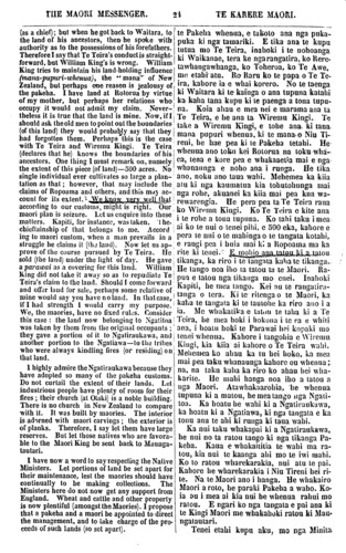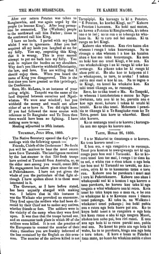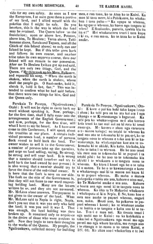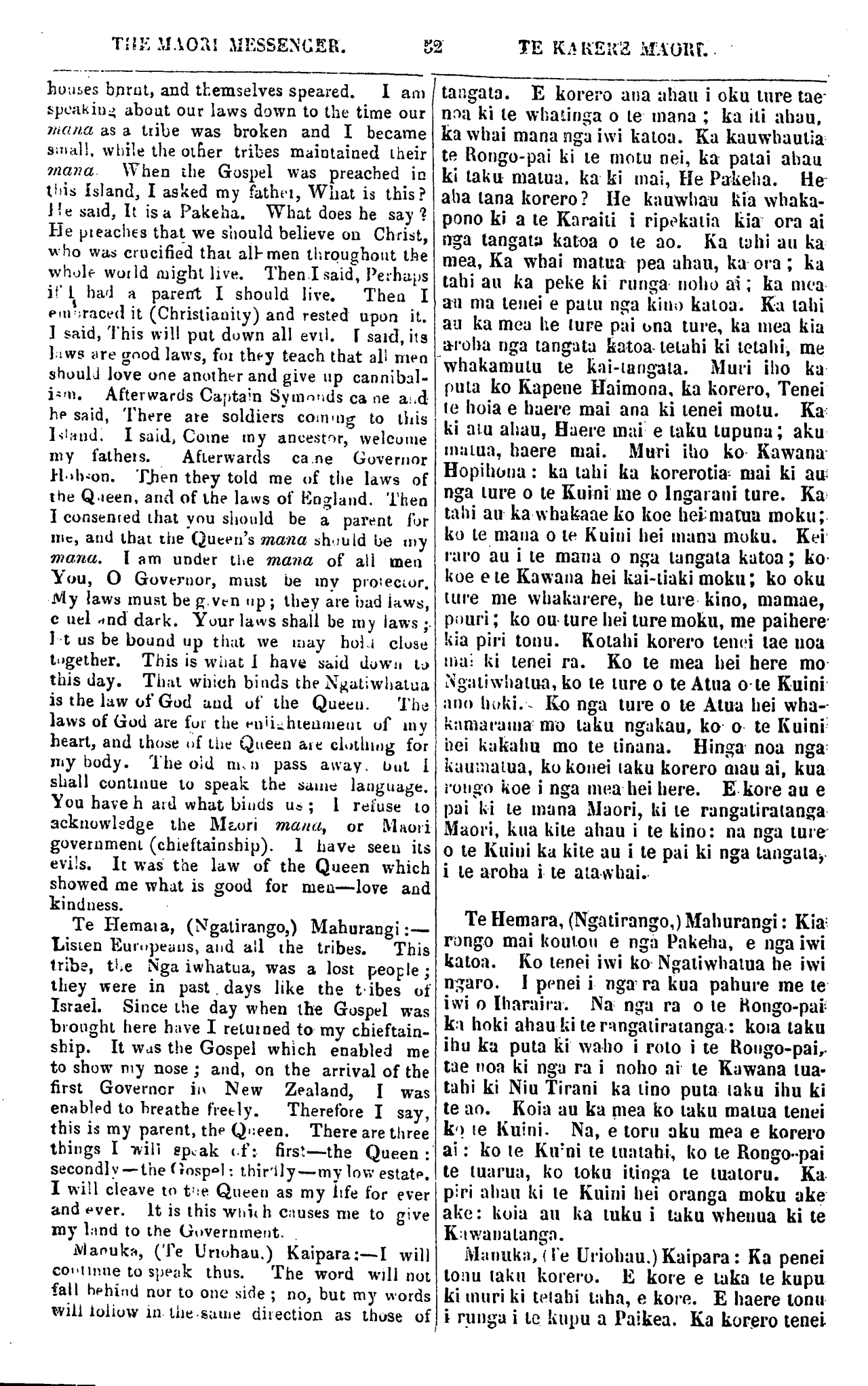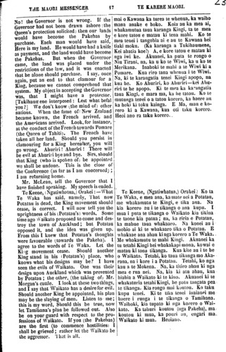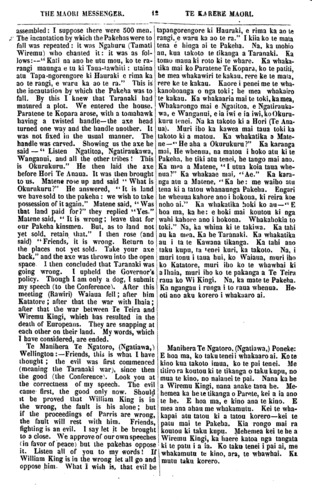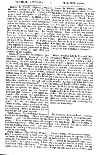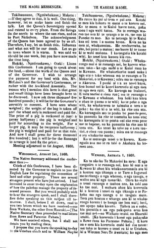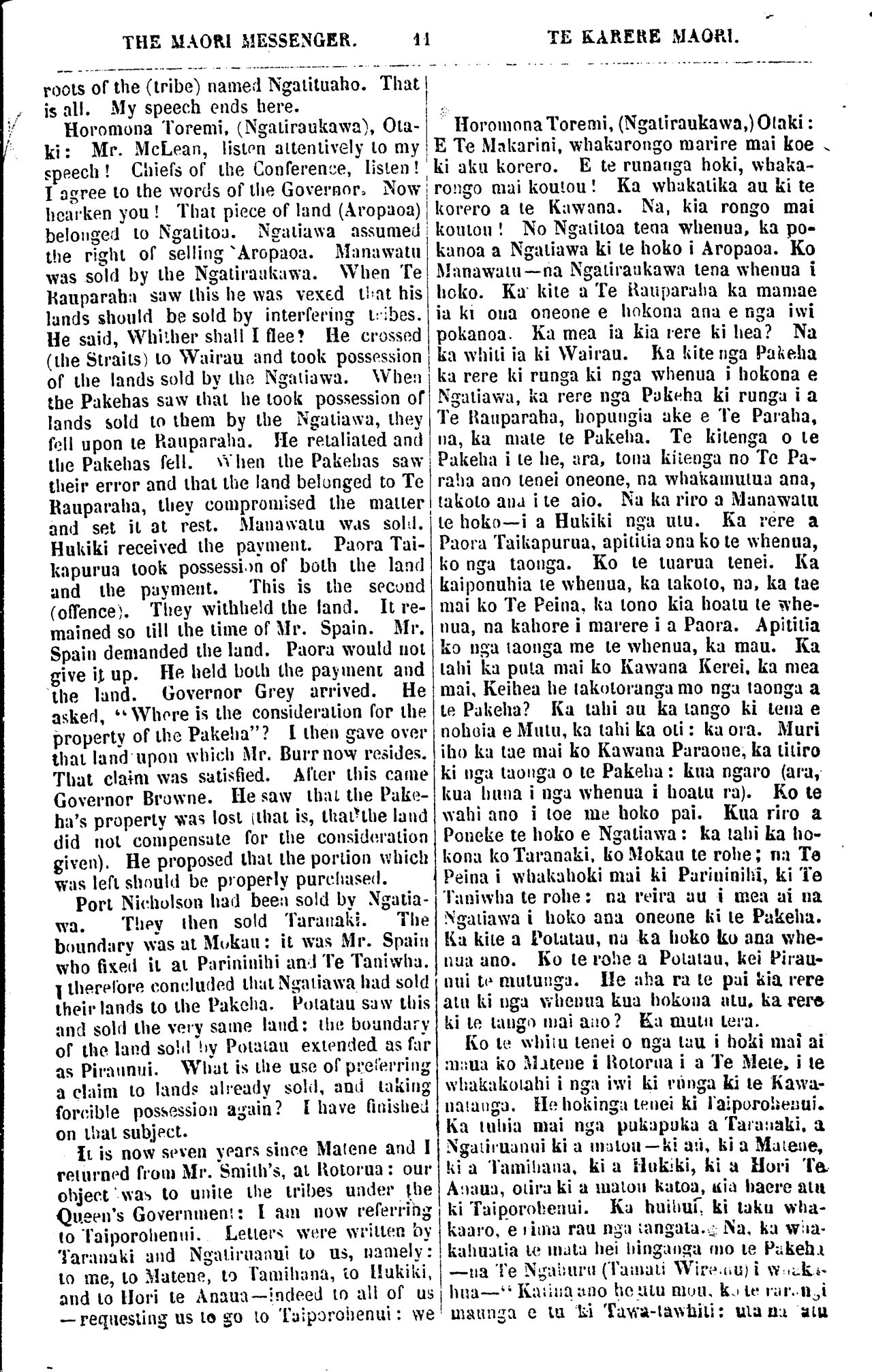THE MAORI MESSENGER. TE KARERE MAORI. Matene Te Whiwhi, (Ngatitoa,) Otaki: We have nothing to say, nor anything different to bring forward. Although the men are dead who agreed to the treaty of Waitangi, the words of the Maori are kept. Only now, after the expiration of twenty years, has the question of union been mooted, and we are offered all the advantages thereof. Now, for the first time, the question has been opened. This pleases me. I am glad because of this Conference. Let our work be carried on every year, Let the Governor, on each succeeding year, invite us to a Conference. Do not let us look at the faults of the Governor. All I desire is that (the races) be cemented. There has been a free expression of opinion. I will not say that I will decide the question (of an annual Conference); rather let each chief give utterance to his thoughts. Winiata Pekamu Tohi Te Ururangi, (Nga- tiwhakaue.) Maketu: Chiefs of this Con- ference, what Mr. McLean has said is cor- rect, namely, that each chief should return to his home, and there consider the subdi- vision of the land. There is only one other subject now for us to speak on. and that is the union (of races). As to the land, say nothing more on that subject. The land is the source of all the troubles of this Island. When we return to our homes let each man define (the boundaries of) his land, and we shall thus avoid difficulties (death). I will define my own land. Let us have one Lord. and then our opinions will agree. Let us have but one Queen, and one Governor. You have said, Return to your homes and consider this matter (the subdivision of land); that is correct. The Governor. and the Governor alone shall be my head (or chief). Let me (the Maori) enter the Pakeha Council, that my word may be right, because the opinions of the Pakeha Council are conflicting. Secure an entrance for me that we may all consult together. Tukihaumene, (Ngatiwhakaue,) Rotorua: I shall not be desultory. (I have only one subject.) Only the Queen—only the Go- vernor. I have uttered my words, and they have been suppressed. What have we to do with the troubles about land? Let these matters be carefully considered, lest other words be introduced. Paora Tuhaere, (Ngatiwhatua, Orakei): This is my speech to you—a word respecting the Treaty of Waitangi, the covenant now spoken of. The union of the two races com- menced with it. By it the sovereignty of these Islands was ceded to the Queen. The regu- lations respecting the sale of land com- Matene Te Whiwhi, (Ngatitoa,) Otaki: Kahore he kupu ma matou kahore he rere- nga ketanga; ahakoa kua male ki te po nga tangata i whakaaetia ai te Tiriti o Waitangi e tiakina ana nga kupu o te Maori. Ka rua tekau tau ka tahi ka tuwhera te kupu kia kotahi tatou ka meinga ko nga mea katoa kia riro mai ki a tatou. Heoi ano ko te tuwheratanga tuatahi tenei; ko taku tenei e pai ai. E hari ana ahau mo tenei mea mo te runanga. Ko la tatou mahi me mahi to- nu i roto i nga tau. I ia tau ka karanga te Kawana ki a tatou kia haere mai ki te runa- nga. Kaua tatou e titiro ki nga he o te Ka- wana; heoi ano ki au ko te whakau anake. Kua puaki nui nga kupu; ekore au e mea maku e whakaoti; waiho ma ia rangatira ma ia rangatira tona whakaaro e whakapuaki. Winiata Pekamu Tohi Te Ururangi, (Nga- tiwhakaue,) Maketu: E nga rangatira o tenei runanga, e tika ana te kupu a te Maka- rini, me hoki ia tangata ia tangata ki tona kainga ki te mahi i tona pihi ano. Ko tahi tonu te kupu mo tatou inaianei ko te wha- kakotahi anake. Ko te whenua, kati te ku- pu ki te whenua, ko te mate nui tena o tenei motu; kia tae ki te kainga ma ia tangata ma ia tangata ano e hanga tona whenua, penei ekore e pa te mate. Maku ano e hunga to- ku whenua. Kia kotahi te Ariki, kia kotahi ai whakaaro; kotahi te Kuini, kotahi te Ka- wana. Ka ki mai na koe me hoki ki te kai- nga mahi ai, e tika ana. Engari ko te tu- muaki moku ko te Kawana, ko te Kawana anake. Kia tapoto ahau ki roto ki te runa- nga Pakeha kia tika taku mahi; ko te wha- kaaro o te runanga Pakeha e rere ke ana. Kia whakapumautia e koe taku tapokoranga kia kotahi ano korerotanga. Tukihaumene, (Ngatiwhakaue,) Maketu: E kore au e tipokapoka; ko te Kuini anake, ko te Kawana anake. Kua puta taku kupu, pehia ana taku kupu. Hei aha ma tatou te kino o te whenua? Kia pai te whakaaro kei rere mai te kupu ke. Paora Tuhaere, (Ngatiwhatua,) Orakei: Tenei taku ki a koutou, he kupu mo te Tiriti ki Waitangi, mo te kawenata e korerotia nei. I timataia te whakakotahitanga ki tena, me te rironga ano hoki o te mana o tenei motu ki raro ki te maru o te Kuini, me nga tikanga ano hoki mo te whenua i timata mai