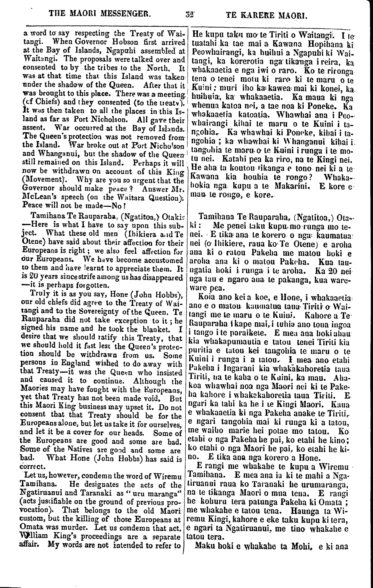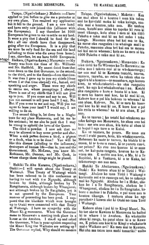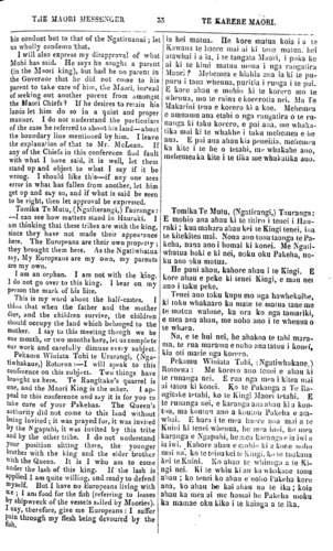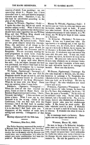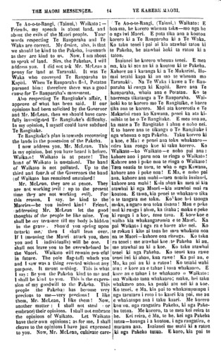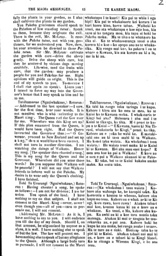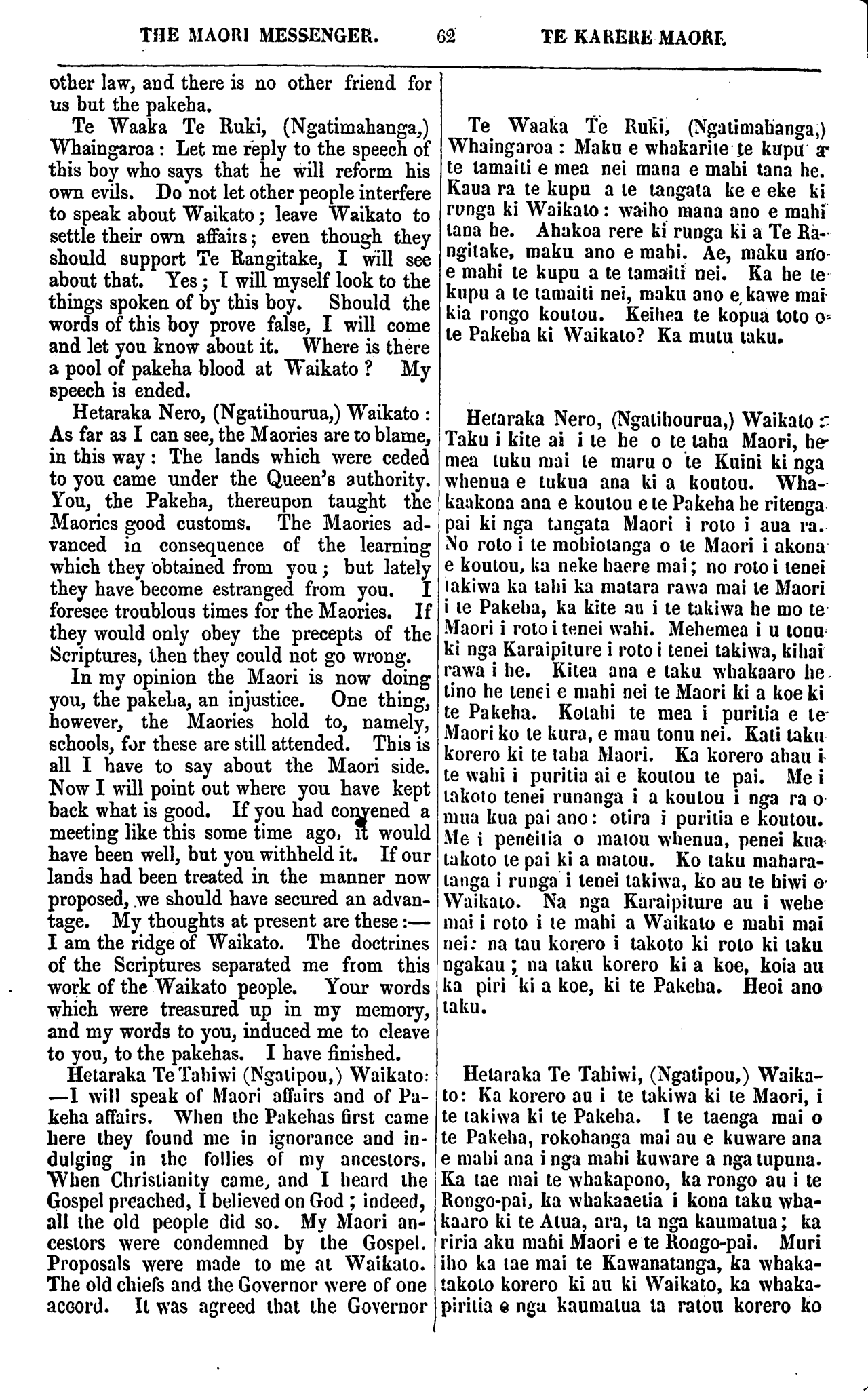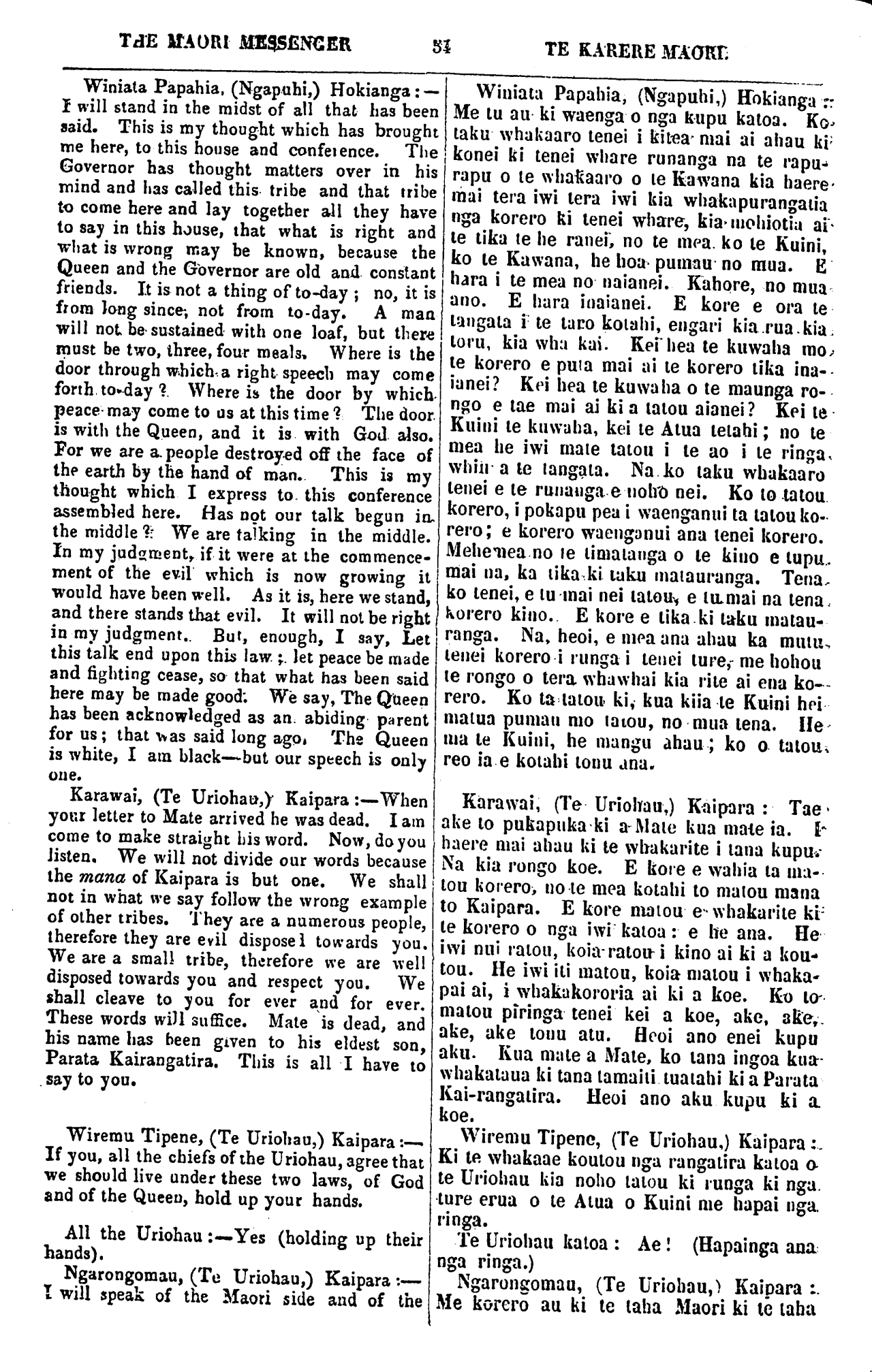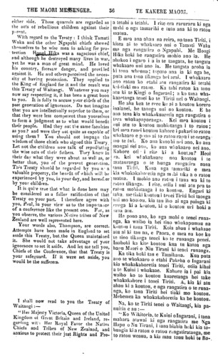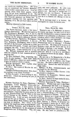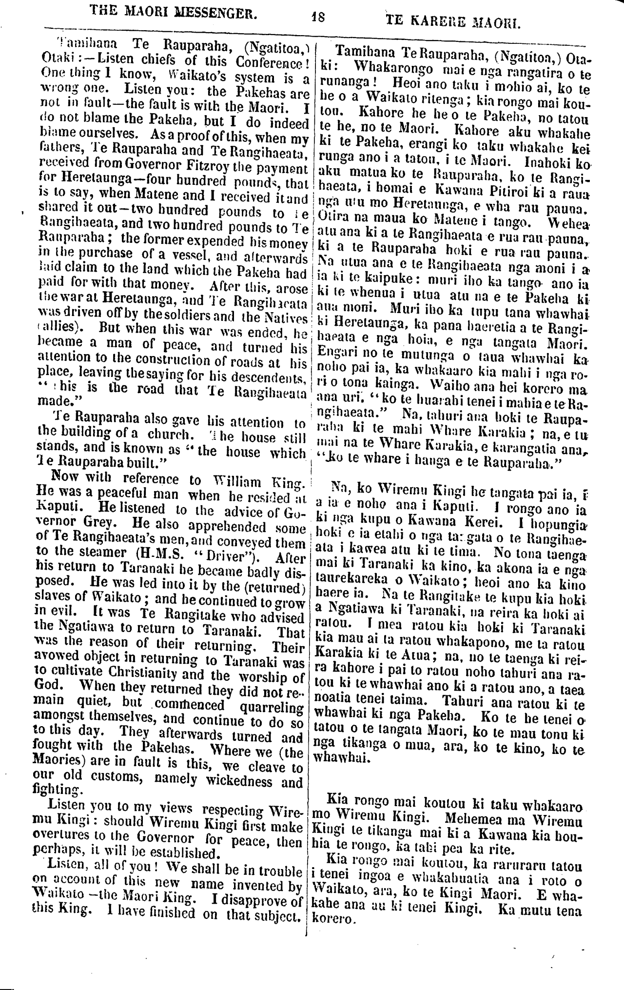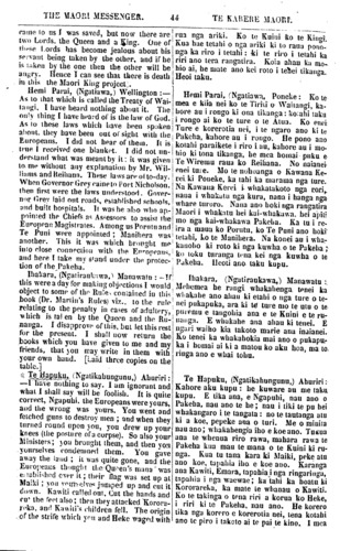 THE MAORI MESSENGER. TE KARERE MAORI. Matene Te Whiwhi, (Ngatitoa,) Otaki: We have nothing to say, nor anything different to bring forward. Although the men are dead who agreed to the treaty of Waitangi, the words of the Maori are kept. Only now, after the expiration of twenty years, has the question of union been mooted, and we are offered all the advantages thereof. Now, for the first time, the question has been opened. This pleases me. I am glad because of this Conference. Let our work be carried on every year, Let the Governor, on each succeeding year, invite us to a Conference. Do not let us look at the faults of the Governor. All I desire is that (the races) be cemented. There has been a free expression of opinion. I will not say that I will decide the question (of an annual Conference); rather let each chief give utterance to his thoughts. Winiata Pekamu Tohi Te Ururangi, (Nga- tiwhakaue.) Maketu: Chiefs of this Con- ference, what Mr. McLean has said is cor- rect, namely, that each chief should return to his home, and there consider the subdi- vision of the land. There is only one other subject now for us to speak on. and that is the union (of races). As to the land, say nothing more on that subject. The land is the source of all the troubles of this Island. When we return to our homes let each man define (the boundaries of) his land, and we shall thus avoid difficulties (death). I will define my own land. Let us have one Lord. and then our opinions will agree. Let us have but one Queen, and one Governor. You have said, Return to your homes and consider this matter (the subdivision of land); that is correct. The Governor. and the Governor alone shall be my head (or chief). Let me (the Maori) enter the Pakeha Council, that my word may be right, because the opinions of the Pakeha Council are conflicting. Secure an entrance for me that we may all consult together. Tukihaumene, (Ngatiwhakaue,) Rotorua: I shall not be desultory. (I have only one subject.) Only the Queen—only the Go- vernor. I have uttered my words, and they have been suppressed. What have we to do with the troubles about land? Let these matters be carefully considered, lest other words be introduced. Paora Tuhaere, (Ngatiwhatua, Orakei): This is my speech to you—a word respecting the Treaty of Waitangi, the covenant now spoken of. The union of the two races com- menced with it. By it the sovereignty of these Islands was ceded to the Queen. The regu- lations respecting the sale of land com- Matene Te Whiwhi, (Ngatitoa,) Otaki: Kahore he kupu ma matou kahore he rere- nga ketanga; ahakoa kua male ki te po nga tangata i whakaaetia ai te Tiriti o Waitangi e tiakina ana nga kupu o te Maori. Ka rua tekau tau ka tahi ka tuwhera te kupu kia kotahi tatou ka meinga ko nga mea katoa kia riro mai ki a tatou. Heoi ano ko te tuwheratanga tuatahi tenei; ko taku tenei e pai ai. E hari ana ahau mo tenei mea mo te runanga. Ko la tatou mahi me mahi to- nu i roto i nga tau. I ia tau ka karanga te Kawana ki a tatou kia haere mai ki te runa- nga. Kaua tatou e titiro ki nga he o te Ka- wana; heoi ano ki au ko te whakau anake. Kua puaki nui nga kupu; ekore au e mea maku e whakaoti; waiho ma ia rangatira ma ia rangatira tona whakaaro e whakapuaki. Winiata Pekamu Tohi Te Ururangi, (Nga- tiwhakaue,) Maketu: E nga rangatira o tenei runanga, e tika ana te kupu a te Maka- rini, me hoki ia tangata ia tangata ki tona kainga ki te mahi i tona pihi ano. Ko tahi tonu te kupu mo tatou inaianei ko te wha- kakotahi anake. Ko te whenua, kati te ku- pu ki te whenua, ko te mate nui tena o tenei motu; kia tae ki te kainga ma ia tangata ma ia tangata ano e hanga tona whenua, penei ekore e pa te mate. Maku ano e hunga to- ku whenua. Kia kotahi te Ariki, kia kotahi ai whakaaro; kotahi te Kuini, kotahi te Ka- wana. Ka ki mai na koe me hoki ki te kai- nga mahi ai, e tika ana. Engari ko te tu- muaki moku ko te Kawana, ko te Kawana anake. Kia tapoto ahau ki roto ki te runa- nga Pakeha kia tika taku mahi; ko te wha- kaaro o te runanga Pakeha e rere ke ana. Kia whakapumautia e koe taku tapokoranga kia kotahi ano korerotanga. Tukihaumene, (Ngatiwhakaue,) Maketu: E kore au e tipokapoka; ko te Kuini anake, ko te Kawana anake. Kua puta taku kupu, pehia ana taku kupu. Hei aha ma tatou te kino o te whenua? Kia pai te whakaaro kei rere mai te kupu ke. Paora Tuhaere, (Ngatiwhatua,) Orakei: Tenei taku ki a koutou, he kupu mo te Tiriti ki Waitangi, mo te kawenata e korerotia nei. I timataia te whakakotahitanga ki tena, me te rironga ano hoki o te mana o tenei motu ki raro ki te maru o te Kuini, me nga tikanga ano hoki mo te whenua i timata mai