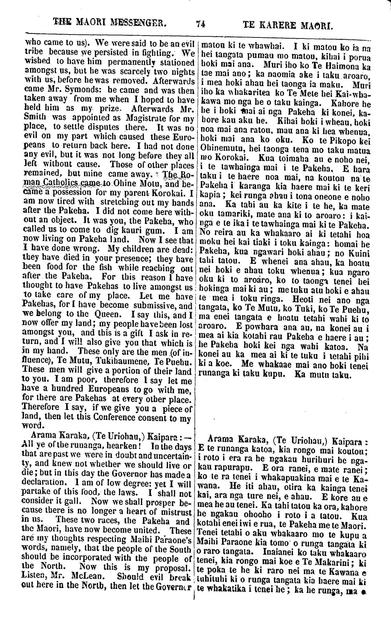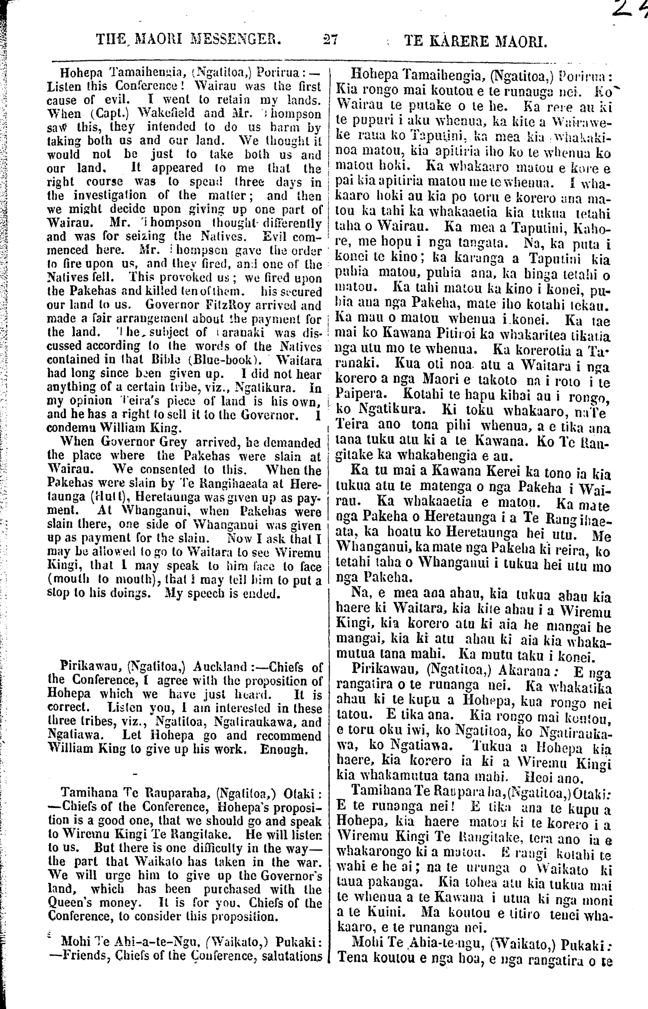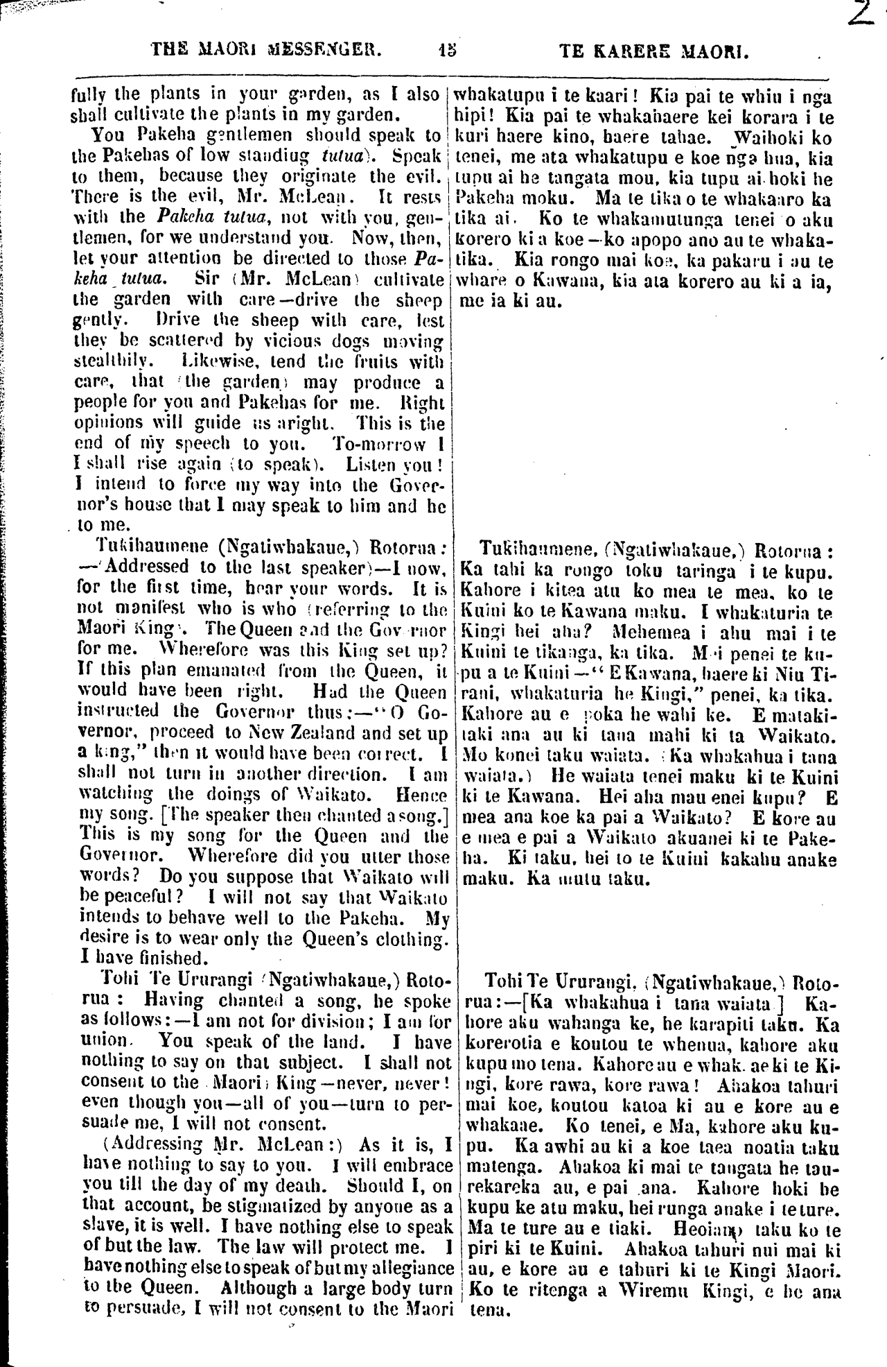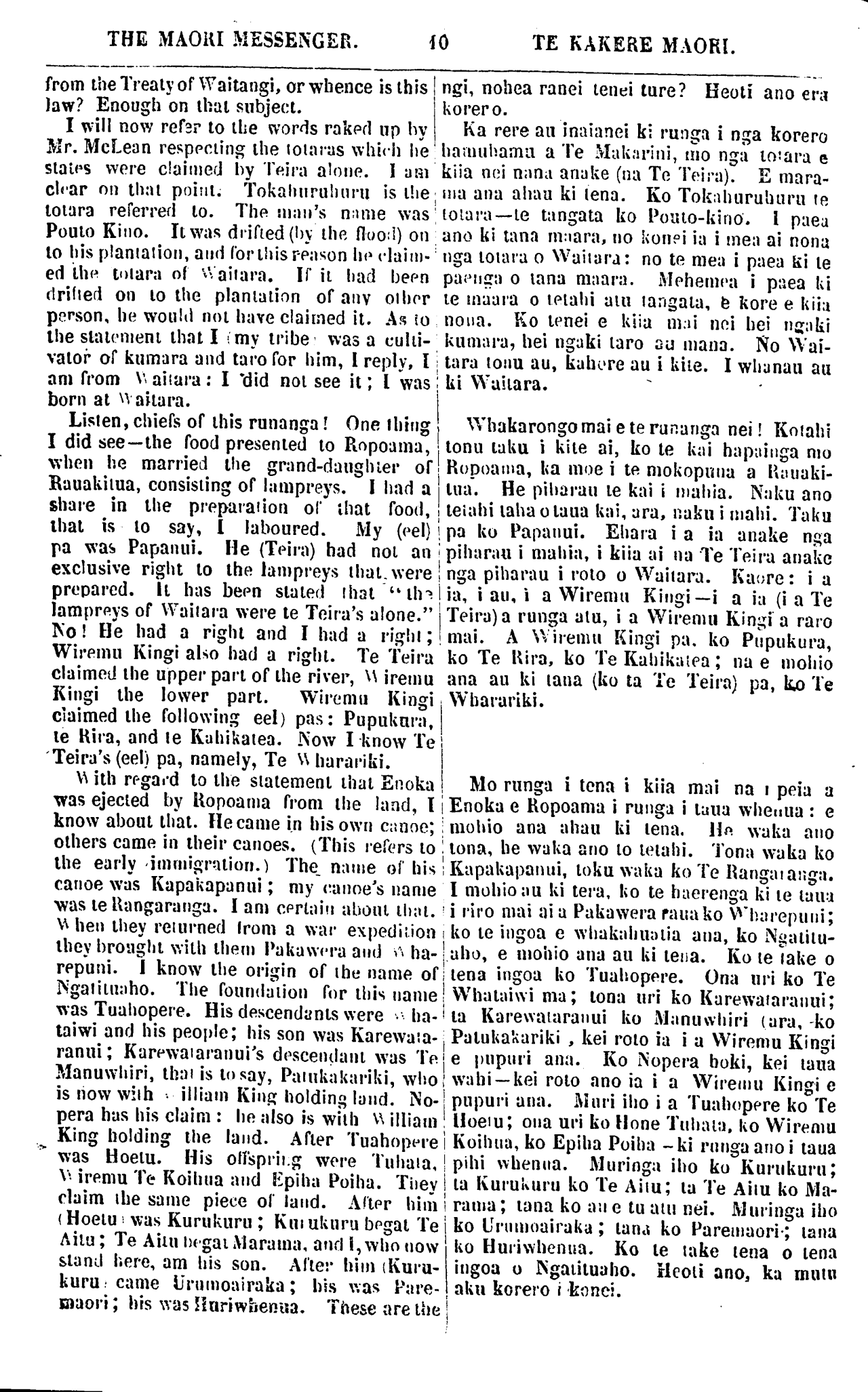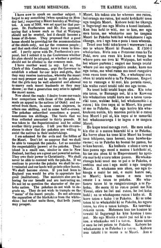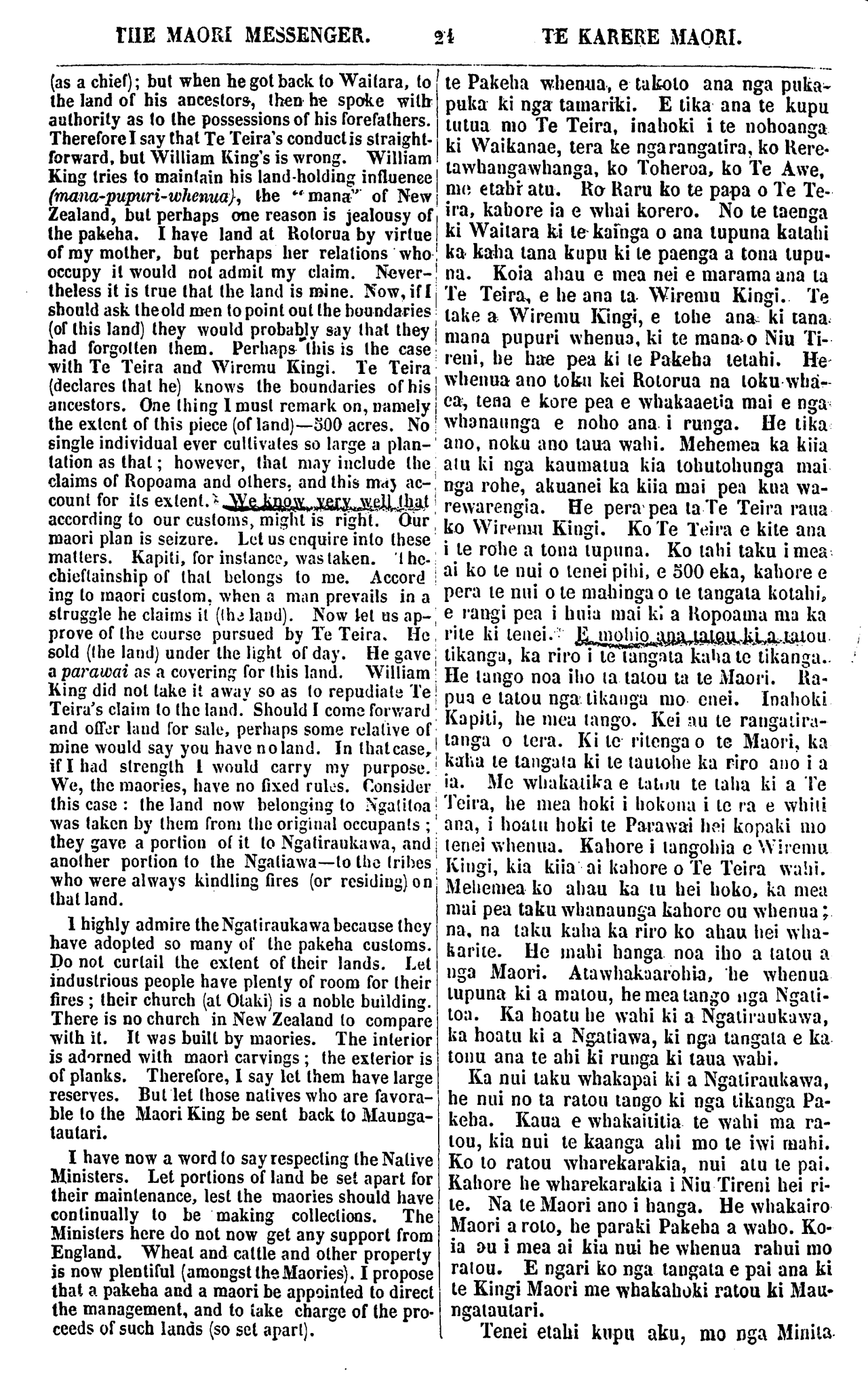THE MAORI MESSENGER. TE KARERE MAORI. Matene Te Whiwhi, (Ngatitoa,) Otaki: We have nothing to say, nor anything different to bring forward. Although the men are dead who agreed to the treaty of Waitangi, the words of the Maori are kept. Only now, after the expiration of twenty years, has the question of union been mooted, and we are offered all the advantages thereof. Now, for the first time, the question has been opened. This pleases me. I am glad because of this Conference. Let our work be carried on every year, Let the Governor, on each succeeding year, invite us to a Conference. Do not let us look at the faults of the Governor. All I desire is that (the races) be cemented. There has been a free expression of opinion. I will not say that I will decide the question (of an annual Conference); rather let each chief give utterance to his thoughts. Winiata Pekamu Tohi Te Ururangi, (Nga- tiwhakaue.) Maketu: Chiefs of this Con- ference, what Mr. McLean has said is cor- rect, namely, that each chief should return to his home, and there consider the subdi- vision of the land. There is only one other subject now for us to speak on. and that is the union (of races). As to the land, say nothing more on that subject. The land is the source of all the troubles of this Island. When we return to our homes let each man define (the boundaries of) his land, and we shall thus avoid difficulties (death). I will define my own land. Let us have one Lord. and then our opinions will agree. Let us have but one Queen, and one Governor. You have said, Return to your homes and consider this matter (the subdivision of land); that is correct. The Governor. and the Governor alone shall be my head (or chief). Let me (the Maori) enter the Pakeha Council, that my word may be right, because the opinions of the Pakeha Council are conflicting. Secure an entrance for me that we may all consult together. Tukihaumene, (Ngatiwhakaue,) Rotorua: I shall not be desultory. (I have only one subject.) Only the Queen—only the Go- vernor. I have uttered my words, and they have been suppressed. What have we to do with the troubles about land? Let these matters be carefully considered, lest other words be introduced. Paora Tuhaere, (Ngatiwhatua, Orakei): This is my speech to you—a word respecting the Treaty of Waitangi, the covenant now spoken of. The union of the two races com- menced with it. By it the sovereignty of these Islands was ceded to the Queen. The regu- lations respecting the sale of land com- Matene Te Whiwhi, (Ngatitoa,) Otaki: Kahore he kupu ma matou kahore he rere- nga ketanga; ahakoa kua male ki te po nga tangata i whakaaetia ai te Tiriti o Waitangi e tiakina ana nga kupu o te Maori. Ka rua tekau tau ka tahi ka tuwhera te kupu kia kotahi tatou ka meinga ko nga mea katoa kia riro mai ki a tatou. Heoi ano ko te tuwheratanga tuatahi tenei; ko taku tenei e pai ai. E hari ana ahau mo tenei mea mo te runanga. Ko la tatou mahi me mahi to- nu i roto i nga tau. I ia tau ka karanga te Kawana ki a tatou kia haere mai ki te runa- nga. Kaua tatou e titiro ki nga he o te Ka- wana; heoi ano ki au ko te whakau anake. Kua puaki nui nga kupu; ekore au e mea maku e whakaoti; waiho ma ia rangatira ma ia rangatira tona whakaaro e whakapuaki. Winiata Pekamu Tohi Te Ururangi, (Nga- tiwhakaue,) Maketu: E nga rangatira o tenei runanga, e tika ana te kupu a te Maka- rini, me hoki ia tangata ia tangata ki tona kainga ki te mahi i tona pihi ano. Ko tahi tonu te kupu mo tatou inaianei ko te wha- kakotahi anake. Ko te whenua, kati te ku- pu ki te whenua, ko te mate nui tena o tenei motu; kia tae ki te kainga ma ia tangata ma ia tangata ano e hanga tona whenua, penei ekore e pa te mate. Maku ano e hunga to- ku whenua. Kia kotahi te Ariki, kia kotahi ai whakaaro; kotahi te Kuini, kotahi te Ka- wana. Ka ki mai na koe me hoki ki te kai- nga mahi ai, e tika ana. Engari ko te tu- muaki moku ko te Kawana, ko te Kawana anake. Kia tapoto ahau ki roto ki te runa- nga Pakeha kia tika taku mahi; ko te wha- kaaro o te runanga Pakeha e rere ke ana. Kia whakapumautia e koe taku tapokoranga kia kotahi ano korerotanga. Tukihaumene, (Ngatiwhakaue,) Maketu: E kore au e tipokapoka; ko te Kuini anake, ko te Kawana anake. Kua puta taku kupu, pehia ana taku kupu. Hei aha ma tatou te kino o te whenua? Kia pai te whakaaro kei rere mai te kupu ke. Paora Tuhaere, (Ngatiwhatua,) Orakei: Tenei taku ki a koutou, he kupu mo te Tiriti ki Waitangi, mo te kawenata e korerotia nei. I timataia te whakakotahitanga ki tena, me te rironga ano hoki o te mana o tenei motu ki raro ki te maru o te Kuini, me nga tikanga ano hoki mo te whenua i timata mai