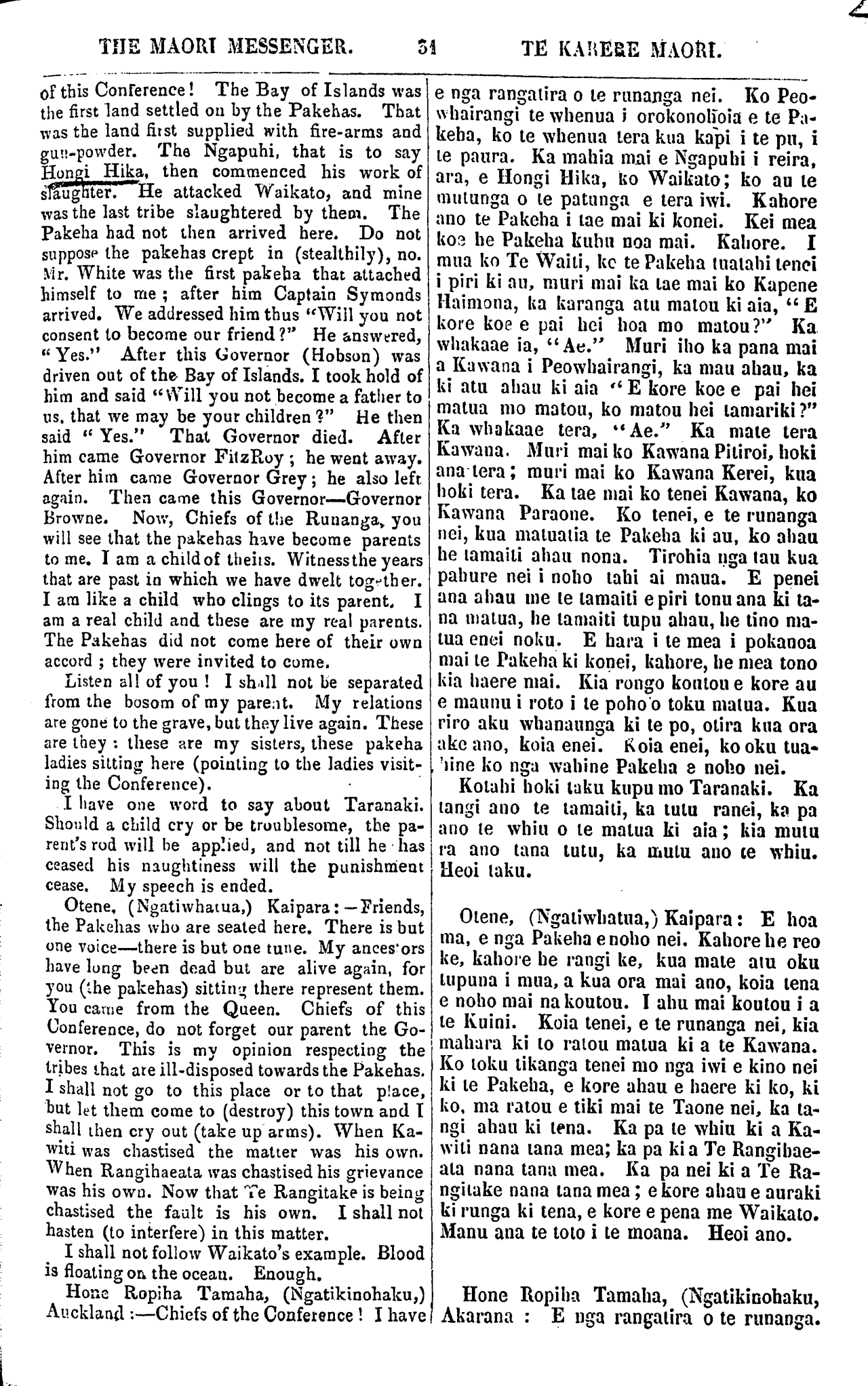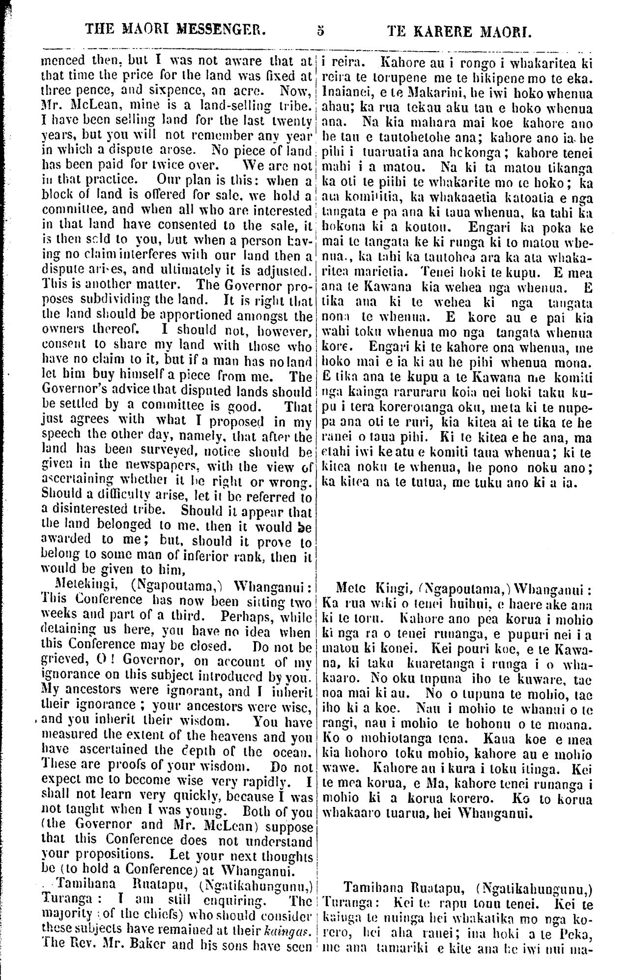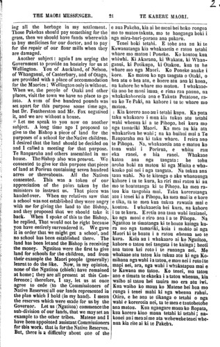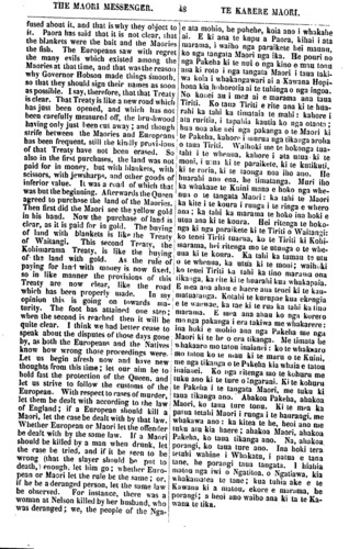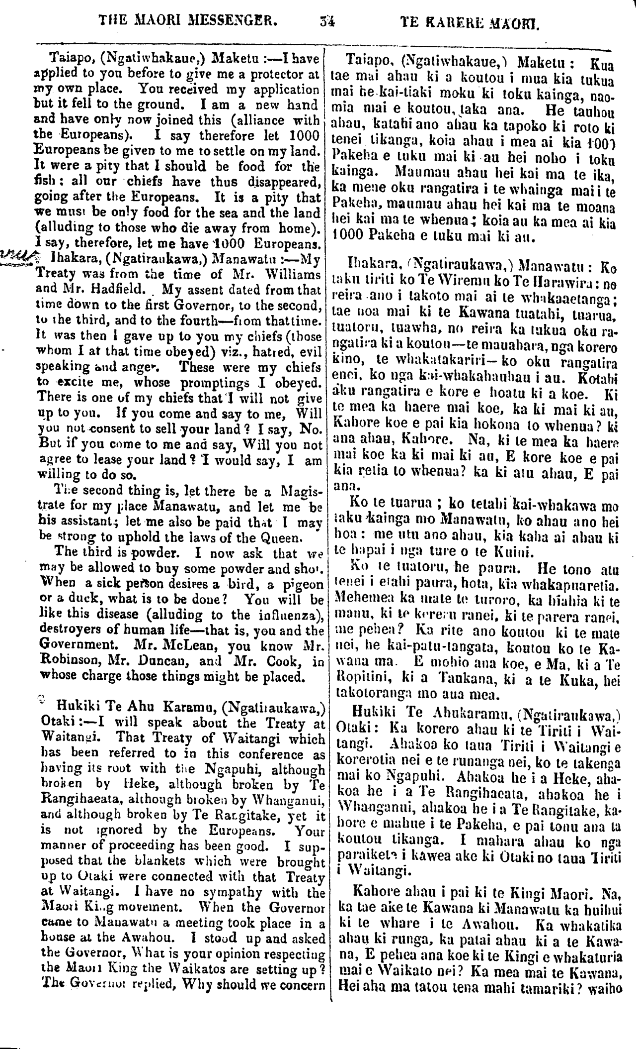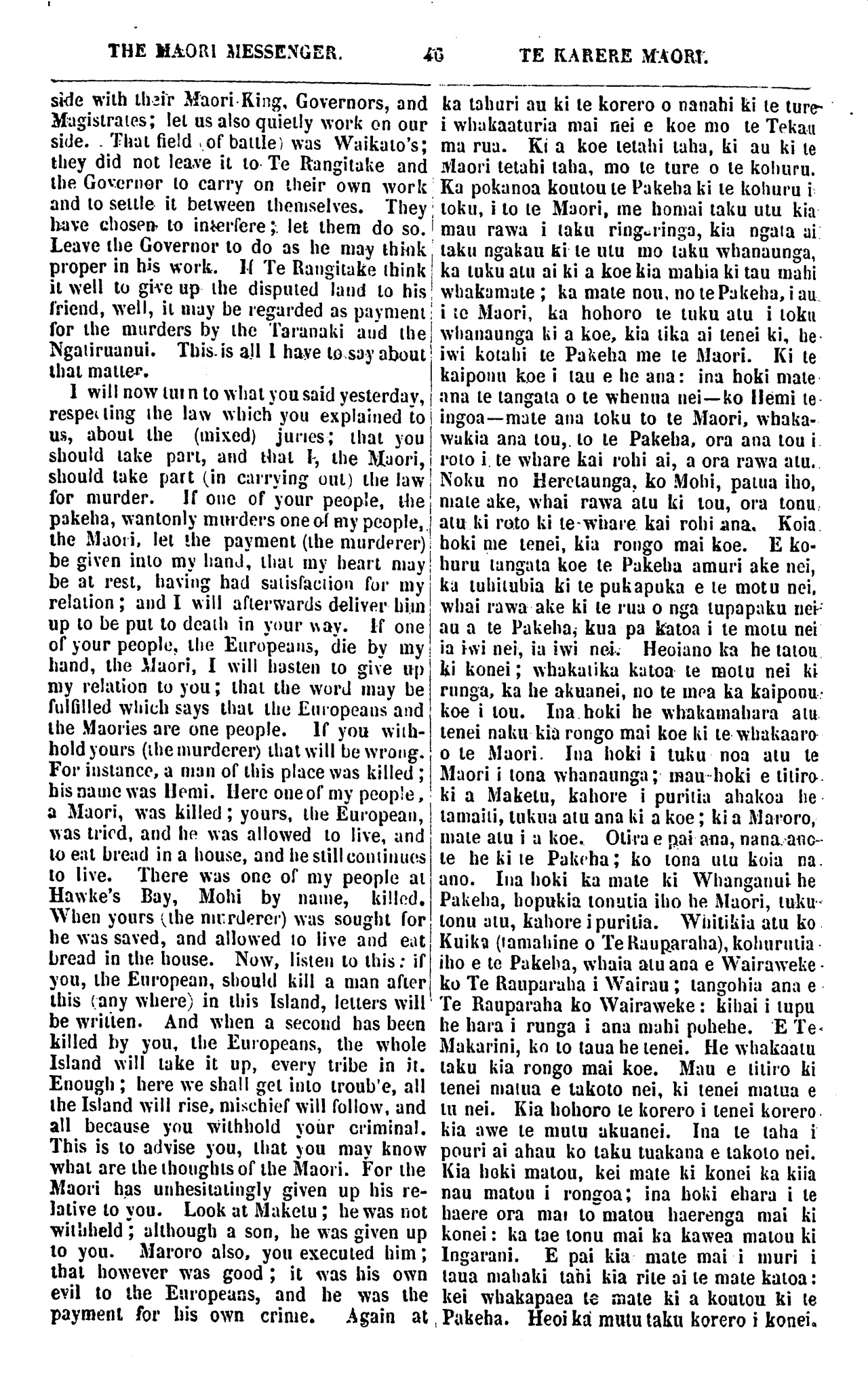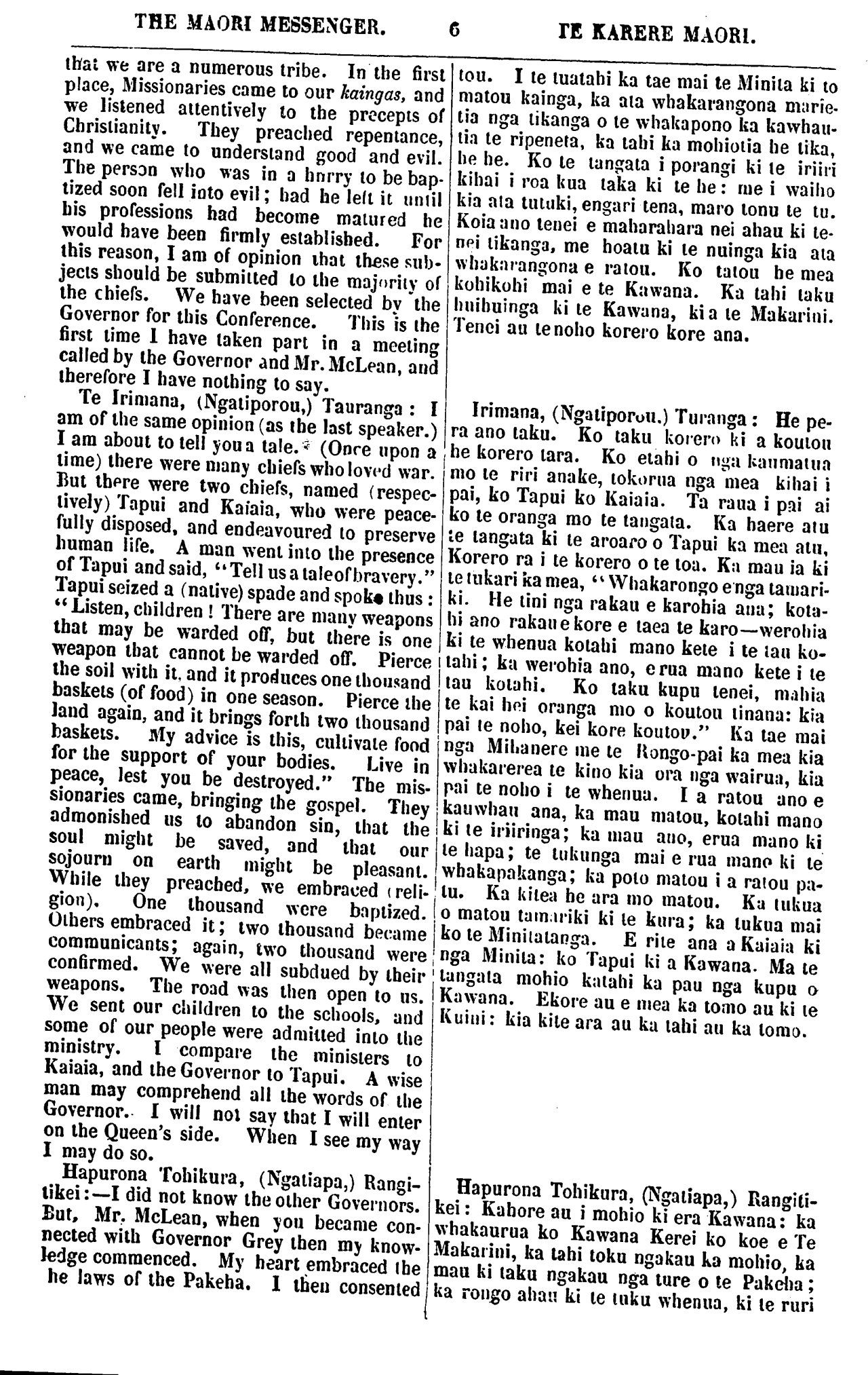 THE MAORI MESSENGER. TE KARERE MAORI. Matene Te Whiwhi, (Ngatitoa,) Otaki: We have nothing to say, nor anything different to bring forward. Although the men are dead who agreed to the treaty of Waitangi, the words of the Maori are kept. Only now, after the expiration of twenty years, has the question of union been mooted, and we are offered all the advantages thereof. Now, for the first time, the question has been opened. This pleases me. I am glad because of this Conference. Let our work be carried on every year, Let the Governor, on each succeeding year, invite us to a Conference. Do not let us look at the faults of the Governor. All I desire is that (the races) be cemented. There has been a free expression of opinion. I will not say that I will decide the question (of an annual Conference); rather let each chief give utterance to his thoughts. Winiata Pekamu Tohi Te Ururangi, (Nga- tiwhakaue.) Maketu: Chiefs of this Con- ference, what Mr. McLean has said is cor- rect, namely, that each chief should return to his home, and there consider the subdi- vision of the land. There is only one other subject now for us to speak on. and that is the union (of races). As to the land, say nothing more on that subject. The land is the source of all the troubles of this Island. When we return to our homes let each man define (the boundaries of) his land, and we shall thus avoid difficulties (death). I will define my own land. Let us have one Lord. and then our opinions will agree. Let us have but one Queen, and one Governor. You have said, Return to your homes and consider this matter (the subdivision of land); that is correct. The Governor. and the Governor alone shall be my head (or chief). Let me (the Maori) enter the Pakeha Council, that my word may be right, because the opinions of the Pakeha Council are conflicting. Secure an entrance for me that we may all consult together. Tukihaumene, (Ngatiwhakaue,) Rotorua: I shall not be desultory. (I have only one subject.) Only the Queen—only the Go- vernor. I have uttered my words, and they have been suppressed. What have we to do with the troubles about land? Let these matters be carefully considered, lest other words be introduced. Paora Tuhaere, (Ngatiwhatua, Orakei): This is my speech to you—a word respecting the Treaty of Waitangi, the covenant now spoken of. The union of the two races com- menced with it. By it the sovereignty of these Islands was ceded to the Queen. The regu- lations respecting the sale of land com- Matene Te Whiwhi, (Ngatitoa,) Otaki: Kahore he kupu ma matou kahore he rere- nga ketanga; ahakoa kua male ki te po nga tangata i whakaaetia ai te Tiriti o Waitangi e tiakina ana nga kupu o te Maori. Ka rua tekau tau ka tahi ka tuwhera te kupu kia kotahi tatou ka meinga ko nga mea katoa kia riro mai ki a tatou. Heoi ano ko te tuwheratanga tuatahi tenei; ko taku tenei e pai ai. E hari ana ahau mo tenei mea mo te runanga. Ko la tatou mahi me mahi to- nu i roto i nga tau. I ia tau ka karanga te Kawana ki a tatou kia haere mai ki te runa- nga. Kaua tatou e titiro ki nga he o te Ka- wana; heoi ano ki au ko te whakau anake. Kua puaki nui nga kupu; ekore au e mea maku e whakaoti; waiho ma ia rangatira ma ia rangatira tona whakaaro e whakapuaki. Winiata Pekamu Tohi Te Ururangi, (Nga- tiwhakaue,) Maketu: E nga rangatira o tenei runanga, e tika ana te kupu a te Maka- rini, me hoki ia tangata ia tangata ki tona kainga ki te mahi i tona pihi ano. Ko tahi tonu te kupu mo tatou inaianei ko te wha- kakotahi anake. Ko te whenua, kati te ku- pu ki te whenua, ko te mate nui tena o tenei motu; kia tae ki te kainga ma ia tangata ma ia tangata ano e hanga tona whenua, penei ekore e pa te mate. Maku ano e hunga to- ku whenua. Kia kotahi te Ariki, kia kotahi ai whakaaro; kotahi te Kuini, kotahi te Ka- wana. Ka ki mai na koe me hoki ki te kai- nga mahi ai, e tika ana. Engari ko te tu- muaki moku ko te Kawana, ko te Kawana anake. Kia tapoto ahau ki roto ki te runa- nga Pakeha kia tika taku mahi; ko te wha- kaaro o te runanga Pakeha e rere ke ana. Kia whakapumautia e koe taku tapokoranga kia kotahi ano korerotanga. Tukihaumene, (Ngatiwhakaue,) Maketu: E kore au e tipokapoka; ko te Kuini anake, ko te Kawana anake. Kua puta taku kupu, pehia ana taku kupu. Hei aha ma tatou te kino o te whenua? Kia pai te whakaaro kei rere mai te kupu ke. Paora Tuhaere, (Ngatiwhatua,) Orakei: Tenei taku ki a koutou, he kupu mo te Tiriti ki Waitangi, mo te kawenata e korerotia nei. I timataia te whakakotahitanga ki tena, me te rironga ano hoki o te mana o tenei motu ki raro ki te maru o te Kuini, me nga tikanga ano hoki mo te whenua i timata mai