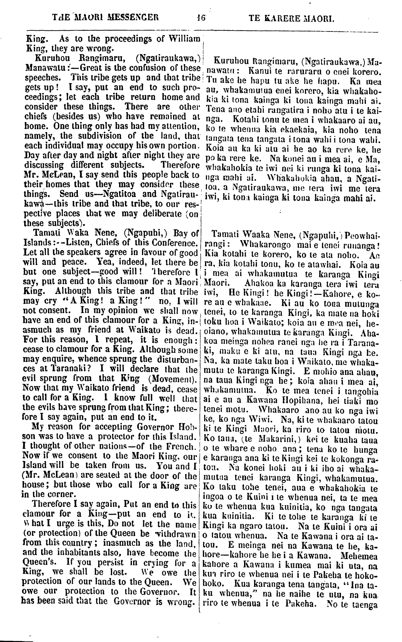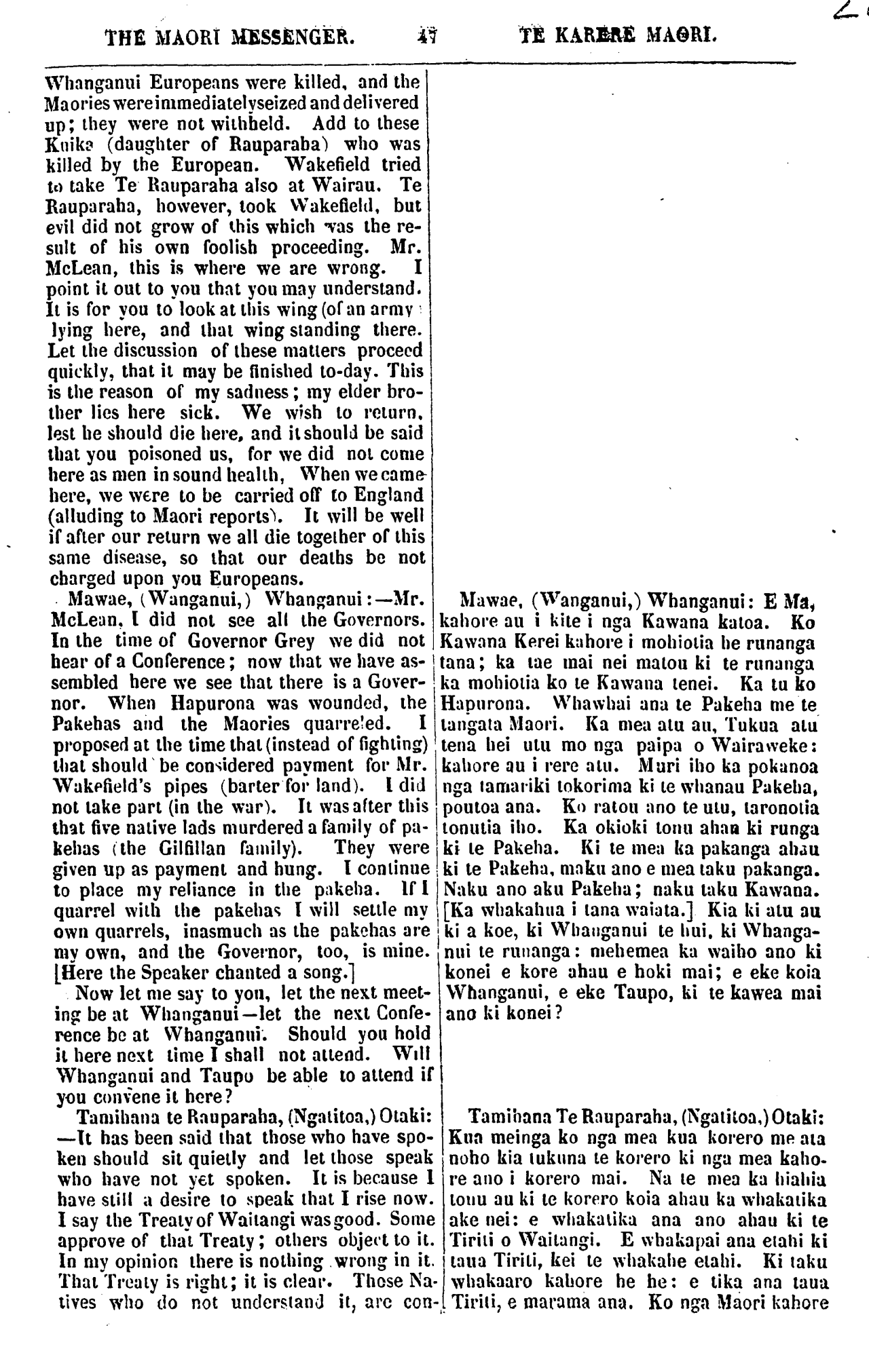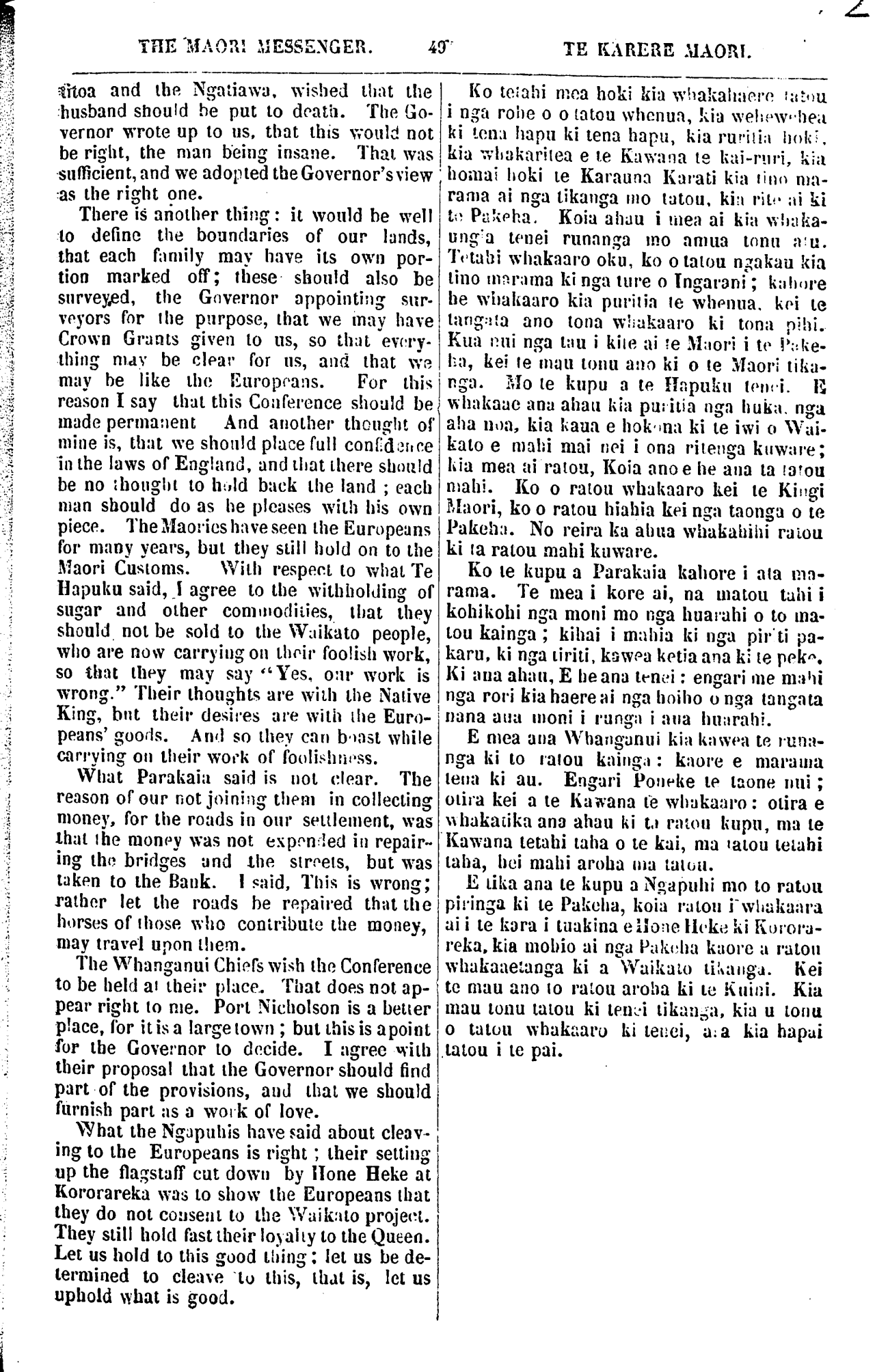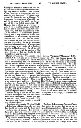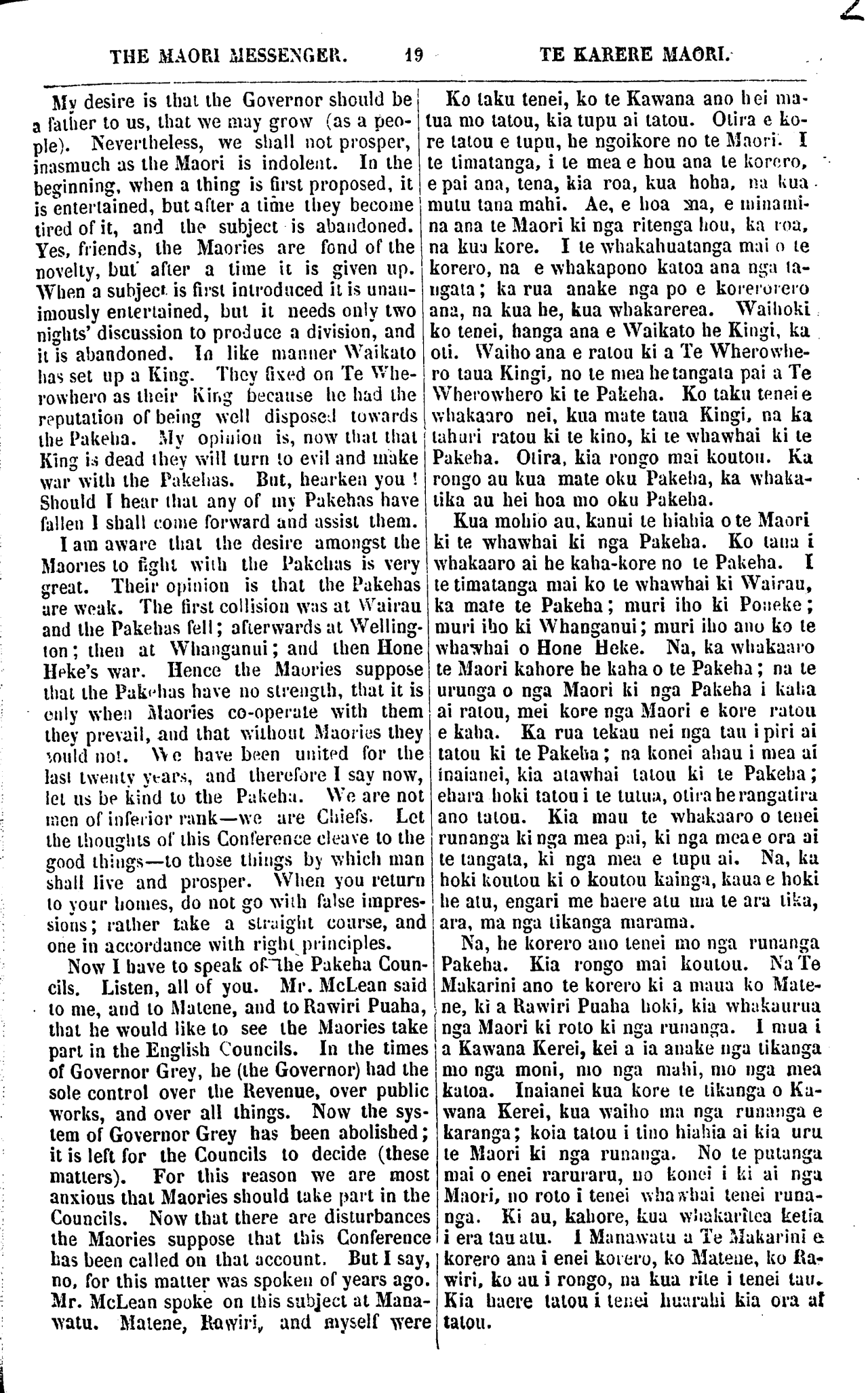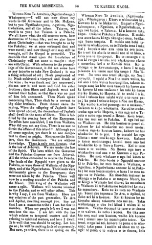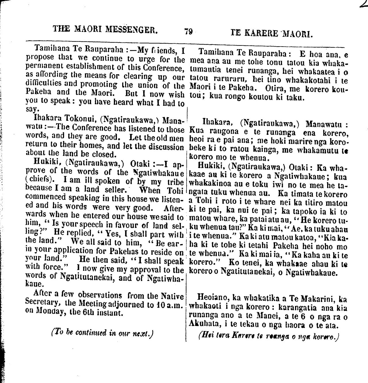 THE MAORI MESSENGER. TE KARERE MAORI. Matene Te Whiwhi, (Ngatitoa,) Otaki: We have nothing to say, nor anything different to bring forward. Although the men are dead who agreed to the treaty of Waitangi, the words of the Maori are kept. Only now, after the expiration of twenty years, has the question of union been mooted, and we are offered all the advantages thereof. Now, for the first time, the question has been opened. This pleases me. I am glad because of this Conference. Let our work be carried on every year, Let the Governor, on each succeeding year, invite us to a Conference. Do not let us look at the faults of the Governor. All I desire is that (the races) be cemented. There has been a free expression of opinion. I will not say that I will decide the question (of an annual Conference); rather let each chief give utterance to his thoughts. Winiata Pekamu Tohi Te Ururangi, (Nga- tiwhakaue.) Maketu: Chiefs of this Con- ference, what Mr. McLean has said is cor- rect, namely, that each chief should return to his home, and there consider the subdi- vision of the land. There is only one other subject now for us to speak on. and that is the union (of races). As to the land, say nothing more on that subject. The land is the source of all the troubles of this Island. When we return to our homes let each man define (the boundaries of) his land, and we shall thus avoid difficulties (death). I will define my own land. Let us have one Lord. and then our opinions will agree. Let us have but one Queen, and one Governor. You have said, Return to your homes and consider this matter (the subdivision of land); that is correct. The Governor. and the Governor alone shall be my head (or chief). Let me (the Maori) enter the Pakeha Council, that my word may be right, because the opinions of the Pakeha Council are conflicting. Secure an entrance for me that we may all consult together. Tukihaumene, (Ngatiwhakaue,) Rotorua: I shall not be desultory. (I have only one subject.) Only the Queen—only the Go- vernor. I have uttered my words, and they have been suppressed. What have we to do with the troubles about land? Let these matters be carefully considered, lest other words be introduced. Paora Tuhaere, (Ngatiwhatua, Orakei): This is my speech to you—a word respecting the Treaty of Waitangi, the covenant now spoken of. The union of the two races com- menced with it. By it the sovereignty of these Islands was ceded to the Queen. The regu- lations respecting the sale of land com- Matene Te Whiwhi, (Ngatitoa,) Otaki: Kahore he kupu ma matou kahore he rere- nga ketanga; ahakoa kua male ki te po nga tangata i whakaaetia ai te Tiriti o Waitangi e tiakina ana nga kupu o te Maori. Ka rua tekau tau ka tahi ka tuwhera te kupu kia kotahi tatou ka meinga ko nga mea katoa kia riro mai ki a tatou. Heoi ano ko te tuwheratanga tuatahi tenei; ko taku tenei e pai ai. E hari ana ahau mo tenei mea mo te runanga. Ko la tatou mahi me mahi to- nu i roto i nga tau. I ia tau ka karanga te Kawana ki a tatou kia haere mai ki te runa- nga. Kaua tatou e titiro ki nga he o te Ka- wana; heoi ano ki au ko te whakau anake. Kua puaki nui nga kupu; ekore au e mea maku e whakaoti; waiho ma ia rangatira ma ia rangatira tona whakaaro e whakapuaki. Winiata Pekamu Tohi Te Ururangi, (Nga- tiwhakaue,) Maketu: E nga rangatira o tenei runanga, e tika ana te kupu a te Maka- rini, me hoki ia tangata ia tangata ki tona kainga ki te mahi i tona pihi ano. Ko tahi tonu te kupu mo tatou inaianei ko te wha- kakotahi anake. Ko te whenua, kati te ku- pu ki te whenua, ko te mate nui tena o tenei motu; kia tae ki te kainga ma ia tangata ma ia tangata ano e hanga tona whenua, penei ekore e pa te mate. Maku ano e hunga to- ku whenua. Kia kotahi te Ariki, kia kotahi ai whakaaro; kotahi te Kuini, kotahi te Ka- wana. Ka ki mai na koe me hoki ki te kai- nga mahi ai, e tika ana. Engari ko te tu- muaki moku ko te Kawana, ko te Kawana anake. Kia tapoto ahau ki roto ki te runa- nga Pakeha kia tika taku mahi; ko te wha- kaaro o te runanga Pakeha e rere ke ana. Kia whakapumautia e koe taku tapokoranga kia kotahi ano korerotanga. Tukihaumene, (Ngatiwhakaue,) Maketu: E kore au e tipokapoka; ko te Kuini anake, ko te Kawana anake. Kua puta taku kupu, pehia ana taku kupu. Hei aha ma tatou te kino o te whenua? Kia pai te whakaaro kei rere mai te kupu ke. Paora Tuhaere, (Ngatiwhatua,) Orakei: Tenei taku ki a koutou, he kupu mo te Tiriti ki Waitangi, mo te kawenata e korerotia nei. I timataia te whakakotahitanga ki tena, me te rironga ano hoki o te mana o tenei motu ki raro ki te maru o te Kuini, me nga tikanga ano hoki mo te whenua i timata mai