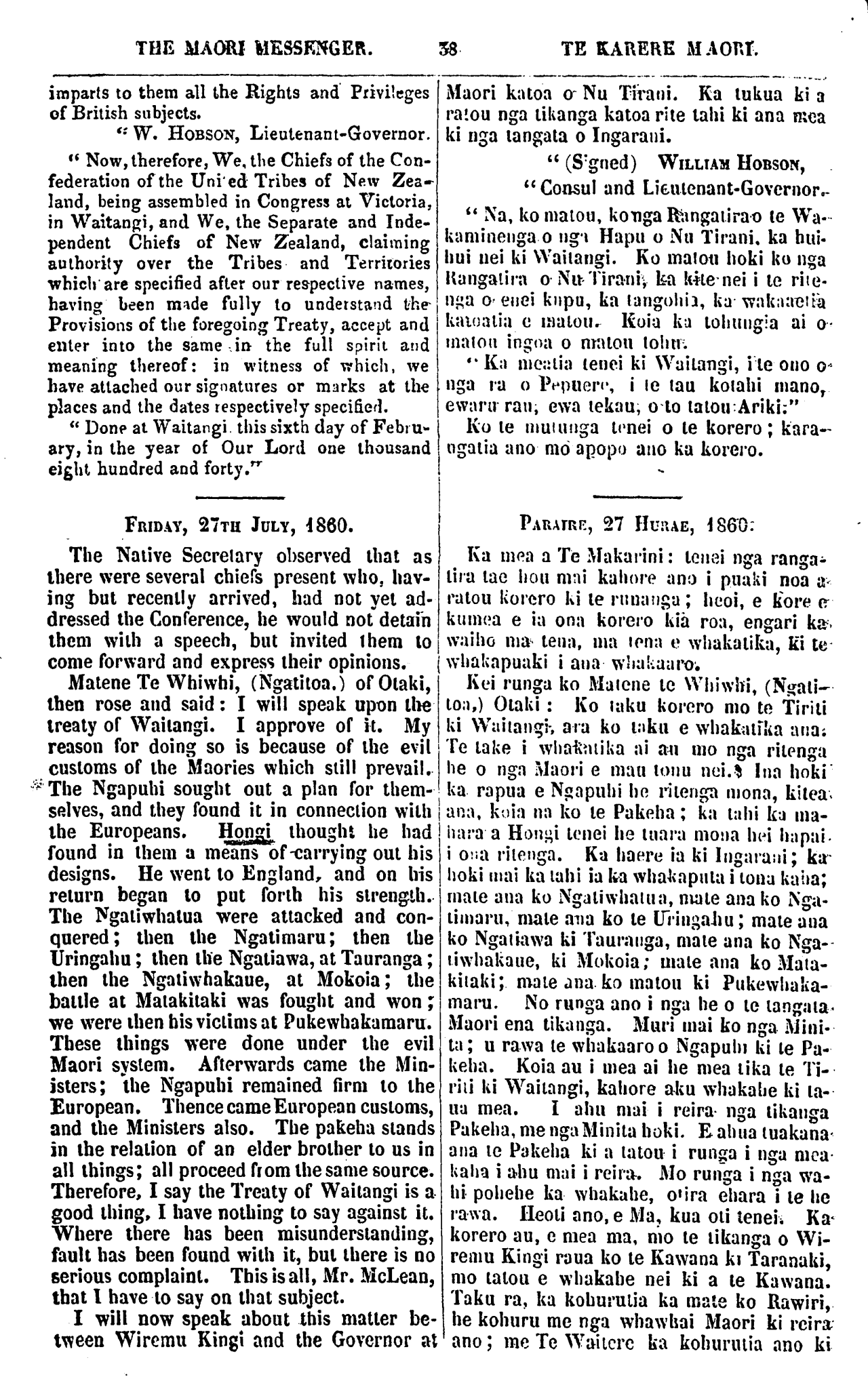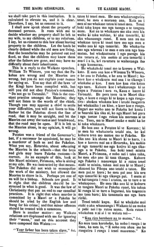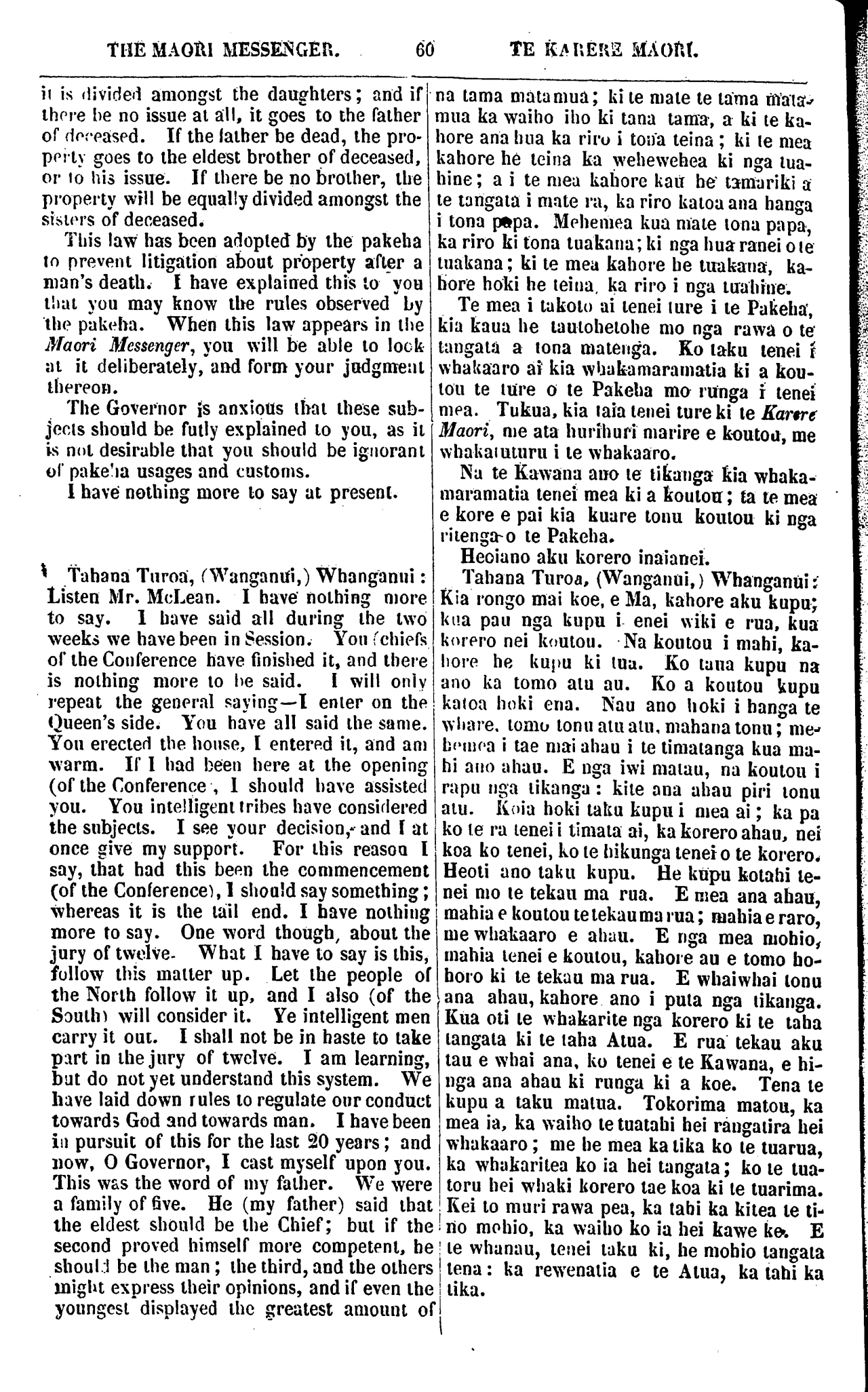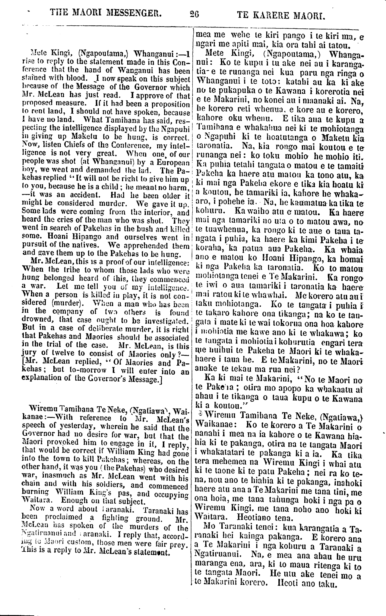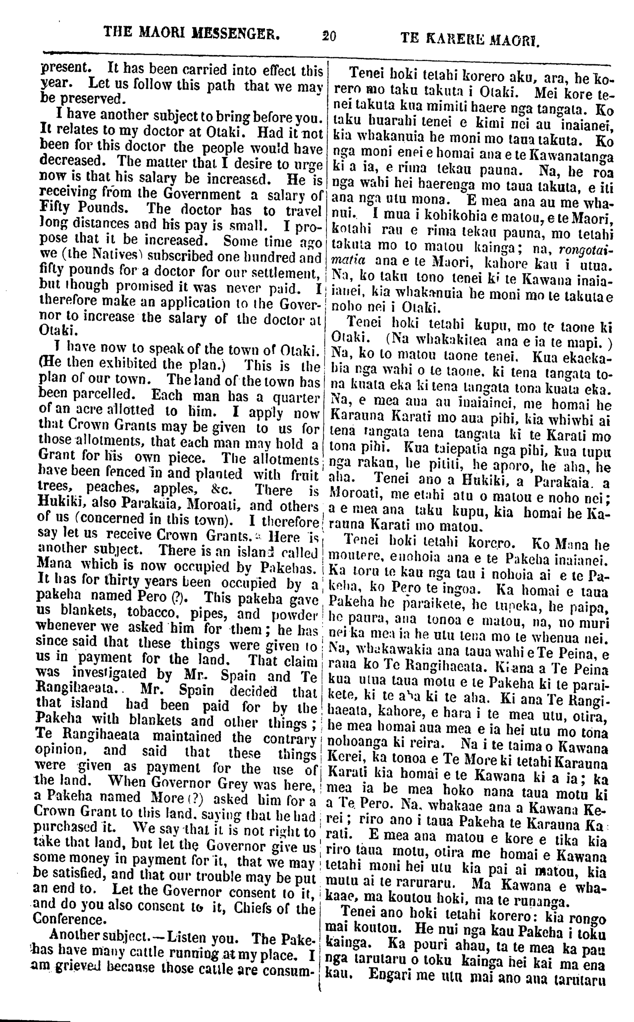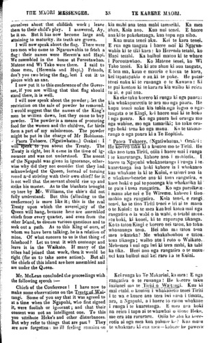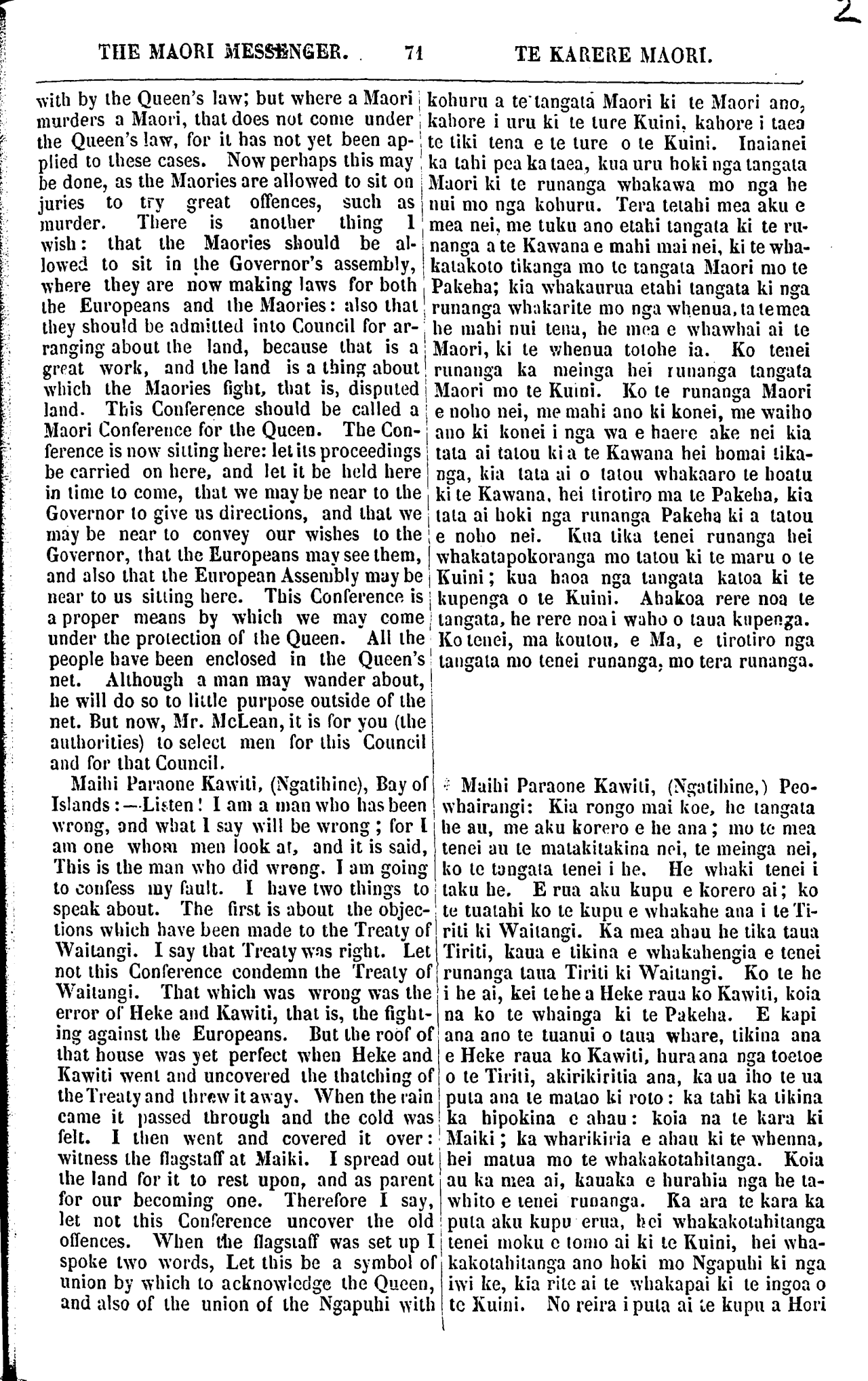 THE MAORI MESSENGER. TE KARERE MAORI. Matene Te Whiwhi, (Ngatitoa,) Otaki: We have nothing to say, nor anything different to bring forward. Although the men are dead who agreed to the treaty of Waitangi, the words of the Maori are kept. Only now, after the expiration of twenty years, has the question of union been mooted, and we are offered all the advantages thereof. Now, for the first time, the question has been opened. This pleases me. I am glad because of this Conference. Let our work be carried on every year, Let the Governor, on each succeeding year, invite us to a Conference. Do not let us look at the faults of the Governor. All I desire is that (the races) be cemented. There has been a free expression of opinion. I will not say that I will decide the question (of an annual Conference); rather let each chief give utterance to his thoughts. Winiata Pekamu Tohi Te Ururangi, (Nga- tiwhakaue.) Maketu: Chiefs of this Con- ference, what Mr. McLean has said is cor- rect, namely, that each chief should return to his home, and there consider the subdi- vision of the land. There is only one other subject now for us to speak on. and that is the union (of races). As to the land, say nothing more on that subject. The land is the source of all the troubles of this Island. When we return to our homes let each man define (the boundaries of) his land, and we shall thus avoid difficulties (death). I will define my own land. Let us have one Lord. and then our opinions will agree. Let us have but one Queen, and one Governor. You have said, Return to your homes and consider this matter (the subdivision of land); that is correct. The Governor. and the Governor alone shall be my head (or chief). Let me (the Maori) enter the Pakeha Council, that my word may be right, because the opinions of the Pakeha Council are conflicting. Secure an entrance for me that we may all consult together. Tukihaumene, (Ngatiwhakaue,) Rotorua: I shall not be desultory. (I have only one subject.) Only the Queen—only the Go- vernor. I have uttered my words, and they have been suppressed. What have we to do with the troubles about land? Let these matters be carefully considered, lest other words be introduced. Paora Tuhaere, (Ngatiwhatua, Orakei): This is my speech to you—a word respecting the Treaty of Waitangi, the covenant now spoken of. The union of the two races com- menced with it. By it the sovereignty of these Islands was ceded to the Queen. The regu- lations respecting the sale of land com- Matene Te Whiwhi, (Ngatitoa,) Otaki: Kahore he kupu ma matou kahore he rere- nga ketanga; ahakoa kua male ki te po nga tangata i whakaaetia ai te Tiriti o Waitangi e tiakina ana nga kupu o te Maori. Ka rua tekau tau ka tahi ka tuwhera te kupu kia kotahi tatou ka meinga ko nga mea katoa kia riro mai ki a tatou. Heoi ano ko te tuwheratanga tuatahi tenei; ko taku tenei e pai ai. E hari ana ahau mo tenei mea mo te runanga. Ko la tatou mahi me mahi to- nu i roto i nga tau. I ia tau ka karanga te Kawana ki a tatou kia haere mai ki te runa- nga. Kaua tatou e titiro ki nga he o te Ka- wana; heoi ano ki au ko te whakau anake. Kua puaki nui nga kupu; ekore au e mea maku e whakaoti; waiho ma ia rangatira ma ia rangatira tona whakaaro e whakapuaki. Winiata Pekamu Tohi Te Ururangi, (Nga- tiwhakaue,) Maketu: E nga rangatira o tenei runanga, e tika ana te kupu a te Maka- rini, me hoki ia tangata ia tangata ki tona kainga ki te mahi i tona pihi ano. Ko tahi tonu te kupu mo tatou inaianei ko te wha- kakotahi anake. Ko te whenua, kati te ku- pu ki te whenua, ko te mate nui tena o tenei motu; kia tae ki te kainga ma ia tangata ma ia tangata ano e hanga tona whenua, penei ekore e pa te mate. Maku ano e hunga to- ku whenua. Kia kotahi te Ariki, kia kotahi ai whakaaro; kotahi te Kuini, kotahi te Ka- wana. Ka ki mai na koe me hoki ki te kai- nga mahi ai, e tika ana. Engari ko te tu- muaki moku ko te Kawana, ko te Kawana anake. Kia tapoto ahau ki roto ki te runa- nga Pakeha kia tika taku mahi; ko te wha- kaaro o te runanga Pakeha e rere ke ana. Kia whakapumautia e koe taku tapokoranga kia kotahi ano korerotanga. Tukihaumene, (Ngatiwhakaue,) Maketu: E kore au e tipokapoka; ko te Kuini anake, ko te Kawana anake. Kua puta taku kupu, pehia ana taku kupu. Hei aha ma tatou te kino o te whenua? Kia pai te whakaaro kei rere mai te kupu ke. Paora Tuhaere, (Ngatiwhatua,) Orakei: Tenei taku ki a koutou, he kupu mo te Tiriti ki Waitangi, mo te kawenata e korerotia nei. I timataia te whakakotahitanga ki tena, me te rironga ano hoki o te mana o tenei motu ki raro ki te maru o te Kuini, me nga tikanga ano hoki mo te whenua i timata mai