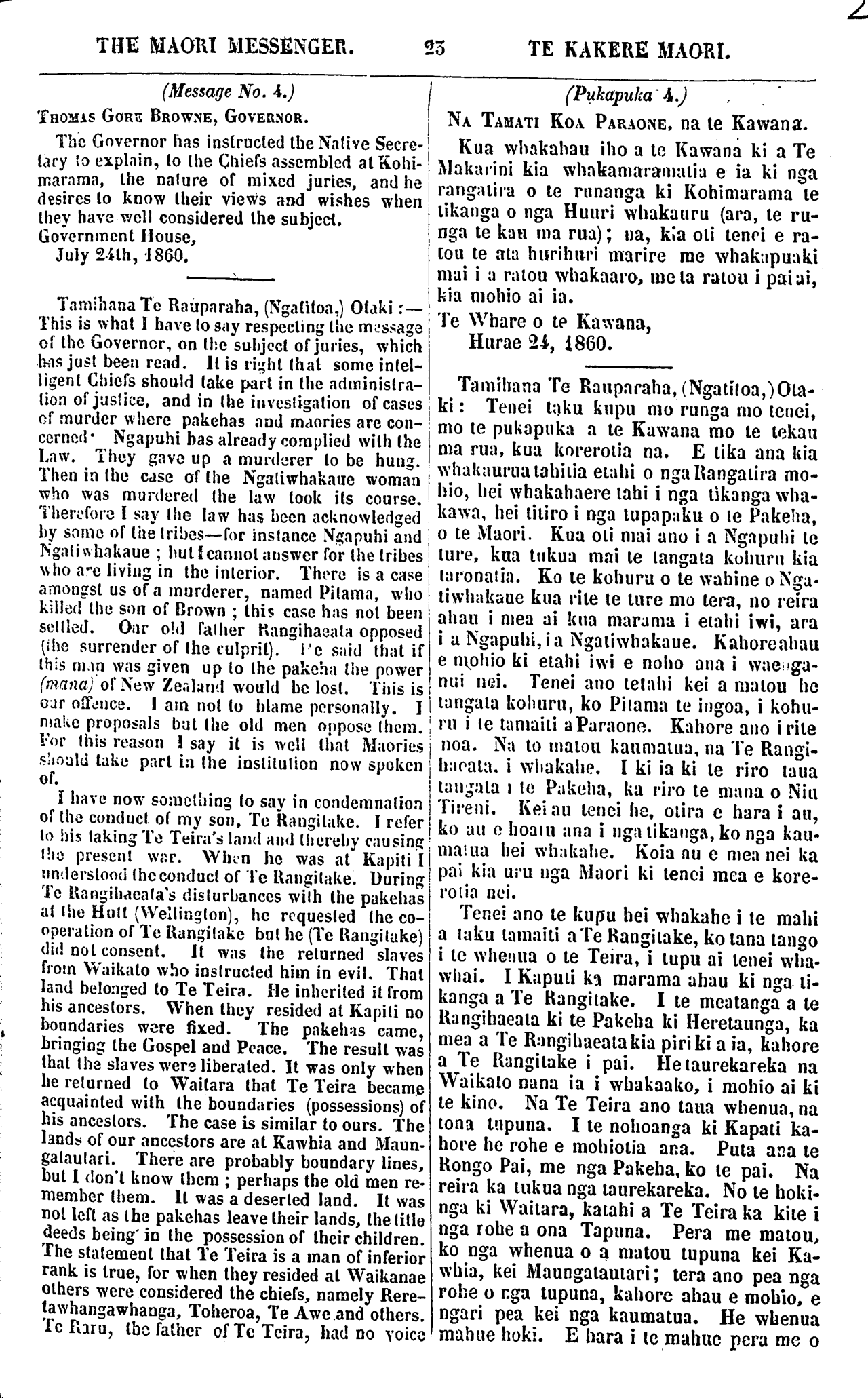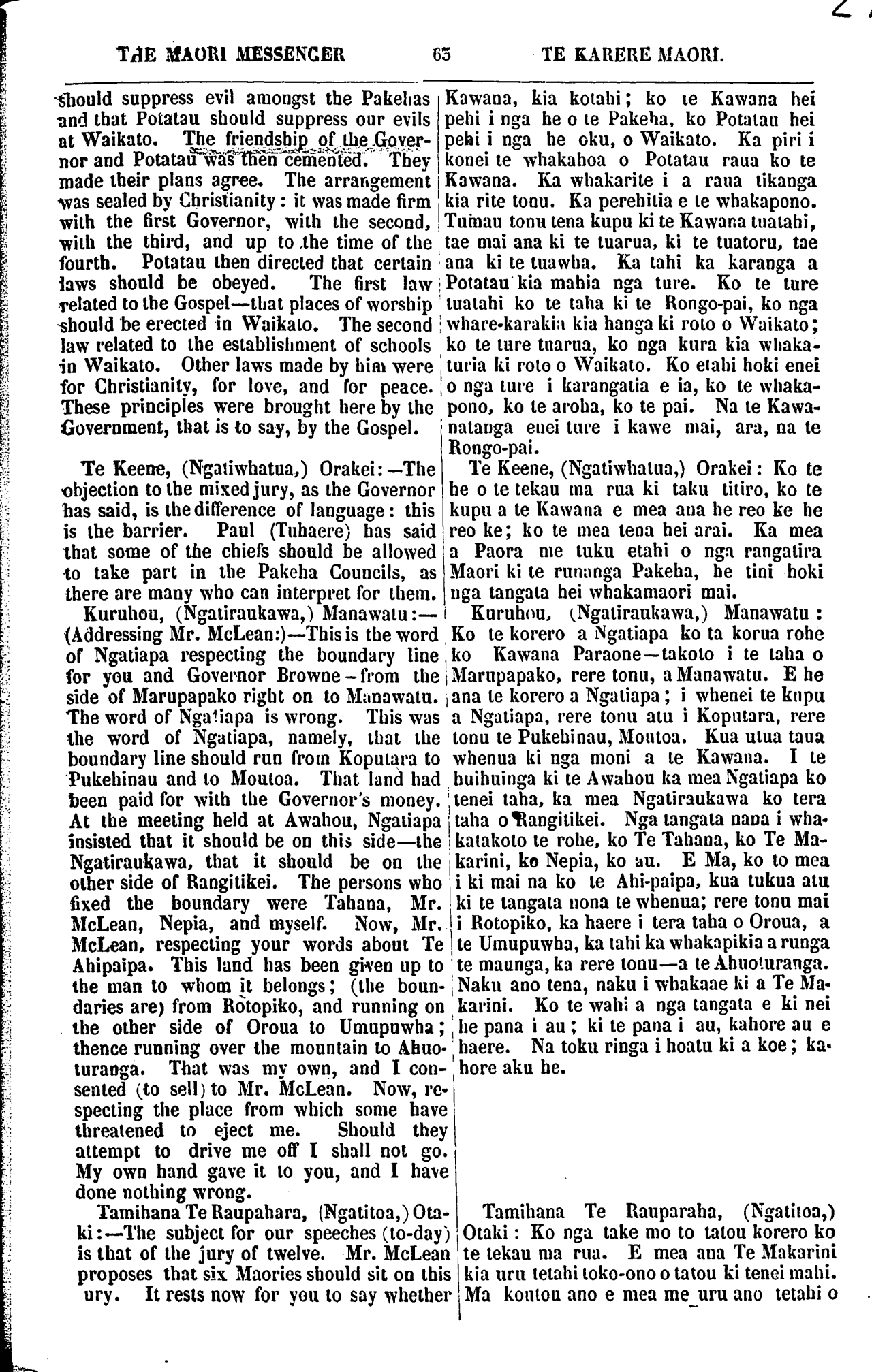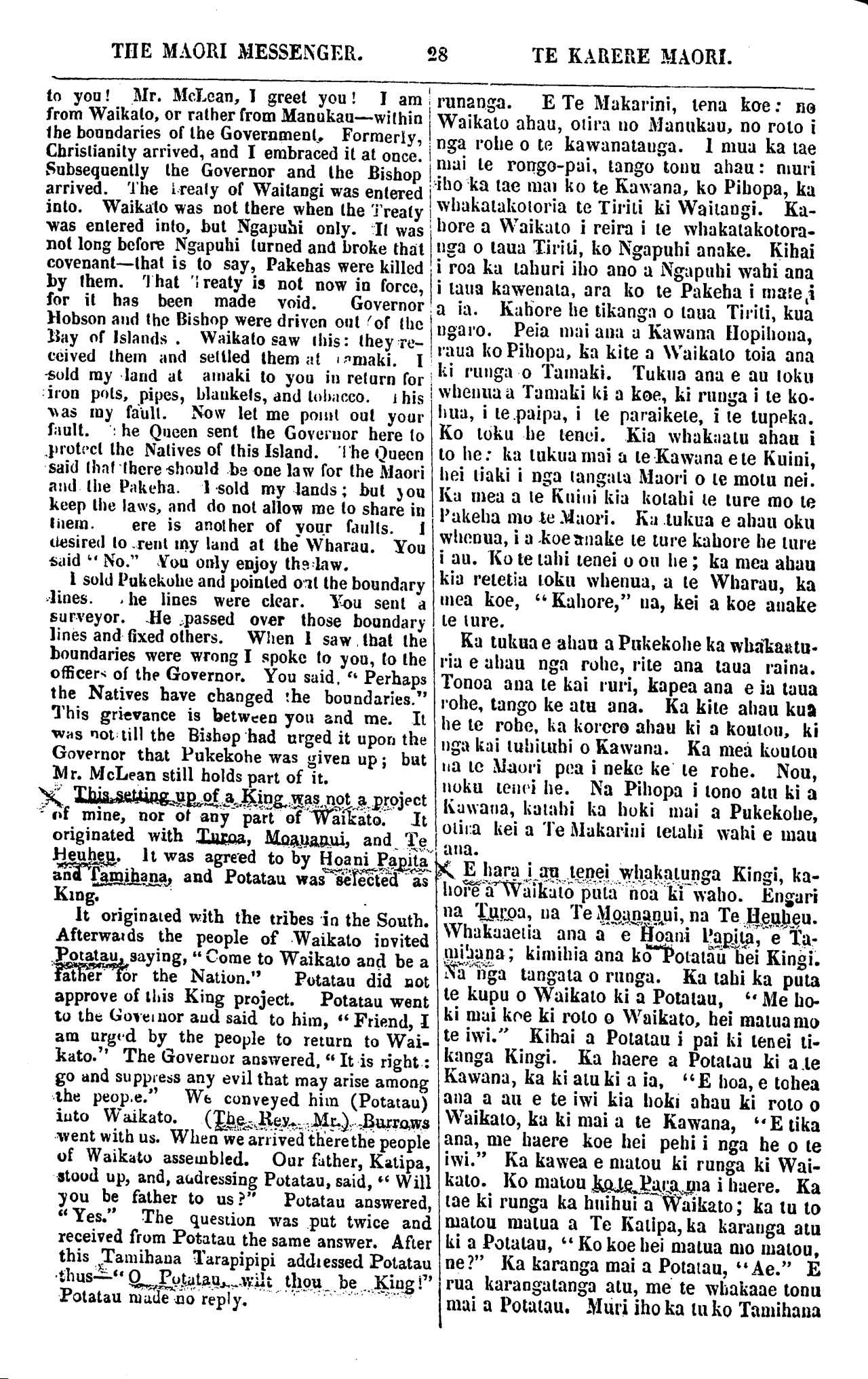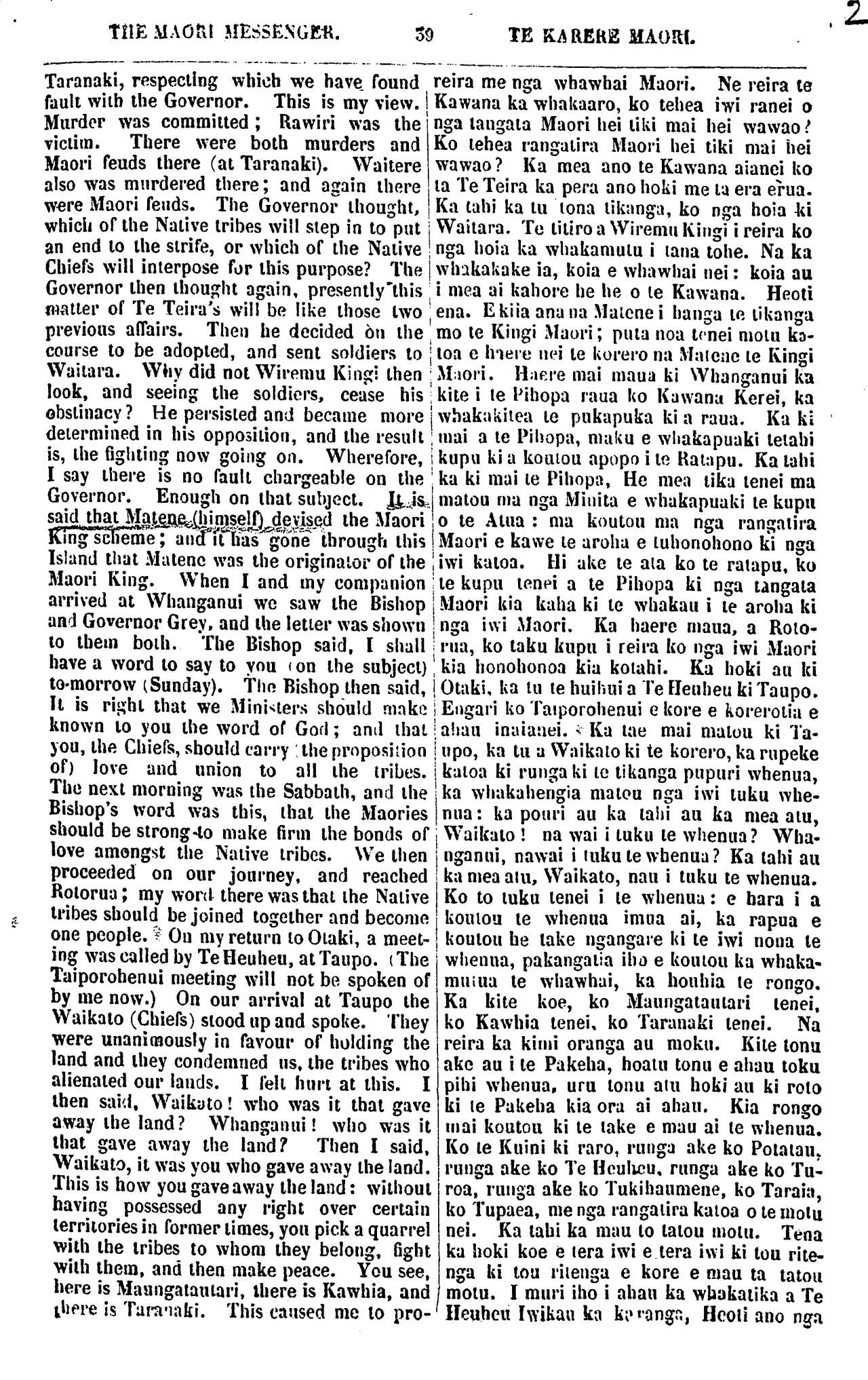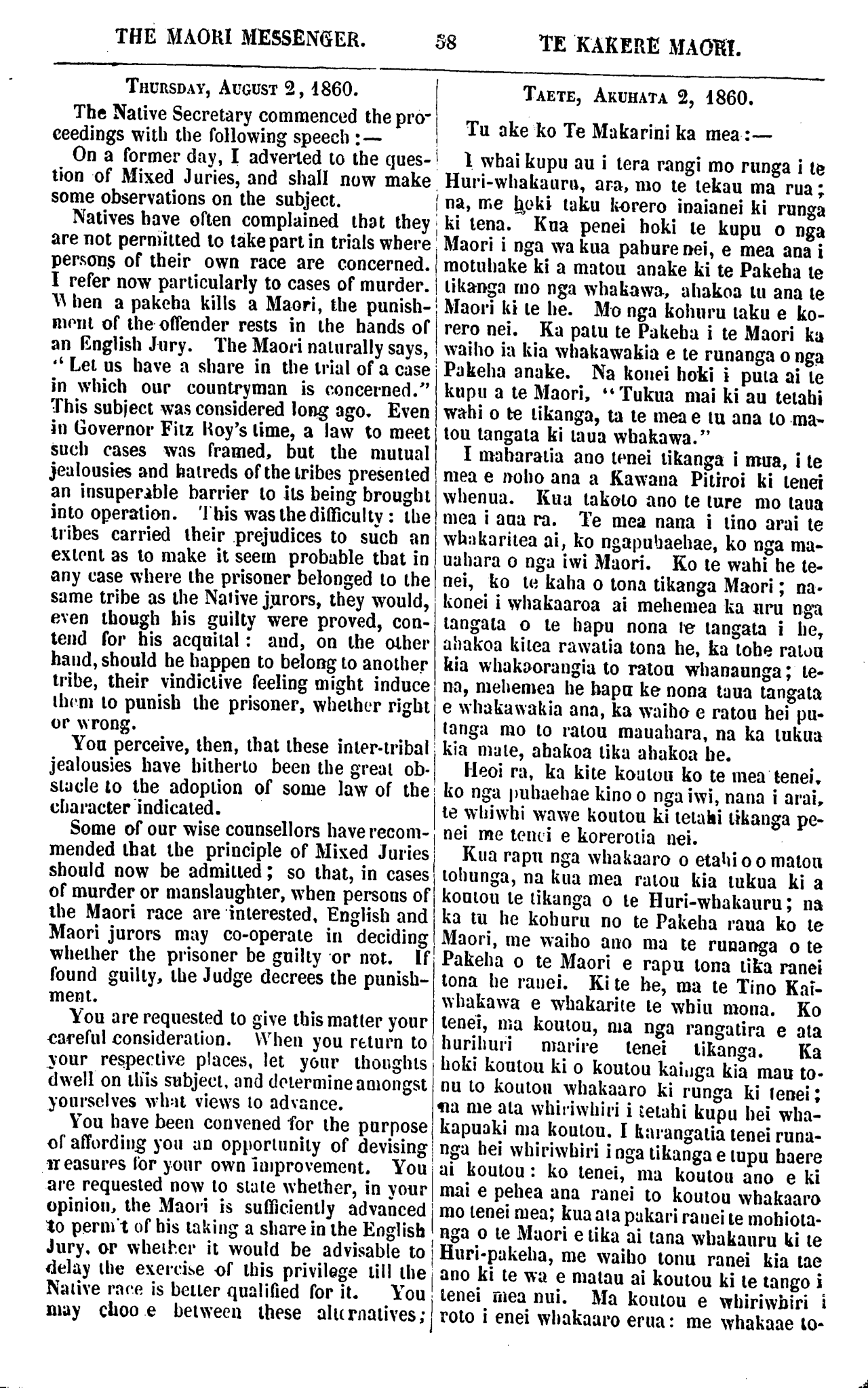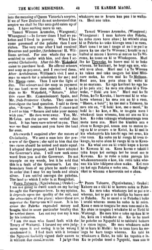 THE MAORI MESSENGER. TE KARERE MAORI. Matene Te Whiwhi, (Ngatitoa,) Otaki: We have nothing to say, nor anything different to bring forward. Although the men are dead who agreed to the treaty of Waitangi, the words of the Maori are kept. Only now, after the expiration of twenty years, has the question of union been mooted, and we are offered all the advantages thereof. Now, for the first time, the question has been opened. This pleases me. I am glad because of this Conference. Let our work be carried on every year, Let the Governor, on each succeeding year, invite us to a Conference. Do not let us look at the faults of the Governor. All I desire is that (the races) be cemented. There has been a free expression of opinion. I will not say that I will decide the question (of an annual Conference); rather let each chief give utterance to his thoughts. Winiata Pekamu Tohi Te Ururangi, (Nga- tiwhakaue.) Maketu: Chiefs of this Con- ference, what Mr. McLean has said is cor- rect, namely, that each chief should return to his home, and there consider the subdi- vision of the land. There is only one other subject now for us to speak on. and that is the union (of races). As to the land, say nothing more on that subject. The land is the source of all the troubles of this Island. When we return to our homes let each man define (the boundaries of) his land, and we shall thus avoid difficulties (death). I will define my own land. Let us have one Lord. and then our opinions will agree. Let us have but one Queen, and one Governor. You have said, Return to your homes and consider this matter (the subdivision of land); that is correct. The Governor. and the Governor alone shall be my head (or chief). Let me (the Maori) enter the Pakeha Council, that my word may be right, because the opinions of the Pakeha Council are conflicting. Secure an entrance for me that we may all consult together. Tukihaumene, (Ngatiwhakaue,) Rotorua: I shall not be desultory. (I have only one subject.) Only the Queen—only the Go- vernor. I have uttered my words, and they have been suppressed. What have we to do with the troubles about land? Let these matters be carefully considered, lest other words be introduced. Paora Tuhaere, (Ngatiwhatua, Orakei): This is my speech to you—a word respecting the Treaty of Waitangi, the covenant now spoken of. The union of the two races com- menced with it. By it the sovereignty of these Islands was ceded to the Queen. The regu- lations respecting the sale of land com- Matene Te Whiwhi, (Ngatitoa,) Otaki: Kahore he kupu ma matou kahore he rere- nga ketanga; ahakoa kua male ki te po nga tangata i whakaaetia ai te Tiriti o Waitangi e tiakina ana nga kupu o te Maori. Ka rua tekau tau ka tahi ka tuwhera te kupu kia kotahi tatou ka meinga ko nga mea katoa kia riro mai ki a tatou. Heoi ano ko te tuwheratanga tuatahi tenei; ko taku tenei e pai ai. E hari ana ahau mo tenei mea mo te runanga. Ko la tatou mahi me mahi to- nu i roto i nga tau. I ia tau ka karanga te Kawana ki a tatou kia haere mai ki te runa- nga. Kaua tatou e titiro ki nga he o te Ka- wana; heoi ano ki au ko te whakau anake. Kua puaki nui nga kupu; ekore au e mea maku e whakaoti; waiho ma ia rangatira ma ia rangatira tona whakaaro e whakapuaki. Winiata Pekamu Tohi Te Ururangi, (Nga- tiwhakaue,) Maketu: E nga rangatira o tenei runanga, e tika ana te kupu a te Maka- rini, me hoki ia tangata ia tangata ki tona kainga ki te mahi i tona pihi ano. Ko tahi tonu te kupu mo tatou inaianei ko te wha- kakotahi anake. Ko te whenua, kati te ku- pu ki te whenua, ko te mate nui tena o tenei motu; kia tae ki te kainga ma ia tangata ma ia tangata ano e hanga tona whenua, penei ekore e pa te mate. Maku ano e hunga to- ku whenua. Kia kotahi te Ariki, kia kotahi ai whakaaro; kotahi te Kuini, kotahi te Ka- wana. Ka ki mai na koe me hoki ki te kai- nga mahi ai, e tika ana. Engari ko te tu- muaki moku ko te Kawana, ko te Kawana anake. Kia tapoto ahau ki roto ki te runa- nga Pakeha kia tika taku mahi; ko te wha- kaaro o te runanga Pakeha e rere ke ana. Kia whakapumautia e koe taku tapokoranga kia kotahi ano korerotanga. Tukihaumene, (Ngatiwhakaue,) Maketu: E kore au e tipokapoka; ko te Kuini anake, ko te Kawana anake. Kua puta taku kupu, pehia ana taku kupu. Hei aha ma tatou te kino o te whenua? Kia pai te whakaaro kei rere mai te kupu ke. Paora Tuhaere, (Ngatiwhatua,) Orakei: Tenei taku ki a koutou, he kupu mo te Tiriti ki Waitangi, mo te kawenata e korerotia nei. I timataia te whakakotahitanga ki tena, me te rironga ano hoki o te mana o tenei motu ki raro ki te maru o te Kuini, me nga tikanga ano hoki mo te whenua i timata mai
