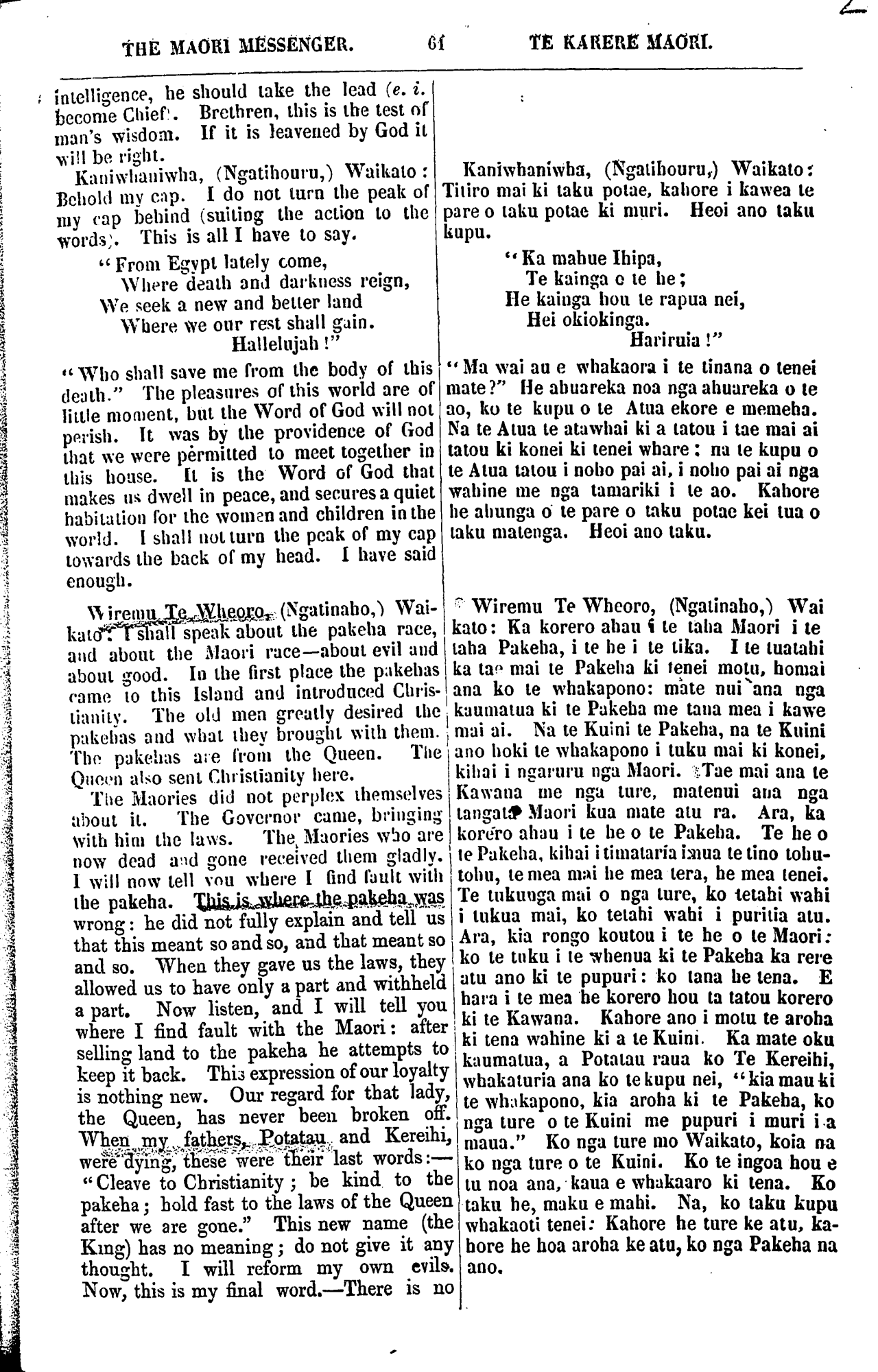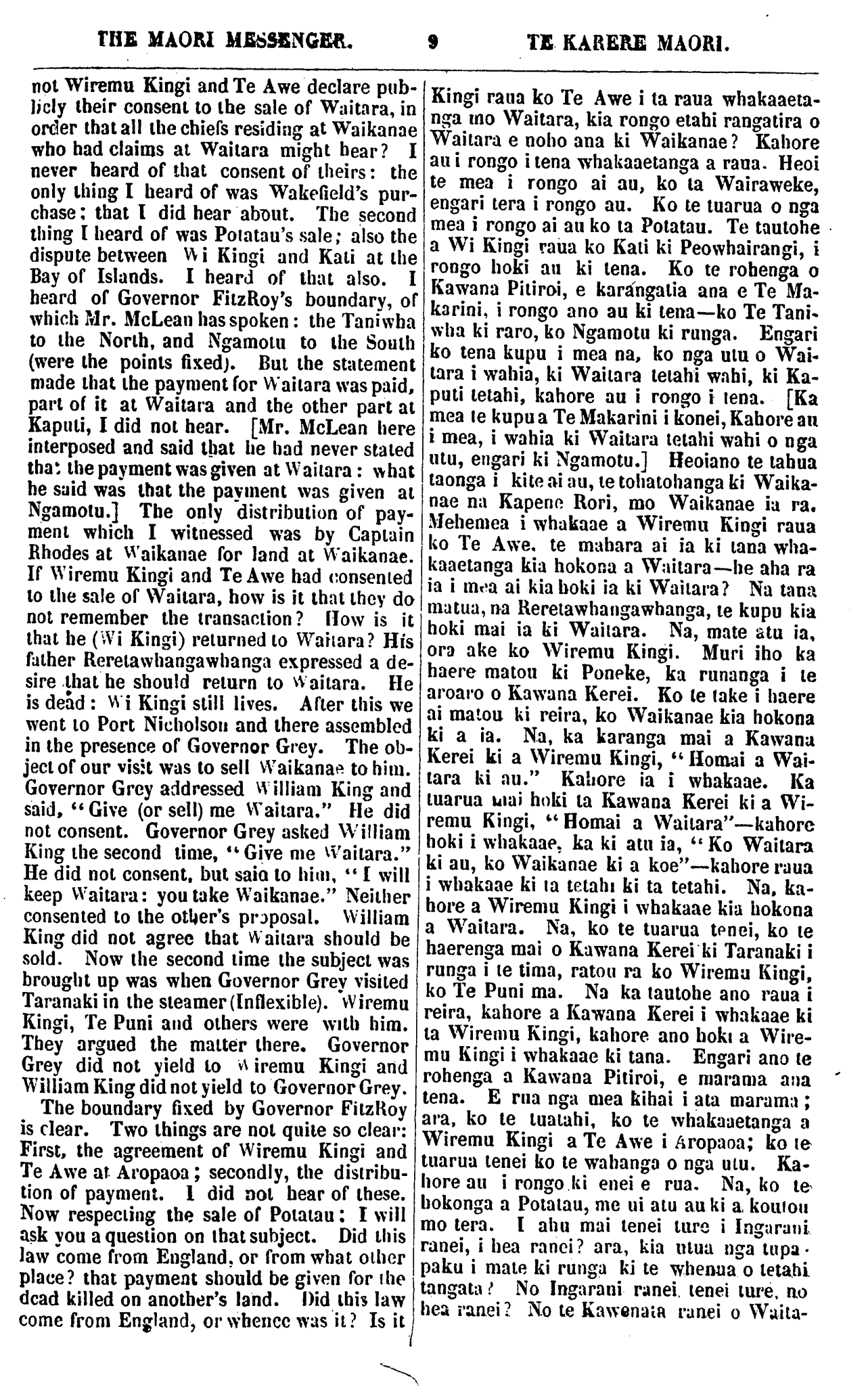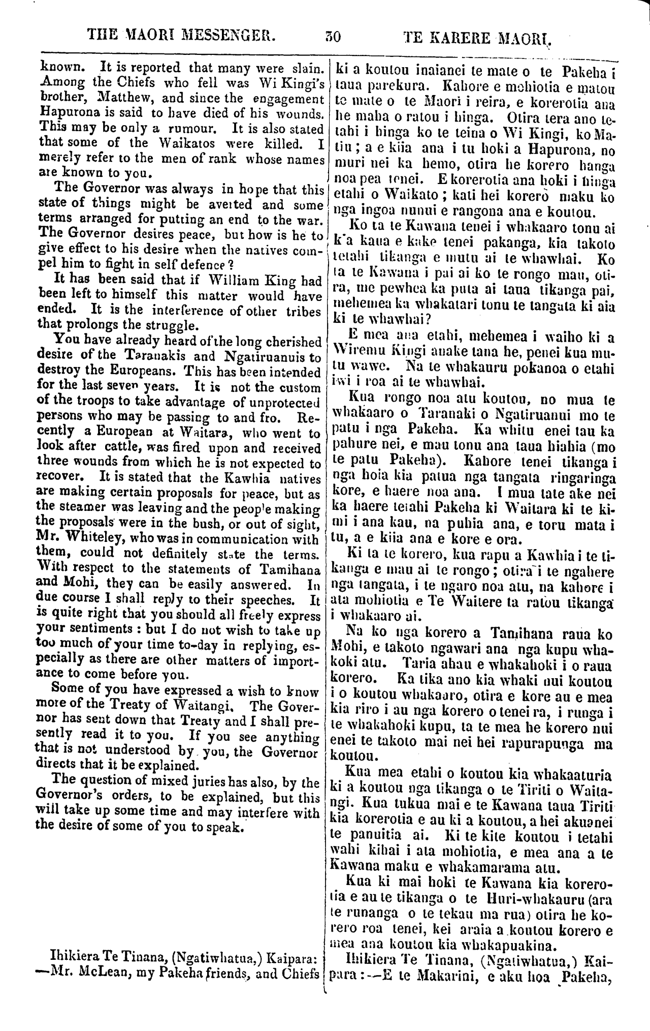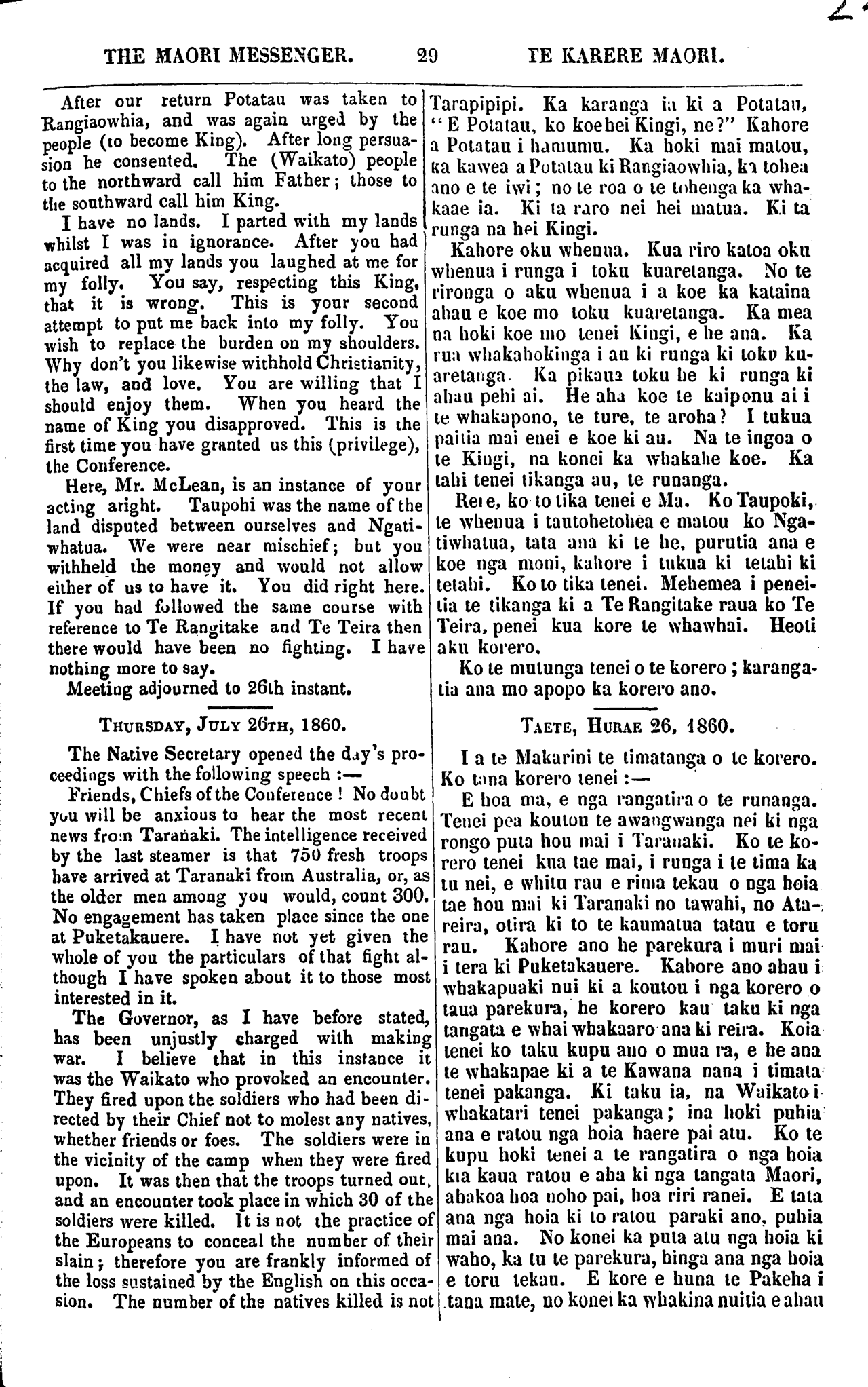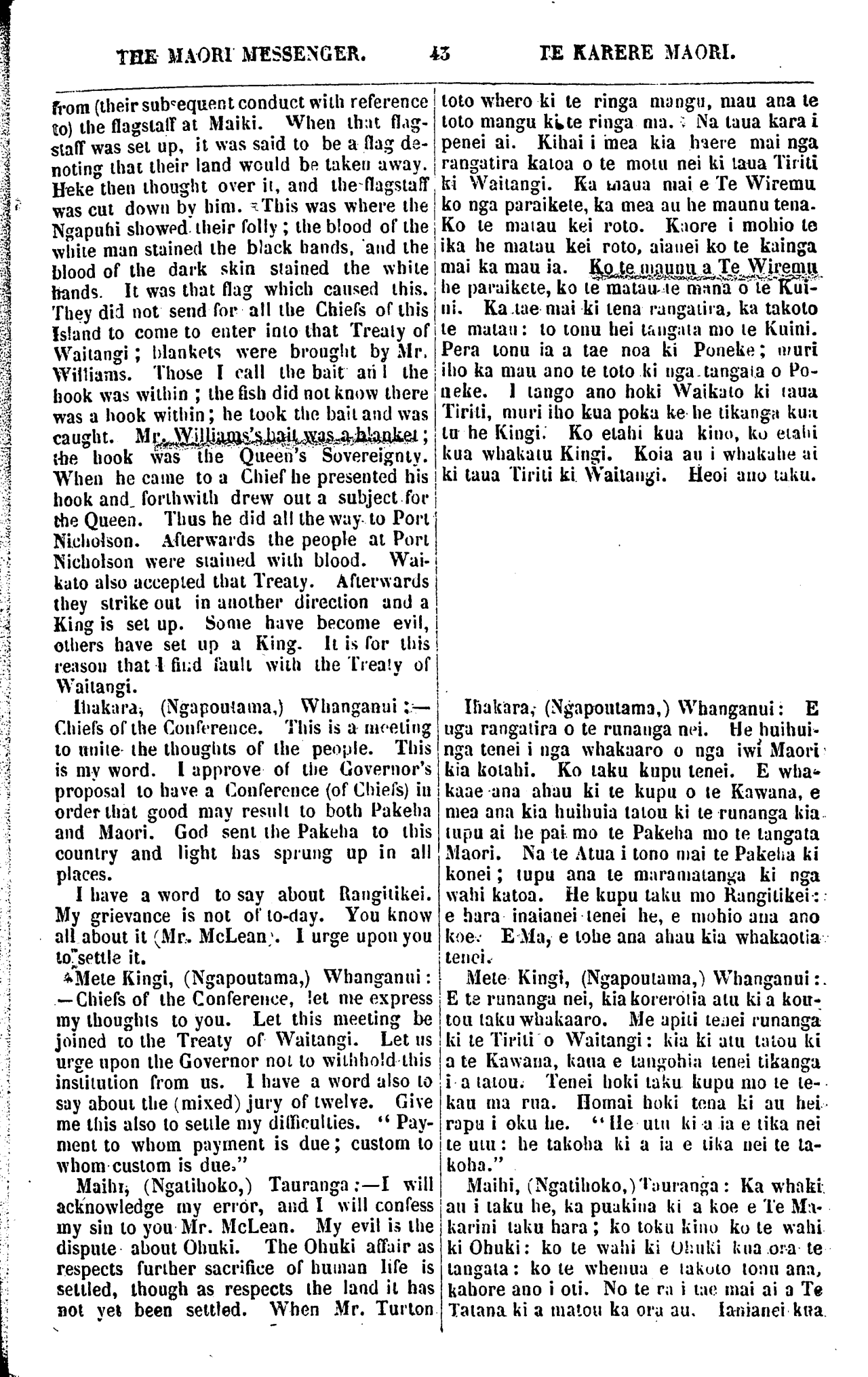 THE MAORI MESSENGER. TE KARERE MAORI. Matene Te Whiwhi, (Ngatitoa,) Otaki: We have nothing to say, nor anything different to bring forward. Although the men are dead who agreed to the treaty of Waitangi, the words of the Maori are kept. Only now, after the expiration of twenty years, has the question of union been mooted, and we are offered all the advantages thereof. Now, for the first time, the question has been opened. This pleases me. I am glad because of this Conference. Let our work be carried on every year, Let the Governor, on each succeeding year, invite us to a Conference. Do not let us look at the faults of the Governor. All I desire is that (the races) be cemented. There has been a free expression of opinion. I will not say that I will decide the question (of an annual Conference); rather let each chief give utterance to his thoughts. Winiata Pekamu Tohi Te Ururangi, (Nga- tiwhakaue.) Maketu: Chiefs of this Con- ference, what Mr. McLean has said is cor- rect, namely, that each chief should return to his home, and there consider the subdi- vision of the land. There is only one other subject now for us to speak on. and that is the union (of races). As to the land, say nothing more on that subject. The land is the source of all the troubles of this Island. When we return to our homes let each man define (the boundaries of) his land, and we shall thus avoid difficulties (death). I will define my own land. Let us have one Lord. and then our opinions will agree. Let us have but one Queen, and one Governor. You have said, Return to your homes and consider this matter (the subdivision of land); that is correct. The Governor. and the Governor alone shall be my head (or chief). Let me (the Maori) enter the Pakeha Council, that my word may be right, because the opinions of the Pakeha Council are conflicting. Secure an entrance for me that we may all consult together. Tukihaumene, (Ngatiwhakaue,) Rotorua: I shall not be desultory. (I have only one subject.) Only the Queen—only the Go- vernor. I have uttered my words, and they have been suppressed. What have we to do with the troubles about land? Let these matters be carefully considered, lest other words be introduced. Paora Tuhaere, (Ngatiwhatua, Orakei): This is my speech to you—a word respecting the Treaty of Waitangi, the covenant now spoken of. The union of the two races com- menced with it. By it the sovereignty of these Islands was ceded to the Queen. The regu- lations respecting the sale of land com- Matene Te Whiwhi, (Ngatitoa,) Otaki: Kahore he kupu ma matou kahore he rere- nga ketanga; ahakoa kua male ki te po nga tangata i whakaaetia ai te Tiriti o Waitangi e tiakina ana nga kupu o te Maori. Ka rua tekau tau ka tahi ka tuwhera te kupu kia kotahi tatou ka meinga ko nga mea katoa kia riro mai ki a tatou. Heoi ano ko te tuwheratanga tuatahi tenei; ko taku tenei e pai ai. E hari ana ahau mo tenei mea mo te runanga. Ko la tatou mahi me mahi to- nu i roto i nga tau. I ia tau ka karanga te Kawana ki a tatou kia haere mai ki te runa- nga. Kaua tatou e titiro ki nga he o te Ka- wana; heoi ano ki au ko te whakau anake. Kua puaki nui nga kupu; ekore au e mea maku e whakaoti; waiho ma ia rangatira ma ia rangatira tona whakaaro e whakapuaki. Winiata Pekamu Tohi Te Ururangi, (Nga- tiwhakaue,) Maketu: E nga rangatira o tenei runanga, e tika ana te kupu a te Maka- rini, me hoki ia tangata ia tangata ki tona kainga ki te mahi i tona pihi ano. Ko tahi tonu te kupu mo tatou inaianei ko te wha- kakotahi anake. Ko te whenua, kati te ku- pu ki te whenua, ko te mate nui tena o tenei motu; kia tae ki te kainga ma ia tangata ma ia tangata ano e hanga tona whenua, penei ekore e pa te mate. Maku ano e hunga to- ku whenua. Kia kotahi te Ariki, kia kotahi ai whakaaro; kotahi te Kuini, kotahi te Ka- wana. Ka ki mai na koe me hoki ki te kai- nga mahi ai, e tika ana. Engari ko te tu- muaki moku ko te Kawana, ko te Kawana anake. Kia tapoto ahau ki roto ki te runa- nga Pakeha kia tika taku mahi; ko te wha- kaaro o te runanga Pakeha e rere ke ana. Kia whakapumautia e koe taku tapokoranga kia kotahi ano korerotanga. Tukihaumene, (Ngatiwhakaue,) Maketu: E kore au e tipokapoka; ko te Kuini anake, ko te Kawana anake. Kua puta taku kupu, pehia ana taku kupu. Hei aha ma tatou te kino o te whenua? Kia pai te whakaaro kei rere mai te kupu ke. Paora Tuhaere, (Ngatiwhatua,) Orakei: Tenei taku ki a koutou, he kupu mo te Tiriti ki Waitangi, mo te kawenata e korerotia nei. I timataia te whakakotahitanga ki tena, me te rironga ano hoki o te mana o tenei motu ki raro ki te maru o te Kuini, me nga tikanga ano hoki mo te whenua i timata mai
