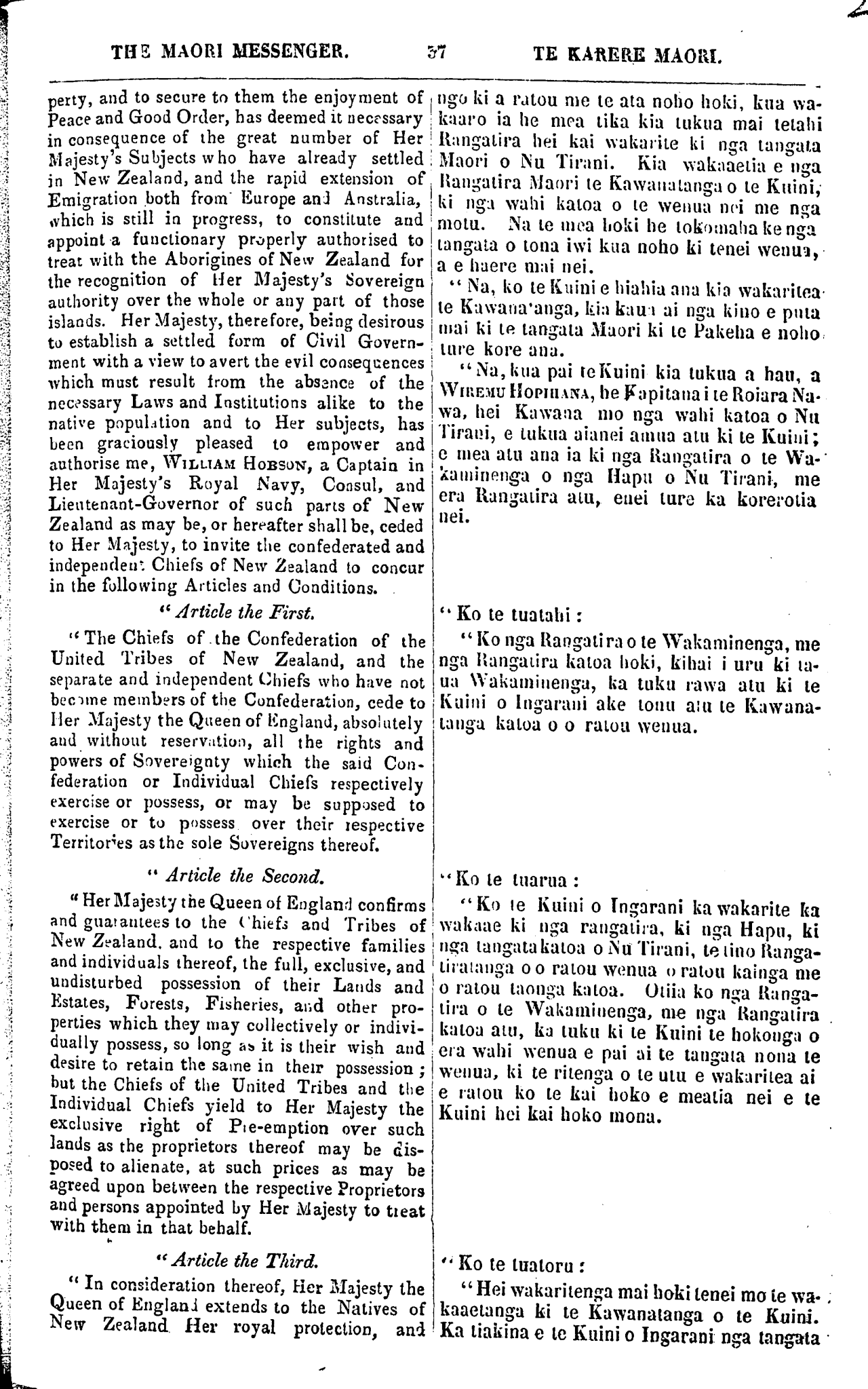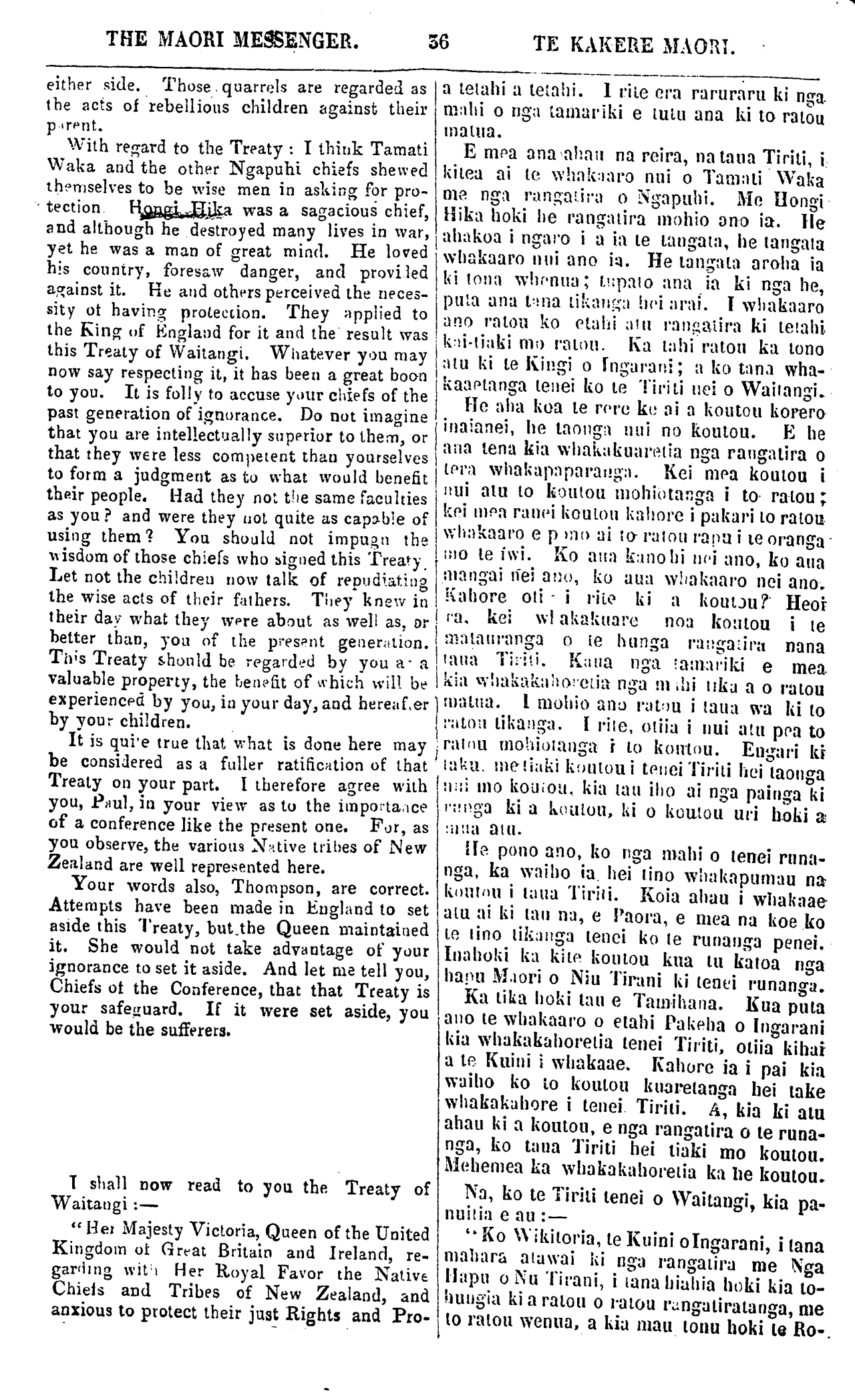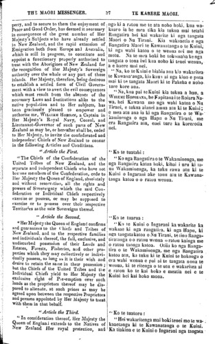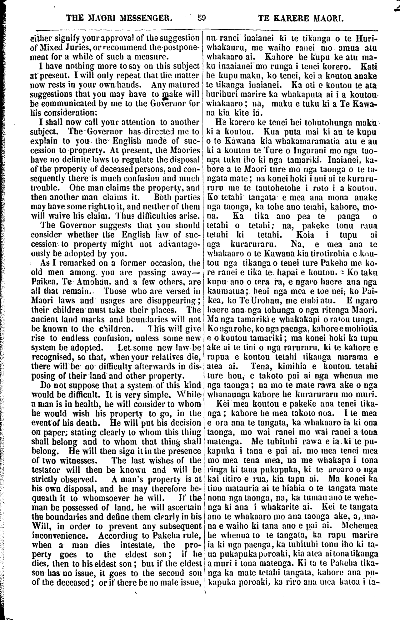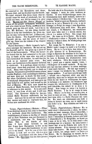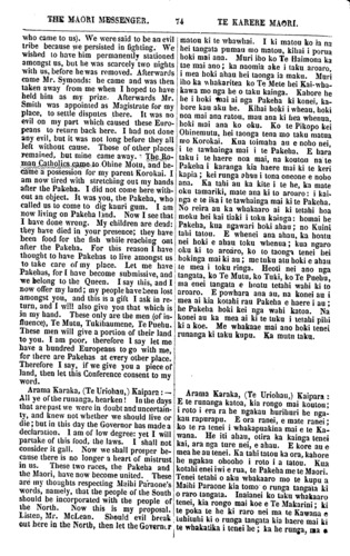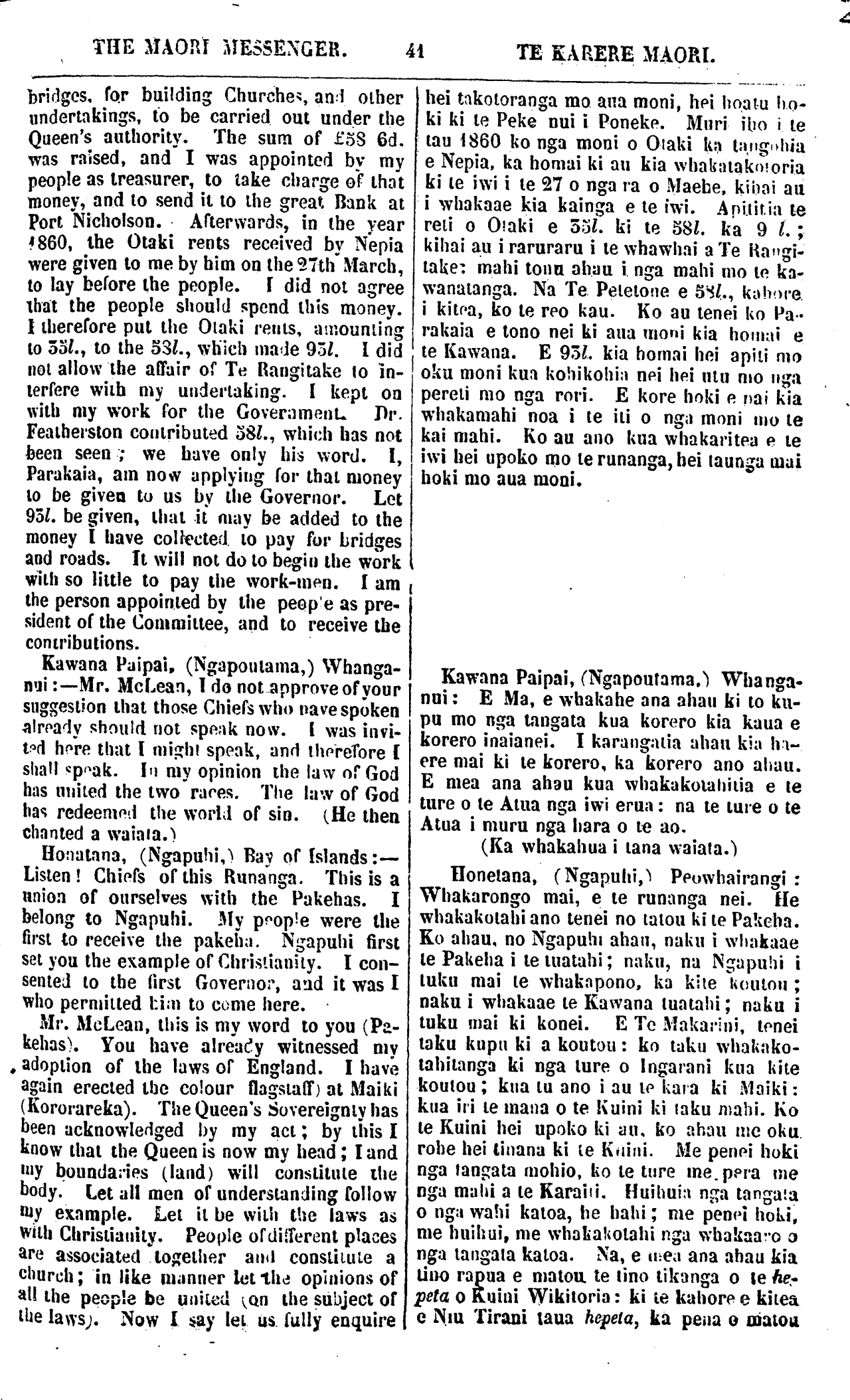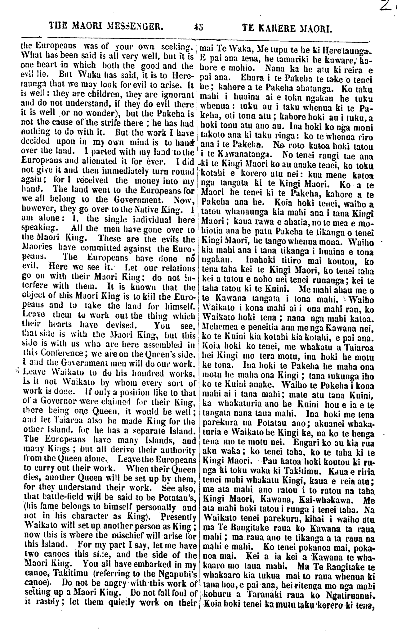 THE MAORI MESSENGER. TE KARERE MAORI. Matene Te Whiwhi, (Ngatitoa,) Otaki: We have nothing to say, nor anything different to bring forward. Although the men are dead who agreed to the treaty of Waitangi, the words of the Maori are kept. Only now, after the expiration of twenty years, has the question of union been mooted, and we are offered all the advantages thereof. Now, for the first time, the question has been opened. This pleases me. I am glad because of this Conference. Let our work be carried on every year, Let the Governor, on each succeeding year, invite us to a Conference. Do not let us look at the faults of the Governor. All I desire is that (the races) be cemented. There has been a free expression of opinion. I will not say that I will decide the question (of an annual Conference); rather let each chief give utterance to his thoughts. Winiata Pekamu Tohi Te Ururangi, (Nga- tiwhakaue.) Maketu: Chiefs of this Con- ference, what Mr. McLean has said is cor- rect, namely, that each chief should return to his home, and there consider the subdi- vision of the land. There is only one other subject now for us to speak on. and that is the union (of races). As to the land, say nothing more on that subject. The land is the source of all the troubles of this Island. When we return to our homes let each man define (the boundaries of) his land, and we shall thus avoid difficulties (death). I will define my own land. Let us have one Lord. and then our opinions will agree. Let us have but one Queen, and one Governor. You have said, Return to your homes and consider this matter (the subdivision of land); that is correct. The Governor. and the Governor alone shall be my head (or chief). Let me (the Maori) enter the Pakeha Council, that my word may be right, because the opinions of the Pakeha Council are conflicting. Secure an entrance for me that we may all consult together. Tukihaumene, (Ngatiwhakaue,) Rotorua: I shall not be desultory. (I have only one subject.) Only the Queen—only the Go- vernor. I have uttered my words, and they have been suppressed. What have we to do with the troubles about land? Let these matters be carefully considered, lest other words be introduced. Paora Tuhaere, (Ngatiwhatua, Orakei): This is my speech to you—a word respecting the Treaty of Waitangi, the covenant now spoken of. The union of the two races com- menced with it. By it the sovereignty of these Islands was ceded to the Queen. The regu- lations respecting the sale of land com- Matene Te Whiwhi, (Ngatitoa,) Otaki: Kahore he kupu ma matou kahore he rere- nga ketanga; ahakoa kua male ki te po nga tangata i whakaaetia ai te Tiriti o Waitangi e tiakina ana nga kupu o te Maori. Ka rua tekau tau ka tahi ka tuwhera te kupu kia kotahi tatou ka meinga ko nga mea katoa kia riro mai ki a tatou. Heoi ano ko te tuwheratanga tuatahi tenei; ko taku tenei e pai ai. E hari ana ahau mo tenei mea mo te runanga. Ko la tatou mahi me mahi to- nu i roto i nga tau. I ia tau ka karanga te Kawana ki a tatou kia haere mai ki te runa- nga. Kaua tatou e titiro ki nga he o te Ka- wana; heoi ano ki au ko te whakau anake. Kua puaki nui nga kupu; ekore au e mea maku e whakaoti; waiho ma ia rangatira ma ia rangatira tona whakaaro e whakapuaki. Winiata Pekamu Tohi Te Ururangi, (Nga- tiwhakaue,) Maketu: E nga rangatira o tenei runanga, e tika ana te kupu a te Maka- rini, me hoki ia tangata ia tangata ki tona kainga ki te mahi i tona pihi ano. Ko tahi tonu te kupu mo tatou inaianei ko te wha- kakotahi anake. Ko te whenua, kati te ku- pu ki te whenua, ko te mate nui tena o tenei motu; kia tae ki te kainga ma ia tangata ma ia tangata ano e hanga tona whenua, penei ekore e pa te mate. Maku ano e hunga to- ku whenua. Kia kotahi te Ariki, kia kotahi ai whakaaro; kotahi te Kuini, kotahi te Ka- wana. Ka ki mai na koe me hoki ki te kai- nga mahi ai, e tika ana. Engari ko te tu- muaki moku ko te Kawana, ko te Kawana anake. Kia tapoto ahau ki roto ki te runa- nga Pakeha kia tika taku mahi; ko te wha- kaaro o te runanga Pakeha e rere ke ana. Kia whakapumautia e koe taku tapokoranga kia kotahi ano korerotanga. Tukihaumene, (Ngatiwhakaue,) Maketu: E kore au e tipokapoka; ko te Kuini anake, ko te Kawana anake. Kua puta taku kupu, pehia ana taku kupu. Hei aha ma tatou te kino o te whenua? Kia pai te whakaaro kei rere mai te kupu ke. Paora Tuhaere, (Ngatiwhatua,) Orakei: Tenei taku ki a koutou, he kupu mo te Tiriti ki Waitangi, mo te kawenata e korerotia nei. I timataia te whakakotahitanga ki tena, me te rironga ano hoki o te mana o tenei motu ki raro ki te maru o te Kuini, me nga tikanga ano hoki mo te whenua i timata mai