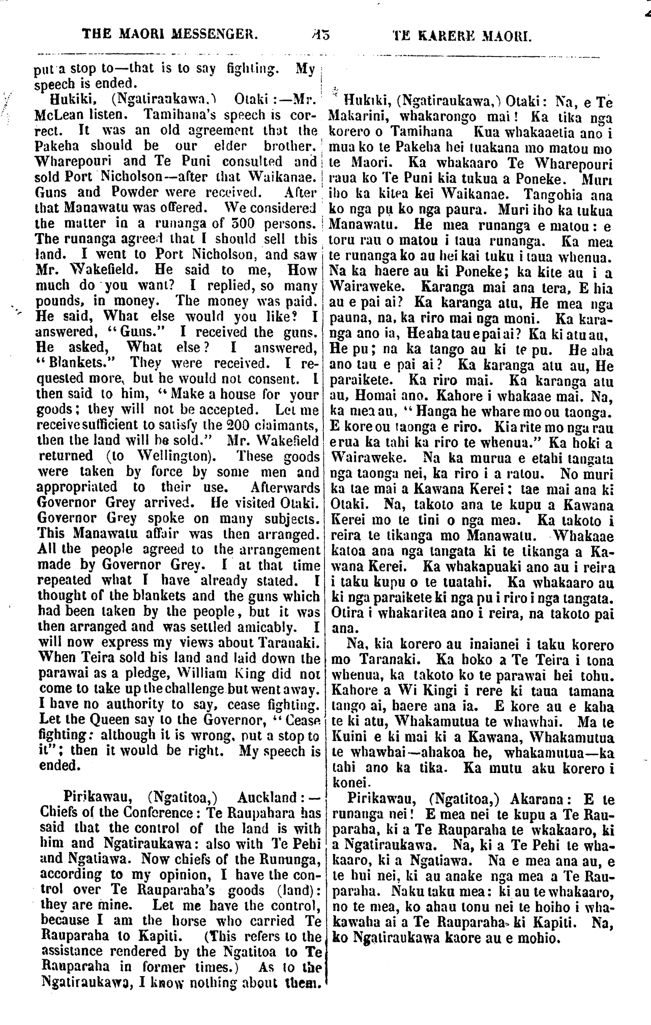 THE MAORI MESSENGER. TE KARERE MAORI. put a stop to—that is to say fighting. My speech is ended. Hukiki, (Ngatiraukawa.) Otaki: Mr. McLean listen. Tamihana's speech is cor- rect. It was an old agreement that the Pakeha should be our elder brother. Wharepouri and Te Puni consulted and sold Port Nicholson after that Waikanae. Guns and Powder were received. After that Manawatu was offered. We considered the matter in a runanga of 300 persons. I The runanga agree.I that I should sell this land. I went to Port Nicholson, and saw Mr. Wakefield. He said to me, How much do you want? I replied, so many pounds, in money. The money was paid. He said, What else would you like? I answered, " Guns." I received the guns. He asked, What else? I answered, " Blankets." They were received. I re- quested more, but he would not consent. I then said to him," Make a house for your goods; they will not be accepted. Let me receive sufficient to satisfy the 200 claimants, then the land will he sold." Mr. Wakefield returned (to Wellington). These goods were taken by force by some men and appropriated to their use. Afterwards Governor Grey arrived. He visited Otaki. Governor Grey spoke on many subjects. This Manawatu affair was then arranged. All the people agreed to the arrangement made by Governor Grey. I at that time repeated what I have already stated. I thought of the blankets and the guns which had been taken by the people, but it was then arranged and was settled amicably. I will now express my views about Taranaki. When Teira sold bis land and laid down the parawai as a pledge, William King did not come to lake up the challenge but went away. I have no authority to say, cease fighting. Let the Queen say to the Governor," Cease. fighting: although it is wrong, put a stop to it"; then it would be right. My speech is ended. Pirikawau, (Ngatitoa,) Auckland: — Chiefs of the Conference: Te Raupahara has said that the control of the land is with him and Ngatiraukawa: also with Te Pehi and Ngatiawa. Now chiefs of the Rununga, according to my opinion, I have the con- trol over Te Rauparaha's goods (land): they are mine. Let me have the control, because I am the horse who carried Te Rauparaha te Kapiti. (This refers to the assistance rendered by the Ngatitoa to Te Rauparaha in former times.) As to the Ngatiraukawa, I know nothing about them. Hukiki, (Ngatiraukawa, ) Otaki: Na, e Te Makarini, whakarongo mai! Ka tika nga korero o Tamihana Kua whakaaetia ano i mua ko te Pakeha hei tuakana mo matou mo te Maori. Ka whakaaro Te Wharepouri raua ko Te Puni kia tukua a Poneke. Muri iho ka kitea kei Waikanae. Tangohia ana ko nga pu ko nga paura. Muri iho ka tukua Manawatu. He mea runanga e matou: e toru rau o matou i taua runanga. Ka mea te runanga ko au hei kai tuku i taua whenua. Na ka haere au ki Poneke; ka kite au i a Wairaweke. Karanga mai ana tera, E hia au e pai ai? Ka karanga atu, He mea nga pauna, na, ka riro mai nga moni. Ka kara- nga ano ia, He aha tau e pai ai? Ka ki atu au, He pu; na ka tango au ki te pu. He uha ano tau e pai ai? Ka karanga atu au, He paraikete. Ka riro mai. Ka karanga atu au, Homai ano. Kahore i whakaae mai. Na, ka mea au," Hanga he whare mo ou taonga. E kore ou taonga e riro. Kia rite mo nga rau e rua ka tahi ka riro te whenua." Ka hoki a Wairaweke. Na ka murua e etahi tangata nga taonga nei, ka riro i a ratou. No muri ka tae mai a Kawana Kerei: tae mai ana ki Otaki. Na, takoto ana te kupu a Kawana Kerei mo te tini o nga mea. Ka takoto i reira te tikanga mo Manawatu. Whakaae katoa ana nga tangata ki te tikanga a Ka- wana Kerei. Ka whakapuaki ano au i reira i taku kupu o te tuatahi. Ka whakaaro au ki nga paraikete ki nga pu i riro i nga tangata. Otira i whakaritea ano i reira, na takoto pai ana. Na, kia korero au inaianei i taku korero mo Taranaki. Ka hoko a Te Teira i tona whenua, ka takoto ko te parawai hei tohu. Kahore a Wi Kingi i rere ki taua tamana tango ai, haere ana ia. E kore au e kaha I te ki atu, Whakamutua te whawhai. Ma te Kuini e ki mai ki a Kawana, Whakamutua te whawhai--ahakoa he, whakamutua—ka tahi ano ka tika. Ka mutu aku korero i konei. Pirikawau, (Ngatitoa,) Akarana: E te runanga nei! E mea nei te kupu a Te Rau- paraha, ki a Te Rauparaha te whakaaro, ki a Ngatiraukawa. Na, ki a Te Pehi te wha- kaaro, ki a Ngatiawa. Na e mea ana au, e te hui nei, ki au anake nga mea a Te Rau- paraha. Naku taku mea: ki au te whakaaro, no te mea, ko ahau tonu nei te hoiho i wha- kawaha ai a Te Rauparaha, ki Kapiti. Na, ko Ngatiraukawa kaore au e mohio.