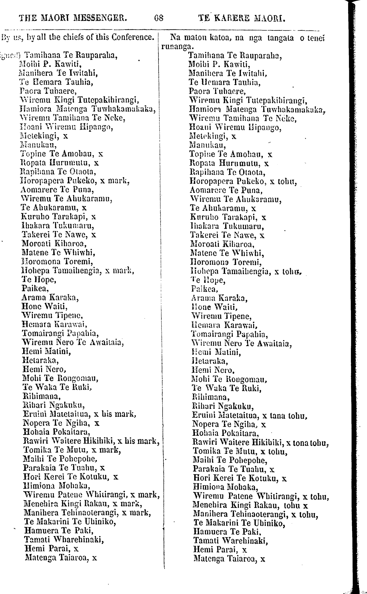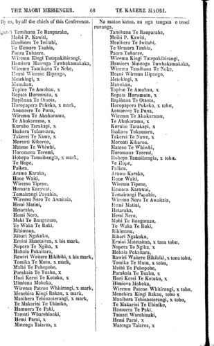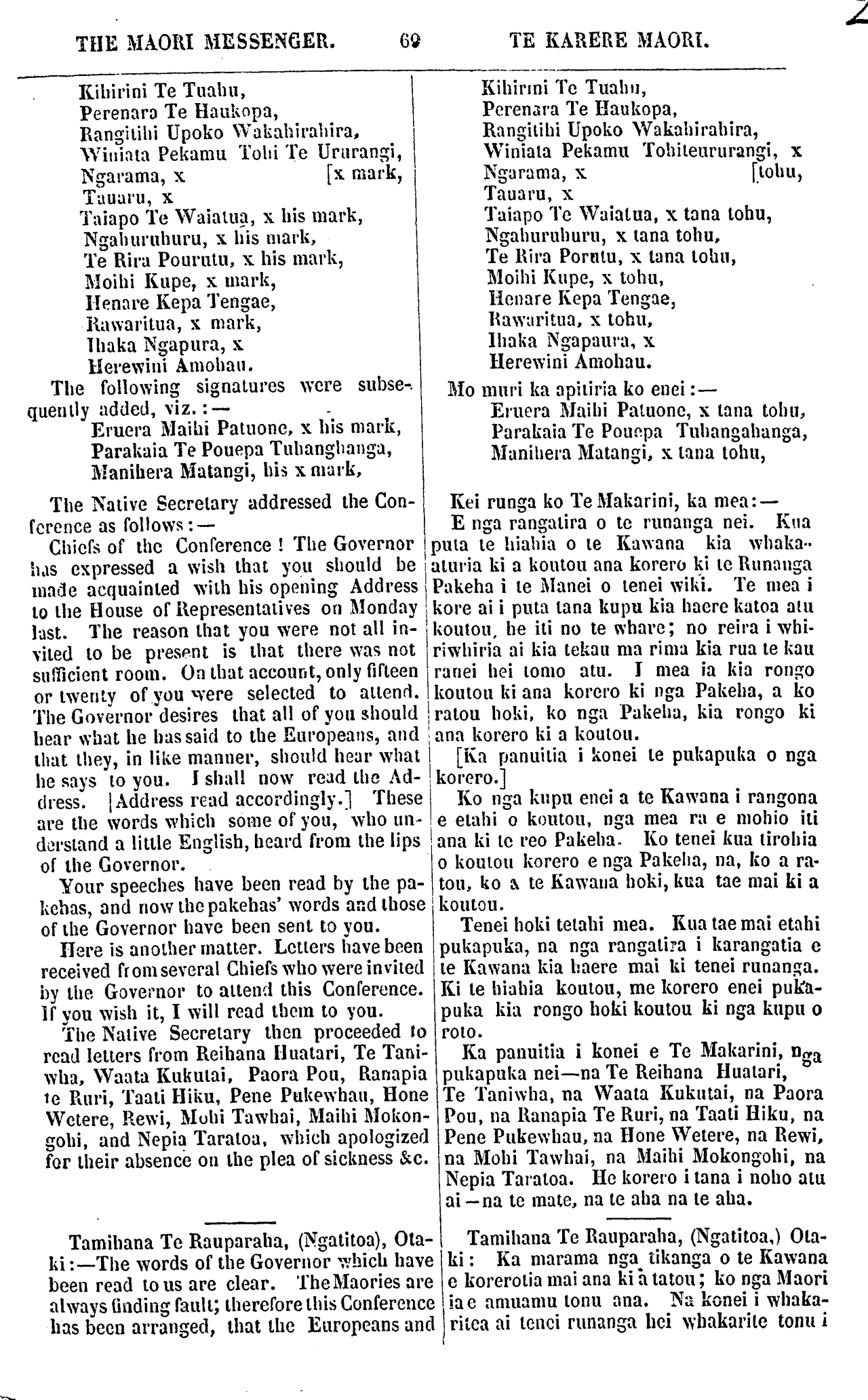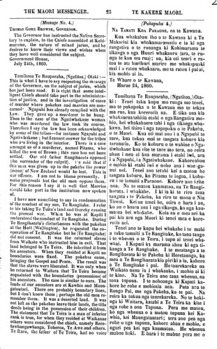 THE MAORI MESSENGER. TE KARERE MAORI. Kihirini Te Tuahu, Perenaro Te Haukopa, Rangitihi Upoko Wakahirahira, Winiata Pekamu Tohi Te Ururangi, Ngarama, x [x mark, Tauaru, x Taiapo Te Waiatua, x his mark, Ngahuruhuru, x his mark, Te Rira Pourutu, x his mark, Moihi Kupe, x mark, Henare Kepa Tengae, Rawaritua, x mark, Ihaka Ngapura, x Herewini Amohau. The following signatures were subse- quently added, viz.: Eruera Maihi Patuone, x his mark, Parakaia Te Pouepa Tuhangahanga, Manihera Matangi, his x mark, The Native Secretary addressed the Con- ference as follows:— Chiefs of Conference! The Governor has expressed a wish that you should be made acquainted with his opening Address to the House of Representatives on Monday last. The reason that you were not all in- vited to be present is that there was not sufficient room. On that account, only fifteen or twenty of you were selected to attend. The Governor desires that all of you should hear what he has said to the Europeans, and that they, in like manner, should hear what he says to you. I shall now read the Ad- dress. [Address read accordingly.] These are the words which some of you, who un- derstand a little English, beard from the lips of the Governor. Your speeches have been read by the pa- kehas, and now the pakehas' words and those of the Governor have been sent to you. Here is another matter. Letters have been received from several Chiefs who were invited by the Governor to attend this Conference. If you wish it, I will read them to you. The Native Secretary then proceeded to read letters from Reihana Huatari, Te Tani- wha, Waata Kukutai, Paora Pou, Ranapia te Ruri, Taati Hiku, Pene Pukewhau, Hone Wetere, Rewi, Mohi Tawhai, Maihi Mokon- gohi, and Nepia Taratoa. which apologized for their absence on the plea of sickness &c. Tamihana Te Rauparaha, (Ngatitoa), Ota- ki:—The words of the Governor which have been read to us are clear. The Maories are always finding fault; therefore this Conference has been arranged, that the Europeans and Kihirini Te Tuahu, Perenara Te Haukopa, Rangitihi Upoko Wakahirahira, Winiata Pekamu Tohiteururangi, x Ngarama, x tohu, Tauaru, x Taiapo Te Waiatua, x tona tohu, Ngahuruhuru, x tana tohu, Te Rira Porutu, x tana loan, Moihi Kupe, x tohu, Henare Kepa Tengae, Rawaritua, x tohu, Ihaka Ngapaura, x Herewini Amohau. Mo muri ka apitiria ko enei:— Eruera Maihi Patuone, x tana tohu, Parakaia Te Pouepa Tuhangahanga, Manihera Matangi, x tana tohu, Kei runga ko Te Makarini, ka mea:— E nga rangatira o te runanga nei. Kua puta te hiahia o te Kawana kia whaka- aturia ki a koutou ana korero ki te Runanga Pakeha i te Manei o tenei wiki. Te mea i kore ai i puta tana kupu kia haere katoa atu koutou, he iti no te whare; no reira i whi- riwhiria ai kia tekau ma rima kia rua te kau ranei hei tomo atu. I mea ia kia rongo koutou ki ana korero ki nga Pakeha, a ko ratou hoki, ko nga Pakeha, kia rongo ki ana korero ki a koutou. [Ka panuitia i konei te pukapuka o nga korero.] Ko nga kupu enei a te Kawana i rangona e etahi o koutou, nga mea ra e mohio iti ana ki te reo Pakeha. Ko tenei kua tirohia o komou korero e nga Pakeha, na, ko a ra- tou, ko & te Kawana hoki, kua tae mai ki a koutou. Tenei hoki tetahi mea. Kua tae mai etahi pukapuka, na nga rangatira i karangatia e te Kawana kia haere mai ki tenei runanga. Ki te hiahia koutou, me korero enei puka- puka kia rongo hoki koutou ki nga kupu o roto. Ka panuitia i konei e Te Makarini, nga pukapuka nei—na Te Reihana Huatari, Te Taniwha, na Waata Kukutai, na Paora Pou, na Ranapia Te Ruri, na Taati Hiku, na Pene Pukewhau, na Hone Wetere, na Rewi, na Mohi Tawhai, na Maihi Mokongohi, na Nepia Taratoa. He korero i Iana i noho atu ai —na te mate, na te aha na te aha. Tamihana Te Rauparaha, (Ngatitoa,) Ota- ki: Ka marama nga tikanga o te Kawana e korerotia mai ana ki a tatou; ko nga Maori ia e amuamu tonu ana. Na konei i whaka- ritea ai tenei runanga hei whakarite tonu i