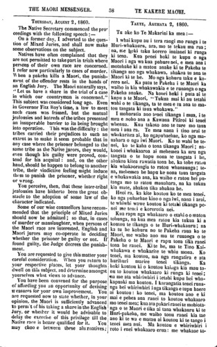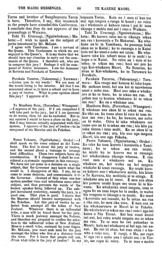 THE MAORI MESSENGER. TE KARERE MAORI. the Maories may be alike. Previously this thing was hidden from us. We did not know that the Europeans were so well dis- posed to the Maories. Let us now consider what the Governor says in his message about Te Rangitake's war at Taranaki. Some have approved of that, war, but it was only the few who approved of that evil; the majority ad- hered to that which is good. Let us make straight these things which we are now en- gaged in, that we may hand them down to our children well arranged. My heart re- joices at the Governor's word, I mean what has been proposed to us by the Governor. I am glad that these letters from some of the Native Chiefs who are absent have been read to us: probably had they not been prevented from coming by sickness, this house would have been filled. However, lot us, all the members of this Conference, consent and join in expressing our desire that the Governor may make this Conference of the Native Chiefs permanent, that when we die, we may leave it to our children after us; but now let us discuss this subject together, and if you see that what I say is wrong, then do you object to it if you see it is right then do you agree to it. that what is done may be made firm. Our proceedings will be printed and published in the newspaper that all the world may see them and that the children may see what the old men have said. When the Maories speak, their words are on the lips only; they have no books, they have no newspaper. This is a work which will improve and elavate both races. Formerly I did not know whether the Europeans were well or ill disposed to the Maories: however it is for the Conference to lay down rules; it must not be left for one man. I will say no more at present. Paora Tuhaere, (Ngatiwhatua,) Orakei: — What I am going to say will have reference to what has fallen from Tamihana. Let not this Conference think me long in what I am now about to say. The subject is that about which I spoke yesterday, Mr. McLean, namely, the jury. It was the Governor who ap- pointed the Maories as Magistrates. It was the Governor's own arrangement. So now let the Governor select men for the jury. This is what I approve of, that the Maories should sit upon the juries. Then I will say there is one law for the Europeans and for the Maories. I have been thinking during these few days past, that in the case of a European murdering a Maori, it is said, Let it be dealt with by the Queen's law; or if a Maori should murder a European still let the case be dealt te Pakeha i te tangata Maori kia rite tonu. I mua e ngaro ana i a tatou tenei mea, ka- hore tatou i matau ki te pai mai o te Pakeha ki a tatou, ki te tangata Maori; na reira i kore ai e marama nga tangata Maori. Ko tenei, ma tatou e hurihuri te kupu a Te Ka- wana i roto i tana pukapuka mo te pakanga a Te Rangitake ki Taranaki. E pai etahi ki taua pakanga; otira ko te hunga rua- rua anake i pai ki te kino; ko te tokomaha i piri tonu ki te pai. Me whakatika ano enei ritenga e mahia nei e tatou mo te pai, kia tika ai te waihotanga ki o tatou tama- riki. Ka koa taku ngakau ki te kupu a te Kawana, ara, ki nga tikanga kua korerotia mai nei e te Kawana. E whakapai ana ahau ina hoki ka korerotia mai nga kupu o etahi rangatira Maori kua noho atu; na te mate pea i pupuri atu, penei kua ki te whare nei. Erangi me whakaae katoa tatou, nga tangata o te runanga nei, kia apitia katoatia mai a tatou kupu, kia whakapumautia mai e te Kawana tenei runanga o nga rangatira Maori, a mate noa tatou, waiho ake ki o ta- tou uri i muri i a tatou. Ko tenei me korero tahi tatou. Ka kite koutou i te he o taku ka whakahe mai koutou, ka kue koutou i te tika ka whakaae mai koutou; kia tuturu ai he tikanga mo tatou. Ko tenei tikanga he mea ta ki te pukapuka nunui ki te nupepa hei titiro ma te ao katoa, kia titiro ai hoki nga tamariki ki nga korero o a ratou kau- matua. Ko ta te Maori korero he mea ko- rero ki te ngutu kau, kahore a ratou puka- puka, kahore ano hoki a mou nupepa. He mahi whakarangatira tahi tenei i nga iwi erua. I mua kahore au e mohio, kei te wha- kapai te Pakeha, kei te whakakino ranei ki te tangata Maori. Engari ma te runanga e whakatakoto he tikanga, kaua e waiho ma te tangata kotahi. Kati taku i konei. Paora Tuhaere, (Ngatiwhatua.) Orakei: Ko taku, e Tamihana, ka haere tonu i ru- nga i tau; kei whakaaro koutou e te runa- nga ki te roa o taku ka korero ake nei au; ko taku ano o nanahi nei, e Ma, mo te te- kau ma rua. Na te Kawana te tikanga ki te tangata Maori, ka meinga tena hei Kai- whakawa; na te Kawana pu ano i whaka- rite; ko tenei, ma te Kawana ano e titiro nga tangata mo te tekau ma rua. Ko taku tenei e pai ai kia uru etahi tangata Maori ki te tekau ma rua; ka tahi au ka mea kotahi ture mo te Maori mo te Pakeha. He mea whakaaro ake e ahau i enei ra ka pahure ake nei; ki te kohuru te tangata Maori i te Pakeha, me taku ano ki te ture o Kuini; ka kohuru te tangata Maori i te Pakeha, me taku ano ki te Ture o to Kuini. Ko te