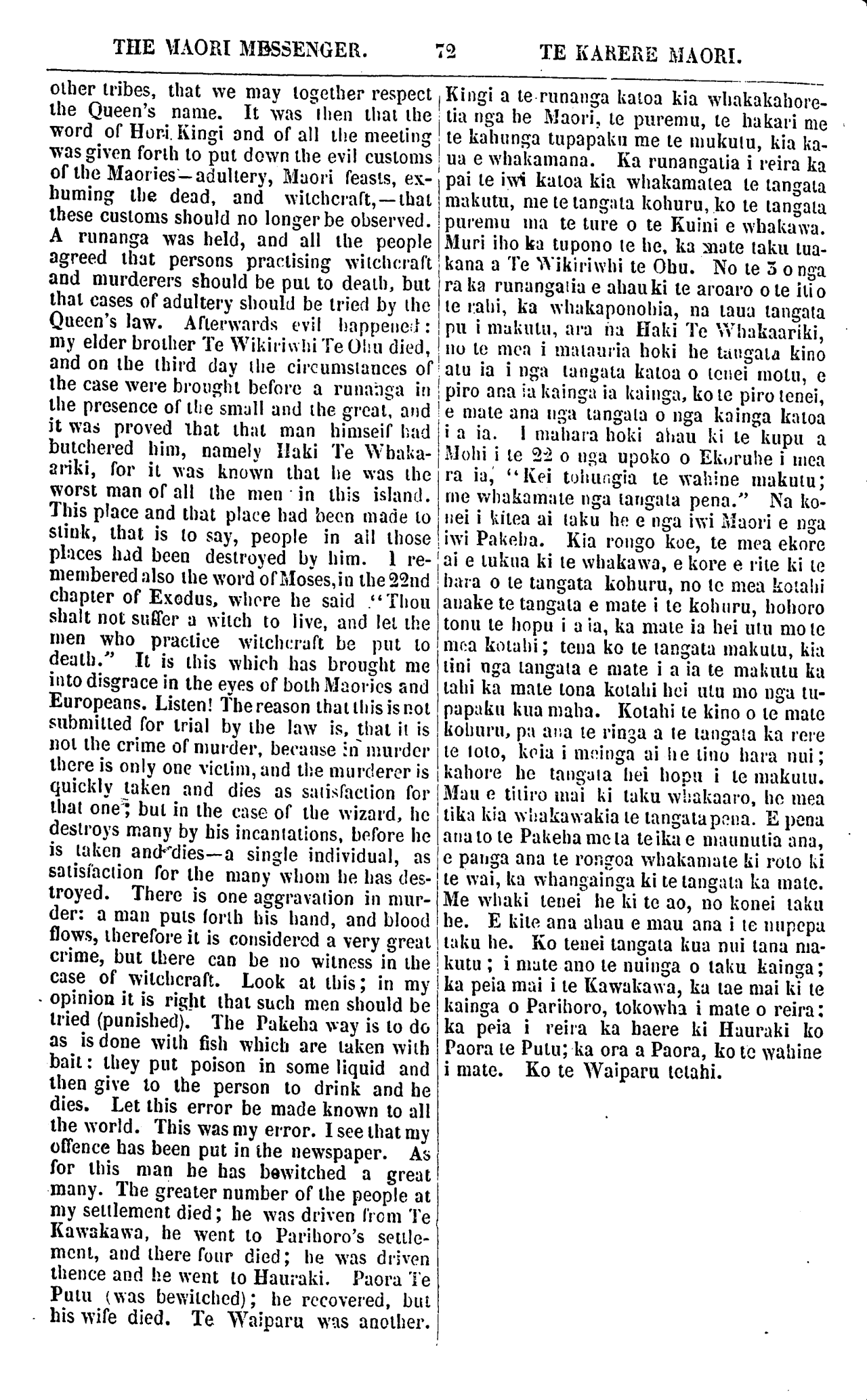 THE MAORI MESSENGER. TE KARERE MAORI. other tribes, that we may together respect the Queen's name. It was then that the word of Hori. Kingi and of all the meeting was given forth to put down the evil customs of the Maories adultery, Maori feasts, ex- huming the dead, and witchcraft, that these customs should no longer be observed. A runanga was held, and all the people agreed that persons practising witchcraft and murderers should be put to death, but that cases of adultery should be tried by the Queen's law. Afterwards evil happened: my elder brother Te Wikiriwhi Te Ohu died, and on the third clay the circumstances of the case were brought before a runanga in the presence of the small and the great, and it was proved that that man himseif had butchered him, namely Haki Te Whaka- ariki, for it was known that he was the worst man of all the men in this island. This place and that place had been made to stink, that is to say, people in ail those places had been destroyed by him. 1 re- membered also the word of Moses, in the 22nd chapter of Exodus, where he said "Thou shalt not suffer a witch to live, and let the men who practice witchcraft be put to death." It is this which has brought me into disgrace in the eyes of both Maories and Europeans. Listen! The reason that this is not submitted for trial by the law is, that it is not the crime of murder, because in murder there is only one victim, and the murderer is quickly taken and dies as satisfaction for that one; but in the case of the wizard, he destroys many by his incantations, before he is taken and dies are single individual, as satisfaction for the many whom he has des- troyed. There is one aggravation in mur- der: a man puts forth his hand, and blood flows, therefore it is considered a very great crime, but there can be no witness in the case of witchcraft. Look at this; in my opinion it is right that such men should be tried (punished). The Pakeha way is to do as is done with fish which are taken with bail; they put poison in some liquid and then give to the person to drink and he dies. Let this error be made known to all the world. This was my error. I see that my offence has been put in the newspaper. As for this man be has bewitched a great many. The greater number of the people at my settlement died; he was driven from Te Kawakawa, he went to Parihoro's settle- ment, and there four died; he was driven thence and he went to Hauraki. Paora Te Putu (was bewitched); he recovered, but his wife died. Te Waiparu was another. Kingi a te runanga katoa kia whakakahore- tia nga he Maori, te puremu, te hakari me te kahunga tupapaku me te mukutu, kia ka- ua e whakamana. Ka runangatia i reira ka pai te iwi katoa kia whakamatea te tangata makutu, me te tangata kohuru, ko te tangata puremu ma te ture o te Kuini e whakawa. Muri iho ka tupono te he, ka mate taku tua- kana a Te Wikiriwhi te Ohu. No te 3 o nga ra ka runangatia e ahau ki te aroaro o te iti o te rahi, ka whakaponohia, na taua tangata pu i makutu, ara na Haki Te Whakaariki, no te mea i matauria hoki he tangata kino atu ia i nga tangata katoa o tenei motu, e piro ana ia kainga ia kainga, ko te piro tenei, e mate ana nga tangata o nga kainga katoa i a ia. I mahara hoki ahau ki te kupu a Mohi i te 22 o nga upoko o Ekuruhe i mea ra ia, "Kei tohungia te wahine makutu; me whakamate nga tangata pena." Na ko- nei i kitea ai taku he e nga iwi Maori e nga iwi Pakeha. Kia rongo koe, te mea ekore ai e tukua ki te whakawa, e kore e rite ki te hara o te tangata kohuru, no te mea kotahi anake te tangata e mate i te kohuru, hohoro tonu te hopu i a ia, ka male ia hei utu mo te mea kotahi; tena ko te tangata makutu, kia tini nga tangata e mate i a ia te makutu ka tahi ka mate tona kotahi hei atu mo nga tu- papaku kua maha. Kotahi te kino o te mate kohuru, pa ana te ringa a te tangata ka rere te toto, koia i meinga ai he tino hara nui; kahore he tangata hei hopu i te makutu. Mau e titiro mai ki taku whakaaro, ho mea tika kia whakawakia te tangata pena. E pena ana to te Pakeha me ta te ika e maunutia ana, e panga ana te rongoa whakamate ki roto ki te wai, ka whangainga ki te tangata ka mate. Me vvhaki tenei he ki te ao, no konei taku he. E kite ana ahau e mau ana i te nupepa taku he. Ko tenei tangata kua nui tana ma- kutu; i mate ano te nuinga o taku kainga; ka peia mai i te Kawakawa, ka tae mai ki te kainga o Parihoro, tokowha i mate o reira; ka peia i reira ka haere ki Hauraki ko Paora te Putu; ka ora a Paora, ko te wahine i mate. Ko te Waiparu tetahi.