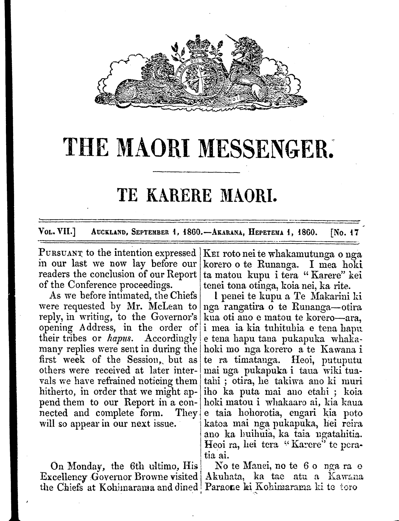 The Maori Messenger - Ko te Karere Maori 1855-1860: Volume 7, Number 17. 01 September 1860 |
