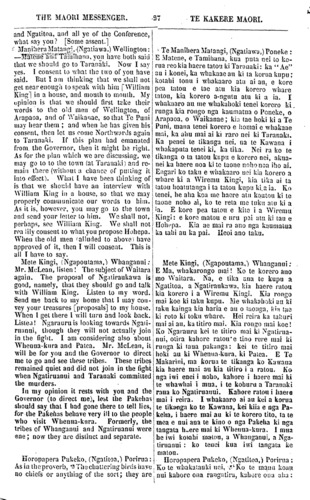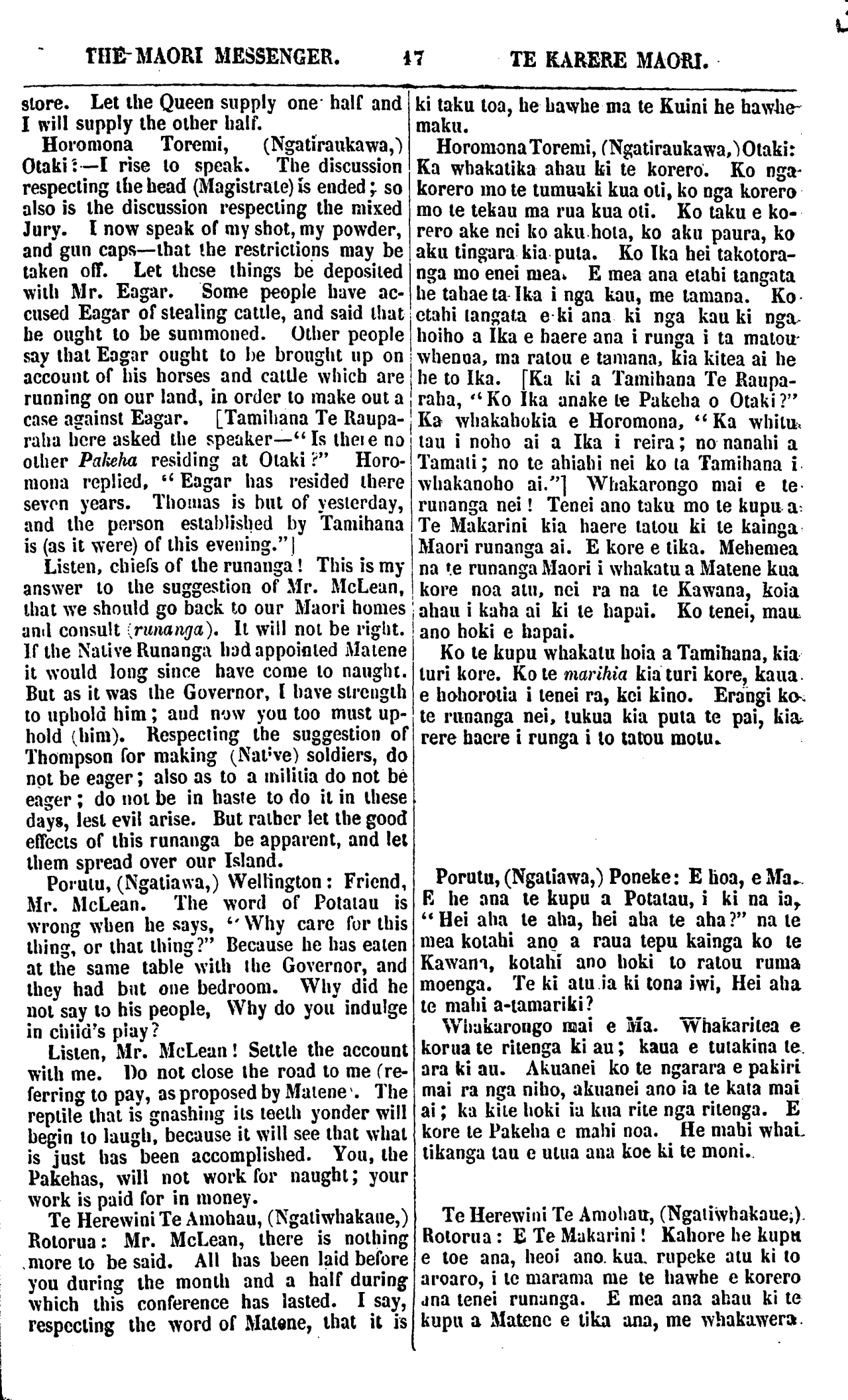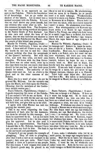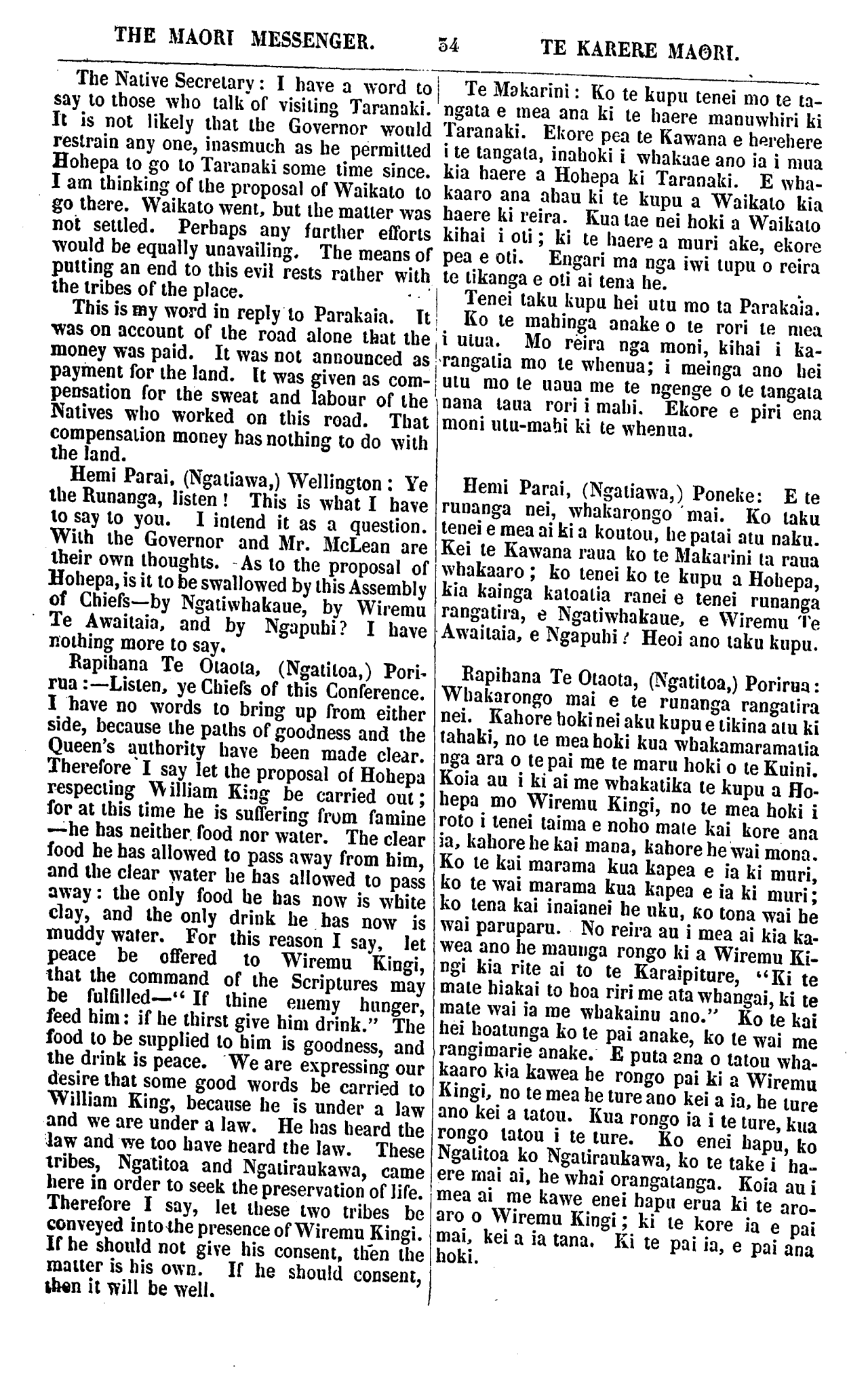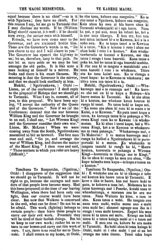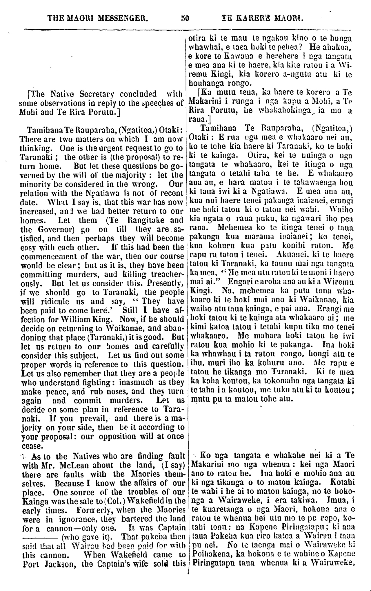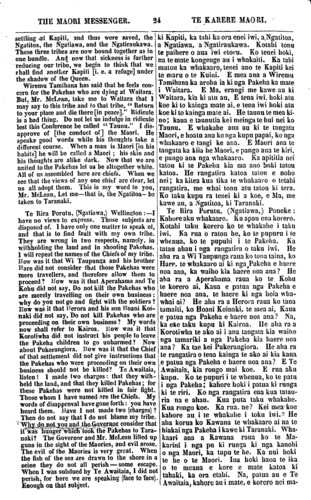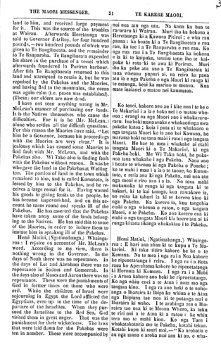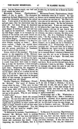 THE MAORI MESSENGER. SO TE KARERE MAORI. [The Native Secretary concluded with some observations in reply to the speeches of Mohi and Te Rira Porutu.] Tamihana Te Rauparaha, (Ngatitoa,) Otaki: There are two matters on which I am now thinking. One is the urgent request to go to Taranaki; the other is (the proposal) to re- turn home. But let these questions be go- verned by the will of the majority: let the minority be considered in the wrong. Our relation with the Ngatiawa is not of recent dale. What 1 say is, that this war has now increased, and we had better return to our homes. Let them (Te Rangitake and the Governor) so on till they are sa- tisfied, and then perhaps they will become easy with each other. If this had been the commencement of the war, then our course would be clear; but as it is, they have been committing murders, and killing treacher- ously. But let us consider this. Presently, if we should go to Taranaki, the people will ridicule us and say," They have been paid to come here.' Still I have af- fection for William King. Now, if be should decide on returning to Waikanae, and aban- doning that place (Taranaki,) it is good. But let us return to our homes and carefully consider this subject. Let us find out some proper words in reference to this question. Let us also remember that they are a people who understand fighting: inasmuch as they make peace, and rub noses, and they turn again and commit murders. Let us decide on some plan in reference to Tara- naki. If you prevail, and there is a ma- jority on your side, then be it according to your proposal: our opposition will at once cease. As to the Natives who are finding fault with Mr. McLean about the land, (I say) there are faults with the Maories them- selves. Because I know the affairs of our place. One source of the troubles of our Kainga was the sale to (Col.) Wakefield in the early limes. Formerly, when the Maories were in ignorance, they bartered the land for a cannon—only one. It was Captain ————— (who gave it). That pakeha then said that all Wairau had been paid for with this cannon. When Wakefield came to Port Jackson, the Captain's wife sold this otira ki Ie mau te ngakau kino o te hunga whawhai, e taea hoki te pehea? He ahakoa, e kore te Kawana e herehere i nga tangata e mea ana ki te haere, kia kite ratou i a Wi- remu Kingi, kia korero a-ngutu atu ki te houhanga rongo. [Ka mutu tena, ka haere te korero a Te Makarini i runga i nga kupu a Mohi, a Te Rira Porutu, he whakahokinga ia mo a raua.] Tamihana Te Rauparaha, (Ngatitoa,) Otaki: E rua nga mea e whakaaro nei au, ko te tohe kia haere ki Taranaki, ko te hoki ki te kainga. Otira, kei te nuinga o nga tangata te whakaaro, kei te itinga o nga tangata o tetahi taha te he. E whakaaro ana au, e hara matou i te takawaenga hou ki taua iwi ki a Ngatiawa. E mea ana au, kua nui haere tenei pakanga inaianei, erangi me hoki tatou ki o tatou nei wahi. Waiho kia ngata o raua puku, ka ngawari iho pea raua. Mehemea ko te itinga tenei o taua pakanga kua marama inaianei; ko tenei, kua kohuru kua patu konihi ratou. Me rapu ra tatou i tenei. Akuanei, ki te haere tatou ki Taranaki, ka taunu mai nga tangata ka mea, " He mea uru ratou ki te moni i haere mai ai." Engari e aroha ana au ki a Wiremu Kingi. Na, mehemea ka puta tona wha- kaaro ki te hoki mai ano ki Waikanae, kia waiho atu taua kainga, e pai ana. Erangi me hoki tatou ki te kainga ata whakaaro ai; me kimi katoa tatou i tetahi kupu tika mo tenei whakaaro. Me mahara hoki tatou he iwi ratou kua mohio ki te pakanga. Ina hoki ka whawhau i ta ratou rongo, hongi atu te ihu, muri iho ka kohuru ano. Me rapu e tatou he tikanga mo Taranaki. Ki te mea ka kaha koutou, ka tokomaha nga tangata ki te taha i a koutou, me tuku atu ki ta koutou; mutu pu ta matou tohe atu. Ko nga tangata e whakahe nei ki a Te Makarini mo nga whenua: kei nga Maori ano to ratou he. Ina hoki e mohio ana au ki nga tikanga o to matou kainga. Kotahi te wahi i he ai to matou kainga, no te hoko- nga a Wairaweke, i era takiwa. Imua, i te kuaretanga o nga Maori, hokona ana e ratou te whenua hei utu mo te pu ropo, ko- tahi tonu: na Kapene Piringatapu; ki ana taua Pakeha kua riro katoa a Wairau i taua ! pu nei. No te taenga mai o Wairaweke ki Poihakena, ka hokona e te wahine o Kapene Piringatapu taua whenua ki a Wairaweke,