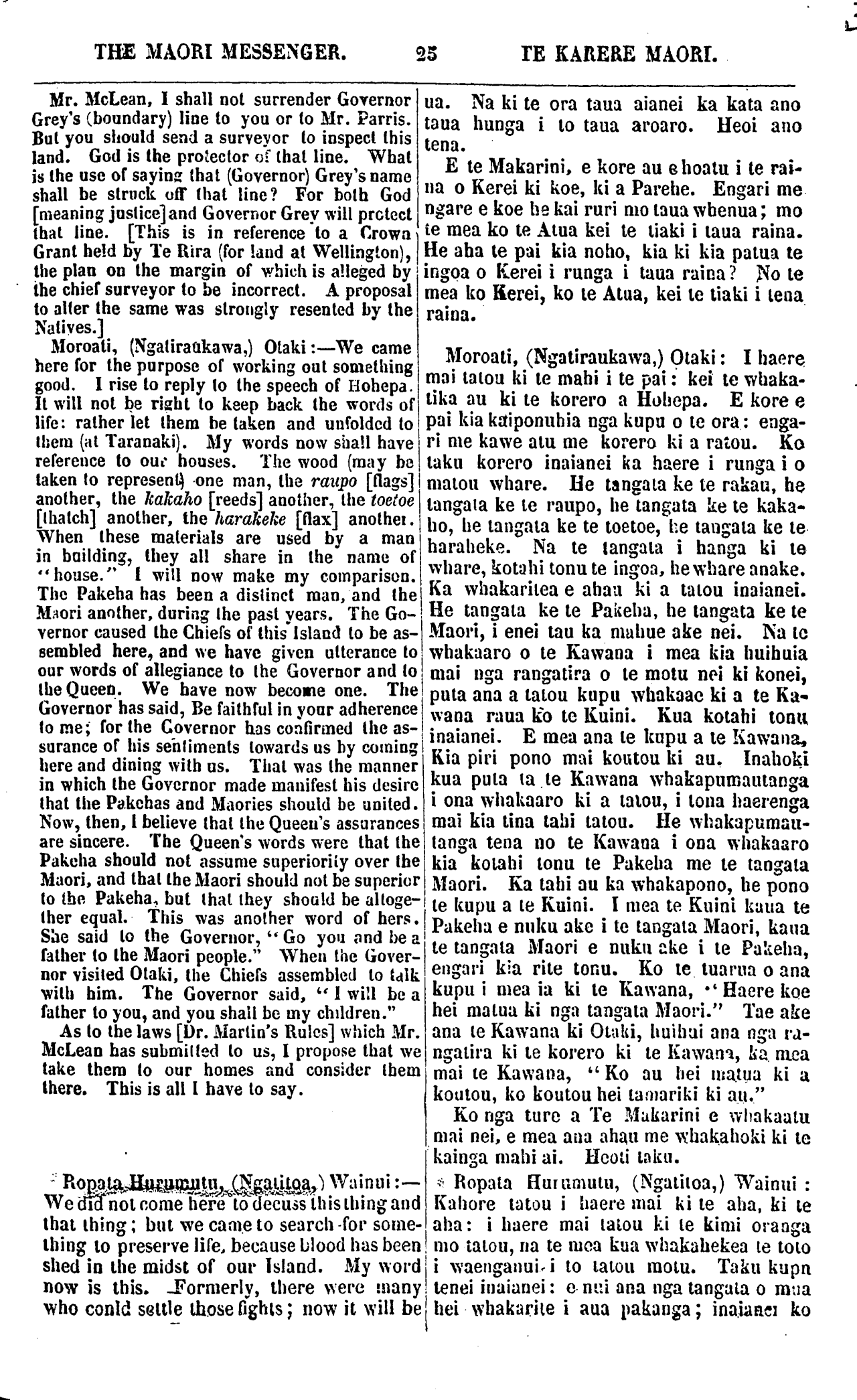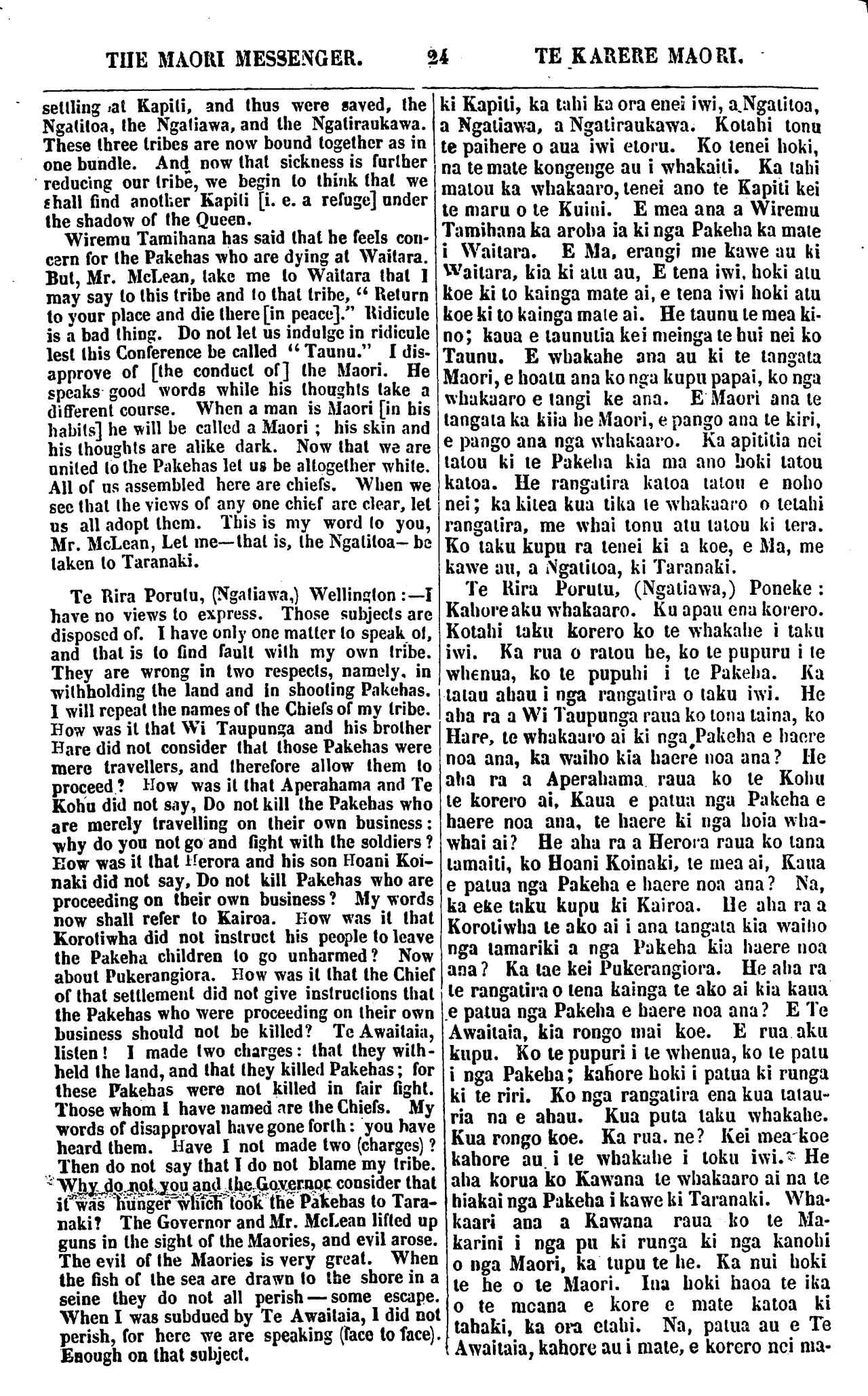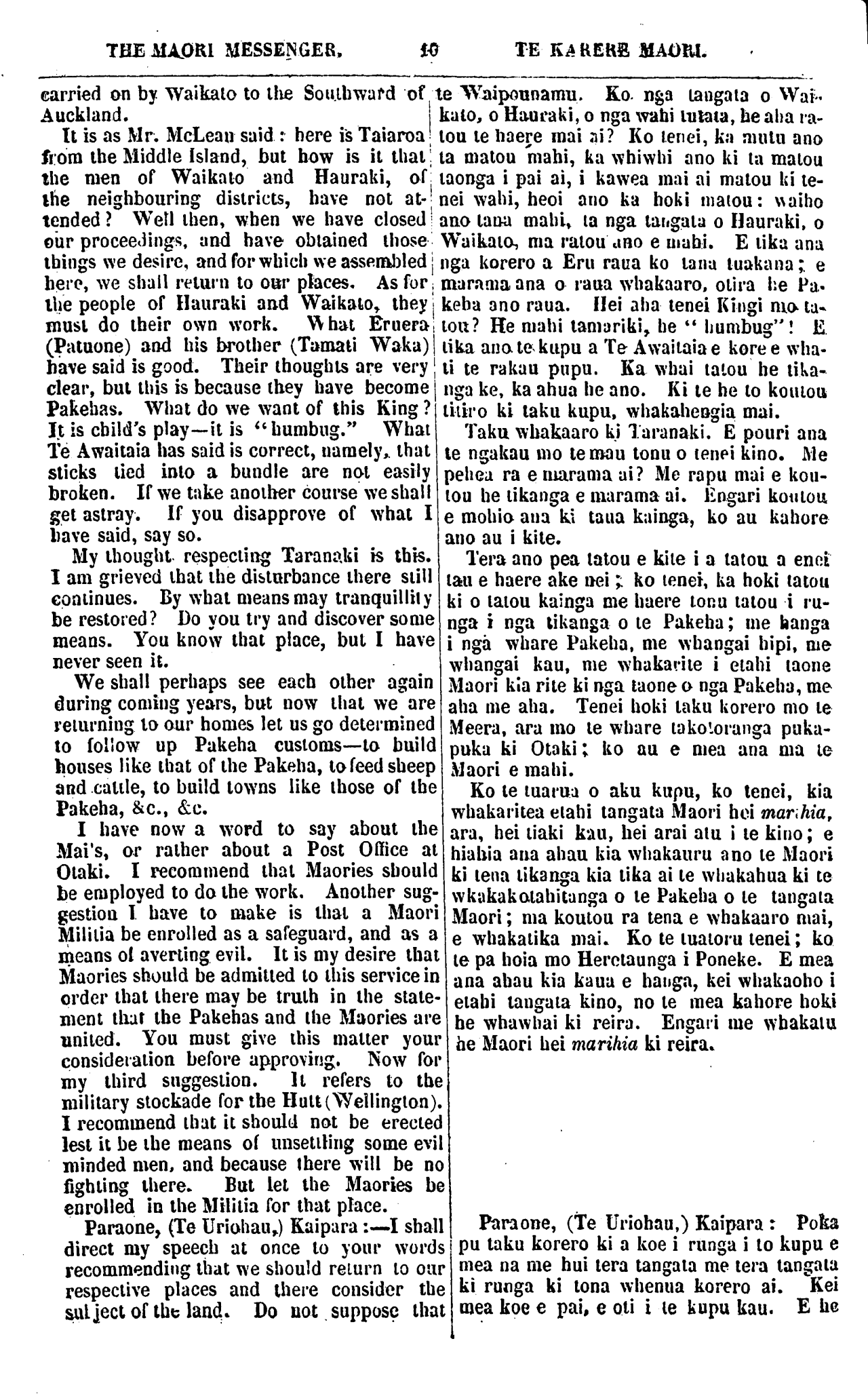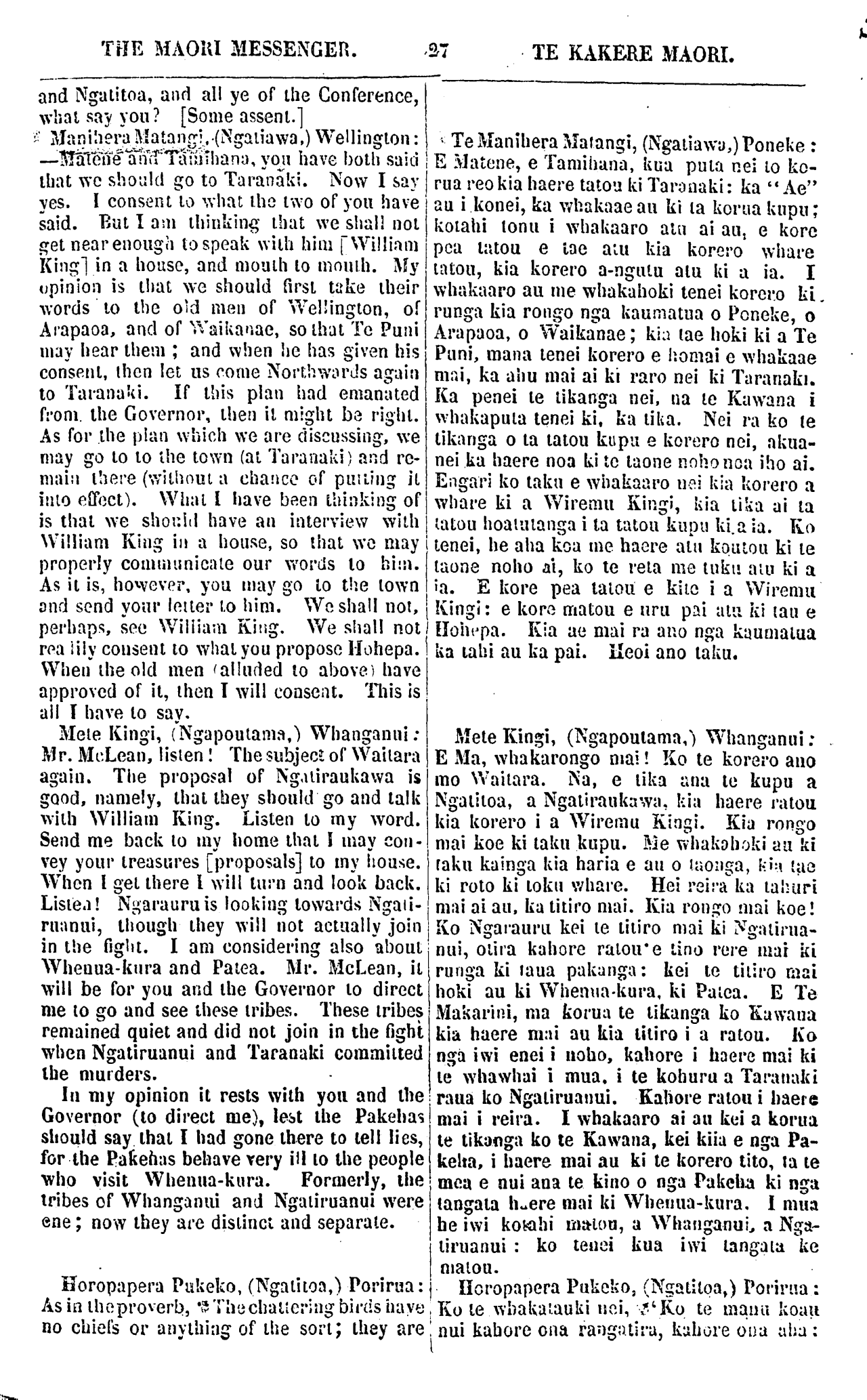 THE MAORI MESSENGER. SO TE KARERE MAORI. [The Native Secretary concluded with some observations in reply to the speeches of Mohi and Te Rira Porutu.] Tamihana Te Rauparaha, (Ngatitoa,) Otaki: There are two matters on which I am now thinking. One is the urgent request to go to Taranaki; the other is (the proposal) to re- turn home. But let these questions be go- verned by the will of the majority: let the minority be considered in the wrong. Our relation with the Ngatiawa is not of recent dale. What 1 say is, that this war has now increased, and we had better return to our homes. Let them (Te Rangitake and the Governor) so on till they are sa- tisfied, and then perhaps they will become easy with each other. If this had been the commencement of the war, then our course would be clear; but as it is, they have been committing murders, and killing treacher- ously. But let us consider this. Presently, if we should go to Taranaki, the people will ridicule us and say," They have been paid to come here.' Still I have af- fection for William King. Now, if be should decide on returning to Waikanae, and aban- doning that place (Taranaki,) it is good. But let us return to our homes and carefully consider this subject. Let us find out some proper words in reference to this question. Let us also remember that they are a people who understand fighting: inasmuch as they make peace, and rub noses, and they turn again and commit murders. Let us decide on some plan in reference to Tara- naki. If you prevail, and there is a ma- jority on your side, then be it according to your proposal: our opposition will at once cease. As to the Natives who are finding fault with Mr. McLean about the land, (I say) there are faults with the Maories them- selves. Because I know the affairs of our place. One source of the troubles of our Kainga was the sale to (Col.) Wakefield in the early limes. Formerly, when the Maories were in ignorance, they bartered the land for a cannon—only one. It was Captain ————— (who gave it). That pakeha then said that all Wairau had been paid for with this cannon. When Wakefield came to Port Jackson, the Captain's wife sold this otira ki Ie mau te ngakau kino o te hunga whawhai, e taea hoki te pehea? He ahakoa, e kore te Kawana e herehere i nga tangata e mea ana ki te haere, kia kite ratou i a Wi- remu Kingi, kia korero a-ngutu atu ki te houhanga rongo. [Ka mutu tena, ka haere te korero a Te Makarini i runga i nga kupu a Mohi, a Te Rira Porutu, he whakahokinga ia mo a raua.] Tamihana Te Rauparaha, (Ngatitoa,) Otaki: E rua nga mea e whakaaro nei au, ko te tohe kia haere ki Taranaki, ko te hoki ki te kainga. Otira, kei te nuinga o nga tangata te whakaaro, kei te itinga o nga tangata o tetahi taha te he. E whakaaro ana au, e hara matou i te takawaenga hou ki taua iwi ki a Ngatiawa. E mea ana au, kua nui haere tenei pakanga inaianei, erangi me hoki tatou ki o tatou nei wahi. Waiho kia ngata o raua puku, ka ngawari iho pea raua. Mehemea ko te itinga tenei o taua pakanga kua marama inaianei; ko tenei, kua kohuru kua patu konihi ratou. Me rapu ra tatou i tenei. Akuanei, ki te haere tatou ki Taranaki, ka taunu mai nga tangata ka mea, " He mea uru ratou ki te moni i haere mai ai." Engari e aroha ana au ki a Wiremu Kingi. Na, mehemea ka puta tona wha- kaaro ki te hoki mai ano ki Waikanae, kia waiho atu taua kainga, e pai ana. Erangi me hoki tatou ki te kainga ata whakaaro ai; me kimi katoa tatou i tetahi kupu tika mo tenei whakaaro. Me mahara hoki tatou he iwi ratou kua mohio ki te pakanga. Ina hoki ka whawhau i ta ratou rongo, hongi atu te ihu, muri iho ka kohuru ano. Me rapu e tatou he tikanga mo Taranaki. Ki te mea ka kaha koutou, ka tokomaha nga tangata ki te taha i a koutou, me tuku atu ki ta koutou; mutu pu ta matou tohe atu. Ko nga tangata e whakahe nei ki a Te Makarini mo nga whenua: kei nga Maori ano to ratou he. Ina hoki e mohio ana au ki nga tikanga o to matou kainga. Kotahi te wahi i he ai to matou kainga, no te hoko- nga a Wairaweke, i era takiwa. Imua, i te kuaretanga o nga Maori, hokona ana e ratou te whenua hei utu mo te pu ropo, ko- tahi tonu: na Kapene Piringatapu; ki ana taua Pakeha kua riro katoa a Wairau i taua ! pu nei. No te taenga mai o Wairaweke ki Poihakena, ka hokona e te wahine o Kapene Piringatapu taua whenua ki a Wairaweke,