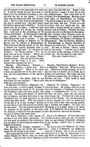 THE MAORI MESSENGER. TE KARERE MAORI. If Mohi, of Pukaki, were present to-day, I should reply to his speech. I shall wait till 1 have an opportunity of doing so in the hearing of many of the Waikatos. [A voice "Mohi is not here."] I hear that Wai- kato and Hauraki are proposing that a dis- tinct Conference should be held for them: but my opinion is that they should have at- tended this Conference where they might ex.- press their opinions in the hearing of Chiefs from all parts of the Island, for even Taiaroa, from the extreme South, is here. The Hauraki people have probably absented themselves on account of illness. If this is not the case, they were wrong in leaving it for the pakehas alone to welcome the stran- gers. Metekingi, (Ngapoutama), Whanganui: Mr. McLean, you have introduced two sub- jects; first, the (mixed) jury of twelve, in cases of murder; secondly, about the suc- cession of Ihe property of deceased persons to their children, or, where there are no children, to the relations. We have consi- dered this subject (the succession of proper- ly) before. This is a new subject introduced by you, the jury. The third of your subjects was Taranaki. I don't understand that sub- ject. That matter rests with you and the Governor. The fourth subject was the King. I leave that matter also to you. The Wai- kato (Chiefs) say that their thoughts are for peace, l am following out your words (Mr. McLean). This person and that person has revealed his troubles. This is the last week of the Conference; therefore I shall reply to your speeches, Mr. McLean. This is what I have to say about the jury. This institution has been offered to the Mao- ries. Here also is a word. Governor Grey appointed Assessors. Those Assessors have performed the duties (of their office). This is the second year of my Assessorship. I have not yet received any consideration for my services. The custom amongst Euro- peans is to rcceive payment for services per- formed, but I receive no payment. I propose that you set this right. Now I would ask, what are your intentions respecting this jury of twelve? Also, tell us your intentions about the Assessors. Tahana Turoa, (Patutokotoko,) Whanga- nui:—1 am wailing to hear the Governor's reply to the words of the Runanga. It has been suggested that each man should return to o his own home and to his own house and e pai kia waiho he Kai-whakawa Pakeha hei hoa mo o koutou Runanga hei mahi i nga he. Me i konei a Mohi o Pukaki i tenei ra, ka whakahoki korero ahau mo ana. Otira kia tokomaha o Waikato ki te whakarongo ka tahi ahau ka utu i tana kupu. [Ka karanga ake tetahi, "Kahore a Mohi i konei."] E mea ana a Hauraki raua ko Waikato kia whakaritea tetahi Runanga motuhake mo ratou. Otira, ki taku, ko te Runanga te- nei mo ratou, kia rangona ai a ratou wha- kaaro e nga rangatira katoa o nga wahi katoa o Niu Tirani; inahoki ko Taiaroa tenei no tera pito rawa o te motu. Otira he mate pea nana i pupuri atu a Hauraki: mehemea e hara i te male e he ana ta ratou waiho ma nga Pakeha anake e karanga nga manu- whiri. Mete Kingi, (Ngapoutama,) Whanganui: E Ma, ko to kupu tuatahi, ko te tekau ma rua, ara ko te whakawakanga mo te tangata e kohurutia ana; ko te rua o o kupu mo te tangata mate, mo nga taonga kia waiho ki ona tamariki; kahore ona tamariki ka wai- ho ki ona whanaunga. Kua oti tena kupu i a matou. Ko te tekau ma rua ka tahi ma- tou ka rongo, nau na hoki i korero mai. Ko te tuatoru o o kupu mo te mahi ki Ta- ranaki. Kahore au e mohio ki te whakaaro, mau tena; kei a korua ko te Kawana te wha- kaaro mo tena. Ko te tuawha ko te Kingi, waiho tena ki a koe te whakaaro. E ki ana Waikato, kei a ia ano te whakaaro mo te pai. Kei te whaiwhai atu au i runga i o kupu. Kua korerotia ta tenei he, me ta tera he. He wiki whakamutunga tenei mo te ko rero a te Runanga, koia au i whaiwhai atu ai ki ena kupu au, e Te Makarini. Naku tenei kupu mo te tekau ma rua. Kua meinga tena hei mahi mo nga tangata Maori. Tenei hoki tetahi kupu. Karangatia ana e Kawana Kerei, he Kai-whakawa. Ka mahi ano aua Kai-whakawa. Ko te rua tenei o nga tau i tu ai au hei Kai-whakawa, kahore ano au i kite i te tikanga mo taku mahi. Ko te tikanga tenei. E mahi ana te Pakeha me tona utu, mahi ana au, kahore he utu. E mea ana au me whakatika tenei e koe. E kimi ana ahau i te tikanga o te tekau ma rua; whakaritea mai ano hoki e koe te tika- nga mo te Kai-whakawa. Tahana Turoa, (Patutokotoko,) Whanga- nui: E whai ana au ki te tikanga utu mai a Te Kawana i nga kupu o te Runanga nei. Kua meinga hoki me hoki tera tangata ki tona whare ki tona kainga mahi ai i nga ti-