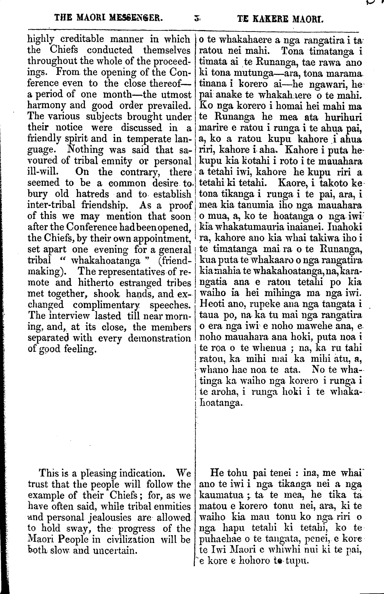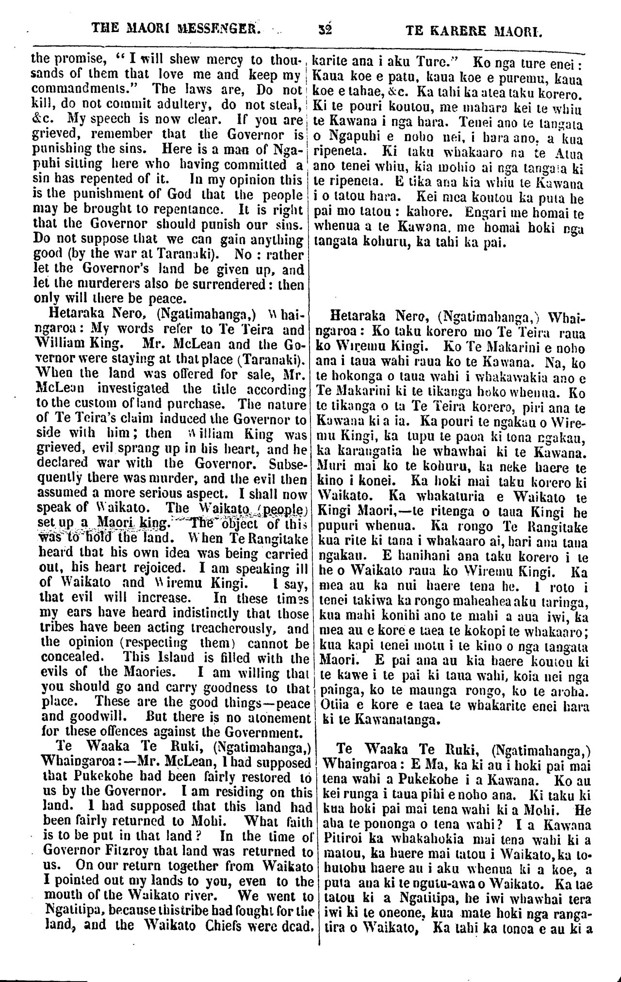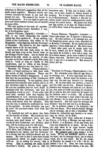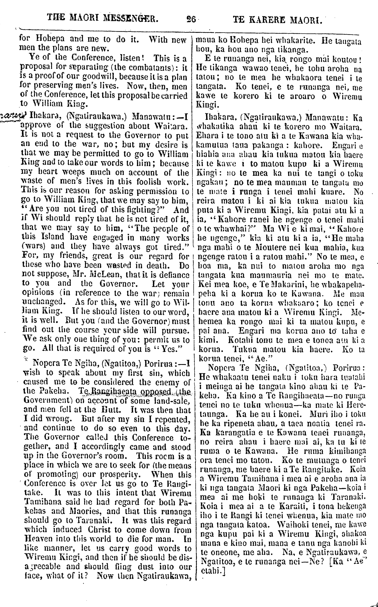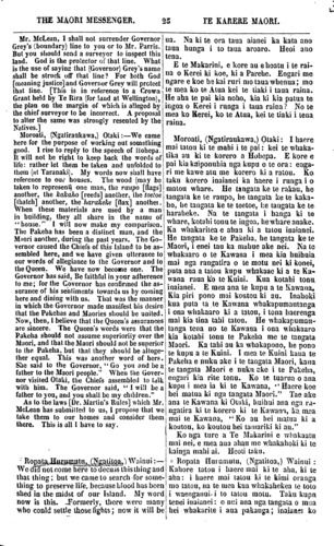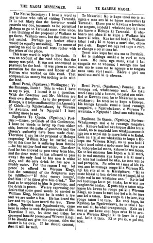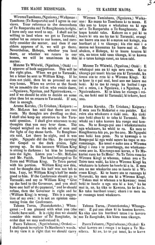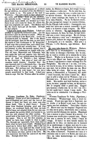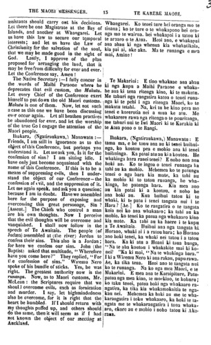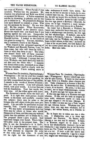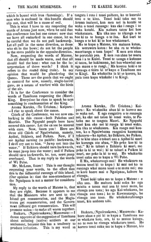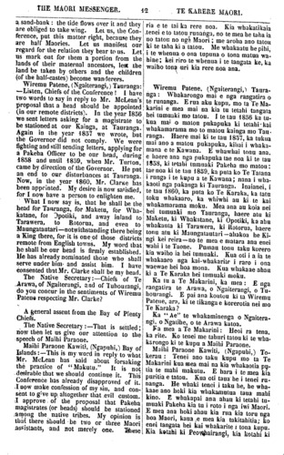 THE MAORI MESSENGER. TE KARERE MAORI. These are Ihe benefits which you are confer- ring on us: the Maories are being ordained ministers. My willingness (to be a minister) is in my heart. But my fear is that should 1 con- sent, it might not bo long after before I had turned back (to my former ways). That subject is ended. I shall not be strong (to speak) now about Ihe fighting which is going on yonder. If the evil rested with me (i. e. with my tribe) alone, then I might speak. I, that is Ngatiawa, commenced it, then Ngatiruanui and Taranaki joined in it, and now Waikato also is implicated. If the evil rested with me alone, then I might endea- voured to do something: had Ngatiawa alone been concerned, then I should have spoken with power. I have no influence in this matter. The evil will spread, and perhaps other tribes will become concerned in it. My evil will cause the death of men; perhaps even the men (soldiers) of Port Jackson will die from this evil. It is a waste that men's lives should be lost in this war. The right kind of death is that arising from natural causes. This death (in war) is had for both Maories and Pakehas, I feel regard for those tribes who are living in ignorance. I feel regard for the Pakehas also. Why should they die because of my evil? Therefore I say, let us do our work well; let us be careful in laying down plans for our guidance. Let us have a good canoe in which to sail, that we may enjoy these good things. When we see anything good we desire it at once. In former times a gun was considered a great treasure; but when guns became plentiful the people became careless about them. In like manner will it be with the King, movement); before long i I will be abandoned. Hori Winiata, (Ngapuhi,) Kaipara: Here we are standing under the laws of the Queen. My sin is not of today—you know all about it. 1 asked myself, How shall I secure an entrance into the laws of the Queen? When I had considered, I parted with my land (to the Government) so that 1 might enter. For I am acquainted with the system of the (military) officers. The captains and the colonels pay for their admission to the work of soldiers. The Treaty of Waitangi is good. The pood things of this Island sprang from them. Had it not been for that Treaty, (our island) would have been taken by another nation. Ngapuhi said, Our land will be taken by the French; give us a Governor to protect this Island. When he was stationed here, then the color [flag-staff] was erected at Maiki [in the Bay of Islands], Some low-bred Pakehas deceived us, and the flag-staff was cut down. But now the sin of Ngapuhi is at an end. 1 have nothing more to say. Hohaia Pokaitara, (Ngatitoa,) Porirua: Our Rood-will leads us to say, Take us to Taranaki. I belong to the smallest tribe; it was the sword that thinned us. That was the reason of our Ko nga painga enei e tukua mai ana e koutou, koia nei ko tangata Maori e wha- kaminitatia ana. Tenei taku whakaaetanga kei roto i au. He tupato noku ki toku wha- kaaetanga ki te Rongo-pai, kihai i roa te whakaaetanga kua hoki whakamuri. Heoti tena. E kore au e kaha inaianei mo te ritenga o te pakanga e mahi mai nei. Mehemea i au anake te he ka puta taku kupu. Naku, na Ngatiawa, i timata, uru ana a Ngatiruanui, a Taranaki, ko tenei kua uru hoki, Waikato ki roto. Mehemea i au anake te he ka puta he koha maku, me i Ngatiawa anake kua kaha ahau. E kore au e kaha ki tena he. Ka tupu ano taua he me te ura ano pea o etahi iwi ki roto ki taua he. Ma taku he te ta- ngata e mate ai, me nga tangata pea o Poi- hakena ka mate ano i tenei he. - Maumau te tangata kia male ki runga ki tenei pakanga; tena ano te matenga pai, ko te mate turoro. He mate kino tenei mo te Maori mo te Pa- keha. E aroha ana au ki nga iwi e noho kuware ana. E aroha ana ahau ki nga Pa- keha. He aha kia male ratou ki runga ki toku he? Koia au i mea ai kia pai ta tatou mahi, kia pai te whakatakoto tikanga ma ta- tou. Kia pai te waka kia uru tatou ki enei mea Uka. Ka kite tatou i te mea pai, minamina tonu atu. He taonga nui te pu i mua, ka tini ha- ere te pu, ka ngoikore te whakaaro ki tena taonga; me tenei hoki, me te Kingi, e kore ano e roa ka mahue. Hori Winiata, (Ngapuhi,) Kaipara:— Tenei tatou te tu nei i roto i te ture o te Kuini. E hara inaianei tuku hara, kua matau koe. Kua mea ahau me pehea taku tapokotanga ki roto ki te ture o te Kuini, ka whakaaro ahau, hoatu ana e ahau taku whenua hei whakatapokoranga moku. E mohio ana ho- ki ahau ki te tikanga o te apiha; he mea utu e nga kapetana. e nga kanara, to ratou tapokotanga ki te mahi hoia. E tika ana te Tiriti ki Waitangi; na kona i tupu ai te pai ki tenei motu. Me i kore taua Tiriti kua riro i te iwi ke. Ka wha- kaaro Ngapuhi, Meake riro te whenua e te Mariao: homai he Kawana hei tiaki mo te- nei motu. Ka noho ia, ka tu te kara ki Maiki; tinihangatia ana matou e te Pakeha tutua, ka hinga taua kara. Ko tenei, kua mutu te hara o Ngapuhi. Heoi ano taku kupu. Hohaia Pokaitara, (Ngatitoa,) Porirua: Na to matou aroha tenei kupu, me kawe ma- tou ki Taranaki. Ko au te iwi iti, na te ho- ari au i whakaiti: no reira ka noho matou