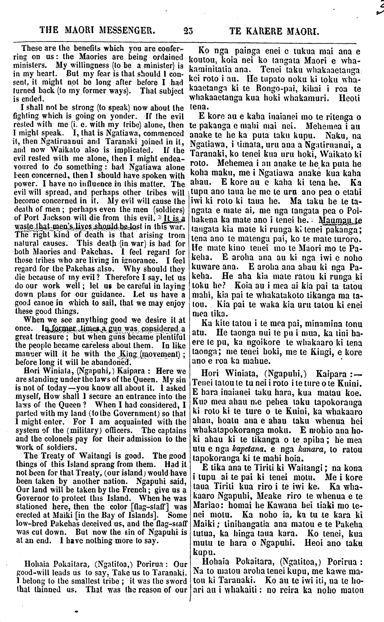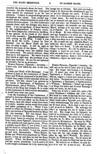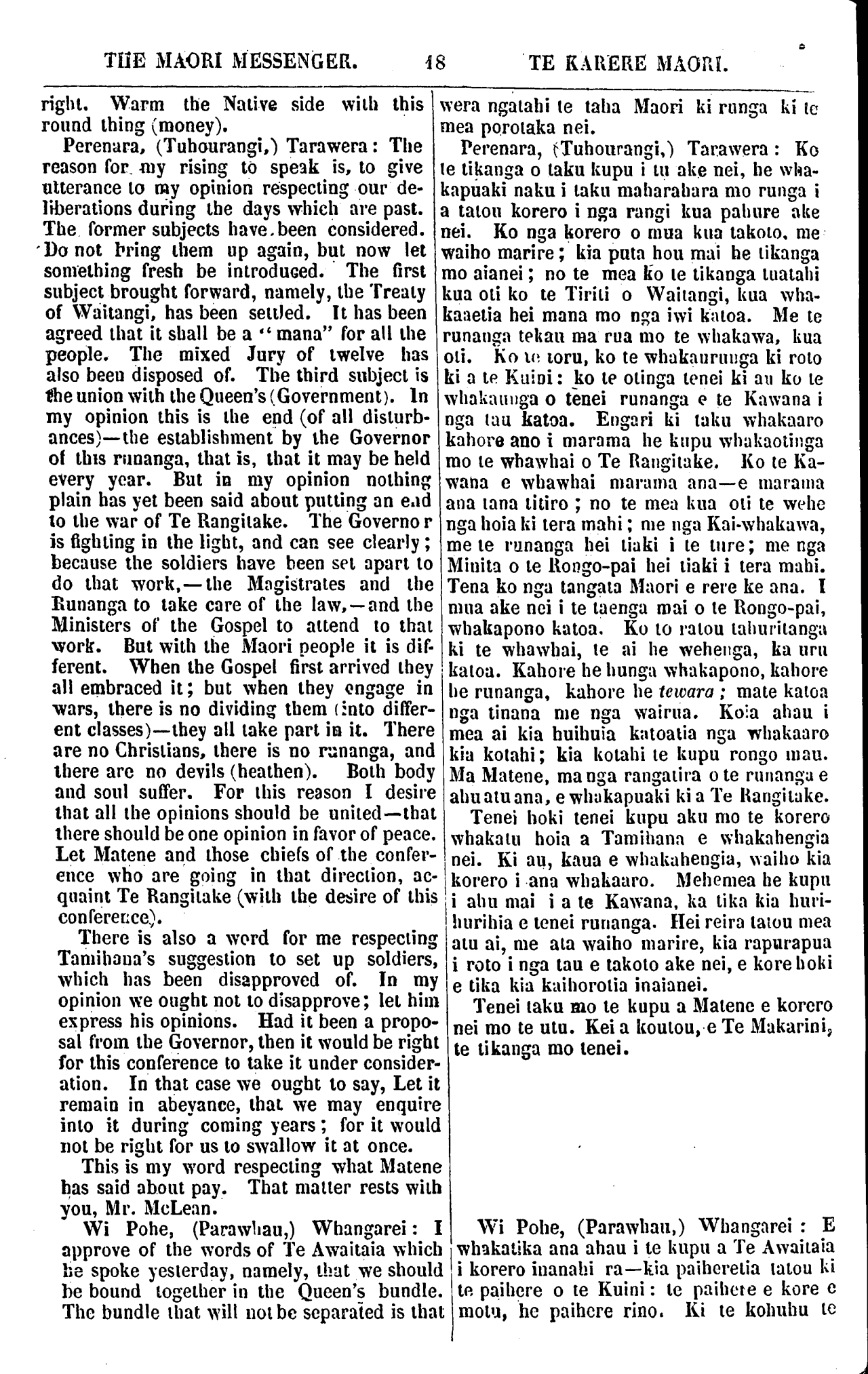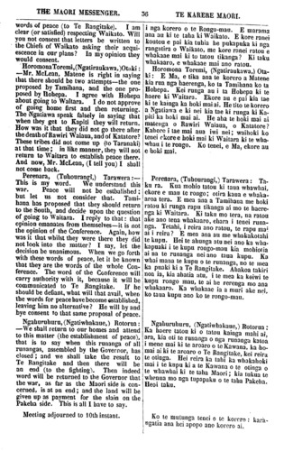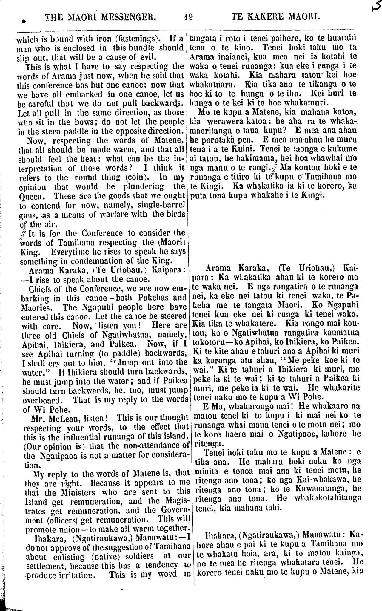 THE MAORI MESSENGER. TE KARERE MAORI. These are Ihe benefits which you are confer- ring on us: the Maories are being ordained ministers. My willingness (to be a minister) is in my heart. But my fear is that should 1 con- sent, it might not bo long after before I had turned back (to my former ways). That subject is ended. I shall not be strong (to speak) now about Ihe fighting which is going on yonder. If the evil rested with me (i. e. with my tribe) alone, then I might speak. I, that is Ngatiawa, commenced it, then Ngatiruanui and Taranaki joined in it, and now Waikato also is implicated. If the evil rested with me alone, then I might endea- voured to do something: had Ngatiawa alone been concerned, then I should have spoken with power. I have no influence in this matter. The evil will spread, and perhaps other tribes will become concerned in it. My evil will cause the death of men; perhaps even the men (soldiers) of Port Jackson will die from this evil. It is a waste that men's lives should be lost in this war. The right kind of death is that arising from natural causes. This death (in war) is had for both Maories and Pakehas, I feel regard for those tribes who are living in ignorance. I feel regard for the Pakehas also. Why should they die because of my evil? Therefore I say, let us do our work well; let us be careful in laying down plans for our guidance. Let us have a good canoe in which to sail, that we may enjoy these good things. When we see anything good we desire it at once. In former times a gun was considered a great treasure; but when guns became plentiful the people became careless about them. In like manner will it be with the King, movement); before long i I will be abandoned. Hori Winiata, (Ngapuhi,) Kaipara: Here we are standing under the laws of the Queen. My sin is not of today—you know all about it. 1 asked myself, How shall I secure an entrance into the laws of the Queen? When I had considered, I parted with my land (to the Government) so that 1 might enter. For I am acquainted with the system of the (military) officers. The captains and the colonels pay for their admission to the work of soldiers. The Treaty of Waitangi is good. The pood things of this Island sprang from them. Had it not been for that Treaty, (our island) would have been taken by another nation. Ngapuhi said, Our land will be taken by the French; give us a Governor to protect this Island. When he was stationed here, then the color [flag-staff] was erected at Maiki [in the Bay of Islands], Some low-bred Pakehas deceived us, and the flag-staff was cut down. But now the sin of Ngapuhi is at an end. 1 have nothing more to say. Hohaia Pokaitara, (Ngatitoa,) Porirua: Our Rood-will leads us to say, Take us to Taranaki. I belong to the smallest tribe; it was the sword that thinned us. That was the reason of our Ko nga painga enei e tukua mai ana e koutou, koia nei ko tangata Maori e wha- kaminitatia ana. Tenei taku whakaaetanga kei roto i au. He tupato noku ki toku wha- kaaetanga ki te Rongo-pai, kihai i roa te whakaaetanga kua hoki whakamuri. Heoti tena. E kore au e kaha inaianei mo te ritenga o te pakanga e mahi mai nei. Mehemea i au anake te he ka puta taku kupu. Naku, na Ngatiawa, i timata, uru ana a Ngatiruanui, a Taranaki, ko tenei kua uru hoki, Waikato ki roto. Mehemea i au anake te he ka puta he koha maku, me i Ngatiawa anake kua kaha ahau. E kore au e kaha ki tena he. Ka tupu ano taua he me te ura ano pea o etahi iwi ki roto ki taua he. Ma taku he te ta- ngata e mate ai, me nga tangata pea o Poi- hakena ka mate ano i tenei he. - Maumau te tangata kia male ki runga ki tenei pakanga; tena ano te matenga pai, ko te mate turoro. He mate kino tenei mo te Maori mo te Pa- keha. E aroha ana au ki nga iwi e noho kuware ana. E aroha ana ahau ki nga Pa- keha. He aha kia male ratou ki runga ki toku he? Koia au i mea ai kia pai ta tatou mahi, kia pai te whakatakoto tikanga ma ta- tou. Kia pai te waka kia uru tatou ki enei mea Uka. Ka kite tatou i te mea pai, minamina tonu atu. He taonga nui te pu i mua, ka tini ha- ere te pu, ka ngoikore te whakaaro ki tena taonga; me tenei hoki, me te Kingi, e kore ano e roa ka mahue. Hori Winiata, (Ngapuhi,) Kaipara:— Tenei tatou te tu nei i roto i te ture o te Kuini. E hara inaianei tuku hara, kua matau koe. Kua mea ahau me pehea taku tapokotanga ki roto ki te ture o te Kuini, ka whakaaro ahau, hoatu ana e ahau taku whenua hei whakatapokoranga moku. E mohio ana ho- ki ahau ki te tikanga o te apiha; he mea utu e nga kapetana. e nga kanara, to ratou tapokotanga ki te mahi hoia. E tika ana te Tiriti ki Waitangi; na kona i tupu ai te pai ki tenei motu. Me i kore taua Tiriti kua riro i te iwi ke. Ka wha- kaaro Ngapuhi, Meake riro te whenua e te Mariao: homai he Kawana hei tiaki mo te- nei motu. Ka noho ia, ka tu te kara ki Maiki; tinihangatia ana matou e te Pakeha tutua, ka hinga taua kara. Ko tenei, kua mutu te hara o Ngapuhi. Heoi ano taku kupu. Hohaia Pokaitara, (Ngatitoa,) Porirua: Na to matou aroha tenei kupu, me kawe ma- tou ki Taranaki. Ko au te iwi iti, na te ho- ari au i whakaiti: no reira ka noho matou