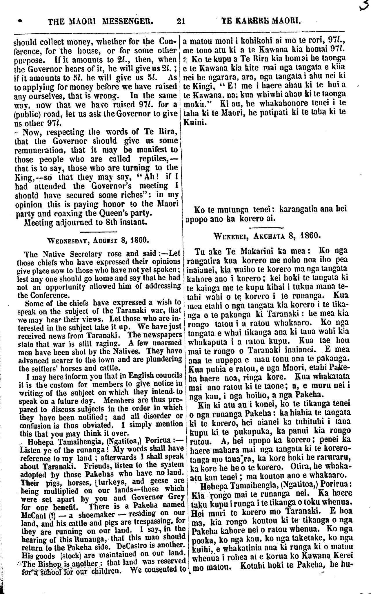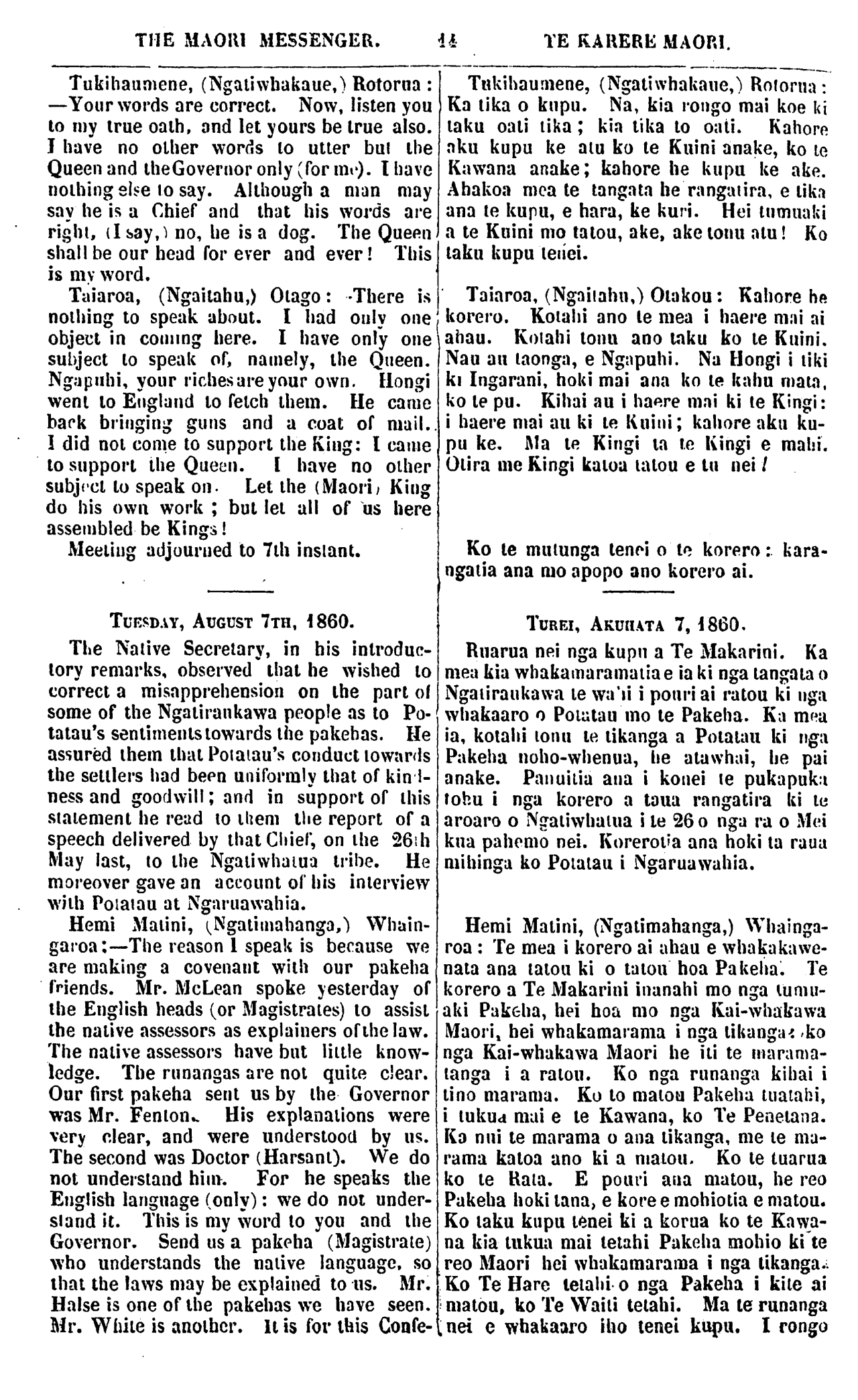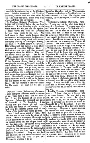 THE MAORI MESSENGER. TE KARERE MAORI. Tukihaumene, (Ngatiwhakaue,) Rotoroa: —Your words are correct. Now, listen you to my true oath, and let yours be true also. I have no other words to utter but the Queen and the Governor only (for me). I have nothing else to say. Although a man may say he is a Chief and that his words are right, (I say,) no, he is a dog. The Queen shall be our head for ever and ever! This is my word. Taiaroa, (Ngaitahu,) Otago: There is nothing to speak about. I had only one object in coming here. I have only one subject to speak of, namely, Ihe Queen. Ngapuhi, your riches are your own. Hongi went to England to fetch them. He came back bringing guns and a coat of mail. I did not come to support the King: I came to support the Queen. I have no other subject to speak on. Let the (Maori King do his own work; but let all of us here assembled be Kings! Meeting adjourned to 7th instant. TUESDAY, AUGUST 7TH, 1860. The Native Secretary, in his introduc- tory remarks, observed that he wished to correct a misapprehension on the part of some of the Ngatiraukawa people as to Po- tatau's sentiments towards the pakehas. He assured them that Potatau's conduct towards the settlers had been uniformly that of kind- ness and goodwill; and in support of this statement he read to them the report of a speech delivered by that Chief, on the 26th May last, to Ihe Ngatiwhatua tribe. He moreover gave an account of his interview with Potatau at Ngaruawahia. Hemi Matini, (Ngatimahanga,) Whain- garoa:—The reason 1 speak is because we are making a covenant with our pakeha friends. Mr. McLean spoke yesterday of the English heads (or Magistrates) to assist the native assessors as explainers of the law. The native assessors have but little know- ledge. The runangas are not quite clear. Our first pakeha sent us by the Governor was Mr. Fenton. His explanations were very clear, and were understood by us. The second was Doctor (Harsant). We do not understand him. For he speaks the English language (only): we do not under- stand it. This is my word to you and the Governor. Send us a pakeha (Magistrate) who understands the native language, so that the laws may be explained to us. Mr. Halse is one of the pakehas we have seen. Mr. White is another. lt is for this Confe- Tukihaumene, (Ngatiwhakaue,) Rotorua: Ka tika o kupu. Na, kia rongo mai koe ki taku oati tika; kia tika to oati. Kahore aku kupu ke atu ko te Kuini anake, ko te Kawana anake; kahore he kupu ke ake. Ahakoa mea te tangata he rangatira, e tika ana te kupu, e hara, ke kuri. Hei tumuaki a te Kuini mo tatou, ake, ake tonu atu! Ko taku kupu tenei. Taiaroa, (Ngatiahu,) Otakou: Kahore he korero. Kotahi ano te mea i haere mai ai ahau. Kotahi tonu ano taku ko te Kuini. Nau au taonga, e Ngapuhi. Na Hongi i tiki ki Ingarani, hoki mai ana ko te kahu mata, ko te pu. Kihai au i haere mai ki te Kingi: i haere mai au ki te Kuini; kahore aku ku- pu ke. Ma te Kingi ta te Kingi e mahi. Otira me Kingi katoa tatou e tu nei Ko te mutunga tenei o te korero: kara- ngatia ana mo apopo ano korero ai. TUREI, AKUHATA 7, 1860. Ruarua nei nga kupu a Te Makarini. Ka mea kia whakamaramatia ia ki nga tangata o Ngatiraukawa te wahi i pouri ai ratou ki nga whakaaro o Potatau mo te Pakeha. Ka mea ia, kotahi tonu te tikanga a Potatau ki nga Pakeha noho-whenua, he atawhai, he pai anake. Panuitia ana i konei te pukapuka tohu i nga korero a taua rangatira ki te aroaro o Ngatiwhatua i Ie 26 o nga ra o Mei kua pahemo nei. Korerotia ana hoki ta raua mihinga ko Potatau i Ngaruawahia. Hemi Matini, (Ngatimahanga,) Whainga- roa: Te mea i korero ai ahau e whakakawe- nata ana tatou ki o tatou hoa Pakeha. Te korero a Te Makarini inanahi mo nga tumu- aki Pakeha, hei hoa mo nga Kai-whakawa Maori, hei whakamarama i nga tikanga ko nga Kai-whakawa Maori he iti te marama- tanga i a ratou. Ko nga runanga kihai i tino marama. Ko to matou Pakeha tuatahi, i tukua mai e te Kawana, ko Te Penetana. Ka nui te marama o ana tikanga, me te ma- rama katoa ano ki a matou. Ko te tuarua ko te Rata. E pouri ana matou, he reo Pakeha hoki tana, e kore e mohiotia e matou. Ko taku kupu tenei ki a korua ko te Kawa- na kia tukua mai tetahi Pakeha mohio ki te reo Maori hei whakamarama i nga tikanga. Ko Te Hare tetahi o nga Pakeha i kite ai matou, ko Te Waiti tetahi. Ma te runanga nei e whakaaro iho tenei kupu. I rongo
