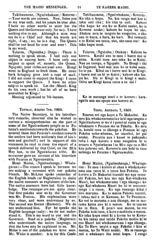 THE MAORI MESSENGER. TE KARERE MAORI. settling at Kapiti, and thus were saved, the Ngatitoa, the Ngatiawa, and Ihe Ngatiraukawa. These three tribes are now bound together as in one bundle. And now that sickness is further reducing our tribe, we begin to think that we shall find another Kapiti [i. e. a refuge] under the shadow of the Queen. Wiremu Tamihana has said that he feels con- cern for the Pakehas who are dying at Waitara. But, Mr. McLean, take me to Waitara that 1 may say to this tribe and to that tribe," Return to your place and die there [in peace]." Ridicule is a bad thing. Do not let us indulge in ridicule lest this Conference be called " Taunu." I dis- approve of [the conduct of] the Maori. He speaks good words while his thoughts take a different course. When a man is Maori [in his habits] he will be called a Maori; his skin and his thoughts are alike dark. Now that we are united to the Pakehas let us be altogether while. All of us assembled here are chiefs. When we see that the views of any one chief are clear, let us all adopt them. This is my word to you, Mr. McLean, Let me—that is, the Ngatitoa be taken to Taranaki. Te Rira Porutu, (Ngatiawa,) Wellington: —I have no views to express. Those subjects are disposed of. I have only one matter to speak of, and that is to find fault with my own tribe. They are wrong in two respects, namely, in withholding the land and in shooting Pakehas. 1 will repeat the names of the Chiefs of my tribe. How was it that Wi Taupunga and his brother Hare did not consider that those Pakehas were mere travellers, and therefore allow them to proceed? How was it that Aperahama and Te Kohu did not say, Do not kill the Pakehas who are merely travelling on their own business: why do you not go and light with the soldiers? How was it that Herora and his son Hoani Koi- naki did not say, Do not kill Pakehas who are proceeding on their own business? My words now shall refer to Kairoa. How was it that Korotiwha did not instruct his people to leave the Pakeha children to go unharmed? Now about Pukerangiora. How was it that the Chief of that settlement did not give instructions that the Pakehas who were proceeding on their own business should not be killed? Te Awaitaia, listen! I made two charges: that they with- held the land, and that they killed Pakehas; for these Pakehas were not killed in fair fight. Those whom 1 have named are the Chiefs. My words of disapproval have gone forth: you have heard them. Have I not made two (charges)? Then do not say that I do not blame my tribe. Why do not you and the Governor consider that it was hunger which took the Pakehas to Tar- naki? The Governor and Mr. McLean lifted up guns ia the sight of the Maories, and evil arose. The evil of the Maories is very great. When the fish of the sea are drawn to the shore in a seine they do not all perish—some escape. When I was subdued by Te Awaitaia, 1 did not perish, for here we are speaking (face to face). Enough on that subject. ki Kapiti, ka tahi ka ora enei iwi, a Ngatitoa, a Ngatiawa, a Ngatiraukawa. Kotahi tonu te paihere o aua iwi etoru. Ko tenei hoki, na te mate kongenge au i whakaiti. Ka tahi matou ka whakaaro, tenei ano te Kapiti kei te maru o te Kuini. E mea ana a Wiremu Tamihana ka aroha ia ki nga Pakeha ka male i Waitara. E Ma, erangi me kawe au ki Waitara, kia ki atu au, E tena iwi. hoki atu koe ki to kainga mate ai, e tena iwi hoki atu koe ki to kainga male ai. He taunu te mea ki- no; kaua e taunutia kei meinga te hui nei ko Taunu. E whakahe ana au ki te tangata Maori, e hoatu ana ko nga kupu papai, ko nga whakaaro e tangi ke ana. E Maori ana te tangata ka kiia he Maori, e pango ana te kiri, e pango ana nga whakaaro. Ka apititia nei tatou ki te Pakeha kia ma ano hoki tatou katoa. He rangatira katoa tatou e noho nei; ka kitea kua tika te whakaaro o tetahi rangatira, me whai tonu atu tatou ki tera. Ko taku kupu ra tenei ki a koe, e Ma, me kawe au, a Ngatitoa, ki Taranaki. Te Rira Porutu, (Ngatiawa,) Poneke: Kahore aku whakaaro. Ku apau ena korero. Kotahi taku korero ko te whakahe i taku iwi. Ka rua o ratou he, ko te pupuru i te whenua, ko te pupuhi i te Pakeha. Ka tatau ahau i nga rangatira o taku iwi. He aha ra a Wi Taupunga raua ko tona taina, ko Hare, to whakaaro ai ki nga Pakeha e haere noa ana, ka waiho kia haere noa ana? He aha ra a Aperahama raua ko te Kohu te korero ai, Kaua e patua nga Pakeha e haere noa ana, te haere ki nga hoia wha- whai ai? He aha ra a Herora raua ko tana tamaiti, ko Hoani Koinaki, te mea ai, Kaua e patua nga Pakeha e haere noa ana? Na, ka eke tuku kupu ki Kairoa. He aha ra a Korotiwha te ako ai i ana tangata kia waiho nga tamariki a nga Pakeha kia haere noa ana? Ka tae kei Pukerangiora. He aha ra te rangatira o tena kainga te ako ai kia kaua e patua nga Pakeha e haere noa ana? E Te Awaitaia, kia rongo mai koe. E rua aku kupu. Ko te pupuri i te whenua, ko te patu i nga Pakeha; kahore hoki i patua ki runga ki te riri. Ko nga rangatira ena kua tatau- ria na e ahau. Kua puta taku whakahe. Kua rongo koe. Ka rua. ne? Kei mea koe kahore au. i te whakahe i toku iwi. He aha korua ko Kawana te whakaaro ai na te hiakai nga Pakeha i kawe ki Taranaki. Wha- kaari ana a Kawana raua ko te Ma- karini i nga pu ki runga ki nga kanohi o nga Maori, ka tupu te he. Ka nui hoki te he o te Maori. Ina hoki haoa te ika ! o te moana e kore e mate katoa ki tahaki, ka ora etahi. Na, pama au e Te Awaitaia, kahore au i mate, e korero nei ma-
