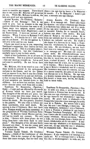 THE MAORI MESSENGER. 16 TE KARERE MAORI. be even. This is an approach on our pan to the Pakehas. This is the foundation of ail knowledge. Let us go under the shadow of the Queen. Let us enter into a mutual covenant, with the Pakeha. It is not that we shall derive any great benefit, but our children who come after us will. Let this covenant be made firm. The Governor has expressed the loving words of the Queen to the Native Chiefs of New Zealand. Let us also turn and adopt the laws of the Queen, that we may have but one shadow to protect both the Pakeha and the Maori that the people of this Island may prosper. Matene Te Whiwhi, (Ngatitoa.) Otaki: Chiefs of the Conference, I have no other word. 1 have said all I have to say to you. My words do not run to and fro: (they express) nothing else than the acceptance of Ihe Queen's authority. But with this tribe, and with that tribe, are their own thoughts. We know with the first Gover- nor there was no other word, even up to this lime there was but one word; that there should be but one law, and that both races should be united. The authority of the Queen rests upon us. Let us cleave to the good and to the clear customs of the Pakeha. Here also is a word of mine: do not be grieved Mr. McLean. Let the warmth rest upon the Maori, as it does upon the Pakeha. [Meaning that the members of the Confer- ence should receive pay.] Paora Tuhaere, (Ngatiwhatua,) Orakei I speak respecting the curse of the Pakeha. If I am cursed it will do me no harm. If a Pakeha strikes me with his fist and my nose bleeds, I shall not strike him in return, but will hold him, and give him up to be tried. I agree with what Matene has said res- pecting the warmth (pay). This is my word respecting the Com- missioners of land, also for the Assessors. Let them be selected by this runanga. Let them be appointed by us. Let us not leave that for the Governor to do ; let him simply give his approval. Let us also seek a Pakeha as a superintendent. The Pakeha I should like is Mr. McLean, because I have not yet seen any fault in him. The fault is in the surveyors and purchasers. FormerIy I set my people the example of ploughing. They "all look to ploughing; after that I look a cart as an example to my people; they soon got carts. Now I have (started) a store as a pattern to my people. For this reason I now request that some of the Queen's goods may be placed in my tika ai te wai ki te takere. He whakatatanga tenei na tatou ki te Pakeha, ko te putake tenei o te mahi tohunga. Whakatomokia tatou ki te maru o te Kuini, Whakakotahitia te Kawenata ki te Pakeha. Ehara hoki i te tino mea ma tatou, otiia mo a tatou tamariki i muri i a tatou. Me whakamau tenei kawe- nata. Kua whakapuakina e te Kawana nga kupu aroha a te Kuini ki nga rangatira Maori o Niu Tirani, me tahuri atu hoki tatou ki te mahi i nga Ture o te Kuini, kia kotahi maru hei tiaki i nga Pakeha i nga tangata Maori, kia tupu haere ai nga tangata o te motu nei. Matene Te Whiwhi. (Ngatitoa,) Otaki: E te runanga nei! Kahore be kupu ke maku, kua oti atu ki a koutou. Kahore he kupu kopikopiko. Heoi ano, ko te tomokanga ki te maru o te Kuini, otiia kei tenei iwi ano tona whakaaro, kei tenei ano tona wha- kaaro. E mohio ano hoki tatou i te Kawana tuatahi, kahore he kupu ke atu, a taea noatia tenei ra. Heoi ano te kupu, kia kotahi ture kia apitiria nga iwi e rua kia kotahi. E tau ana hoki te mana o te Kuini ki runga ki a tatou, kia piri tatou ki nga tikanga marama, tikanga pai a te Pakeha. Tenei hoki tenei kupu aku. Kei pouri mai koe e Ma. Kia tukua te mahanatanga ki punga ki te Maori, kia rite ki to te Pakeha. Paora Tuhaere, (Ngatiwhatua,) Orakei: Taku- mo te kanga o te Pakeha. E kore au e mate ina kanga mai. Ki te moto mai tetahi Pakeha i au, toto ana taku ihu, e kore au e tahuri atu ki te moto i a ia, erangi me pupuru e ahau, me tuku ki te whaka- wakanga. E whakaae ana ahau ki runga ki te kupu a Matene mo te whakamahatanga. Ko taku kupu tenei mo nga kai-whakarite whenua, mo nga Kai-whakawa, kia tirohia i roto i te runanga nei. Ma tatou e wha- katu, kei mea tatou ma te Kawana, engari hei whakaae kau mana. Me rapu ano hoki e tatou tetahi Pakeha hei kai-titiro. Ko taku e pai nei ko Te Makarini, ta te mea kahore ano ahau i kite noa i tona he. Ko te he kei nga kai-ruri kei nga kai-hoko hoki. I mua, naku i whakaako toku iwi ki te mahi parau, ka tango nga tangata katoa i te parau. Muri iho ko te kaata hei whakaako i toku iwi, muri iho ka tangohia e ratou te kaata. I tenei he toa, he whakaako ano naku i toku iwi. Koia au ka tono atu nei i etahi taonga o te Kuini kia tukua mai ki roto