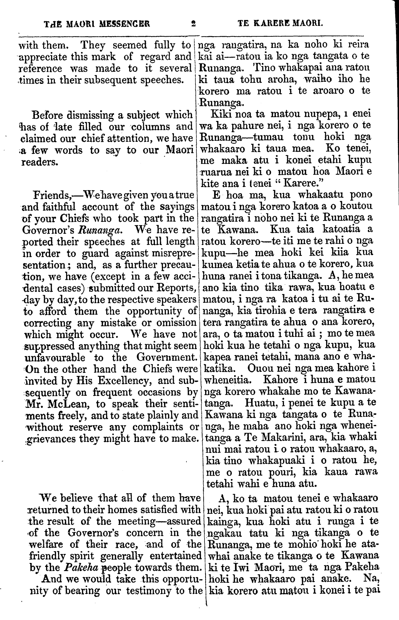 THE MAORI MESSENGER 2 TE KARERE MAORI. with them. They seemed fully to appreciate this mark of regard and reference was made to it several times in their subsequent speeches. Before dismissing a subject which has of late filled our columns and claimed our chief attention, we have a few words to say to our Maori readers. Friends,—We have given you a true and faithful account of the sayings of your Chiefs who took part in the Governor's Runanga. We have re- ported their speeches at full length in order to guard against misrepre- sentation; and, as a further precau- tion, we have (except in a few acci- dental cases) submitted our Reports, day by day, to the respective speakers to afford them the opportunity of correcting any mistake or omission which might occur. We have not suppressed anything that might seem unfavourable to the Government. On the other hand the Chiefs were invited by His Excellency, and sub- sequently on frequent occasions by Mr. McLean, to speak their senti- ments freely, and to state plainly and without reserve any complaints or grievances they might have to make. We believe that all of them have returned to their homes satisfied with the result of the meeting—assured of the Governor's concern in the welfare of their race, and of the friendly spirit generally entertained by the Pakeha people towards them. And we would take this opportu- nity of bearing our testimony to the nga rangatira, na ka noho ki reira kai ai—ratou ia ko nga tangata o te Runanga. Tino whakapai ana ratou ki taua tohu aroha, waiho iho he korero ma ratou i te aroaro o te Runanga. Kiki noa ta matou nupepa, i enei wa ka pahure nei, i nga korero o te Runanga—tumau tonu hoki nga whakaaro ki taua mea. Ko tenei, me maka atu i konei etahi kupu ruarua nei ki o matou hoa Maori e kite ana i tenei " Karere." E hoa ma, kua whakaatu pono matou i nga korero katoa a o koutou rangatira i noho nei ki te Runanga a te Kawana. Kua taia katoatia a ratou korero—te iti me te rahi o nga kupu—he mea hoki kei kiia kua kumea ketia te ahua o te korero, kua huna ranei i tona tikanga. A, he mea ano kia tino tika rawa, kua hoatu e matou, i nga ra katoa i tu ai te Ru- nanga, kia tirohia e tera rangatira e tera rangatira te ahua o ana korero, ara, o ta matou i tuhi ai; mo te mea hoki kua he tetahi o nga kupu, kua kapea ranei tetahi, mana ano e wha- katika. Ouou nei nga mea kahore i wheneitia. Kahore i huna e matou nga korero whakahe mo te Kawana- tanga. Huatu, i penei te kupu a te Kawana ki nga tangata o te Runa- nga, he maha ano hoki nga whenei- tanga a Te Makarini, ara, kia whaki nui mai ratou i o ratou whakaaro, a, kia tino whakapuaki i o ratou he, me o ratou pouri, kia kaua rawa tetahi wahi e huna atu. A, ko ta matou tenei e whakaaro nei, kua hoki pai atu ratou ki o ratou kainga, kua hoki atu i runga i te ngakau tatu ki nga tikanga o te Runanga, me te mohio hoki he ata- whai anake te tikanga o te Kawana ki te Iwi Maori, me ta nga Pakeha hoki he whakaaro pai anake. Na, kia korero atu matou i konei i te pai