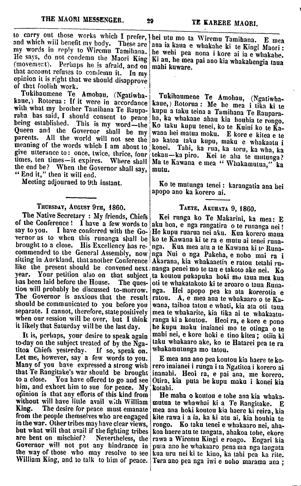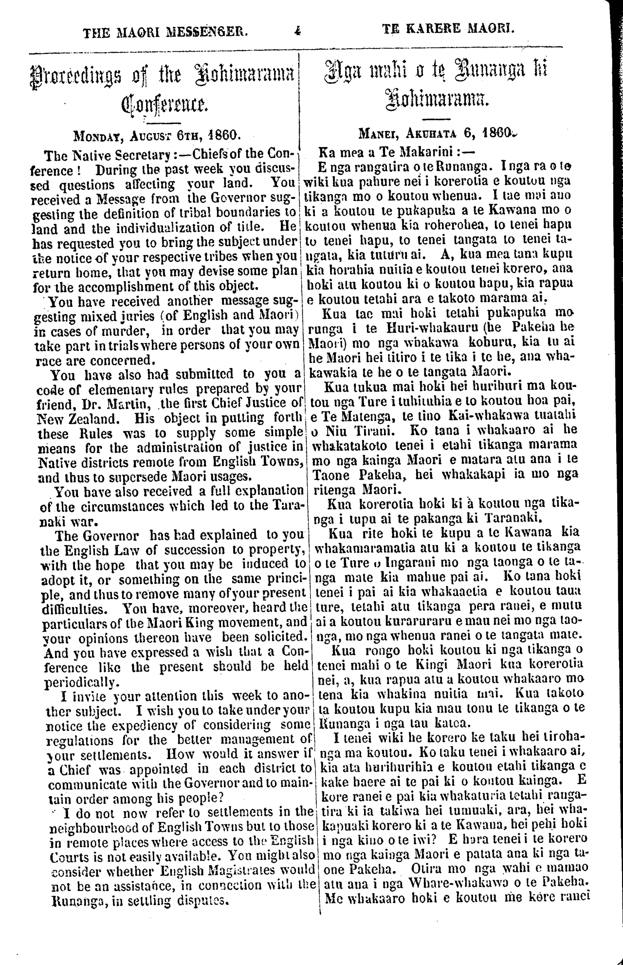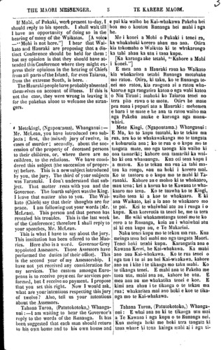 THE MAORI MESSENGER. 4 TE KARERE MAORI. Proceedings of the Kohimarama Conference. MONDAY, AUGUST 6TH, 1860. The Native Secretary: Chiefs of the Con- ference! During the past week you discus- sed questions affecting your land. You received a Message from the Governor sug- gesting the definition of tribal boundaries to land and the individualization of title. He has requested you to bring the subject under the notice of your respective tribes when you return home, that you may devise some plan for the accomplishment of this object. You have received another message sug- gesting mixed juries (of English and Maori) in cases of murder, in order that you may take part in trials where persons of your own race are concerned. You have also had submitted to you a code of elementary rules prepared by your friend, Dr. Martin, the first Chief Justice of New Zealand. His object in pulling forth these Rules was to supply some simple means for the administration of justice in Native districts remote from English Towns, and thus to supersede Maori usages. You have also received a full explanation of the circumstances which led to the Tara- naki war. The Governor has had explained to you the English Law of succession to property, with the hope that you may be induced to adopt it, or something on the same princi- ple, and thus to remove many of your present difficulties. Yon have, moreover, heard the particulars of the Maori King movement, and your opinions thereon have been solicited. And you have expressed a wish that a Con- ference like the present should be held periodically. I invite your attention this week to ano- ther subject. I wish you to take under your notice the expediency of considering some regulations for the better management of your settlements. How would it answer if a Chief was appointed in each district to communicate with the Governor and to main- tain order among his people? I do not now refer to settlements in the neighbourhood of English Towns but to those in remote places where access to the English Courts is not easily available. Yon might also consider whether English Magistrates would not be an assistance, in connection with the Runanga, in settling disputes. Nga mahi o te Runanga ki Kohimarama. MANEI, AKUHATA 6, 1860 Ka mea a Te Makarini:— E nga rangatira o te Runanga I nga ra o te wiki kua pahure nei i korerotia e koutou nga tikanga mo o koutou whenua. I tae mai ano ki a koutou te pukapuka a te Kawana mo o koutou whenua kia roherohea, to tenei hapu tu tenei hapu, to tenei tangata to tenei ta- ngata, kia tuturu ai. A, kua mea tana kupu kia horahia nuitia e koutou tenei korero, ana hoki atu koutou ki o koutou hapu, kia rapua e komou tetahi ara e takoto marama ai. Kua lac mai hoki tetahi pukapuka mo runga i te Huri-whakauru (he Pakeha he Maori) mo nga whakawa kohuru, kia tu ai he Maori hei titiro i te tika i te he, ana wha- kawakia te he o te tangata Maori. Kua tukua mai hoki hei hurihuri ma kou- tou nga Ture i tuhituhia e to koutou hoa pai, e Te Matenga, te tino Kai-whakawa tuatahi o Niu Tirani. Ko tana i whakaaro ai he whakatakoto tenei i etahi tikanga marama mo nga kainga Maori e matara atu ana i te Taone Pakeha, hei whakakapi ia mo nga ritenga Maori. Kua korerotia hoki ki a koutou nga tika- nga i tupu ai te pakanga ki Taranaki. Kua rite hoki te kupu a te Kawana kia whakamaramatia atu ki a koutou te tikanga o te Ture o Ingarani mo nga taonga o te ta- nga mate kia mahue pai ai. Ko tana hoki tenei i pai ai kia whakaaetia e koutou taua ture, tetahi atu tikanga pera ranei, e mutu ai a koutou kuraruraru e mau nei mo nga tao- nga, mo nga whenua ranei o te tangata mate. Kua rongo hoki koutou ki nga tikanga o tenei mahi o te Kingi Maori kua korerotia nei, a, kua rapua atu a koutou whakaaro mo tena kia whakina nuitia mai. Kua takoto ta koutou kupu kia mau tonu te tikanga o te Runanga i nga tau katoa. I tenei wiki he korero ke taku hei tiroha- nga ma koutou. Ko taku tenei i whakaaro ai, kia ata hurihurihia e koutou etahi tikanga e kake haere ai te pai ki o koutou kainga. E kore ranei e pai kiu whakaturia tetahi ranga- tira ki ia takiwa hei tumuaki, ara, hei wha- kapuaki korero ki a te Kawana, hei pehi hoki i nga kino o te iwi? E hara tenei i te korero mo nga kainga Maori e patata ana ki nga ta- one Pakeha. Otira mo nga wahi e mamao atu ana i nga Whare-whakawa o te Pakeha. Me whakaaro hoki e koutou me kore ranei