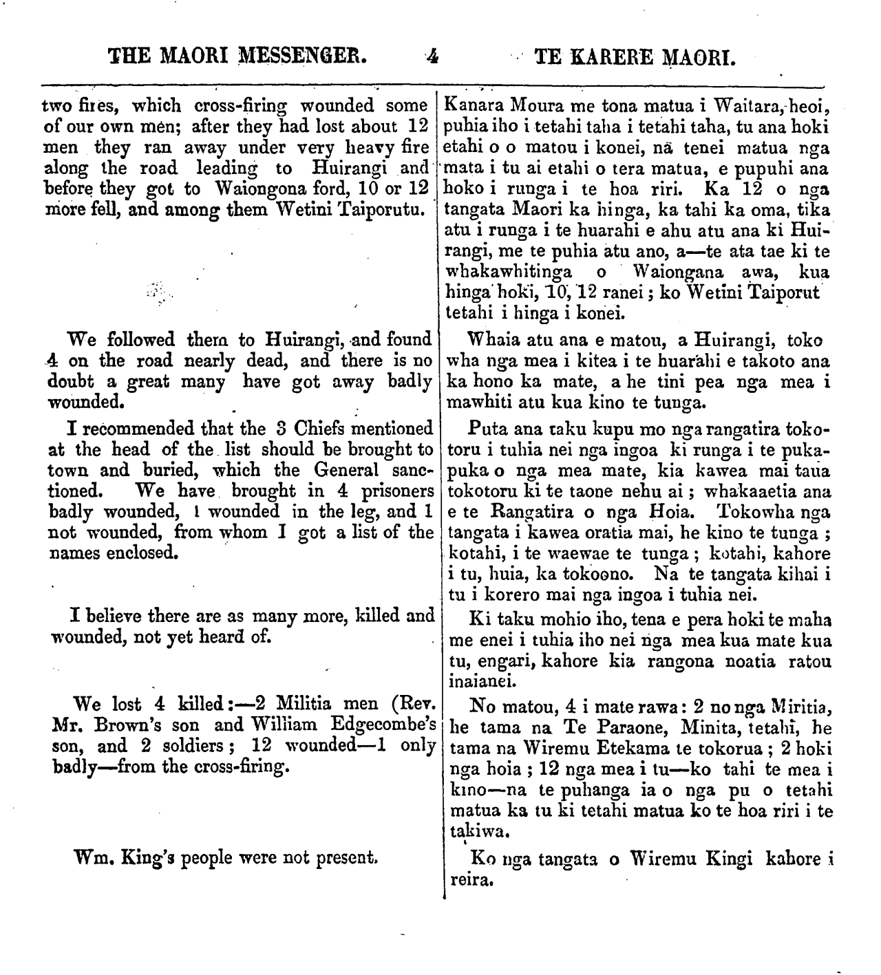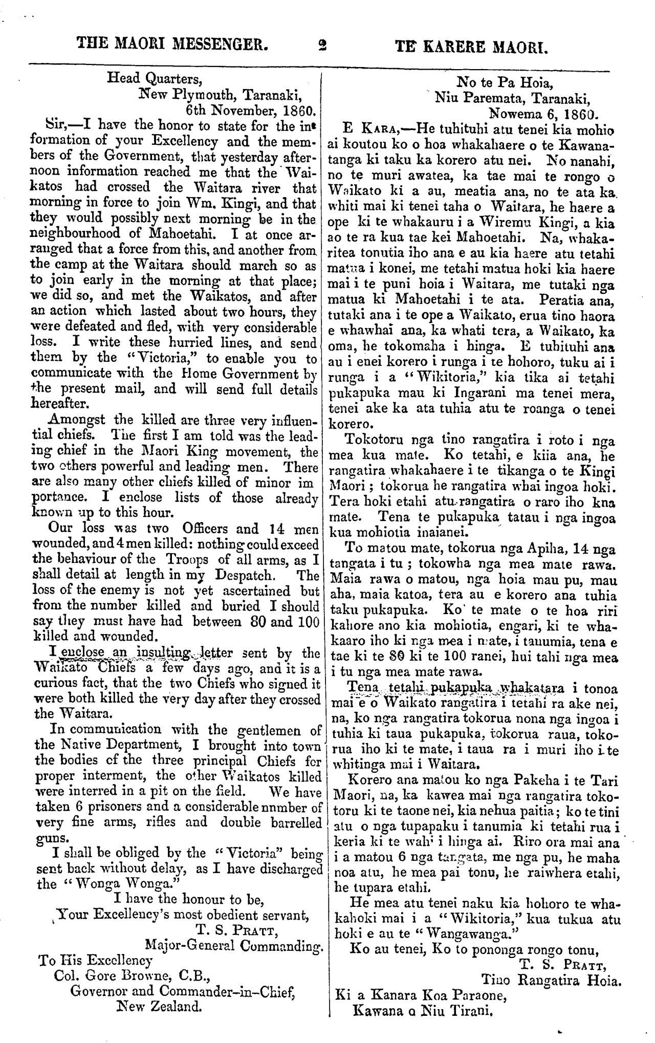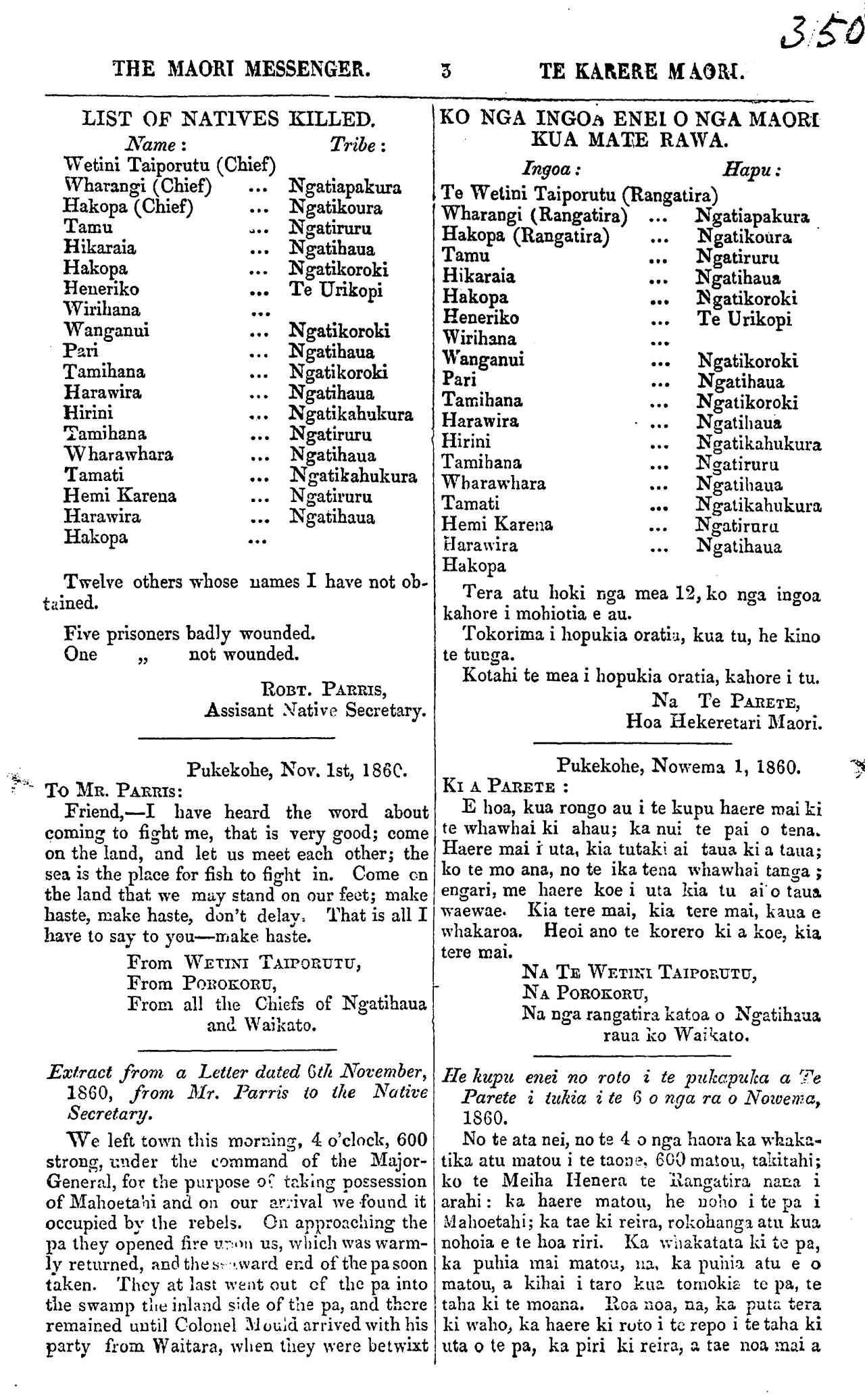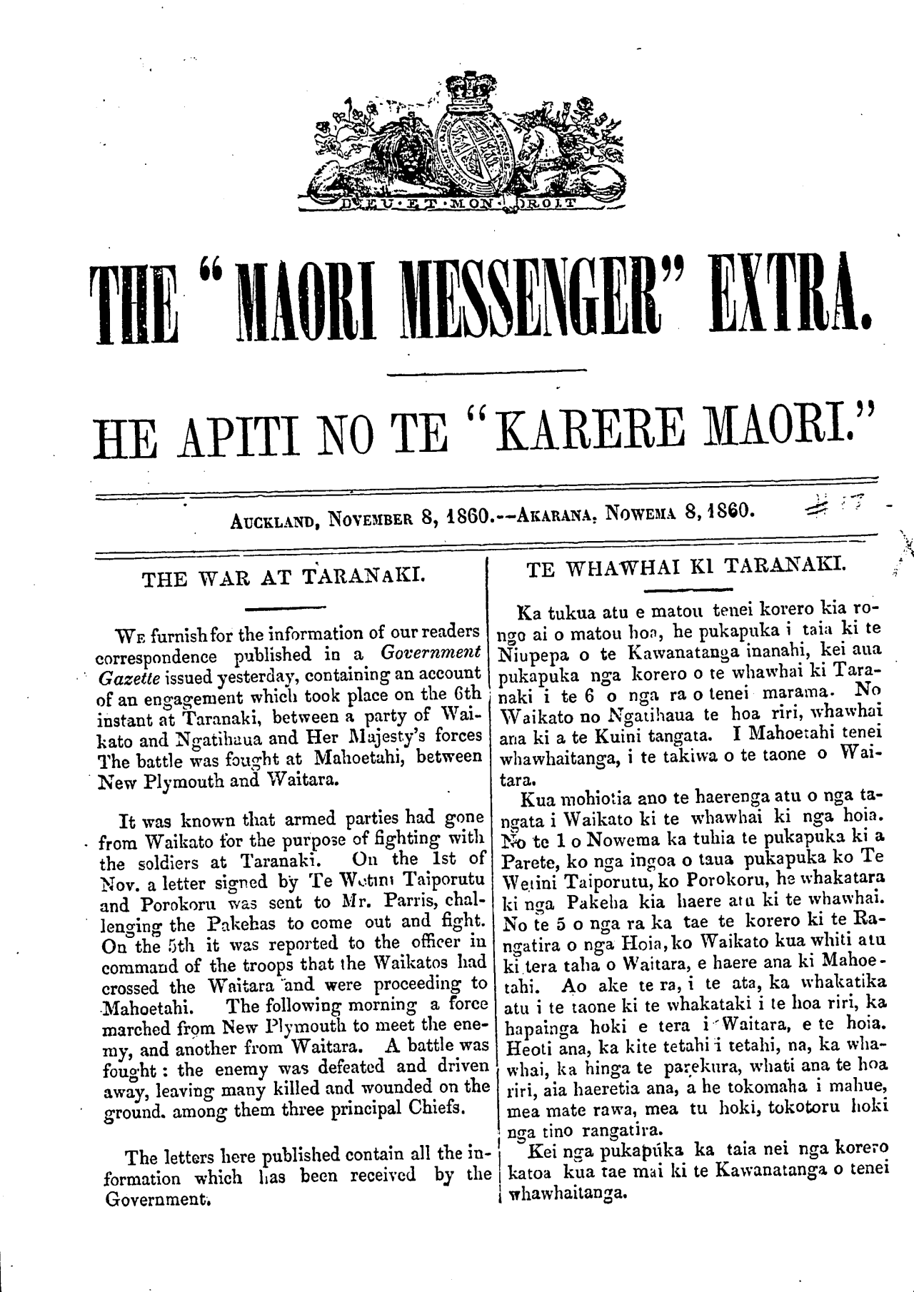 THE "MAORI MESSENGER". EXTRA. HE APITI NO TE "KARERE MAORI." AUCKLAND, NOVEMBER 8, 1860.—AKARANA. NOWEMA 8, 1860. THE WAR AT TARANAKI. WE furnish for the information of our readers correspondence published in a Government Gazette issued yesterday, containing an account of an engagement which took place on the 6th instant at Taranaki, between a party of Wai- kato and Ngatihaua and Her Majesty's forces The battle was fought at Mahoetahi, between New Plymouth and Waitara. It was known that armed parties had gone from Waikato tor the purpose of fighting with the soldiers at Taranaki. On the 1st of Nov. a letter signed by Te Wetini Taiporutu and Porokoru was sent to Mr. Parris, chal- lenging the Pakehas to come out and fight. On the 5th it was reported to the officer in command of the troops that the Waikatos had crossed the Waitara "and were proceeding to Mahoetahi. The following morning a force marched from New Plymouth to meet the ene- my, and another from Waitara. A battle was fought: the enemy was defeated and driven away, leaving many killed and wounded on the ground. among them three principal Chiefs. The letters here published contain all the in- formation which has been received by the Government. TE WHAWHAI KI TARANAKI Ka tukua atu e matou tenei korero kia ro- ngo ai o matou hoa, he pukapuka i taia ki te Niupepa o te Kawanatanga inanahi, kei aua pukapuka nga korero o te whawhai ki Tara- naki i te 6 o nga ra o tenei marama. No Waikato no Ngatihaua te hoa riri, whawhai ana ki a te Kuini tangata. I Mahoetahi tenei whawhaitanga, i te takiwa o te taone o Wai- tara. Kua mohiotia ano te haerenga atu o nga ta- ngata i Waikato ki te whawhai ki nga hoia. No te 1 o Nowema ka tuhia te pukapuka ki a Parete, ko nga ingoa o taua pukapuka ko Te Wetini Taiporutu, ko Porokoru, he whakatara ki nga Pakeha kia haere ata ki te whawhai. No te o o nga ra ka tae te korero ki te Ra- ngatira o nga Hoia, ko Waikato kua wiki ti atu ki tera taha o Waitara, e haere ana ki Mahoe- tahi. Ao ake te ra, i te ata, ka whakatika atu i te taone ki te whakataki i te hoa ri ri, ka hapainga hoki e tera i Waitara, ete hoia. Heoti ana, ka kite tetahi i tetahi, na, ka wha- whai, ka hinga te parekura, whati ana te hoa riri, aia haeretia ana, a he tokomaha i mahue, mea mate rawa, mea tu hoki, tokotoru hoki nga tino rangatira. Kei nga pukapuka ka taia nei nga korero katoa kua tae mai ki te Kawanatanga o tenei whawhaitanga.
