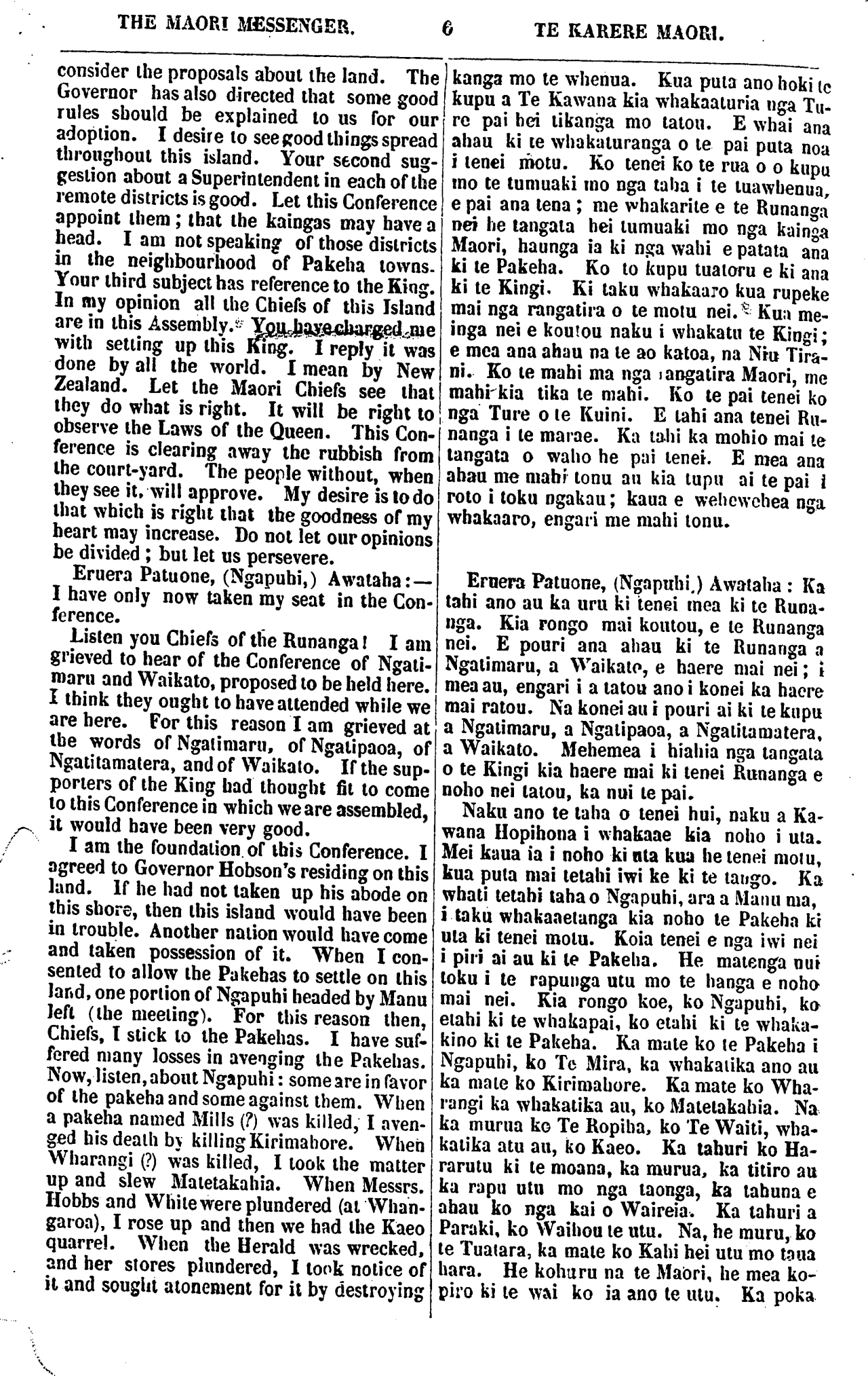 THE MAORI MESSENGER. 6 TE KARERE MAORI. consider the proposals about the land. The Governor has also directed that some good rules should be explained to us for our adoption. I desire to see good things spread throughout this island. Your second sug- gestion about a Superintendent in each of the remote districts is good. Let this Conference appoint them; that the kaingas may have a head. I am not speaking of those districts in the neighbourhood of Pakeha towns. Your third subject has reference to the King. In my opinion all the Chiefs of this Island are in this Assembly. You have charged me with setting up this King. I reply it was done by all the world. I mean by New Zealand. Let the Maori Chiefs see that they do what is right. It will be right to observe the Laws of the Queen. This Con- ference is clearing away the rubbish from the court-yard. The people without, when they see it, will approve. My desire is to do that which is light that the goodness of my heart may increase. Do not let our opinions be divided; but let us persevere. Eruera Patuone, (Ngapuhi,) Awataha: I have only now taken my seat in the Con- ference. Listen you Chiefs of the Runanga! I am grieved to hear of the Conference of Ngati- maru and Waikato, proposed to be held here. I think they ought to have attended while we are here. For this reason I am grieved at the words of Ngatimaru, of Ngatipaoa, of Ngatitamatera, and of Waikato. If the sup- porters of the King had thought fit to come to this Conference in which we are assembled, it would have been very good. I am the foundation of this Conference. I agreed to Governor Hobson's residing on this land. If he had not taken up his abode on this shore, then this island would have been in trouble. Another nation would have come and taken possession of it. When I con- sented to allow the Pakehas to settle on this land, one portion of Ngapuhi headed by Manu left (the meeting). For this reason then, Chiefs, I slick to the Pakehas. I have suf- fered many losses in avenging the Pakehas. Now, listen, about Ngapuhi: some are in favor of the pakeha and some against them. When a pakeha named Mills (?) was killed, I aven- ged his death by killing Kirimahore. When Wharangi (?) was killed, I look the matter up and slew Matetakahia. When Messrs. Hobbs and White were plundered (at Whan- garoa), I rose up and then we had the Kaeo quarrel. When the Herald was wrecked. and her stores plundered, I took notice of it and sought atonement for it by destroying kanga mo te whenua. Kua puta ano hoki te kupu a Te Kawana kia whakaaturia nga Tu- re pai hei tikanga mo tatou. E whai ana ahau ki te whakaturanga o te pai puta noa i tenei motu. Ko tenei ko te rua o o kupu mo te tumuaki mo nga taha i te tuawhenua, e pai ana tena; me whakarite e te Runanga nei he tangata hei tumuaki mo nga kainga Maori, haunga ia ki nga wahi e patata ana ki te Pakeha. Ko to kupu tuatoru e ki ana ki te Kingi. Ki taku whakaaro kua rupeke mai nga rangatira o te motu nei. Kua me- inga nei e koutou naku i whakatu te Kingi; e mea ana ahau na te ao katoa, na Niu Tira- ni. Ko te mahi ma nga rangatira Maori, me mahi kia tika te mahi. Ko te pai tenei ko nga Ture o te Kuini. E tahi ana tenei Ru- nanga i te marae. Ka tahi ka mohio mai te tangata o waho he pai tenei. E mea ana ahau me mahi tonu au kia tupu ai te pai i roto i toku ngakau; kaua e wehewehea nga whakaaro, engari me mahi tonu. Eruera Patuone, (Ngapuhi,) Awataha: Ka tahi ano au ka uru ki tenei mea ki te Runa- nga. Kia rongo mai koutou, e te Runanga nei. E pouri ana ahau ki te Runanga a Ngatimaru, a Waikato, e haere mai nei; i mea au, engari i a tatou ano i konei ka haere mai ratou. Na konei au i pouri ai ki te kupu a Ngatimaru, a Ngatipaoa, a Ngatitamatera,, a Waikato. Mehemea i hiahia nga tangata o te Kingi kia haere mai ki tenei Runanga e noho nei tatou, ka nui te pai. Naku ano te taha o tenei hui, naku a Ka- wana Hopihona i whakaae kia noho i uta. Mei kaua ia i noho ki uta kua he tenei motu, hua puta mai tetahi iwi ke ki te tango. Ka whati tetahi tahae Ngapuhi,ara a Manu ma, i taku whakaaetanga kia noho te Pakeha ki uta ki tenei motu. Koia tenei e nga iwi nei i piri ai au ki te Pakeha. He matenga nui toku i te rapunga utu mo te hanga e noho mai nei. Kia rongo koe, ko Ngapuhi, ka etahi ki te whakapai, ko etahi ki te whaka- kino ki te Pakeha. Ka male ko te Pakeha i Ngapuhi, ko Te Mira, ka whakatika ano au ka mate ko Kirimahore. Ka mate ko Wha- rangi ka whakatika au, ko Matetakahia. Na ka murua ko Te Ropiha, ko Te Waiti, wha- katika atu au, ko Kaeo. Ka tahuri ko Ha- rarutu ki te moana, ka murua, ka titiro au ka rapu utu mo nga taonga, ka tahuna e ahau ko nga kai o Waireia. Ka tahuri a Paraki, ko Waihou te utu. Na, he muru, ko te Tuatara, ka mate ko Kahi hei utu mo taua hara. He kohuru na te Maori, he mea ko- piro ki te wai ko ia ano te utu. Ka poka