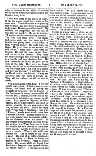 THE MAORI MESSENGER. TE KARERE MAORI. tribe to interfere in the affairs of another tribe; but let Assessors be selected from the Chiefs of every tribe. I shall now speak of my bundle of sticks. It was the lesson taught by a father to his seven sons. Those seven sons were growing into manhood, and their father was declining to the grave. He thought within himself " My children are thoughtless, and will not be wise after my death." He said to his sons. " I am near death: come into my presence." The sons then stood forth. The father took seven sticks and lied them up in a bundle and giving them to the eldest he said, " Break them." He could not break them. He gave them to the second, and said to him, " Break them." They were not broken. He said the same to the third, and so on to the seventh. They were not broken because they were tied together in a bundle and were therefore firm. He now separated the sticks and gave one to each of the lads. They were- no longer strong, and all the seven slicks were broken. The father then said " Tie them in a bundle and they won't break." I will liken this to the Maori and to the Pakeha. If they are separated they will easily be broken up. They will not endure but will be torn to pieces. Now I shall speak of the King. I will not uphold that system. It that system be esta- blished, this Island will go wrong the thoughts (of the people) will be divided. If this Conference be strong, these troubles will cease to exist; because, if all the Chiefs will co-operate in this matter our prosperity will grow. I say, people of Ngatitoa, of Wha- nganui, and of Ngatiwhakaue, you must lie us into a bundle that we may rest on the law, both soul and body. I shall not speak thus, "Your fault 0 Governor your fault O Pakeha;" surely words should come from a number of Chiefs. Potatau died still hold- ing to our arrangement to retain the pakeha. Let the Governor tie us in a bundle. He understands what measures to devise for us. Let us leave it to Waka Nene also to tie us in a bundle, for he is resting on the (Gover- nor's) system. Let the Government also lie us in a bundle. What if this world does become evil? Let us cleave to that which is good. The root of my (fable of the) sticks is in the words: " Thou, 0 Judah, are praised by thy brethren. Judah is a lion's whelp. The sceptre shall not depart from Judah nor a lawgiver from between his feet, (till Shiloh come)." If we stand upon this tira o taua iwi. Ko taku korero tenei kei taku paihere rakau. He ritenga na te matua e ako ana ki ana tamariki tokowhitu. Ka tupu ana tamariki e whitu, ka heke te matua ki te mate; ka whakaaro ia, Kahore he wha- kaaro o aku tamariki, kahore e mohio i muri i ahau. Ra ki atu ki ana tamariki, "Me ake au ka mate; haere mai ki toku aroaro." Ka tu ana tamariki. Ka mau ia ki nga rakau e whitu , ka pai- heretia ka hoatu ki to mua, ka ki atu" Wha- tiia," Kahore i whati. Ka hoatu ki te tua- rua, "Whatiia;" kahore i whati. Pena tonu ki te tuatoru tae noa ki te tuawhitu. Kihai i whati, e kaha ana, e paihere ana ho- ki. Ka tahi ka takitahitia nga rakau, hoatu ana ki tenei ki tera: kihai i maro, whati ka- toa aua rakau e whitu. Ka mea ano te ma- tua, "Paiherea; kahore e whati." Ka wha- karitea e ahau tenei ki te Maori ki te Pake- ha, e kore e ahei te wehe; ki te wehea ka whatiwhati noa, e kore e mau, ngakongako kau. Maku e korero i te tikanga Kingi; e kore au e pupuri i tena tikanga. Ka pena ka whai i tena tikanga, ka he tenei motu, ka whati ona whakaaro. Ka kaha tenei Runa- nga, ka mate ano enei raruraru; no te mea ka peke katoa nga rangatira ki runga ki te- nei mea noho ai; ka tupu ano he pai mo tatou. Ko taku tenei e mea atu nei. E Ngatitoa, e Whanganui, e Ngatiwhakaue, ma koutou tatou e pupu mai kia okioki ai o tatou wairua me o tatou tinana ki runga i te ture. E kore au e mea atu: " To he e te Kawana, to he e te Pakeha:" engari ma te tini o nga rangatira tena kupu. Mate ana a Potatau i runga i ta maua kupu pupuri i te Pakeha. Ma te Kawana ra tatou e pai- here; kua matau ia ki te whakaaro i nga tikanga mo tatou. Me waiho ano hoki ma Te Waka Nene e paihere: e noho ana hoki ia ki runga ki te tikanga. Ko te Kawana- tanga ano hoki tetahi hei paihere i a tatou. Hei aha te he ai te ao? Ko tatou me noho i runga i te pai. Ko te take o taku rakau ko te kupu e mea ra "ko koe e Hura e whakamamoemititia nei eo tuakana: he kuao raiona a Hura, e kore e riro ke te hepeta o Hura; me te kai whakatakoto tikanga o ro to o ona waewae. Ka tu tatou ki runga nga ki tenei Karaipiture ka tu ano tatou. E whe- nei ana tenei kupu me te kowhatu e whiua ana ki waenganui i a tatou.