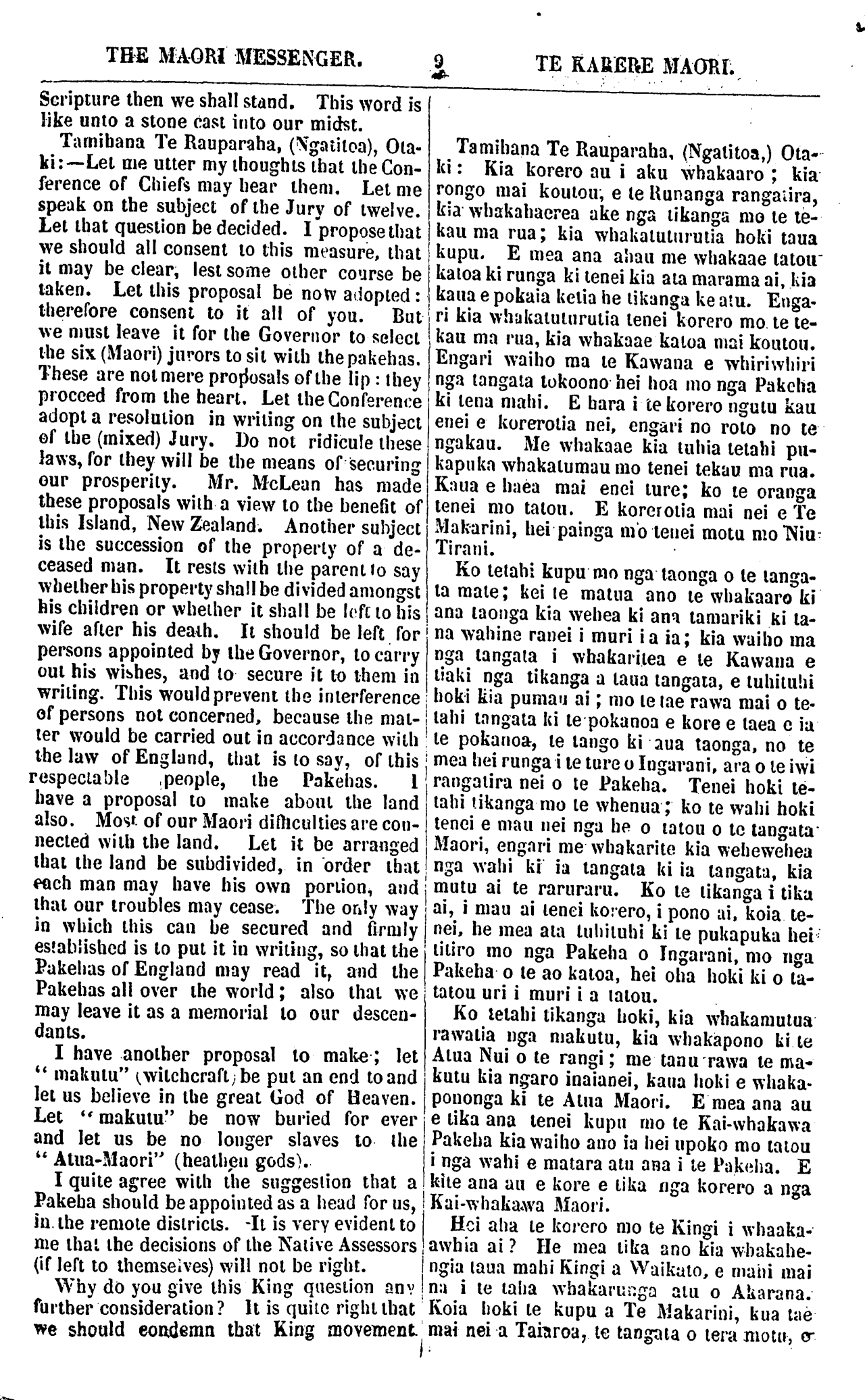 THE MAORI MESSENGER. 9 TE KARERE MAORI. Scripture then we shall stand. This word is like unto a stone cast into our midst. Tamihana Te Rauparaha, (Ngatitoa), Ota- ki:—Let me utter my thoughts that the Con- ference of Chiefs may hear them. Let me speak on the subject of Ihe Jury of twelve. Let that question be decided. I propose that we should all consent to this measure, that it may be clear, lest some other course be taken. Let this proposal be now adopted: therefore consent to it all of you. But we must leave it for the Governor to select the six (Maori) jurors to sit with the pakehas. These are not mere proposals of the lip: they proceed from the heart. Let the Conference adopt a resolution in writing on the subject of the (mixed) Jury. Do not ridicule these laws, for they will be the means of securing our prosperity. Mr. McLean has made these proposals with a view to the benefit of this Island, New Zealand. Another subject is the succession of the property of a de- ceased man. It rests with the parent to say whether his property shall be divided amongst his children or whether it shall be left to his wife after his death. It should be left for persons appointed by the Governor, to carry out his wishes, and to secure it to them in writing. This would prevent the interference of persons not concerned because the mat- ter would be carried out in accordance with the law of England, that is to say, of this respectable, people, the Pakehas. 1 have a proposal to make about the land also. Most of our Maori difficulties are con- nected with the land. Let it be arranged that the land be subdivided, in order that each man may have his own portion, and that our troubles may cease. The only way in which this can be secured and firmly established is to put it in writing, so that the Pakehas of England may read it, and the Pakehas all over the world; also that we may leave it as a memorial to our descen- dants. I have another proposal to make; let " makutu" ( witchcraft be put an end to and let us believe in the great God of Heaven. Let " makutu" be now buried for ever and let us be no longer slaves to the " Atua-Maori" (heathen gods). I quite agree with the suggestion that a Pakeha should be appointed as a head for us, in the remote districts. -It is very evident to me that the decisions of the Native Assessors (if left to themselves) will not be right. Why do you give this King question any further consideration? It is quite right that we should condemn that King movement. Tamihana Te Rauparaha, (Ngatitoa,) Ota- ki: Kia korero au i aku whakaaro; kia rongo mai koutou, e te Runanga rangatira, kia whakahaerea ake nga tikanga mo te te- kau ma rua; kia whakatuturutia hoki taua kupu. E mea ana ahau me whakaae tatou katoa ki runga ki tenei kia ata marama ai, kia kaua e pokaia ketia he tikanga ke atu. Enga- ri kia whakatuturutia tenei korero mo te te- kau ma rua, kia whakaae katoa mai koutou. Engari waiho ma te Kawana e whiriwhiri nga tangata tokoono hei hoa mo nga Pakeha ki tena mahi. E hara i te korero ngutu kau enei e korerotia nei, engari no roto no te ngakau. Me whakaae kia tuhia tetahi pu- kapuka whakatumau mo tenei tekau ma rua. Kaua e haea mai enei ture; ko te oranga tenei mo tatou. E korerotia mai nei e Te Makarini, hei painga mo tenei mota mo Niu Tirani. Ko tetahi kupu mo nga taonga o te tanga- ta mate; kei te matua ano te whakaaro ki ana taonga kia wehea ki ana tamariki ki ta- na wahine ranei i muri ia ia; kia waiho ma nga tangata i whakaritea e te Kawana e tiaki nga tikanga a taua tangata, e tuhituhi hoki kia pumau ai; mo te tae rawa mai o te- tahi tangata ki te pokanoa e kore e taea e ia te pokanoa, te tango ki aua taonga, no te mea hei runga i te ture o Ingarani, ara o te iwi rangatira nei o te Pakeha. Tenei hoki te- tahi tikanga mo te whenua; ko te wahi hoki tenei e mau nei nga he o tatou o te tangata Maori, engari me whakarite kia wehewehea nga wahi ki ia tangata ki ia tangata, kia mutu ai te raruraru. Ko te tikanga i tika ai, i mau ai tenei korero, i pono ai, koia te- nei, he mea ata tuhituhi ki te pukapuka hei titiro mo nga Pakeha o Ingarani, mo nga Pakeha o te ao katoa, hei oha hoki ki o ta- tatou uri i muri i a tatou. Ko tetahi tikanga hoki, kia whakamutua rawatia nga makutu, kia whakapono ki te Atua Nui o te rangi; me tanu rawa te ma- kutu kia ngaro inaianei, kaua hoki e whaka- pononga ki te Atua Maori. E mea ana au e tika ana tenei kupu mo te Kai-whakawa Pakeha kia waiho ano ia hei upoko mo tatou i nga wahi e matara atu ana i te Pakeha. E kite ana au e kore e tika nga korero a nga Kai-whakawa Maori. Hei aha te korero mo te Kingi i whaaka- awhia ai? He mea tika ano kia whakahe- ngia taua mahi Kingi a Waikato, e maui mai na i te taha whakarunga atu o Akarana. Koia hoki te kupu a Te Makarini, kua tae mai nei a Taiaroa, te tangata o tera motu, o