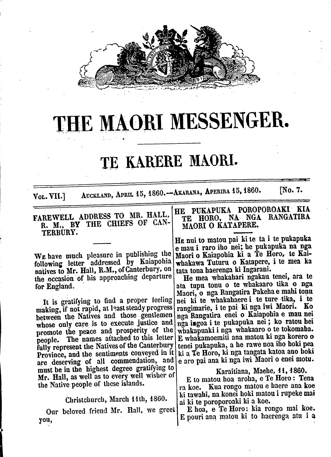 The Maori Messenger - Ko te Karere Maori 1855-1860: Volume 7, Number 7. 15 April 1860 |