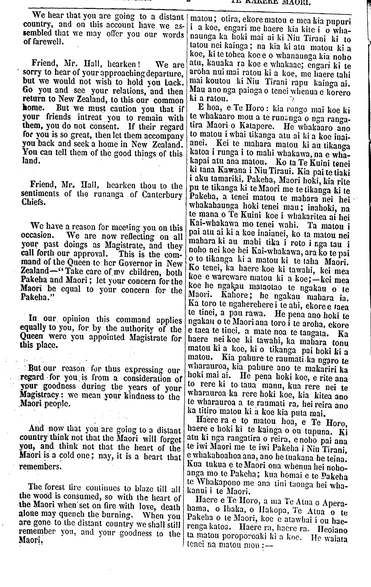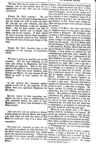 We hear that you are going to a distant country, and on this account have we as- sembled that we may offer you our words of farewell. Friend, Mr. Hall, hearken! We are sorry to hear of your approaching departure, but we would not wish to hold you back. Go you and see your relations, and then return to New Zealand, to this our common home. But we must caution you that if your friends intreat you to remain with them, you do not consent. If their regard for you is so great, then let them accompany you back and seek a home in New Zealand. You can tell them of the good things of this land. Friend, Mr. Hall, hearken thou to the sentiments of the runanga of Canterbury Chiefs. We have a reason for meeting you on this occasion. We are now reflecting on all your past doings as Magistrate, and they call forth our approval. This is the com- mand of the Queen to her Governor in New Zealand—"Take care of my children, both Pakeha and Maori; let your concern for the Maori be equal to your concern for the Pakeha." In our opinion this command applies equally to you, for by the authority of the Queen were you appointed Magistrate for this place. But our reason for thus expressing our regard for you. is from a consideration of your goodness during the years of your Magistracy: we mean your kindness to the Maori people. And now that you are going to a distant country think not that the Maori will forget you, and think not that the heart of the Maori is a cold one; nay, it is a heart that remembers. The forest fire continues to blaze till all the wood is consumed, so with the heart of the Maori when set on fire with love, death alone may quench the turning. When you are gone to the distant country we shall still remember you, and your goodness to the Maori, matou; otira, ekore matou e mea kia pupuri i a koe, engari me haere kia kite i o wha- naunga ka hoki mai ai ki Niu Tirani ki to tatou nei kainga; na kia ki atu matou ki a koe, ki te tohea koe e o whanaunga kia noho atu, kauaka ra koe e whakaae; engari ki te aroha nui mai ratou ki a koe, me haere tahi mai koutou ki Niu Tirani rapu kainga ai. Mau ano nga painga o tenei whenua e korero ki a ratou. E hoa, e Te Horo: kia rongo mai koe ki te whakaaro mou a te runanga o nga ranga- tira Maori o Katapere. He whakaaro ano to matou i whai tikanga atu ai ki a koe inai- anei. Kei te mahara matou ki au tikanga katoa i runga i to mahi whakawa, na e wha- kapai atu ana matou. Ko ta Te Kuini tenei ki tana Kawana i Niu Tirani. Kia pai te tiaki i aku tamariki, Pakeha, Maori hoki, kia rite pu te tikanga ki te Maori me te tikanga ki te Pakeha, a tenei matou te mahara nei hei whakahaunga hoki tenei mau; inahoki, na te mana o Te Kuini koe i whakaritea ai hei Kai-whakawa mo tenei wahi. Ta matou i pai atu ai ki a koe inaianei, ko ta matou nei mahara ki au mahi tika i roto i nga tau i noho nei koe hei Kai-whakawa, ara ko te pai o to tikanga ki a matou ki te taha Maori. Ko tenei, ka haere koe ki tawahi, kei mea koe e wareware matou ki a koe;—kei mea koe he ngakau mataotao te ngakau o te Maori. Kahore; he ngakau mahara ia. Ka toro te ngaherehere te ahi, ekore e taea te tinei, a pau rawa. He pena ano hoki te ngakau o te Maori ana toro i te aroha, ekore e taea te tinei, a male noa te tangata. Ka haere nei koe ki tawahi, ka mahara tonu matou ki a koe, ki o tikanga pai hoki ki a matou. Kia pahure te raumati ka ngaro te wharauroa, kia pahure ano te makariri ka hoki mai ai. He pena hoki koe, e rite ana to rere ki to taua manu, kua rere nei te wharauroa ka rere hoki koe, kia kitea ano te wharauroa a te raumati ra, hei reira ano ka titiro matou ki a koe kia puta mai. Haere ra e to matou hoa, e Te Horo, haere e hoki ki te kainga o ou tupuna. Ki atu ki nga rangatira o reira, e noho pai ana te iwi Maori me te iwi Pakeha i Niu Tirani, e whakahoahoa ana, ano he tuakana he teina. Kua tukua e te Maori ona whenua hei noho- anga mo te Pakeha; kua homai e te Pakeha te Whakapono me ana tini taonga hei wha- kanui i te Maori. Haere e Te Horo, a ma Te Atua o Apera- hama. o Ihaka, o Hakopa, Te Atua o te Pakeha o te Maori, koe e atawhai i ou hae- renga katoa. Haere ra, haere ra- Heoiano la matou poroporoaki ki a koe. He waiata tenei na matou mou: