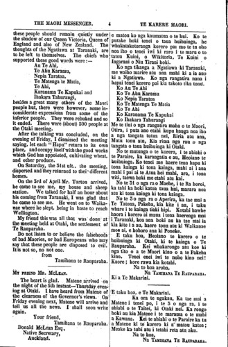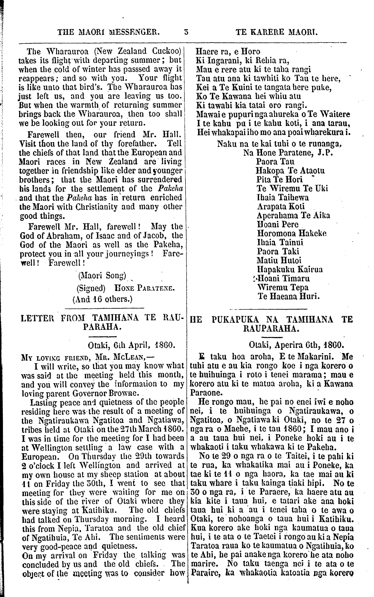 THE MAORI MESSENGER. TE KARERE MAORI. The Wharauroa (New Zealand Cuckoo) takes its flight with departing summer; but when the cold of winter has passsed away it reappears; and so with you. Your flight is like unto that bird's. The Wharauroa has just left us, and you are leaving us loo. But when the warmth of returning summer brings back the Wharauroa, then too shall we be looking out for your return. Farewell then, our friend Mr. Hall. Visit thou the land of thy forefather. Tell the chiefs of that land that the European and Maori races in New Zealand are living together in friendship like elder and younger brothers; that the Maori has surrendered his lands for the settlement of the Pakeha and that the Pakeha has in return enriched the Maori with Christianity and many other good things. Farewell Mr. Hall, farewell! May the God of Abraham, of Isaac and of Jacob, the God of the Maori as well as the Pakeha, protect you in all your journeyings! Fare- well! Farewell! (Maori Song) (Signed) HONE PARATENE. (And 16 others.) LETTER FROM TAMIHANA TE RAU- PARAHA. Otaki, 6th April, 1860. MY LOVING FRIEND, MR. McLEAN, I will write, so that you may know what was said at the meeting held this month, and you will convey the information to my loving parent Governor Browne. Lasting peace and quietness of the people residing here was the result of a meeting of the Ngatiraukawa Ngatitoa and Ngatiawa, tribes held at Otaki on the 27th March l860. I was in lime for the meeting for I had been at Wellington sellling a law case with a European. On Thursday the 29th towards 2 o'clock I left Wellington and arrived at my own house at my sheep station at about 11 on Friday the 30th, I went to see that meeting for they were wailing for me on this side of the river of Otaki where they were staying at Katihiku. The old chiefs had talked on Thursday morning. I heard this from Nepia, Taratoa and the old chief of Ngatihuia, Te Ahi. The sentiments were very good-peace and quietness. On my arrival on Friday the talking was concluded by us and the old chiefs. The object of Ihe meeting was to consider how Haere ra, e Horo Ki Ingarani, ki Rehia ra, Mau e rere atu ki te taha rangi Tau atu ana ki tawhiti ko Tau te here, Kei a Te Kuini te tangata here puke, Ko Te Kawana hei whiu atu Ki tawahi kia tatai oro rangi. Mawai e pupuringa ahureka o Te Waitere I te kahu pa i te kahu koti, i ana tarau, Hei whakapai iho mo ana poai wharekura i. Naku na te kai tuhi o te runanga, Na Hone Paratene, J.P. Paora Tau Hakopa Te Ataotu Pita Te Hori Te Wiremu Te Uki Ihaia Taihewa Arapata Koti Aperahama Te Ai ka Hoani Pere Horomona Hakeke Ihaia Tainui Paora Taki Matiu Hutoi Hapakuku Kairua Hoani Timaru Wiremu Tepa Te Haeana Huri. HE PUKAPUKA NA TAMIHANA TE RAUPARAHA. Otaki, Aperira 6th, I860. E taku hoa aroha, E te Makarini. Me tuhi atu e au kia rongo koe i nga korero o te huihuinga i roto i tenei marama; mau e korero atu ki te matua aroha, ki a Kawana Paraone. He rongo mau, he pai no enei iwi e noho nei, i te huihuinga o Ngatiraukawa, o Ngatitoa, o Ngatiawa ki Otaki, no te 27 o nga ra o Maehe, i te tau 1860; I mau ano i a au taua hui nei, i Poneke hoki au i te whakaoti i taku whakawa ki te Pakeha. No te 29 o nga ra o te Taitei, i te pahi ki te rua, ka whakatika mai au i Poneke, ka tae ki te 41 o nga haora, ka tae mai au ki taku whare i taku kainga tiaki hipi. No te 50 o nga ra, i te Paraere, ka haere atu au kia kite i taua hui, e tatari ake ana hoki taua hui ki a au i tenei taha o te awa o Otaki, te nohoanga o taua hui i Katihiku. Kua korero ake hoki nga kaumatua o taua hui, i te ata o te Taetei i rongo au ki a Nepia Taratoa raua ko te kaumatua o Ngatihuia, ko te Ahi, he pai anake nga korero he ata noho marire. No taku taenga nei i te ata o te Paraire, ka whakaotia katoatia nga korero