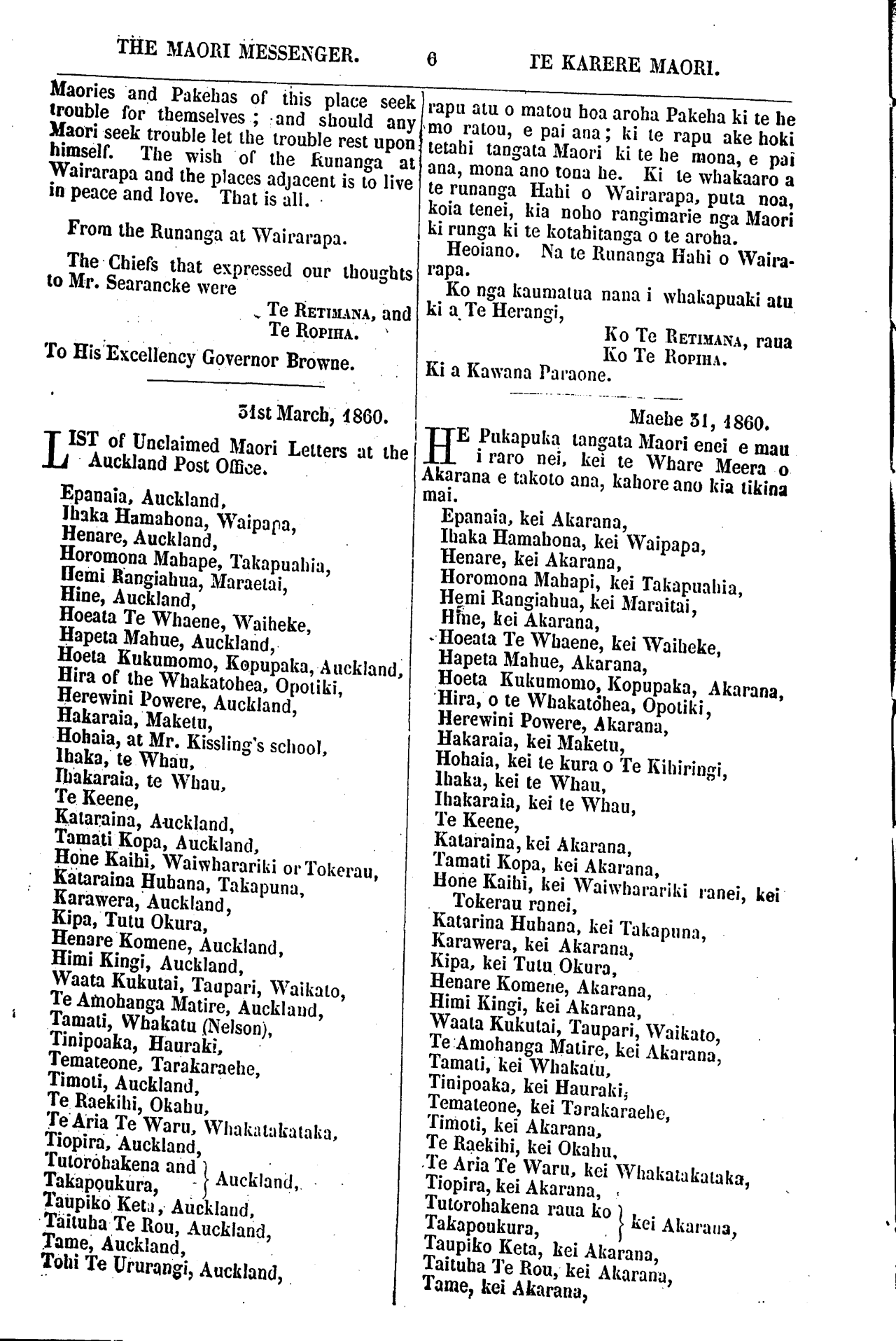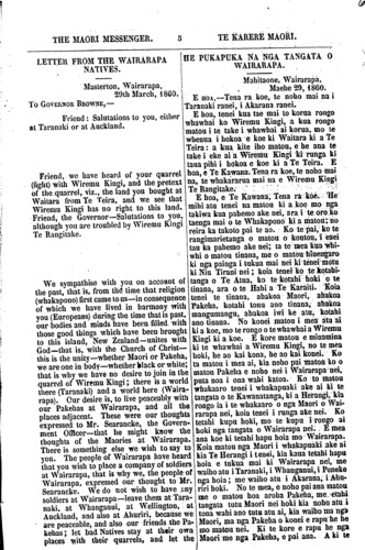 THE MAORI MESSENGER. TE KARERE MAORI. LETTER FROM THE WAIRARAPA NATIVES. Masterton, Wairarapa, 29th March, 1860. To GOVERNOR BROWNE,— Friend: Salutations to you, either at Taranaki or at Auckland. Friend, we have heard of your quarrel (fight) with Wiremu Kingi, and the pretext of the quarrel, viz,, the land you bought at Waitara from Te Teira, and we see that Wiremu Kingi has no right to this land. Friend, the Governor—Salutations to you, although you are troubled by Wiremu Kingi Te Rangitake. We sympathise with you on account of the past," that is, from the time that religion (whakapono) first came to us—in consequence of which we have lived in harmony with you (Europeans) during the time that is past. our bodies and minds have been filled with those good things which have been brought to this island, New Zealand—unites with God—that is, with the Church of Christ this is the unity— whether Maori or Pakeha, we are one ia body— whether black or white; that is why we have no desire to join in the quarrel of Wiremu Kingi; there is a world there (Taranaki) and a world here (Waira- rapa). Our desire is, to live peaceably with our Pakehas at Wairarapa, and all the places adjacent. These were our thoughts expressed to Mr. Searancke, the Govern- ment Officer—that he might know the thoughts of the Maories at Wairarapa. There is something else we wish to say to you. The people of Wairarapa have heard that you wish to place a company of soldiers at Wairarapa, that is why we, the people of Wairarapa, expressed our thought to Mr. Searancke. We do not wish to have any soldiers at Wairarapa leave them at Tara- naki, at Whanganui, at Wellington, at Auckland, and also at Ahuriri, because we are peaceable, and also our friends the Pa- kehas; let bad Natives stay at their own places with their quarrels, and let the HE PUKAPUKA NA NGA TANGATA O WAIRARAPA. Mahitaone, Wairarapa, Maehe 29, 1860. E HOA,—Tena ra koe, te noho mai na i Taranaki ranei, i Akarana ranei. E hoa, tenei kua tae mai to korua rongo whawhai ko Wiremu Kingi, a kua rongo matou i te take i whawhai ai korua, mo te whenua i hokoa e koe ki Waitara ki a Te Teira: a kua kite iho matou, e he ana te take i eke ai a Wiremu Kingi ki runga ki taua pihi i hokoa e koe ki a Te Teira. E hoa, e Te Kawana. Tena ra koe, te noho mai na, te whakararua mai na e Wiremu Kingi Te Rangitake. E hoa, e Te Kawana; Tena ra koe. He mihi atu tenei na matou ki a koe mo nga takiwa kua pahemo ake nei, a ra i te oro ko taenga mai o te Whakapono ki a matou; no reira ka takoto pai te ao. Ko te pai, ko te rangimarietanga o matou o koutou, i enei tau ka pahemo ake nei; ta te mea kua whi- whi o matou tinana, me o matou hinengaro ki nga painga i tukua mai nei ki tenei motu ki Niu Tirani nei; koia tenei ko te kotahi- tanga o Te Atua, ko te kotahi hoki o te tinana, ara o te Hahi a Te Karaiti. Koia tenei te tinana, ahakoa Maori, ahakoa Pakeha, kotahi tonu ano tinana, ahakoa mangumangu, ahakoa iwi ke atu, kotahi ano tinana. No konei matou i mea atu ai ki a koe, mo te rongo o te whawhai a Wiremu Kingi ki a koe. E kore matou e minamina ki te whawhai a Wiremu Kingi, no te mea hoki, he ao kai kona, he ao kai konei. Ko ta matou i mea ai, kia noho pai matou ko o matou Pakeha e noho nei i Wairarapa nei, puta noa i ona wahi katoa. Ko to matou whakaaro tenei i whakapuaki ake ai ki te tangata o te Kawanatanga, ki a Herangi, kia rongo ia i te whakaaro o nga Maori o Wai- rarapa nei, koia tenei i runga ake nei. Ko tetahi kupu hoki, mo te kupa i rongo ai hoki nga tangata o Wairarapa nei. E mea ana koe ki tetahi hapu hoia mo Wairarapa. Koia matou nga Maori i whakapuaki ake ai kia Te Herangi i tenei, kia kaua tetahi hapu hoia e tukua mai ki Wairarapa nei, me waiho atu i Taranaki, i Whanganui, i Poneke nga hoia; me waiho atu i Akarana, i Ahu- riri hoki. No te mea, e noho pai aua matou me o matou boa aroha Pakeha, me etahi tangata tutu Maori nei hoki kia noho atu i tona wahi ano tutu atu ai, kia waiho ma nga Maori, ma nga Pakeha o konei e rapu he he mo matou nei. Ki te kore e rapu he nga Maori me nga Pakeha, e pai ana. A ki te