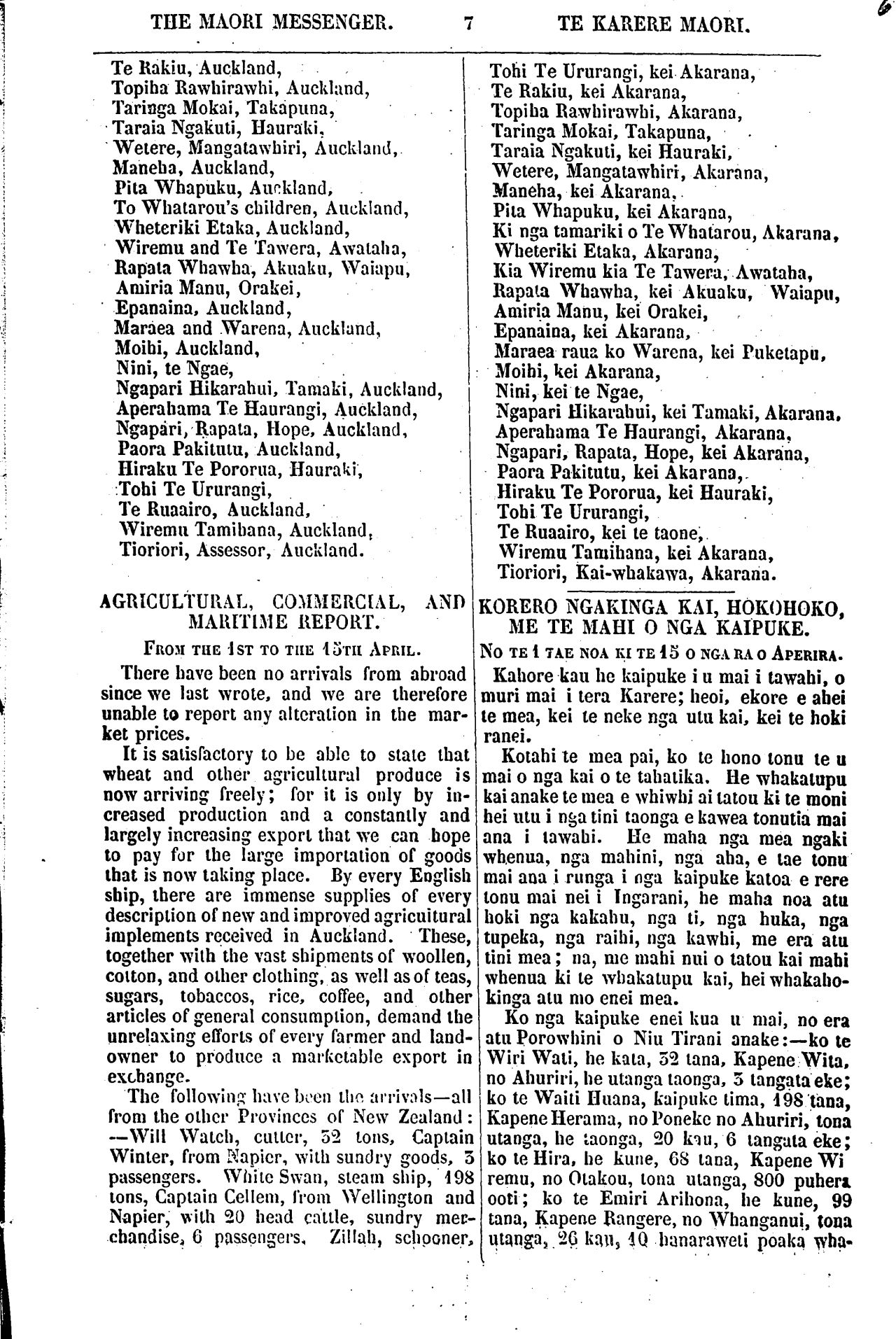 THE MAORI MESSENGER. TE KARERE MAORI. Te Rakiu, Auckland, Topiha Rawhirawhi, Auckland, Taringa Mokai, Takapuna, Taraia Ngakuti, Hauraki, Wetere, Mangatawhiri, Auckland, Maneha, Auckland, Pita Whapuku, Auckland, To Whatarou's children, Auckland, Wheteriki Etaka, Auckland, Wiremu and Te Tawera, Awataha, Rapata Whawha, Akuaku, Waiapu, Amiria Manu, Orakei, Epanaina, Auckland, Maraea and Warena, Auckland, Moihi, Auckland, Nini, te Ngae, Ngapari Hikarahui, Tamaki, Auckland, Aperahama Te Haurangi, Auckland, Ngapari, Rapata, Hope, Auckland, Paora Pakitutu, Auckland, Hiraku Te Pororua, Hauraki, : Tohi Te Ururangi, Te Ruaairo, Auckland, Wiremu Tamihana, Auckland, Tioriori, Assessor, Auckland. AGRICULTURAL, COMMERCIAL, AND MARITIME REPORT. FROM THE 1ST TO THE 15TH APRIL. There have been no arrivals from abroad since we last wrote, and we are therefore unable to report any alteration in the mar- ket prices. It is satisfactory to be able to state that wheat and other agricultural produce is now arriving freely; for it is only by in- creased production and a constantly and largely increasing export that we can hope to pay for the large importation of goods that is now taking place. By every English ship, there are immense supplies of every description of new and improved agricuitural implements received in Auckland. These, together with the vast shipments of woollen, cotton, and other clothing, as well as of teas, sugars, tobaccos, rice, coffee, and other articles of general consumption, demand the unrelaxing efforts of every farmer and land- owner to produce a marketable export in exchange. The following have been the arrivals—all from the other Provinces of New Zealand: —Will Watch, cutter, 52 tons, Captain Winter, from Napier, with sundry goods, 5 passengers. White Swan, steam ship, 198 tons, Captain Cellem, from Wellington and Napier, wi 111 20 head cattle, sundry mec- chandise, 6 passengers, Zillah, schooner, Tohi Te Ururangi, kei Akarana, Te Rakiu, kei Akarana, Topiha Rawhirawhi, Akarana, Taringa Mokai, Takapuna, Taraia Ngakuti, kei Hauraki, Wetere, Mangatawhiri, Akarana, Maneha, kei Akarana, Pita Whapuku, kei Akarana, Ki nga tamariki o Te Whatarou, Akarana, Wheteriki Etaka, Akarana, Kia Wiremu kia Te Tawera, Awataha, Rapata Whawha, kei Akuaku, Waiapu, Amiria Manu, kei Orakei, Epanaina, kei Akarana, Maraea raua ko Warena, kei Puketapu, Moihi, kei Akarana, Nini, kei te Ngae, Ngapari Hikarahui, kei Tamaki, Akarana, Aperahama Te Haurangi, Akarana, Ngapari, Rapata, Hope, kei Akarana, Paora Pakitutu, kei Akarana,. Hiraku Te Pororua, kei Hauraki, Tohi Te Ururangi, Te Ruaairo, kei te taone, Wiremu Tamihana, kei Akarana, Tioriori, Kai-whakawa, Akarana. KORERO NGAKINGA KAI, HOKOHOKO. ME TE MAHI O NGA KAIPUKE. NO TE 1 TAE NOA KI TE 15 O NGA RA O APERIRA. Kahore kau he kaipuke i u mai i tawahi, o muri mai i tera Karere; heoi, ekore e ahei te mea, kei te neke nga utu kai, kei te hoki ranei. Kotahi te mea pai, ko te hono tonu te u mai o nga kai o te tahatika. He whakatupu kai anake te mea e whiwhi ai tatou ki te moni hei utu i nga tini taonga e kawea tonutia mai ana i tawahi. He maha nga mea ngaki whenua, nga manini, nga aha, e tae tonu mai ana i runga i nga kaipuke katoa e rere tonu mai nei i Ingarani, he maha noa atu hoki nga kakahu, nga ti, nga huka, nga tupeka, nga raihi, nga kawhi, me era atu tini mea; na, me mahi nui o tatou kai mahi whenua ki te whakatupu kai, hei whakaho- kinga atu mo enei mea. Ko nga kaipuke enei kua u mai, no era atu Porowhini o Niu Tirani anake:—kote Wiri Wati, he kata, 32 tana, Kapene Wita. no Ahuriri, he utanga taonga, 3 tangata eke; ko te Waiti Huana, kaipuke tima, 198 tana, Kapene Herama, no Poneke no Ahuriri, tona utanga, he taonga, 20 kau, 6 tangata eke; ko te Hira, he kune, 68 tana, Kapene Wi remu, no Otakou, tona utanga, 800 puhera ooti; ko te Emiri Arihona, he kune, 99 tana, Kapene Rangere, no Whanganui, tona utanga, 26 kau, 10 hanaraweti poaka wha-