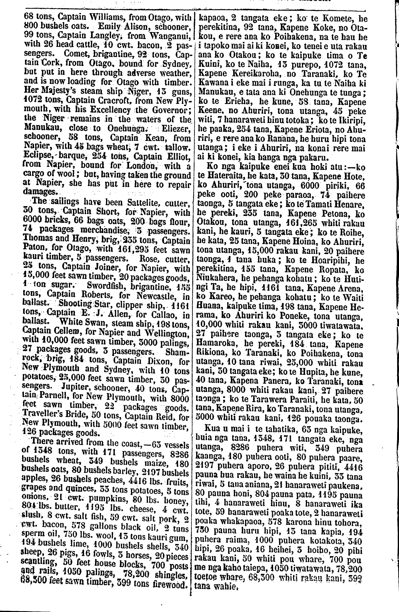 68 tons, Captain Williams, from Otago, with 800 bushels oats. Emily Alison, schooner, 99 tons, Captain Langley. from. Wanganui, with 26 head cattle, 10 cwt. bacon, 2 pas- sengers. Comet, brigantine, 92 tons, Cap- lain Cork, from Otago, bound for Sydney, but put in here through adverse weather, and is now loading for Otago with timber. Her Majesty's steam ship Niger, 13 guns, 1072 tons, Captain Cracroft, from New Ply- mouth, with his Excellency the Governor; the Niger remains in the waters of the Manukau, close to Onehunga. Eliezer, schooner, 58 tons, Captain Kean, from Napier, with 45 bags wheat, 7 cwt. tallow. Eclipse,-barque, 254 tons, Captain Elliot, from Napier, bound for London, with a cargo of wool; but, having takeo the ground at Napier, she has put in here to repair damages. The sailings have been Sattelite, cutter, 30 tons, Captain Short, for Napier, with 6000 bricks, 66 bags oats, 200 bags flour, 74 packages merchandise, 5 passengers. Thomas and Henry, brig, 235 tons, Captain Paton, for Otago, with 161, 295 feet sawn kauri timber, 5 passengers. Rose, cutter, 2S tons, Captain Joiner, for Napier, with 15, OOO feet sawn timber, 20 packages goods, 1 ton sugar. Swordfish, brigantine, 155 tons, Captain Roberts, for Newcastle, in ballast. Shooting Star, clipper ship, 1161 tons, Captain E. J. Allen, for Callao, in ballast. White Swan, steam ship, 198 tons, Captain Cellem, for Napier and Wellington, with 10, 000 feet sawn timber, 3000 palings, 27 packages goods. 3 passengers. Sham- rock, brig, 184 tons, Captain Dixon, for New Plymouth and Sydney, with 10 tons potatoes, 25, 000 feet sawn timber, 30 pas- sengers. Jupiter, schooner, 40 tons, Cap- lain Parnell, for New Plymouth, with 8000 feet sawn timber, 22 packages goods. Traveller's Bride, 50 tons, Captain Reid. for New Plymouth, with 5000 feet sawn timber, 126 packages goods. There arrived from the coast,—65 vessels of 1348 tons, with 171 passengers, 8286 bushels wheat, 349 bushels maize, 180 bushels oats, 80 bushels barley, 2197 bushels apples, 26 bushels peaches, 4416 Ibs. fruits, grapes and quinces, 53 tons potatoes, 5 tons onions, 21 cwt. pumpkins, 80 Ibs. honey, 804 Ibs. butter, 1193 Ibs. cheese, 4 cwt. slush, 8 cwt. salt fish, 59 cwt. salt pork, 2 cwt. bacon, 578 gallons black oil, 2 tuns sperm oil, 750 Ibs. wool, 13 tons kauri gum 194 bushels lime, 1000 bushels shells, 340 sheep, 26 pigs, 16 fowls, 3 horses, 20 pieces scantling, 50 feet house blocks, 700 posts and rails, 1050 palings, 78,200 shingles, 68 500 feet sawn timber, 599 tons firewood . kapaoa, 2 tangata eke; ko te Komete, he perekitina, 92 tana, Kapene Koke, no Ota- kou, e rere ana ko Poihakena, na te hau he i tapoko mai ai ki konei, ko tenei e uta rakau ana ko Otakou; ko te kaipuke tima o Te Kuini, ko te Naiha, 43 purepo, 1072 tana, Kapene Kereikaroha, no Taranaki, ko Te Kawana i eke mai i runga, ka tu te Naiha ki Manukau, e tata ana ki Onehunga te tunga; ko te Erieha, he kune, 58 tana, Kapene Keene, no Ahuriri, tona utanga, 45 peke witi, 7 hanaraweti hinu totoka; ko te Ikiripi, he paaka, 254 tana, Kapene Eriota, no Ahu- riri, e rere ana ko Ranana, he huru hipi tona utanga; i eke i Ahuriri, na konai rere mai ai ki konei, kia hanga nga pakaru. Ko nga kaipuke enei kua hoki atu:—ko te Hateraita, he kata, 30 tana, Kapene Hote, ko Ahuriri, tona utanga, 6000 piriki, 66 peke ooti, 200 peke paraoa, 74 paihere taonga, 5 tangata eke; ko te Tamati Henare, be pereki, 235 tana, Kapene Petona, ko Otakou, tona utanga, 161, 265 whiti rakau kani, he kauri, 5 tangata eke; ko te Roihe, be kata, 25 tana, Kapene Hoina, ko Ahuriri, tona utanga, 15, 000 rakau kani, 20 paihere taonga, 4 tana huka; ko te Hoaripihi, he perekitina, 155 tana, Kapene Ropata, ko Niukahera, he pehanga kohatu; ko te Huti- ngi Ta, he hipi, 1161 tana, Kapene Arena, ko Kareo, he pehanga kohatu; ko te Waiti Huana, kaipuke tima, 198 tana, Kapene He- rama, ko Ahuriri ko Poneke, tona utanga, 10, 000 whiti rakau kani, 5000 tiwatawata. 27 paihere taonga, 3 tangata eke; ko te Hamaroka, he pereki, 184 tana, Kapene Rikiona, ko Taranaki, ko Poihakena, tona utanga, 10 tana riwai, 25, 000 whiti rakau kani, 30 tangata eke; ko te Hupita, he kune, 40 tana, Kapena Panera, ko Taranaki, tona utanga, 8000 whiti rakau kani, 27 paihere taonga; ko te Tarawera Paraiti, he kata, 50 tana. Kapene Rira, ko Taranaki, tona utanga, 5000 whiti rakau kani, 126 pouaka taonga. Kua u mai i te tahatika, 63 nga kaipuke, huia nga tana, 1348, 171 tangata eke, nga utanga, 8286 puhera witi, 349 puhera kaanga, 480 puhera ooti, 80 puhera paare, 2197 puhera aporo, 26 puhera pititi. 4416 pauna hua rakau, he waina he kuini, 33 tana riwai, 5 tana aniana, 21 hanaraweti paukena, 80 pauna honi, 804 pauna pata, 1195 pauna tihi, 4 hanaraweti hinu, 8 hanaraweti ika tote, 59 hanaraweti poaka tote, 2 hanaraweti poaka whakapaoa, 578 karona hinu tohora, 750 pauna huru hipi, 15 tana kapia, 194 puhera raima; 1000 puhera kotakota, 340 hipi, 26 poaka, 16 heihei, 3 hoiho, 20 pihi rakau kani, 50 whiti pou whare, 700 pou me nga kaho taiepa, 1050 tiwatawata, 78, 200 toetoe whare, 68, 300 whiti rakau kani, 392 tana wahie.