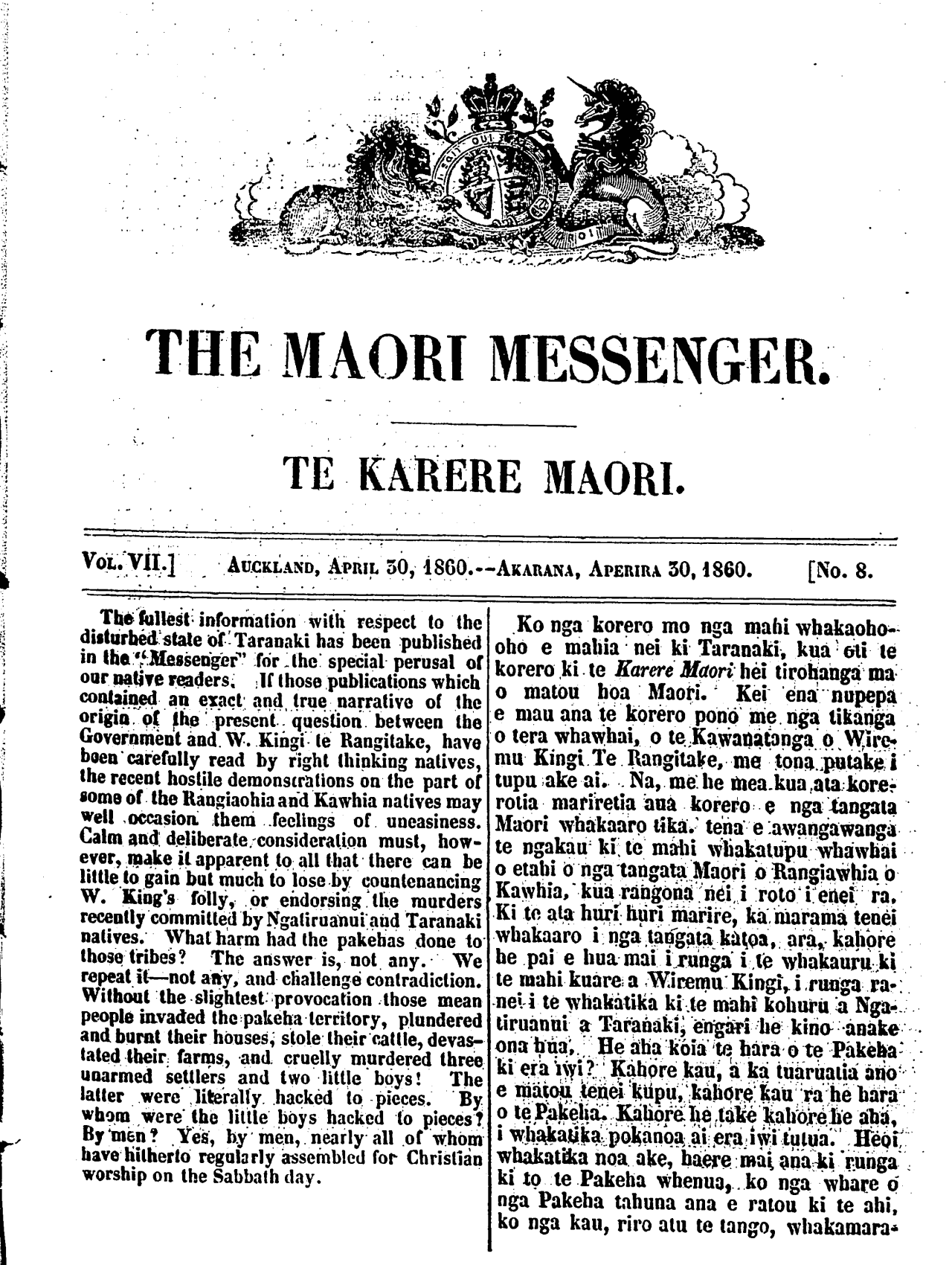 The Maori Messenger - Ko te Karere Maori 1855-1860: Volume 7, Number 8. 30 April 1860 |