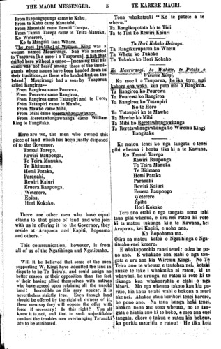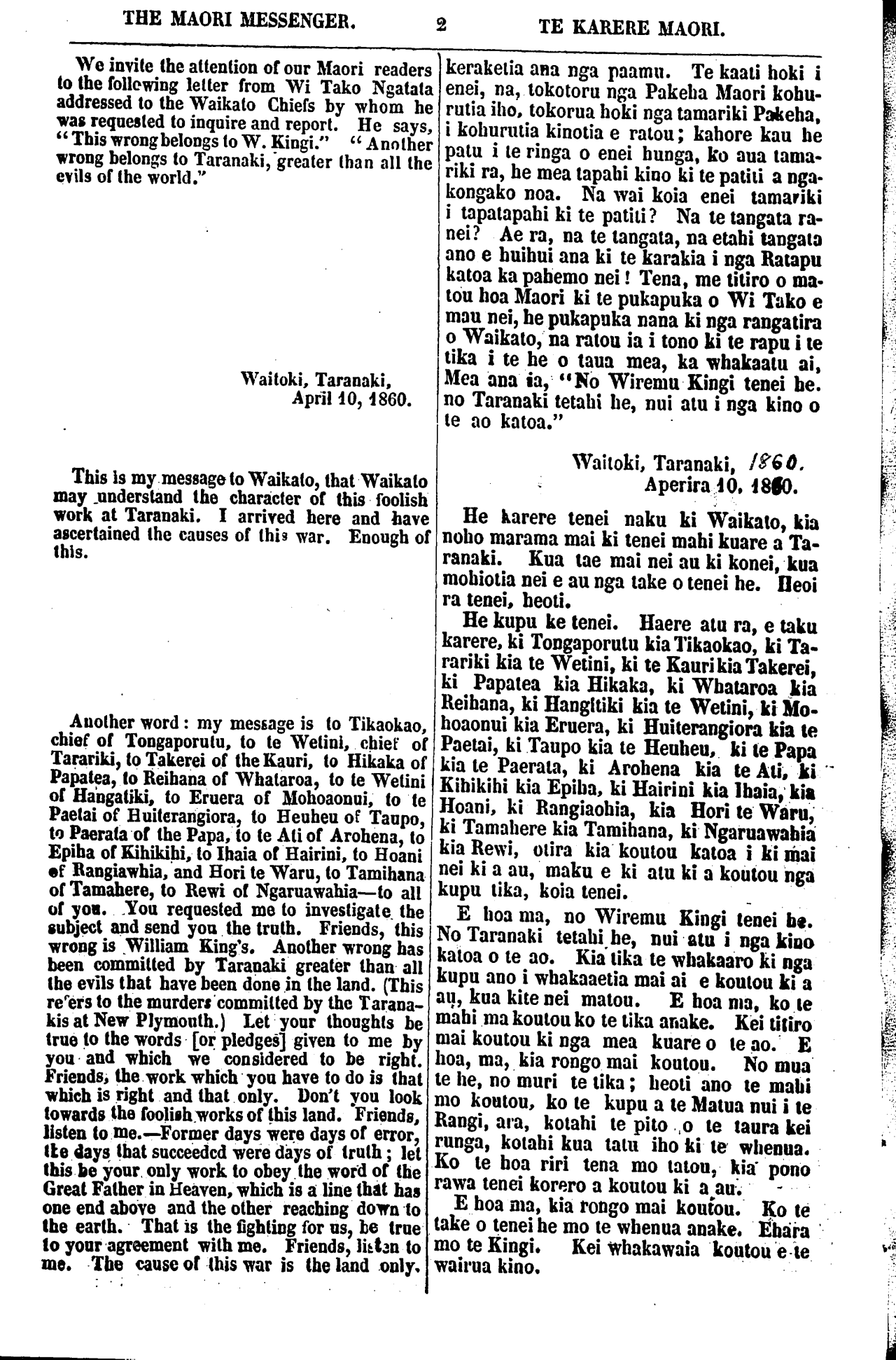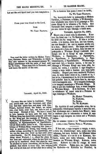 THE MAORI MESSENGER. 2 TE KARERE MAORI. We invite the attention of our Maori readers to the following letter from Wi Tako Ngatata addressed to the Waikato Chiefs by whom he was requested to inquire and report. He says, " This wrong belongs to W. Kingi." " Another wrong belongs to Taranaki, greater than all the evils of the world." Waitoki, Taranaki, April l0, 1860. This is my message to Waikato, that Waikato may understand the character of this foolish work at Taranaki. I arrived here and have ascertained the causes of this war. Enough of this. Another word: my message is to Tikaokao, chief of Tongaporutu, to te Wetini, chief of Tarariki, to Takerei of the Kauri, to Hikaka of Papatea, Io Reihana of Whataroa, to te Wetini of Hangatiki, to Eruera of Mohoaonui, to te Paetai of Huiterangiora, to Heuheu of Taupo, to Paerata of the Papa, to te Ati of Arohena, to Epiha of Kihikihi, to Ihaia of Hairini, to Hoani of Rangiawhia, and Hori te Waru, to Tamihana of Tamahere, to Rewi of Ngaruawahia—to all of you. You requested me to investigate the subject and send you the truth. Friends, this wrong is William King's. Another wong has been committed by Taranaki greater than all the evils that have been done in the land. (This refers to the murders committed by the Tarana- kis at New Plymouth.) Let your thoughts be true to the words [or pledges] given to me by you and which we considered to be right. Friends, the work which you have to do is that which is right and that only. Don't you look towards the foolish works of this land. Friends, listen to me.—Former days were days of error, Ite days that succeeded were days of truth; let this be your only work to obey the word of the Great Father ia Heaven, which is a line that has one end above and the other reaching down to the earth. That is the fighting for us, be true to your agreement with me. Friends, listen to me. The cause of this war is the land only. keraketia ana nga paamu. Te kaati hoki i enei, na, tokotoru nga Pakeha Maori kohu- rutia iho. tokorua hoki nga tamariki Pakeha, i kohurutia kinotia e ratou; kahore kau he patu i te ringa o enei hunga, ko aua tama- riki ra, he mea tapahi kino ki te patiti a nga- kongako noa. Na wai koia enei tamariki i tapatapahi ki te patiti? Na te tangata ra- nei? Ae ra, na te tangata, na etahi tangata ano e huihui ana ki te karakia i nga Ratapu katoa ka pahemo nei! Tena, me titiro o ma- tou hoa Maori ki te pukapuka o Wi Tako e mau nei, he pukapuka nana ki nga rangatira o Waikato, na ratou ia i tono ki te rapu i te tika i te he o taua mea, ka whakaatu ai, Mea ana ia, "No Wiremu Kingi tenei he. no Taranaki tetahi he, nui atu i nga kino o te ao katoa." Waitoki, Taranaki, 1860. Aperira 10, 18608. He Karere tenei naku ki Waikato, kia noho marama mai ki tenei mahi kuare a Ta- ranaki. Kua tae mai nei au ki konei, kua mohiotia nei e au nga take o tenei he. Heoi ra tenei, heoti. He kupu ke tenei. Haere atu ra, e taku karere, ki Tongaporutu kia Tikaokao, ki Ta- rariki kia te Wetini, ki te Kauri kia Takerei, ki Papatea kia Hikaka, ki Whataroa kia Reihana, ki Hangitiki kia te Wetini, ki Mo- hoaonui kia Eruera, ki Huiterangiora kia te Paetai, ki Taupo kia te Heuheu, ki te Papa kia te Paerata, ki Arohena kia te Ati, ki Kihikihi kia Epiha, ki Hairini kia Ihaia, kia Hoani, ki Rangiaohia, kia Hori te Waru, ki Tamahere kia Tamihana, ki Ngaruawahia kia Rewi, otira kia koutou katoa i ki mai nei ki a au, maku e ki atu ki a koutou nga kupu tika, koia tenei. E hoa ma, no Wiremu Kingi tenei he No Taranaki tetahi he, nui atu i nga kino katoa o te ao. Kia tika te whakaaro ki nga kupu ano i whakaaetia mai ai e koutou ki a au, kua kite nei matou. E hoa ma, ko te mahi ma koutou ko te tika anake. Kei titiro mai koutou ki nga mea kuare o te ao. E hoa, ma, kia rongo mai koutou. No mua te he, no muri te tika; heoti ano te mahi mo koutou, ko te kupu a te Matua nui i te Rangi, ara, kotahi te pito, o te taura kei runga, kotahi kua tatu iho ki te whenua. Ko te hoa riri tena mo tatou, kia pono rawa tenei korero a koutou ki a au. E hoa ma, kia rongo mai koutou. Ko te take o tenei he mo te whenua anake. Ehara mo te Kingi* Kei whakawaia koutou e te wairua kino.