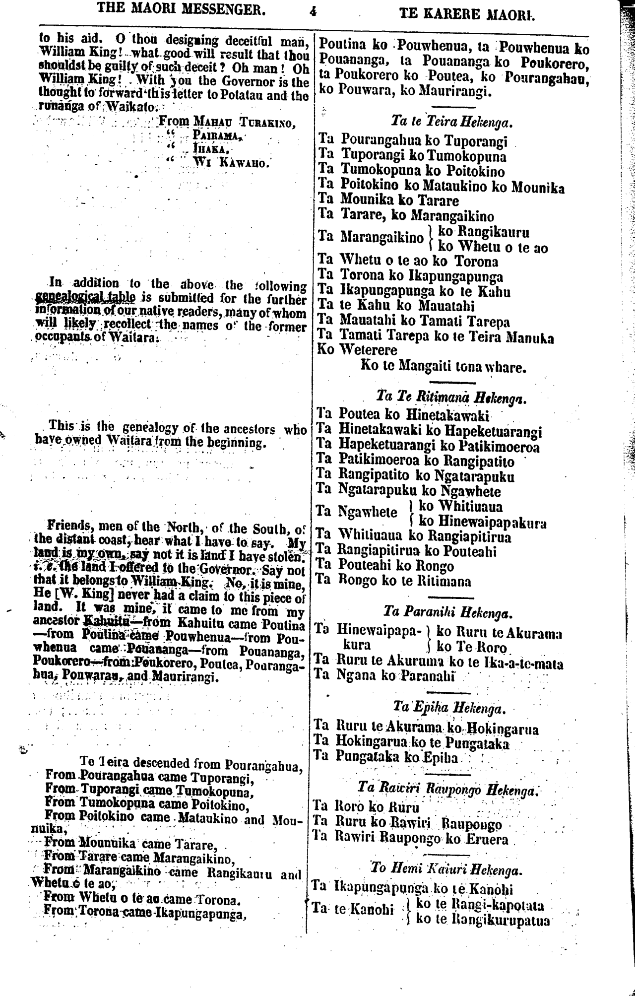 THE MAORI MESSENGER. TE KARERE MAORI. to his aid. 0 thou designing deceitful man, William King' what good. will result that (hou shouldst be guilty of such deceit? Oh man! Oh William King! With you the Governor is the thought to forward this letter to Potatau and the runanga of Waikato. From MAHAU TURAKINO, PAIRAMA, IHAKA, Wi KAWAHO. In addition to the above the following genealogical table is submitted for the further information of our native readers, many of whom will likely recollect the names of the former occupants of Waitara. This is the genealogy of the ancestors who have owned Waitara from the beginning. Friends, men of the North, of the South, or ihe distant coast, hear what I have to say. My hand is my own, say not it is land I have stolen. i.e. the land I offered to the Governor. Say not that it belongs to William King. No, it is mine, He [W. King] never had a claim to this piece of land. It was mine, it came to me from my ancestor Kahitu from Kahuitu came Poutina —from Poutina came Pouwhenua from Pou- whenua came Pouananga from Pouananga, Poukorero from Poukorero, Poutea, Pouranga- hua, Pouwarau, and Maurirangi. Te Teira descended from Pourangahua, From Pourangahua came Tuporangi, From Tuporangi came Tumokopuna, From Tumokopuna came Poitokino, From Poitokino came Mataukino and Mou- nuika, From Mounuika came Tarare came Tarare, From Tarare came Marangaikino, From Marangaikino came Rangikautu and Whetu o te ao, From Whetu o te ao came Torona. From Torona came Ikapungapunga, Poutina ko Pouwhenua, ta Pouwhenua ko Pouananga, ta Pouananga ko Poukorero, ta Poukorero ko Poutea, ko Pourangahau, ko Pouwara, ko Maurirangi. Ta te Teira Hekenga. Ta Pourangahua ko Tuporangi Ta Tuporangi ko Tumokopuna Ta Tumokopuna ko Poitokino Ta Poitokino ko Mataukino ko Mounika Ta Mounika ko Tarare Ta Tarare, ko Marangaikino Ta Marangaikino Ko Rangikauru Ko Whetu o te ao Ta Marangaikino Ta Whetu o te ao ko Torona Ta Torona ko Ikapungapunga Ta Ikapungapunga ko te Kuhu Ta te Kahu ko Mauatahi Ta Mauatahi ko Tamati Tarepa Ta Tamati Tarepa ko te Teira Manuka Ko Weterere Ko te Mangaiti tona whare. Ta Te Ritimana Hekenga. Ta Poutea ko Hinetakawaki Ta Hinetakawaki ko Hapeketuarangi Ta Hapeketuarangi ko Patikimoeroa Ta Patikimoeroa ko Rangipatito Ta Rangipatito ko Ngatarapuku Ta Ngatarapuku ko Ngawhete Ta Ngawhete laixgawlieie f ko Hinewaipapakura Ta Whiliuaua ko Rangiapilirua Ta Rangiapilirua ko Pouteahi Ta Pouteahi ko Rongo Ta Bongo ko te Riliniana Ta Paranihi Hekenga. Ta Hinewaipapa-) ko Ruru tcAkuram;i kura IkoTeRorp. Ta Rurn te Akuruina ko te Ika-a-loniata Ta Ngana koParanalu Ta 'Eriha Hekenga. Ta Kuru lc Akuramako Hokingarua Ta Hokingarua ko te Pungatara Ta Pungatalta koEpilia .' ; Ta Rawiri Vlavjpongo Hekenga. Ta Roroko.Ruru : . Ta Rurn ko Eawin Ranpongo Ta Rawiri Raupongo koEruera . To Hemi Kaiuri Hekenga. Ta Ikapungapunga ko i e Kano!?i ^Ti »« K-n«^h; I ko te Itanei-kapoluta ITa te Kanohi •} ^ ^ Kangikurupaiua