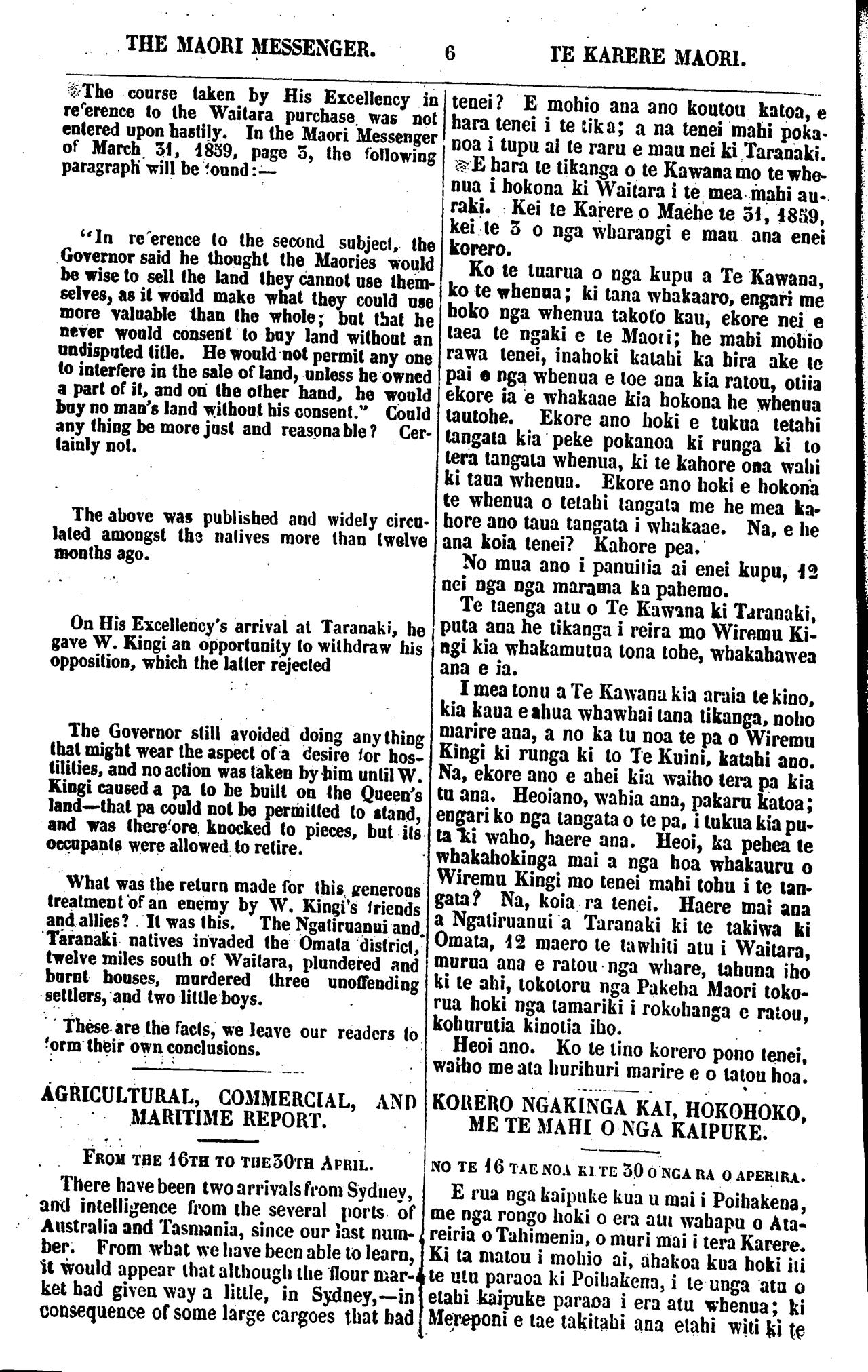 THE MAORI MESSENGER. 6 TE KARERE MAORI. The course taken by His Excellency in reference to the Waitara purchase was not entered upon hastily. In the Maori Messenger of March 31, 1859, page 3, the following paragraph will be found:— "In reference to the second subject, the Governor said he thought the Maories would be wise to sell the land they cannot use them- selves, as it would make what they could use more valuable than the whole; but that he never would consent to buy land without an undisputed title. He would not permit any one to interfere in the sale of land, unless he owned a part of it, and on the other hand, he would bay no man's land without his consent." Could any thing be more just and reasonable? Cer- tainly not. The above was published and widely circu- lated amongst the natives more than twelve months ago. On His Excellency's arrival at Taranaki, he gave W. Kingi an opportunity to withdraw his opposition, which the latter rejected The Governor still avoided doing anything that might wear the aspect of a desire for hos- tilities, and no action was taken by him until W. Kingi caused a pa to be built on the Queen's land—that pa could not be permitted to stand, and was therefore knocked to pieces, but its occupants were allowed to retire. What was the return made for this generous treatment of an enemy by W. Kingi's friends and allies? It was this. The Ngatiruanui and. Taranaki natives invaded the Omata district, twelve miles south of Waitara, plundered and burnt houses, murdered three unoffending settlers, and two little boys. These are the facts, we leave our readers to form their own conclusions. AGRICULTURAL, COMMERCIAL, AND MARITIME REPORT. FROM THE 16TH TO THE 30TH APRIL. There have been two arrivals from Sydney, and intelligence from the several ports of Australia and Tasmania, since our last num- ber. From what we have been able to learn, it would appear that although the flour mar- ket had given way a little, in Sydney,—in consequence of some large cargoes that had tenei? E mohio ana ano koutou katoa, e hara tenei i te tika; a na tenei mahi poka- noa i tupu ai te raru e mau nei ki Taranaki. E hara te tikanga o te Kawana mo te whe- nua i hokona ki Waitara i te mea mahi au- raki. Kei te Karere o Maehe te 31, 1859, kei te 3 o nga wharangi e mau ana enei korero. Ko te tuarua o nga kupu a Te Kawana, ko te whenua; ki tana whakaaro, engari me hoko nga whenua takoto kau, ekore nei e taea te ngaki e te Maori; he mahi mohio rawa tenei, inahoki katahi ka hira ake te pai e nga whenua e toe ana kia ratou, otiia ekore ia e whakaae kia hokona he whenua tautohe. Ekore ano hoki e tukua tetahi tangata kia peke pokanoa ki runga ki to tera tangata whenua, ki te kahore ona wahi ki taua whenua. Ekore ano hoki e hokona te whenua o tetahi tangata me he mea ka- hore ano taua tangata i whakaae. Na, e he ana koia tenei? Kahore pea. No mua ano i panuitia ai enei kupu, 12 nei nga nga marama ka pahemo. Te taenga atu o Te Kawana ki Taranaki. puta ana he tikanga i reira mo Wiremu Ki- ngi kia whakamutua tona tohe, whakahawea ana e ia. I mea tonu a Te Kawana kia araia te kino, kia kaua e ahua whawhai tana tikanga, noho marire ana, a no ka tu noa te pa o Wiremu Kingi ki runga ki to Te Kuini, katahi ano. Na, ekore ano e ahei kia waiho tera pa kia tu ana. Heoiano, wahia ana, pakaru katoa; engari ko nga tangata o te pa, i tukua kia pu- ta ki waho, haere ana. Heoi, ka pehea te whakahokinga mai a nga boa whakauru o Wiremu Kingi mo tenei mahi tohu i te tan- gata? Na, koia ra tenei. Haere mai ana a Ngatiruanui a Taranaki ki te takiwa ki Omata, 42 maero te tawhiti atu i Waitara, murua ana e ratou nga whare, tahuna iho ki te ahi, tokotoru nga Pakeha Maori toko- rua hoki nga tamariki i rokohanga e ratou, kohurutia kinotia iho. Heoi ano. Ko te tino korero pono tenei, waiho me ata hurihuri marire e o tatou hoa. KORERO NGAKINGA KAI HOKOHOKO, ME TE MAHI O NGA KAIPUKE. NO TE 16 TAE NOA KI TE 30 O NGA RA O APERIRA. E rua nga kaipuke kua u mai i Poihakena, me nga rongo hoki o era atu wahapu o Ata- reiria o Tahimenia, o muri mai i tera Karere. Ki ta matou i mohio ai, ahakoa kua hoki iti te utu paraoa ki Poihakena, i te unga atu o etahi kaipuke paraoa i era atu whenua; ki Mereponi e tae takitahi ana etahi witi ki te
