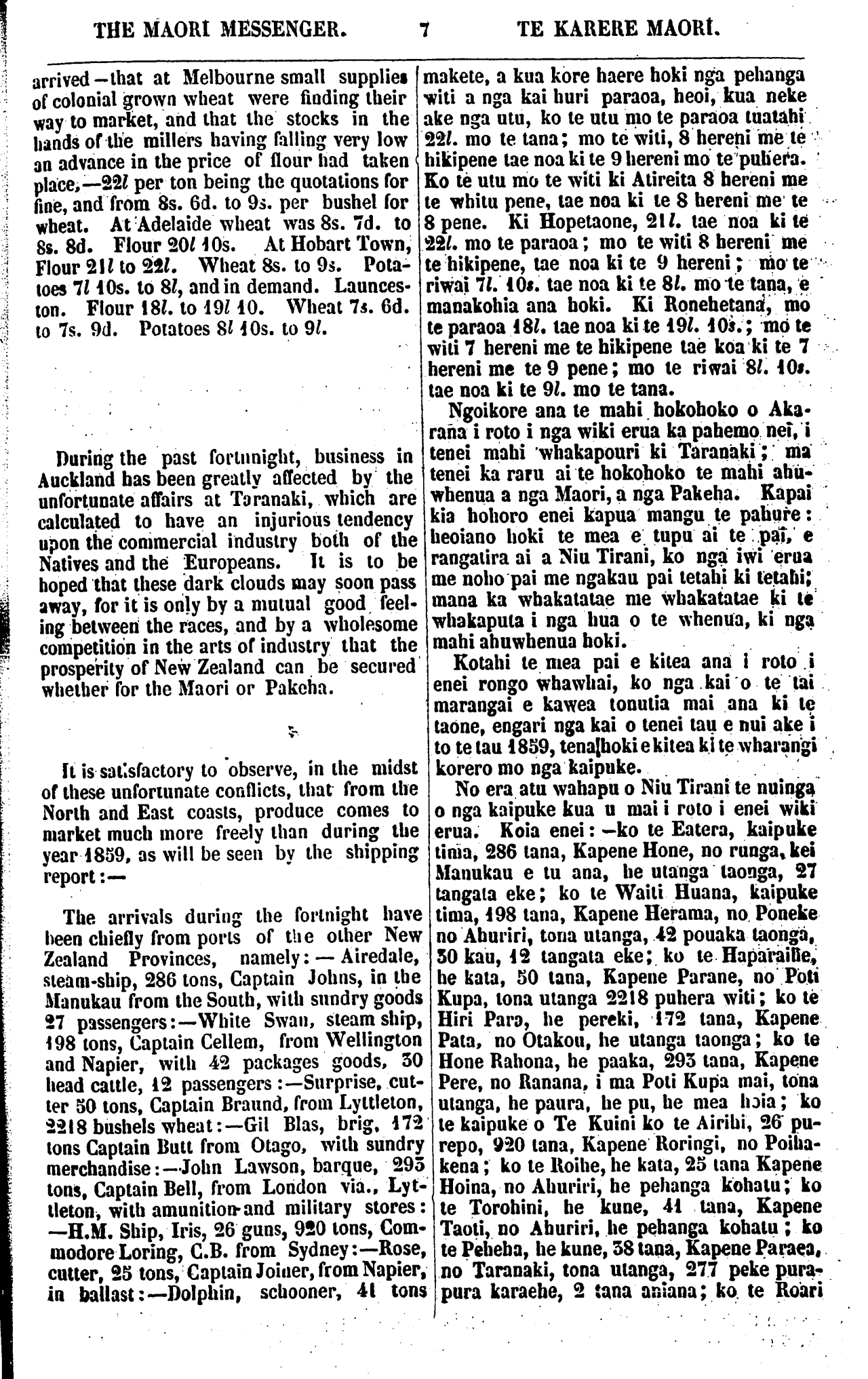 THE MAORI MESSENGER. TE KARERE MAORI. arrived that at Melbourne small supplies of colonial grown wheat were finding their way to market, and that the stocks in the hands of the millers having falling very low an advance in the price of flour had taken place.—221 per ton being the quotations for fine, and from 8s. 6d. to 9s. per bushel for wheat. At Adelaide wheat was 8s. 7d. to 8s. 8d. Flour 201 10s. At Hobart Town, Flour 211 to 221 Wheat 8s. to 9s. Pota- toes 1110s. to 81, and in demand. Launces- ton. Flour 181 to 191 10. Wheat 7s. 6d. to 7s. 9d. Potatoes 81 10s. to 91. During the past fortnight, business in Auckland has been greatly affected by the unfortunate affairs at Taranaki, which are calculated to have an injurious tendency upon the commercial industry both of the Natives and the Europeans. It is to be hoped that these dark clouds may soon pass away, for it is only by a mutual good feel- ing between the races, and by a wholesome competition in the arts of industry that the prosperity of New Zealand can be secured whether for the Maori or Pakeha. It is satisfactory to observe, in the midst of these unfonunate conflicts, that from the North and East coasts, produce comes to market much more freely than during the year 1859. as will be seen by the shipping report: The arrivals during the fortnight have been chiefly from ports of the other New Zealand Provinces, namely: — Airedale, steam-ship, 286 tons. Captain Johns, in the Manukau from the South, with sundry goods 27 passengers:--White Swan, steamship, 198 tons, Captain Cellem, from Wellington and Napier, with 42 packages goods, 30 head cattle, 12 passengers:—Surprise. cut- ter SO tons, Captain Braund, from Lyttleton. 2218 bushels wheat:—Gil Blas, brig. 172 tons Captain Butt from Otago, with sundry merchandise: John Lawson, barque. 295 tons. Captain Bell, from London via., Lyt- tleton, with amunition and military stores: —H.M. Ship, Iris, 26 guns, 920 tons, Com- modore Loring, C.B. from Sydney:—Rose, cutter, 25 tons, Captain Joiner, from Napier. in ballast:—Dolphin, schooner, 41 tons makete, a kua kore haere hoki nga pehanga witi a nga kai huri paraoa, heoi, kua neke ake nga utu, ko te utu mo te paraoa tuatahi 221 mo te tana; mo te witi, 8 hereni me te hikipene tae noa ki te 9 hereni mo te puhera. Ko te utu mo te witi ki Atireita 8 hereni me te whitu pene, tae noa ki te 8 hereni me te 8 pene. Ki Hopetaone, 2 11. tae noa kite 221 mo te paraoa; mo te witi 8 hereni me te hikipene, tae noa ki te 9 hereni; mo te riwai 71. IO s. tae noa ki te 8 1. mote tana, e manakohia ana hoki. Ki Ronehetana, mo te paraoa 181 tae noa ki te 191 10s.; mo te witi 7 hereni me te hikipene tae koa ki te 7 hereni me te 9 pene; mo te riwai 81. IO s. tae noa ki te 91 mo te tana. Ngoikore ana te mahi hokohoko o Aka raha i roto i nga wiki erua ka pahemo nei, i tenei mahi whakapouri ki Taranaki; ma tenei ka raru ai te hokohoko te mahi ahu- whenua a nga Maori, a nga Pakeha. Kapai kia hohoro enei kapua mangu te pahure: heoiano hoki te mea e tupu ai te pai, e rangatira ai a Niu Tirani, ko nga iwi erua me noho pai me ngakau pai tetahi ki tetahi; mana ka whakatatae me whakatatae ki te whakaputa i nga hua o te whenua, ki nga mahi ahuwhenua hoki. Kotahi te mea pai e kitea ana i roto i enei rongo whawhai, ko nga kai o te tai marangai e kawea tonutia mai ana ki te taone, engari nga kai o tenei tau e nui ake i to te tau 1859, tena hoki e kitea ki te wharangi korero mo nga kaipuke. No era atu wahapu o Niu Tirani te nuinga o nga kaipuke kua u mai i roto i enei wiki erua. Koia enei: ko te Eatera, kaipuke tima, 286 tana, Kapene Hone, no runga, kei Manukau e tu ana, he utanga taonga, 27 tangata eke; ko te Waiti Huana, kaipuke tima, 198 tana, Kapene Herama, no Poneke no Ahuriri, tona utanga, 42 pouaka taonga, 50 kau, 12 tangata eke; ko te Haparaihe, he kata, 50 tana, Kapene Parane, no Poti Kupa, tona utanga 2218 puhera witi; ko te Hiri Para, he pereki, 172 tana, Kapene Pata, no Otakou, he utanga taonga; ko te Hone Rahona, he paaka, 293 tana, Kapene Pere, no Ranana, i ma Poti Kupa mai, tona utanga, he paura, he pu, he mea hoia; ko te kaipuke o Te Kuini ko te Airihi, 26 pu- repo, 920 tana, Kapene Roringi, no Poiha- kena; ko te Roihe, he kata, 25 tana Kapene Hoina, no Ahuriri, he pehanga kohatu; ko te Torohini, be kune, 41 tana, Kapene Taoti, no Ahuriri. he pehanga kohatu; ko te Pekeha, he kune, 38 tana, Kapene Paraea, no Taranaki, tona utanga, 277 peke pura- pura karaehe, 2 tana aniana; ko te Roari