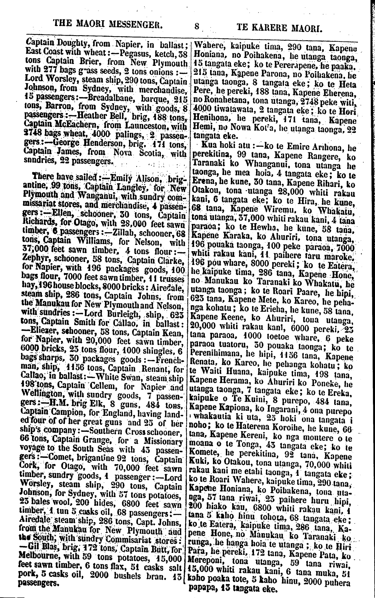 THE MAORI MESSENGER. 8 TE KARERE MAORI. Captain Doughty, from Napier, in ballast; East. Coast with wheat: Pegasus, ketch, 38 tons Captain Brier, from New Plymouth with 277 bags grass seeds, 2 tons onions: Lord Worsley, steam ship, 290 tons, Captain Johnson, from Sydney, with merchandise. IS passengers:—BreadaIbane, barque, 215 tons, Barron, from Sydney, with goods. 8 passengers-:—Heather Bell, brig, 188 tons, Captain McEachern, from Launceston. with 3748 bags wheat, 4000 palings, 2 passen- gers:—George Henderson, brig. 171 tons, Captain James, from Nova Scotia, with sundries, 22 passengers. There have sailed Emily Alison, brig- amine, 99 tons, Captain Langley, for New, Plymouth and Whanganui, with sundry com- missariat stores, and merchandise, 4 passen- gers: —Ellen, schooner, 30 tons, Captain Richards, for Otago, with 28, 000 feet sawn timber, 9 passengers; Zillah, schooner, 68 tons, Captain Williams, for Nelson, with 37.000 feet sawn timber, 4 tons flour: Zephyr, schooner, 58 tons, Captain Clarke. for Napier, with 196 packages goods, 100 bags flour, 7000 feet sawn timber, 11 trusses hay, 196 house blocks, 8000 bricks: Airedale, steam ship, 286 tons, Captain Johns, from the Manukau for New Plymouth and Nelson, with sundries:—Lord Burleigh, ship, 623 Cons, Captain Smith for Callao, in ballast: —Eliezer, schooner, 58 Ions, Captain Kean, for Napier, with 20, 000 feet sawn timber, 6000 bricks, 25 tons flour, 1000 shingles, 6 bags sharps, 30 packages goods: French- man, ship, 1156 tons, Captain Renant, for Callao, in ballast,:—White Swan, steamship 198 tons, Captain CeIlem, for Napier and Wellington, with sundry goods, 7 passen- ger—H.M. brig Elk, 8 guns, 484 tons, Captain Campion, for England, having land- ed four of her great guns and 23 of her ship's company: Southern Cross schooner, 66 tons, Captain Grange, for a Missionary voyage to the South Seas with 43 passen- gers:—Comet, brigantine 92 tons, Captain Cork, for Otago. with 70, 000 feet sawn timber, sundry goods, 1 passenger:—Lord Worsley, steam ship, 290 tons, Captain Johnson, for Sydney, with 57 tons potatoes, 23 bales wool, 200 hides; 6800 feet sawn timber, 1 tun 5: casks oil, 68 passengers: — Airedale steam ship, 286 tons, Capt. Johns, from the Manukau for New Plymouth and the South, with sundry Commisariat stores: —Gil Blas, brig, 172 tons, Captain. Butt, for Melbourne, with 59 tons potatoes, 15, 000 feet sawn timber, 6 tons flax, 51 casks salt pork, 5 casks oil, 2000 bushels bran. 13 passengers . Wahere, kaipuke tima, 290 tana, Kapene Honiana, no Poihakena, he utanga taonga, 15 tangata eke; ko te Pererapene, he paaka. 215 tana, Kapene Parona, no Poihakena, he utanga taonga, 8 tangata eke; ko te Heta Pere, he pereki, 188 tana, Kapene Eherena, no Ronahetana, tona utanga, 2748 peke witi 4000 tiwatawata, 2 tangata eke; ko te Hori, Henihona, lie pereki, 171 tana, Kapene Hemi, no Nowa Kota, he utanga taonga, 22 tangata eke. Kua hoki atu:—ko te Emire Arihona, he perekitina, 99 tana, Kapene Rangere, ko Taranaki ko Whanganui, tona utanga he taonga, he mea hoia, 4 tangata eke; ko te Erena, he kune, 50 tana, Kapene Rihari, ko Otakou, tona utanga 28, 000 whiti rakau kani, 6 tangata eke; ko te Hira, he kune, 68 tana, Kapene Wiremu, ko Whakatu, tona utanga, 37, 000 whiti rakau kani. 4 tana paraoa; ko te Hewha, he kune, 58 tana, Kapene Karaka. ko Ahuriri, tona utanga, 196 pouaka taonga, 100 peke paraoa, 7000 whiti rakau kani, 11 paihcere taru maroke, 196 pou whare, 8000 pereki; ko te Eatera, he kaipuke tima, 286 tana, Kapene Hone, no Manukau ko Taranaki ko Whakatu, he utanga taonga; ko te Roari Paare, he hipi, 623 tana, Kapene Mete, ko Kareo, he peha- nga kohatu; ko te Erieha, he kune, 58 tana. Kapene Keene, ko Ahuriri, toua utanga, 20, 000 whiti rakau kani, 6000 pereki. 25 tana paraoa, 1000 toetoe whare. 6 peke paraoa matoru, 30 pouaka taonga; ko te Perenihimana, he hipi, 1156 tana, Kapene Renata, ko Kareo, he pehanga kohatu; ko te Waiti Huana, kaipuke tima, 198 tana, Kapene Herama, ko Ahuriri ko Poneke, he utanga taonga, 7 tangata eke; ko te Ereka. kaipuke o Te Kuini, 8 purepo, 484 tana, Kapene Kapiona, ko Ingarani, 4 ona purepo whakautia ki uta, 25 hoki ona tangata i noho; ko te Haterena Koroihe, he kune, 60 tana, Kapene Kereni, ko nga moutere o te moana o te Tonga, 43 tangata eke; ko te Komete, he perekitina, 92 tana, Kapene Kuki, ko Otakou, tona utanga, 70, 000 whiti rakau kani me etahi taonga, 1 tangata eke; ko te Roari Wahere, kaipuke tima, 290 tana, Kapene Honiana, ko Poihakena, tona uta- nga, 57 tana riwai, 25 paihere huru hipi, 200 hiako kau, 6800 whiti rakau kani, 1 tana 5 kaho hinu tohora, 68 tangata eke; ko te Eatera, kaipuke tima, 286 tana,. Ka- pene Hone, no Manukau ko Taranaki ko runga,, he hanga hoia te utanga; ko te Hiri Para, he pereki, 172 tana, Kapene Pata. ko Mereponi, tona utanga, 59 tana riwai, 15, 000 whiti rakau kani, 6 tana muka, 51 kaho poaka tote, 5 kaho hinu, 2000 puhera papapa, 13 tangata eke.