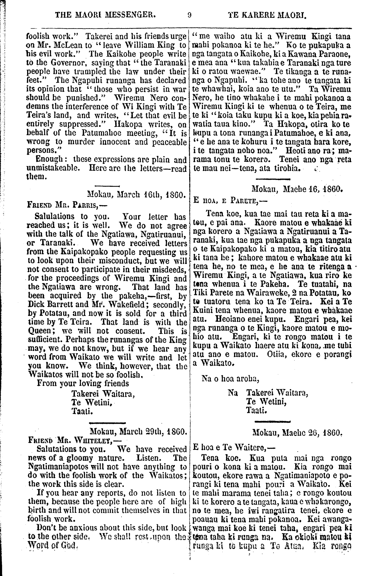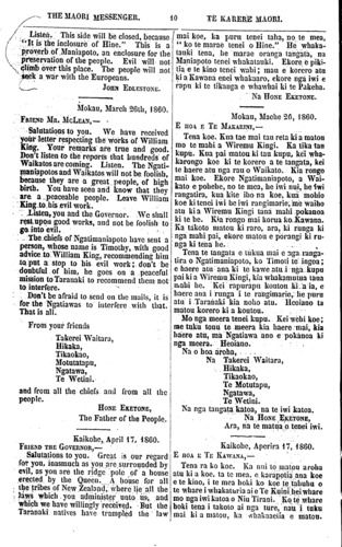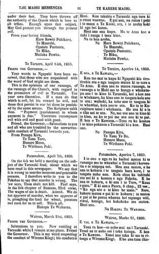 THE MAORI MESSENGER. YE KARERE MAORI. foolish work." Takerei and his friends urge on Mr. McLean to" leave William King to his evil work." The Kaikohe people write to the Governor, saying that "the Taranaki people have trampled the law under their feet." The Ngapuhi runanga has declared its opinion that " those who persist in war should be punished." Wiremu Nero con- demns the interference of Wi Kingi with Te Teira's land, and writes, "Let that evil be entirely suppressed." Hakopa writes, on behalf of the Patumahoe meeting, "It is wrong to murder innocent and peaceable persons." Enough: these expressions are plain and unmistakeable. Here are the letters—read them. Mokau, March 16th, 1860. FRIEND MR. PARRIS,— Salutations to you. Your letter has reached us; it is well. We do not agree with the talk of the Ngatiawa, Ngatiruanui, or Taranaki. We have received letters from the Kaipakopako people requesting us to look upon their misconduct, but we will not consent to participate in their misdeeds, for the proceedings of Wiremu Kingi and the Ngatiawa are wrong. That land has been acquired by the pakeha,—first, by Dick Barrett and Mr. Wakefield; secondly, by Potatau, and now it is sold for a third time by Te Teira. That land is with the Queen; we will not consent. This is sufficient. Perhaps the runangas of the King may. we do not know, but if we hear any word from Waikato we will write and let you know. We think, however, that the Waikatos will not be so foolish. From your loving friends Takerei Waitara, Te Wetini, Taati. Mokau, March 29th, 1860. FRIEND MR. WHITELEY,— Salutations to you. We have received news of a gloomy nature. Listen. The Ngatimaniapotos will not have anything to do with the foolish work of the Waikatos; the work this side is clear. If you hear any reports, do not listen to them, because the people here are of high birth and will not commit themselves in that foolish work. Don't be anxious about this side, but look to the other side. Wo shall rest, upon the Word of God. "me waiho atu ki a Wiremu Kingi tana mahi pokanoa ki te he." Ko te pukapuka a nga tangata o Kaikohe, ki a Kawana Paraone, e mea ana " kua takahia e Taranaki nga ture ki o ratou waewae." Te tikanga a te runa- nga o Ngapuhi. " ka tohe ano te tangata ki te whawhai, koia ano te utu." Ta Wiremu Nero, he tino whakahe i te mahi pokanoa a Wiremu Kingi ki te whenua o te Teira, me te ki "koia taku kupu ki a koe, kia pehia ra- watia taua kino." Ta Hakopa, otira ko te kupu a tona runanga i Patumahoe, e ki ana, " e he ana te kohuru i te tangata hara kore, i te tangata noho noa." Heoti ano ra; ma- rama tonu te korero. Tenei ano nga reta te mau nei—tena, ata tirohia. Mokau, Maehe -16, •I860. E HOA, E PARETE,— Tena koe, kua tae mai tau reta ki a ma- tou, e pai ana. Kaore matou e whakaae ki nga korero a Ngatiawa a Ngatiruanui a Ta- ranaki, kua tae nga pukapuka a nga tangata o te Kaipakopako ki a matou, kia titiro atu ki tana he; kahore matou e whakaae atu ki tena he, no te mea, e he ana te ritenga a Wiremu Kingi, a te Ngatiawa, kua riro ke tona whenua i te Pakeha. Te tuatahi, na Tiki Parete na Wairaweke, 2 na Potatau, ko te tuatora tena ko ta Te Teira. Kei a Te Kuini tena whenua, kaore matou e whakaae atu. Heoiano enei kupu. Engari pea, kei nga runanga o te Kingi, kaore matou e mo- hio atu. Engari, ki te rongo matou i te kupu a Waikato haere atu ki kona, me tuhi atu ano e matou. Otiia, ekore e porangi a Waikato. Na o hoa aroha, Na Takerei Waitara, Te Wetini, Taati. Mokau, Maehe 26, 1860. E hoa e Te Waitero,-- Tena koe. Kua puta mai nga rongo pouri o kona ki a matou. Kia rongo mai koutou, ekore rawa a Ngatimaniapoto e po- rangi ki tena mahi pouri a Waikato. Kei te mahi marama tenei taha; e rongo koutou ki te korero a te tangata, kaua e whakarongo, no te mea, he iwi rangatira tenei, ekore e poauau ki tena mahi pokanoa. Kei awanga- awanga mai koe ki tenei taha» angari pea ki ^tAaa taha ki runga Eia. Ka okioki matou ki lrungs U te kupu a Te. Atua, X!a rorho