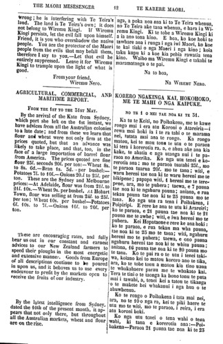 THE MAORI MESESENGER TE KARERE MAORI. wrong; he is interfering with Te Teira's land. The land is Te Teira's own; it does not belong to Wiremu Kingi. If Wiremu Kingi persists, let the evil fall upon himself. Friend, it is you who overshadow the native people. You are the protector of the Maori people from the evils that may befall them, therefore I say to you,—Let that evil be entirely suppressed. Leave it for Wiremu Kingi to trample upon the light of what is good. From your friend, Wiremu Nero. AGRICULTURAL, COMMERCIAL, AND MARITIME REPORT. FROM THE 1ST TO THE 31ST MAY. By the arrival of the Kate from Sydney, which port she left on the 1st instant, we have advices from all the Australian colonies to a late date; and from these we learn that flour and wheat were not only firm at the prices quoted, but that an advance was likely to take place, and that, too, in the face of a large importation of barrel flour from America. The prices quoted are fine flour 231. seconds 201. per ton:—Wheat 8s. to 8s. 6d.--Bran 4s. 3d. -per bushel:- Potatoes 71. to 10l.~ Onions 20 1 to 251. per ton. These are the Sydney and Melbourne prices:—At Adelaide, flour was from 211. to 211. lOs.—Wheat 9s. per bushel. At Hobart Town, flour was selling at from 241. to 251. per ton; Wheat 10s. per bushel—Potatoes 61 10s. to 71. Onions 161. to 201. per ton. These are encouraging rates, and fully bear us out in our constant and earnest advices to our New Zealand farmers to speed their ploughs in the most energetic and extensive manner. Goods from Europe of all descriptions continue to be poured in upon us, and it behoves us to use every endeavour to profit by the markets open to receive the fruits of our industry. By the latest intelligence from Sydney, dated the 10th of the present month, it ap- pears that not only there, but throughout all the Australian markets, wheat and flour are on the rise. nga, a poka noa ana ki to Te Teira whenua, no Te Teira ake tana whenua, e hara ia Wi- remu Kingi. Ki te lobe a Wiremu Kingi ki a ia ano tona kino. E hoa, ko koe hoki te tawhare ana i runga i nga iwi Maori, ko koe te kai tiaki o nga Maori i nga kino; koia taku kupu ki a koe kia pehia rawatia tena kino. Waiho ma Wiremu Kingi e takahi te maramatanga o te pai. Na to hoa, Na WIREMU NERO. KORERO NGAKINGA KAI, HOKOHOKO, ME TE MAHI O NGA KAIPUKE. NO TE 1 O MEI TAE KOA KI TE 31. Ka tu te Keiti, no Poihakena, me te kawe rongo mai i era atu Koroni o Atareiria—i rewa mai hoki ia i te ra tahi o te marama nei, tutata mai ana te rongo. Ka rongo matou, kei te mau tona te utu o te paraoa ki tera i korerotia ra, a, e ahua ake ana kia kake, te ahatia e nga utanga nui i te pa- raoa no Amerika. Ko nga utu tenei e ko- rerotia ana: mo te paraoa tuatahi 231., mo te paraoa tuarua 201. mo te tana; will, e waru hereni tae noa ki te waru hereni me te hikipene; papapa witi, 1 hereni me te tere- pene, ara, mo te puhera; taewa, e 7 pauna tae noa ki te ngahuru pauna; aniana, e rua tekau pauna tae noa ki te 25 pauna mo te tana. Ko nga utu ra tena i Poihakena, i Poipiripi. E rere ke ana te utu ki Arareiri; ko te paraoa, e 21 pauna tae noa ki te 21 pauna me te awhe; witi, e iwa hereni mo te puhera. Kei Hopataone e rere ke ana hoki: ko te paraoa, e rua tekau ma wha pauna, tae noa ki te 23 mo te tana; witi, ngahuru hereni mo te puhera; taewa, e ono pauna ngahuru hereni tae noa ki te whitu pauna; aniana, 16 pauna tae noa ki te 20 pauna mo te tana. Ko te pai ra o te utu i tenei taki- wa, koiano kei to matou korero ano te tika, ara, ko te tohe tonu a matou kia tino uaua te whakahaere parau me te whakato kai. Tera te tini o te taonga ka hono tonu te puta mai i tawahi, a, tenei tei a tatou te tikanga o te makete hei whakanui i nga hua o te ahuwhenua. Ko te rongo o Poihakena i tata mai nei, ara, no te 10 o nga ra, kei te piki haere te utu mo te witi, mo te paraoa, i reira, i era atu koroni hoki. Ko nga utu tenei o tena wahi o tena wahi, ki tana e korerotia ana:—Poi- hakena—Paraoa 21 pauna tae noa hi te 23