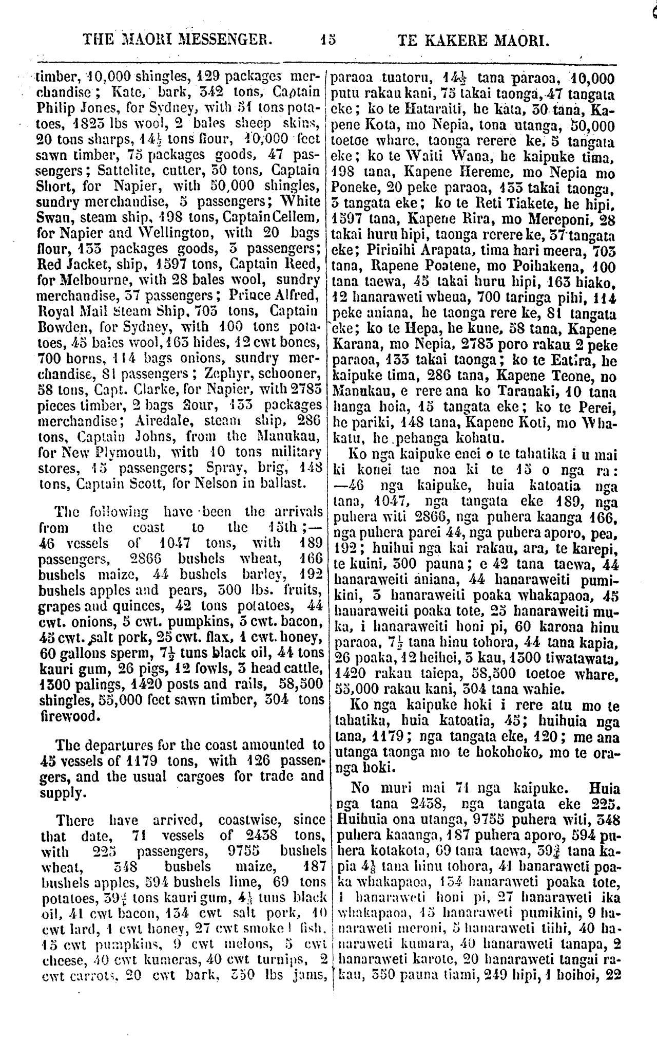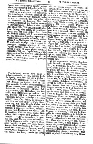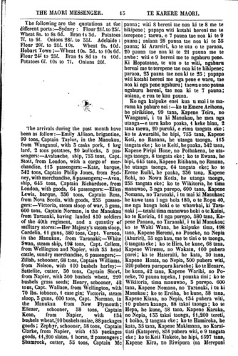 THE MAORI MESSENGER. TE KARERE MAORI. The following are the quotations at the different ports: Sydney: Flour 211. to 231. Wheat 8s. to 8s 6d. Bran 1s 3d. Potatoes 71 to 91. Onions 281 to 351. Adelaide: FIour 201. to 211. 40s. Wheat 9s. 10d. Hobart Town; Wheat 10s. 3d. to 10s 6d. Flour 241 to 251 Bran 1s 8d to 1s lOd. Potatoes 61. 10s to 71. Onions 201. The arrivals during the past month have been as follow:—Emily Allison, brigatine, 99 tons, Captain Taylor, in the Manukau, from Wanganui, with 3 casks pork, 1 keg lard, 2 tons potatoes, 20 bullocks, 5 pas- sengers:—Avalanche, ship, 753 tons, Capt. Stott, from London, with a cargo of mer- chandise, 113 passengers: Kate, barque, 342 tons, Captain Philip Jones, from Syd- ney, with merchandise, 8 passengers; Avon, ship, 645 tons, Captain Richardson, from London, with goods, 64 passengers:—Ellen Lewis, barque, 356 tons, Captain Ross, from Nova Scotia, with goods, 255 passen- gers:—Victoria, steam sloop of war, 5 guns, 600 tons, Captain Norman, in the Manukau from Taranaki, having landed 150 soldiers of the 40th regiment, and a quantity of military stores:—Her Majesty's steam sloop, Cordelia, 11 guns, 580 tons, Capt. Vernon, in the Manukau, from Taranaki; White Swan, steam ship, 198 tons, Capt. Cellem, from Wellington and Napier, with 35 head cattle, sundry merchandise, 6 passengers;— Zillah, schooner, 68 tons, Captain Williams, from Nelson, with 100 bushels barley; Sattelite, cutter, 30 tons, Captain Short, from Napier, with 300 bushels wheat. 220 bushels grass seeds; Henry, schooner, 42 tons, Capt. Wallace, from Wellington, with 70 Ibs. tobacco, 1 case gin; Victoria, steam sloop, 3 guns, 600 tons, Capt. Norman, in the Manukau from New Plymouth; Eliezer, schooner, 58 tons, Captain Kean, from Napier, with 154 bushels wheat 10 bushels maize, 88 packages goods; Zephyr, schooner, 58 tons, Captain Clarke, from Napier, with 133 packages goods, i 1, 200 slates, 1 horse, 2 passengers; Shamrock, cutter, 35 tons, Captain Mc pauna; witi 8 hereni tae noa ki te 8 me te hikipene; papapa witi kotahi hereni me te terepene; taewa, e 7 pauna tae noa ki te 9 pauna; aniana 28 pauna tae noa ki te 35 pauna; ki Arareiri, ko te utu o te paraoa, 20 pauna tae noa ki te 21 pauna me te awhe: witi e 9 hereni me te ngahuru pene. Ki Hopatoane, te utu o te witi, ngahuru hereni me te terepene tae noa Iti te hikipene; paraoa, 23 paana tae noa ki te 25; papapa witi kotahi hereni me nga pene e waru, tae noa ki nga pene ngahuru; taewa e ono pauna ngahuru hereni, tae noa ki te 7 pauna; aniana, e rua te kau pauna. Ko nga kaipuke enei kua u mai i te ma- rama ka pahure nei:- ko te Emere Arihona, he pirikitine, 99 tana, Kapene Teira, no Wanganui, i tu ki Manukau, he mea nga utanga—e toru kaho poaka, 1 keke hinu, 2 tana taewa, 20 puruki, e rima tangata eke; ko te Awaraihi, he hipi, 753 tana, Kapene Koti, no Ranana, he utanga taonga, 115 tangata eke; ko te Keiti, he paaka, 342 tana, Kapene Piripi Hone, no Poihakena, be uta- nga taonga, 8 tangata eke; ko te Ewana, he hipi, 645 tana, Kapene Pitihana, no Ranana, he utanga taonga. 64 tangata eke; ko te Erene Kuihi, he paaka, 336 tana, Kapene Rohi, no Nowa Kotia, he utanga taonga, 235 tangata eke; ko te Wikitoria, he tima manuwao, 3 nga purepo, 600 tana, Kapene Nomana, no Taranaki, i ta mai ki Manukau; he kawe tana i nga hoia 180, o te Kopu 40. me nga hanga hoki o te whawhai, ki Tara- naki;—tetahi tima manuwao hoki o te Kuini, ko te Koriria, 11 nga purepo, 580 tana, Ka- pene Panana, no Taranaki, i tu ki Manukau; ko te Waiti Wana, he kaipuke tima. 198 tana, Kapene Heremi, no Poneke, no Nepia (Ahuriri), 35 ngakau, me te tini o te taonga, 6 tangata eke; ko te Hira, be kune, 68 tana. Kapene Wiremu. no Wakatu, 100 puhera parei; ko te Hateraiti, he kata, 30 tuna, Kapene Hoata, no Nepia, 500 puhera witi, 220 puhera purapura karaehe; ko te Henare, he kuna, 42 tana, Kapene Warihi, no Po- neke, 70 pauna tupeka, 1 pouaka tini; ko te Wikitoria, tima manuwao, 5 purepo. 600 tana, Kapene Nomana, no Taranaki, i tu ki Manukau; ko te Ereiha, he kune, 58 tana, Kapene Kiana, no Nepia, 134 puhera witi, 10 puhera kaanga, 88 takai taonga; ko te Hepa, he kune, 58 tana, Kapene Karaka, no Nepia, 153 takai taonga, 11, 200 tereti, 1 hoiho, 2 tangata eke; ko te Hamiroka, he kata, 55 tana, Kapene Makimana, no Karai- tiati (Katapere), 851 puhera witi, e 9 tangata eke; ko te Keti Tiakete, he hipi, 1597 tana, Kapene Kira, no Piwipura (na Mereponi