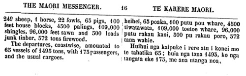 THE MAORI MESSENGER. TE KAKERE MAORI. timber, 10.009 shingles, 129 packages mer- chandise; Kato, bark, 342 tons, Captain Philip Jones, for Sydney, with 51 tons pota- toes, I823 Ibs wool, 2 bales sheep skins, 20 tons sharps, 14½ tons flour, 1 0, 000 feet sawn timber, 73 packages goods, 47 pas- sengers; Satellite, cutter, 50 tons, Captain Short, for Napier, with 50, 000 shingles, sundry merchandise, 3 passengers; White Swan, steam ship, 198 tons, Captain Cellem, for Napier and Wellington, with 20 bags flour, 455 packages goods, 5 passengers; Red Jacket, ship, 1597 tons, Captain Reed, for Melbourne, with 28 bales wool, sundry merchandise, 57 passengers; Prince Alfred, Royal Mail Steam Ship, 705 tons, Captain Bowden. for Sydney, with 100 tons pota- toes, 45 bales wool, 165 hides, 12 cwt bones, 700 horns, 114 bags onions, sundry mer- chandise, 81 passengers Zephyr, schooner, 58 tons, Capt. Clarke, for Napier, with 2785 pieces timber, 2 bags Sour, 133 packages merchandise; Airedale, steam ship, 286 tons, Captain Johns, from the Manukau, for New Plymouth, with 10 tons military stores, 15 passengers; Spray, brig, 148 tons, Captain Scott, for Nelson in ballast. The following have -been the arrivals from the coast, to the 15th;— 46 vessels of 1047 tons, with 189 passengers, 2866 bushels wheat, 166 bushels maize. 44 bushels barley, 192 bushels apples and pears, 500 Ibs. fruits, grapes and quinces, 42 tons potatoes, 44 cwt. onions, 5 cwt. pumpkins, 5 cwt. bacon, 43 cwt., salt pork, 25 cwt. flax, 1 cwt. honey, 60 gallons sperm, ½ tuns black oil, 44 tons kauri gum, 26 pigs, 12 fowls, 5 head cattle, 1300 palings, 1420 posts and rails, 58, 300 shingles, 55, 000 feet sawn timber, 504 tons firewood. The departures for the coast amounted to 45 vessels of 1179 tons, with 126 passen- gers, and the usual cargoes for trade and supply. There have arrived, coastwise, since that date, 71 vessels of 2438 tons, with 223 passengers, 9755 bushels wheat, 548 bushels maize, 187 bushels apples, 594 bushels lime, 69 tons potatoes, 39¼ tons kauri gum, 4¼ tuns black oil, -41 cwt bacon, 134 cwt salt pork, 10 cwt lard, 1 cwt honey, 7 cwt smoked fish, •to cwt pumpkins, 9 cwt melons, 5 cwt cheese, •10 cwt kumeras, 40 cwt turnips, 2 cwt carrots 20 cwt bark, 35O Ibs jams, paraoa tuatoru, 14½ tana paraoa, 40, 000 putu rakau kani, 73 takai taonga, 47 tangata eke; ko te Hataraiti, he kata, 50 tana, Ka- pene Kota, mo Nepia, tona utanga, 50, 000 toetoe whare, taonga rerere ke, 5 tangata eke; ko te Waiti Wana, be kaipuke tima, 198 tana, Kapene Hereme, mo Nepia mo Poneke, 20 peke paraoa, 133 takai taonga, 5 tangata eke; ko te Reti Tiakete, he hipi, 1597 tana, Kapene Rira, mo Mereponi, 28 takai hum hipi, taonga rere ke, 37 tangata eke; Pirinihi Arapata, tima hari meera, 703 tana, Kapene Poutene, mo Poihakena, 100 tana taewa, 45 takai huru hipi, 163 hiako. 12 hanaraweti wheua, 700 taringa pihi, 114 peke aniana, he taonga rere ke, 81 tangata eke; ko te tiepa, he kune, 58 tana, Kapene Karana, mo Nepia, 2783 poro rakau 2 peke paraoa, 455 takai taonga; ko te Eatira, he kaipuke lima, 286 tana, Kapene Teone, no Manukau, e rere ana ko Taranaki, 40 tana hanga hoia, Io tangata eke; ko te Perei, he pariki, 148 tana, Kapene Koti, mo Wha- katu, he pehanga kohatu. Ko nga kaipuke enei o te tahatika i u mai ki konei tae noa ki te 15 o o nga ra: —46 nga kaipuke, huia katoatia nga tana, 1047, nga tangata eke 189, nga puhera witi 2866, nga puhera kaanga 166. nga puhera parei 44, nga puhera aporo, pea. 192; huihuinga kai rakau, ara, te karepi, te kuini, 500 pauna; e 42 tana taewa, 44 hanaraweiti aniana, 44 hanaraweiti pumi- kini, 5 hanaraweiti poaka whakapaoa, 45 hanaraweiti poaka tote, 23 hanaraweiti mu- ka, i hanaraweiti honi pi, 60 karona hinu paraoa, 7½ tana hinu tohora, 44 tana kapia, 26 poaka, 12 heihei, 5 kau, 1500 tiwatawata, 1420 rakau taiepa, 38, 500 toetoe whare, So, 000 rakau kani, 504 tana wahie. Ko nga kaipuke hoki i rere atu mo te tahatika, huia katoatia, 43; huihuia nga tana, 1179; nga tangata eke, 120; me ana utanga taonga mo te hokohoko, mo te ora- nga hoki. No muri mai 71 nga kaipuke. Huia nga tana 2458, nga tangata eke 223. Huihuia ona utanga, 9755 puhera witi, 548 puhera kaanga, 187 puhera aporo, 594 pu- hera kotakota, 69 tana taewa, 39¾ tana ka- pia 4 1/8 tana hinu tohora, 41 hanaraweti poa- ka whakapaoa, 134 hanaraweti poaka tote, 1 hanaraweti honi pi, 27 hanaraweti ika whakapaoa, 15 hanaraweti pumikini, 9 ha- naraweti meroni, 5 hanaraweti tiihi, 40 ha- naraweti kumara, 40 hanaraweti tanapa, 2 hanaraweti karote, 20 hanaraweti tangai ra- kau, 550 pauna tiami, 249 hipi, 1 hoihoi, 22