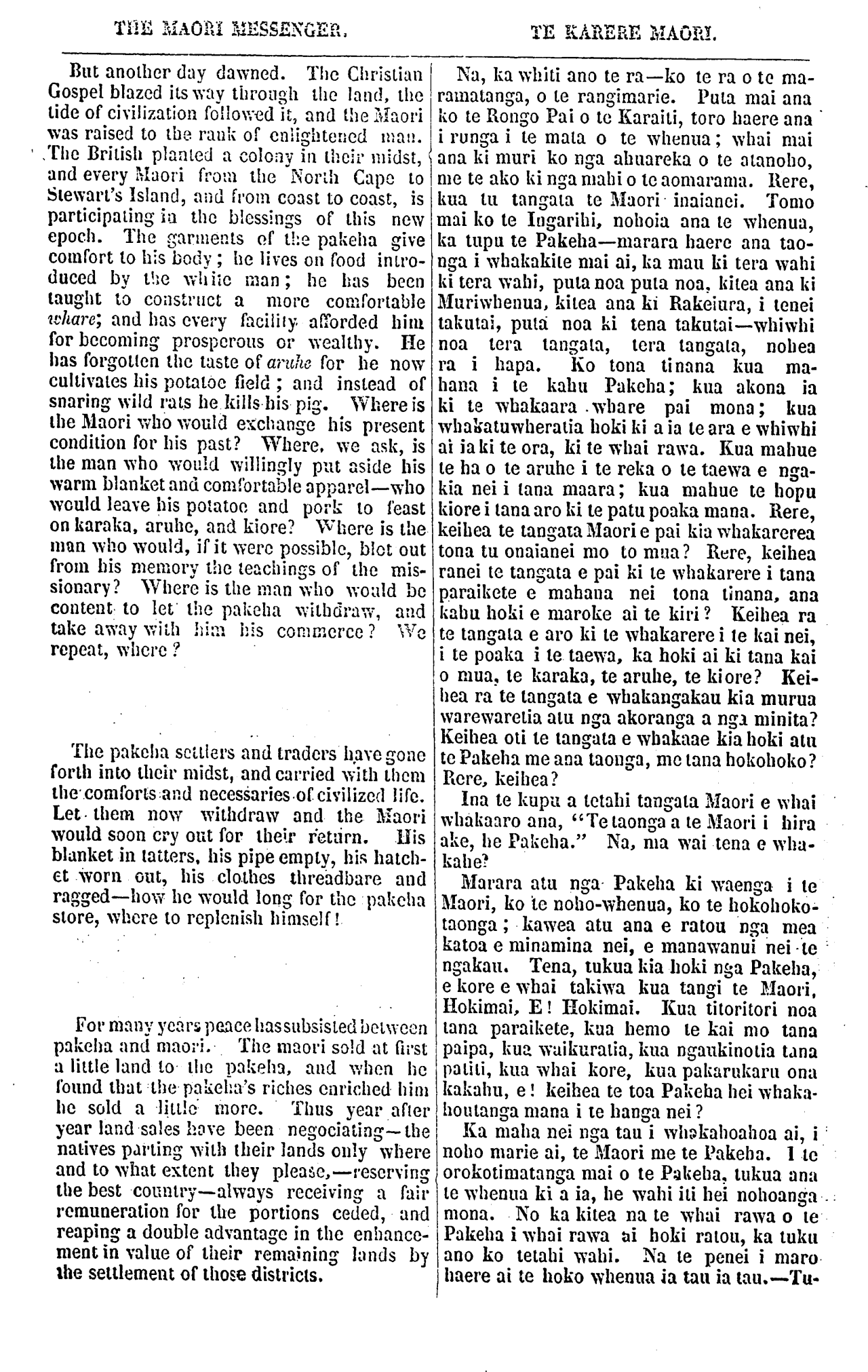 THE MAORI MESSENGER TE KARERE MAORI. But another day dawned. The Christian Gospel blazed its way through the land, the tide of civilization followed it, and the Maori was raised to the rank of enlightened man. The British planted a colony in their midst, and every Maori from the North Cape to Stewart's Island, and from coast to coast, is participating ia the blessings of this new epoch. The garments of the pakeha give comfort to his body; he lives on food intro- duced by the white man; he has been taught to construct a more comfortable whare; and has every facility afforded him for becoming prosperous or wealthy. He has forgoltcn the taste of aruhe for he now cultivates his potatoe field; and instead of snaring wild rats he kills his pig. Where is the Maori who would exchange his present condition for his past? Where, we ask, is Ihe man who would willingly put aside his warm blanket and comfortable apparel—who would leave his potatoe and pork to feast on karaka, aruhe, and kiore? Where is the man who would, if it were possible, blot out from his memory the teachings of the mis- sionary? Where is the man who would be content to let the pakeha withdraw, and take away with him his commerce? We repeat, where? The pakeha settlers and traders have gone forth into their midst, and carried with them the comforts and necessaries of civilized life. Let them now withdraw and the Maori would soon cry out for their return. His blanket in latters, his pipe empty, his hatch- et worn out, his clothes threadbare and ragged—how he would long for the pakeha store, where to replenish himself! For many years peace had subsisted between pakeha and maori. The maori sold at first a little land to the pakeha, and when he found that the pakeha's riches enriched him he sold a little more. Thus year after year land sales hove been negotiating the natives parting with their lands only where and to what extent they please,—reserving the best country—always receiving a fair remuneration for the portions ceded, and reaping a double advantage in the enhance- ment in value of their remaining lands by the settlement of those districts. Na, ka whiti ano te ra—ko te ra o te ma- ramatanga, o te rangimarie. Puta mai ana ko te Rongo Pai o te Karaiti, toro haere ana i runga i te mata o te whenua; whai mai ana ki muri ko nga ahuareka o te atanoho, me te ako ki nga mahi o te aomarama. Rere, kua tu tangata te Maori inaianei. Tomo mai ko te Ingarihi, nohoia ana te whenua, ka tupu te Pakeha—marara haere ana tao- nga i whakakite mai ai, ka mau ki tera wahi ki tera wahi, puta noa puta noa. kitea ana ki Muriwhenua, kitea ana ki Rakeiura, i tenei takutai, puta noa ki tena takutai—whiwhi noa tera tangata, tera tangata, nohea ra i hapa. Ko tona tinana kua ma- hana i te kahu Pakeha; kua akona ia ki te whaka ara whare pai mona; kua whakatuwheratia hoki ki a ia te ara e whiwhi ai ia ki te ora, ki te whai rawa. Kua mahue te ha o te aruhe i te reka o te taewa e nga- kia nei i tana maara; kua mahue te hopu kiore i tana aro ki te patu poaka mana. Rere, keihea te tangata Maori e pai kia whakarerea tona tu onaianei mo to mua? Rere, keihea ranei te tangata e pai ki te whakarere i tana paraikete e mahana nei tona tinana, ana kahu hoki e maroke ai te kiri? Keihea ra te tangata e aro ki te whakarere i te kai nei, i te poaka i te taewa, ka hoki ai ki taua kai o mua, te karaka, te aruhe, te kiore? Kei- hea ra te tangata e whakangakau kia murua warewaretia atu nga akoranga a nga minita? Keihea oti te tangata e whakaae kia hoki atu te Pakeha me ana taonga, me tana hokohoko? Rere, keihea? Ina te kupu a tetahi tangata Maori e whai whakaaro ana, "Te taonga a te Maori i hira ake, he Pakeha." Na, ma wai tena e wha- kahe? Marara atu nga Pakeha ki waenga i te Maori, ko te noho-whenua, ko te hokohoko- taonga; kawea atu ana e ratou nga mea katoa e minamina nei, e manawanui nei te ngakau. Tena, tukua kia hoki nga Pakeha, e kore e whai takiwa kua tangi te Maori, Hokimai, E! Hokimai. Kua titoritori noa tana paraikete, kua hemo te kai mo tana paipa, kua waikuratia, kua ngaukinotia tana patiti,, kua whai kore, kua pakarukaru ona kakahu, e! keihea te toa Pakeha hei whaka- houtanga mana i te hanga nei? Ka maha nei nga tau i whakahoahoa ai, i noho mane ai, te Maori me te Pakeha. I te orokotimatanga mai o te Pakeha, tukua ana te whenua ki a ia, he wahi iti hei nohoanga mona. No ka kitea na te whai rawa o te Pakeha i whai rawa ai hoki ratou, ka tuku ano ko tetahi wahi. Na te penei i maro haere ai te hoko whenua ia tau ia tau.--Tu-