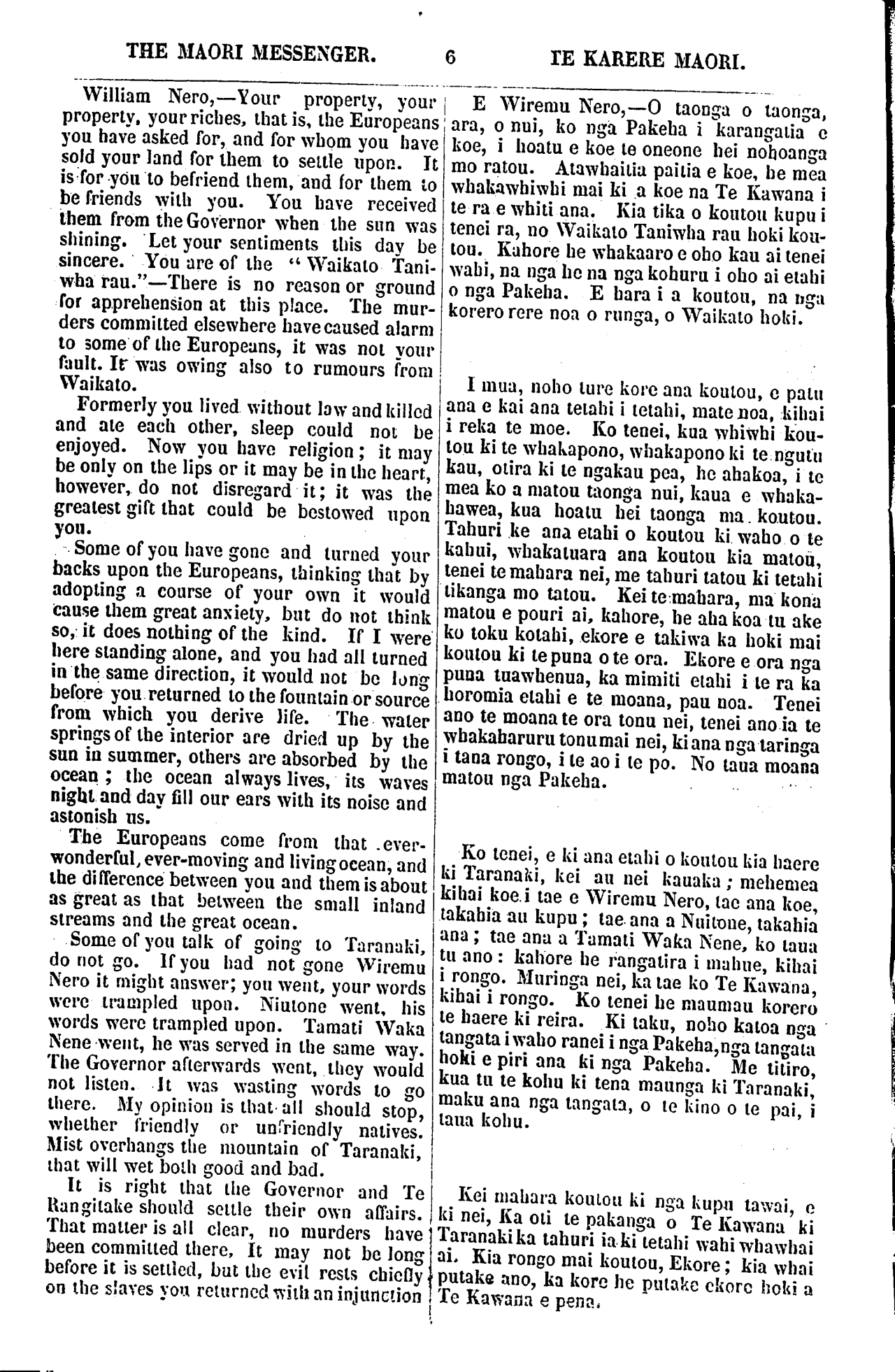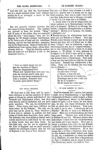 THE MAORI MESSENGER. 3 TE KARERE MAORI. And who will say that the Government has in a single instance taken land without paying for it, or wronged a maori;; or his territorial rights? But this peaceful relation between the two races is being disturbed. The settlers are grieved to hear the foolish "King" talk of some of the tribes, they are annoyed about the silly "land league," they are in- dignant for Wi Kingi's wicked interference in Te Teira's sale of land and his rebellious bearing, and for the foul murders perpetra- ted by the Ngatiruanui. Some of them talk of withdrawing from among them, others have already done so. Thus the Kawhia settlers have all removed and Kikikoi is left to his mournful lament.— " Now no object meets my eye But Ihe warriors of Tipare. Thus my disappointed love Which had fancied thou wert near me, Like the torrent swol'n with rain Pours its tear-drops ceaseless flowing, Like a wearied, wounded bird To some quiet shelter flying!" THE OMATA MURDERS. We hear that it has been said by some, with reference to the late murders of Euro- peans at Omata by certain individuals of the Taranaki and Ngatiruanui tribes, that they were merely acts of retaliation and not pro- perly murders. We ask, In retaliation for what? What injury had been inflicted on these tribes by the Pakeha? The only an- swer that can he given is, None whatever; It is in vain to attempt to palliate the foul crime of which these men have been guilty. The Pakehas who were killed at Omata were cruelly murdered in cold blood by the men at whose hands they met their death. In this light only can the act be regarded by the Law of England and we need scarcely remind our intelligent readers that the law of England is the Law of New Zealand. kua ana e te Maori tana whenua i te wahi i pai ai ia; puritia, ana e ia mona ake ko nga wahi momona, utua ana te wahi i riro ki, te utu tika, kake haere ana te tikanga o te wahi i toe ki a ia i te noho tata o te Pakeha. A, kowai tena e ki ana he tango tahae, he tango pokanoa ta te Kawanatanga i te whe- nua o te tangata? Keihea ra te whenua, kia kotahi, i tangohia tikangakoretia e to Kawa- natanga? Kowai ra te tangata, kia kotahi, i tukinotia e ia? Katahi noi pea ka whakararua tenei ata- noho pai o te Pakeha o te Maori. Tera nga Pakeha noho whenua te pouri mai na mo nga korero hua kore nei a te Maori mo te wha- katu "Kingi;" tera te whakatoia e nga ko- rero hanga noa nei, mo te "pupuri whenua," me te tino whakatakariri a ratou ki te mahi poauau a Wi Kingi, ki tana pokanoa ki te takahi i a To Teira e mea nei ki te tuku i tana poro whenua; me to ohoriri hoki ki nga kohuru kino a Ngatiruanui. Tera etahi e mea ana kia haere atu ue wahi ko, ko etahi kua haere. Inahoki kua whakarerea a Ka- whia. Noho atu ko Kikikoi mo tana tangi mo te Pakeha:— "Homai me whakahau, Te tuku taua i te ipo A Tipare, e moe atu nei. Ko te wairua kei te whakatata, E koningo ana te tau o taku ake Me he ia waipuke Me he manu au e rere ana!" TE MAHI KOHURU KI OMATA. Tenei te rangona nei e matou, kua meatia e etahi, ko te whakamatenga o nga Pakeha i kohurutia ki Omata e etahi tangata o Tara- naki o Ngatiruanui, ehara i te tino kohuru, engari he apiti, e ai ta ratou, he uru mara- nga, he aha, ona ingoa whakaputa ke kia kiia ai, ehara tera i te kohuru. Tena iana, he apiti ia no te aha? I ahatia era iwi e te Pakeha? He aha to hara o te Pakeha ki a ratou? Heoi ano te whakahokinga mo tenei kupu patai. "Kahore kau rawa he hara o te Pakeha ki era iwi. Maumau korero wha- kakorekore i tenei kino nui whakaharahara kua mahia nei e aua tangata. Heoi ano ti- kanga o te kupu, koia tenei, ko nga Pakeha i mate ki Omata i tino kohurutia mariretia e aua tangata nana i whakamate. Ki te tiro- hanga the o te Ture o Ingarani, koia tenei, he tino kohuru taua mahi, kahore ona ingoa ke atu, ua, e maharatia e o tatou hoa mohio ki te whakaaro, ko taua Ture o lngarani ano te Ture e tauwhare ana ki runga ki tenei ki Nui Tirani nei, kotahi ano hoki te Ture.